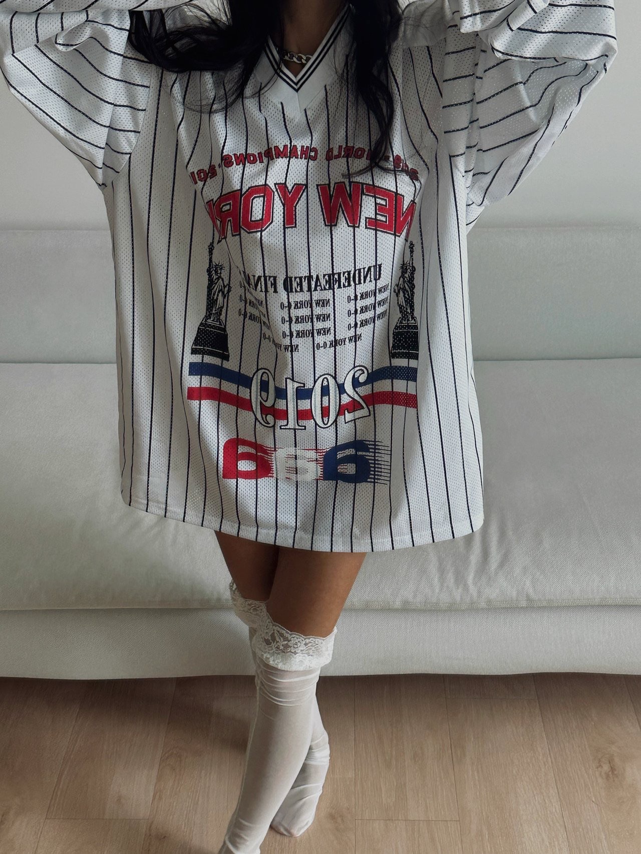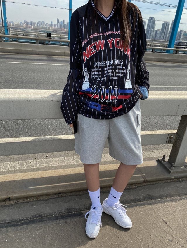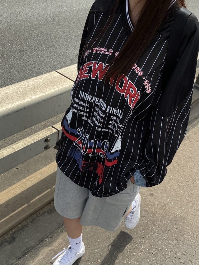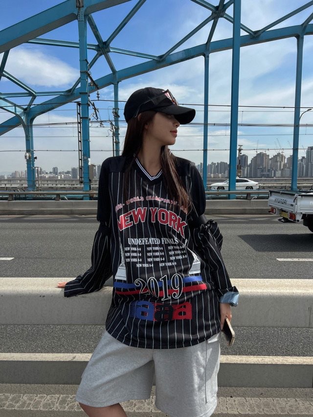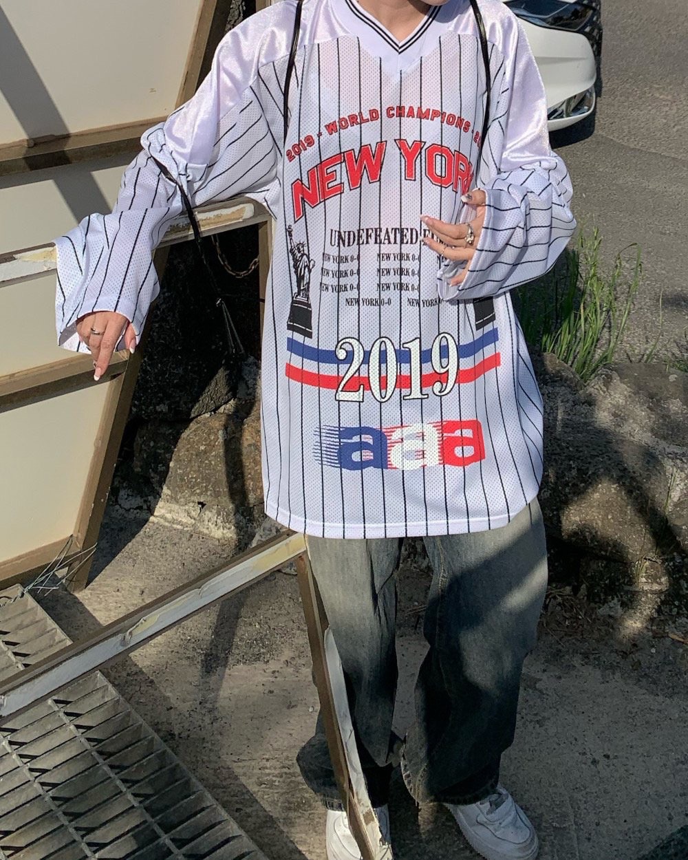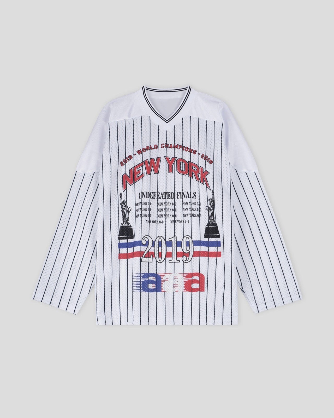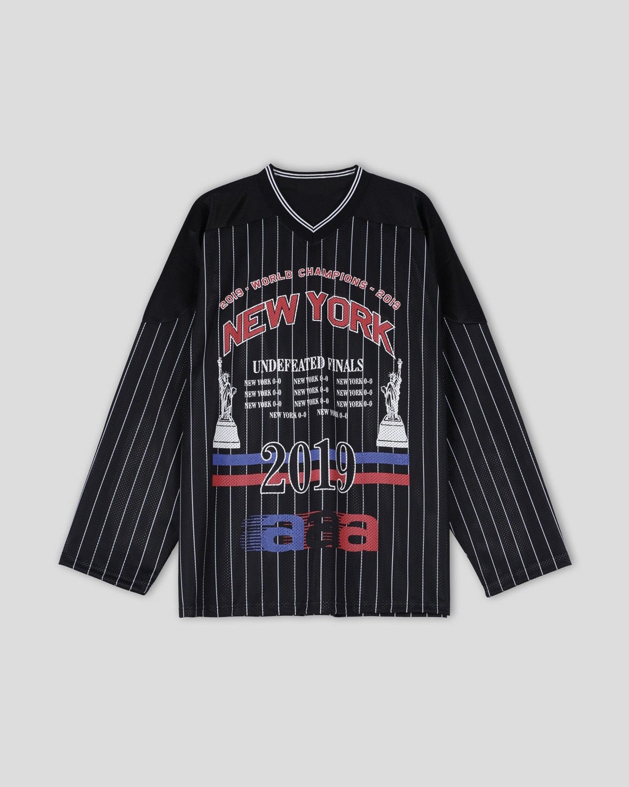 韓國 NEW YORK 2019 自由女神 直條紋 拼接 網眼 長袖 球衣 (2color)