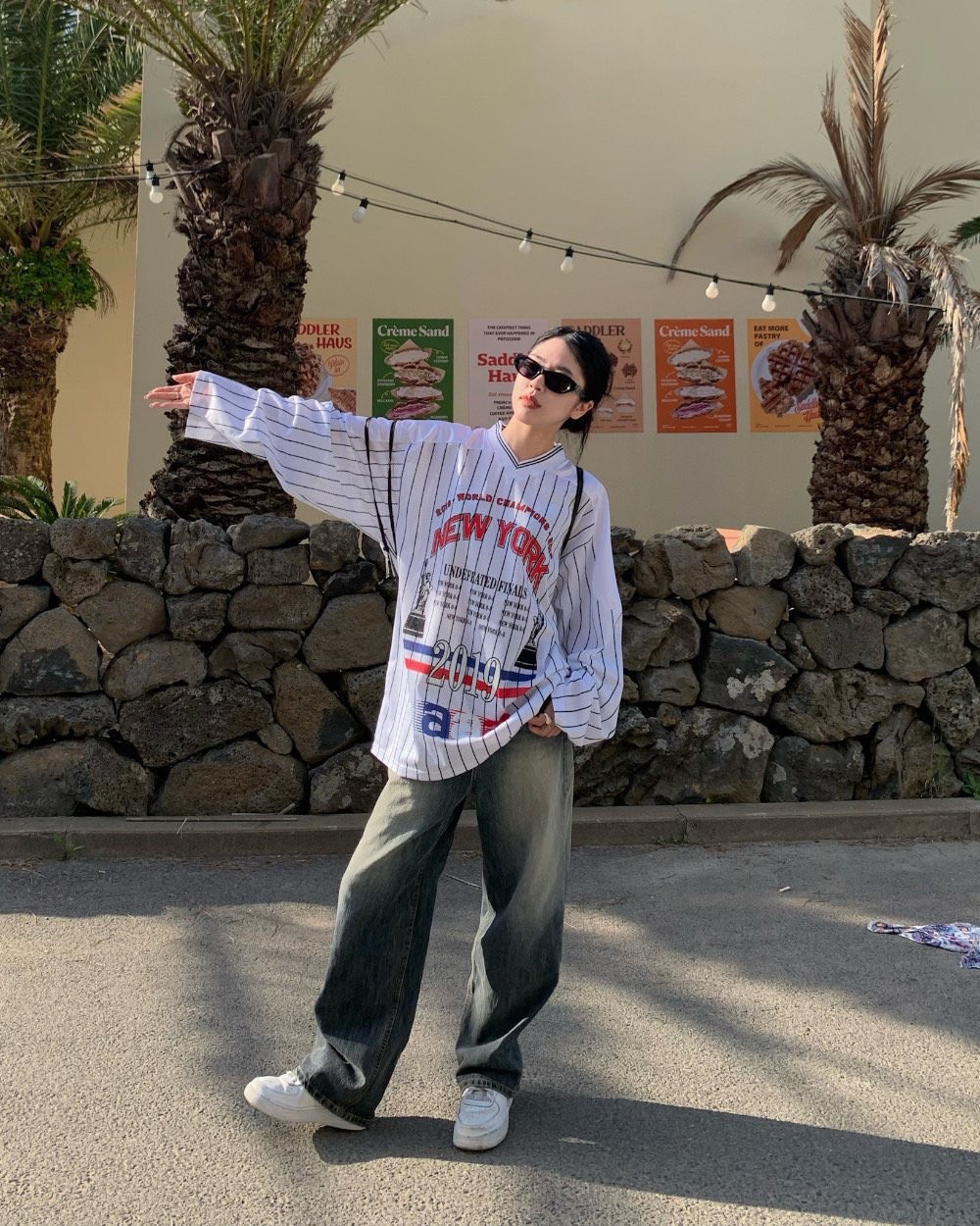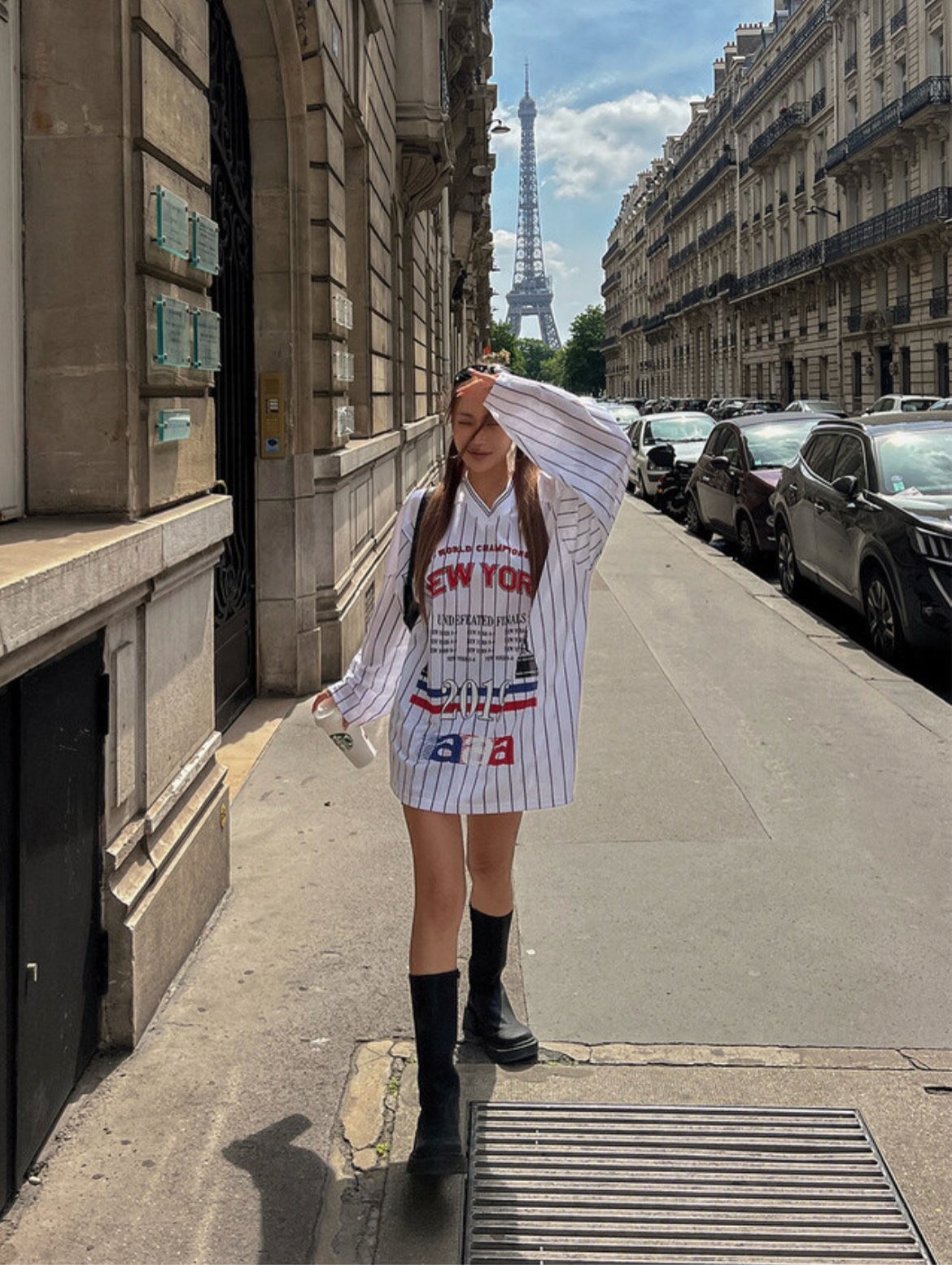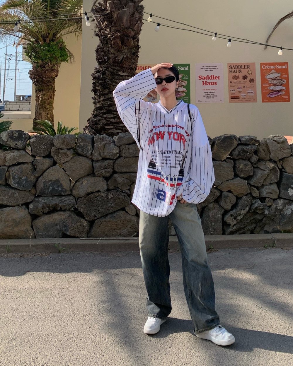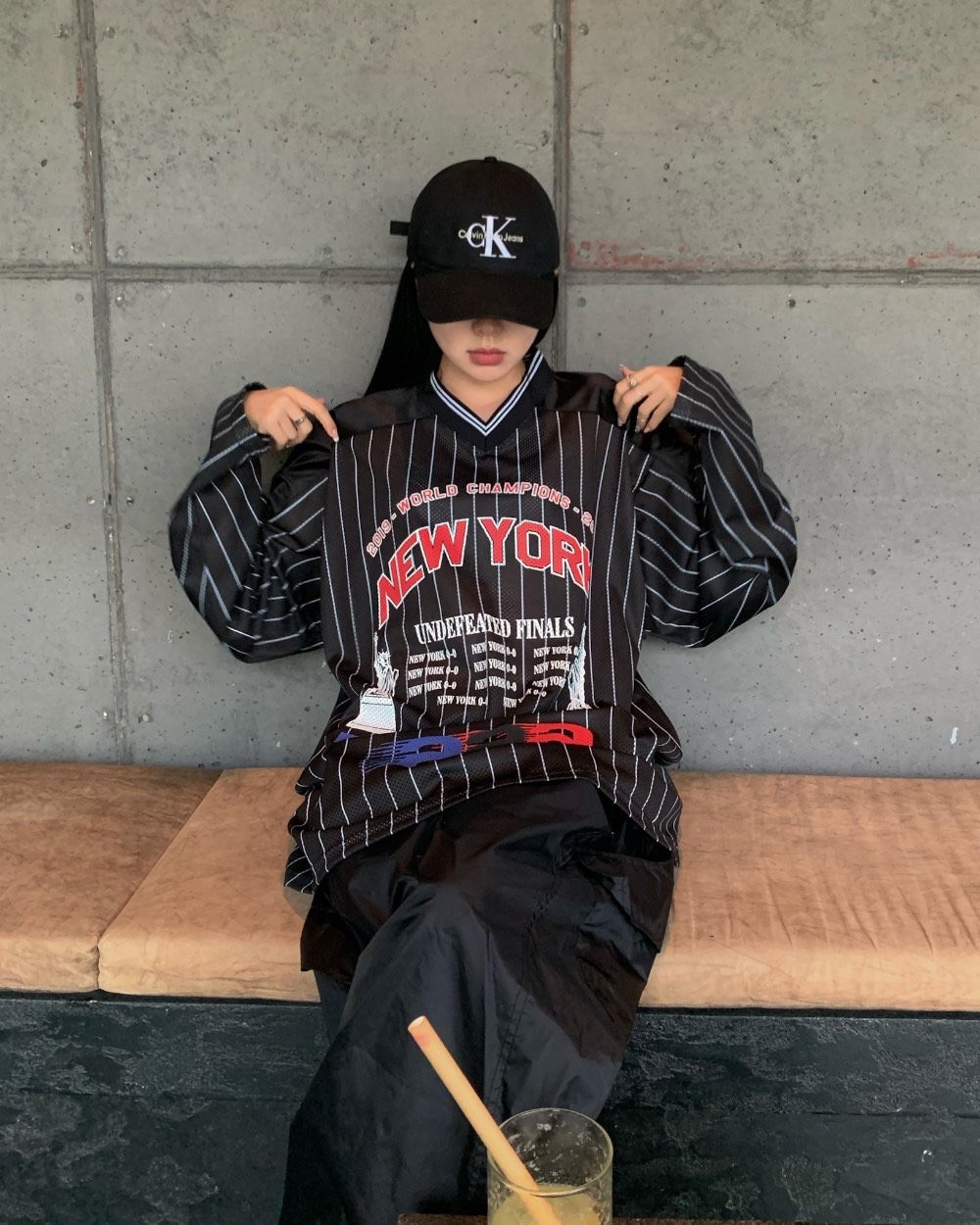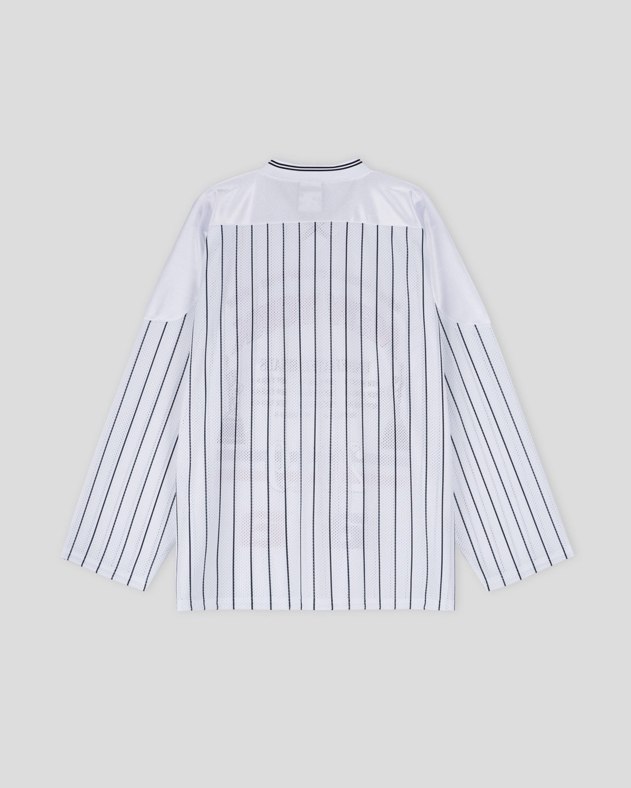 韓國 NEW YORK 2019 自由女神 直條紋 拼接 網眼 長袖 球衣 (2color)