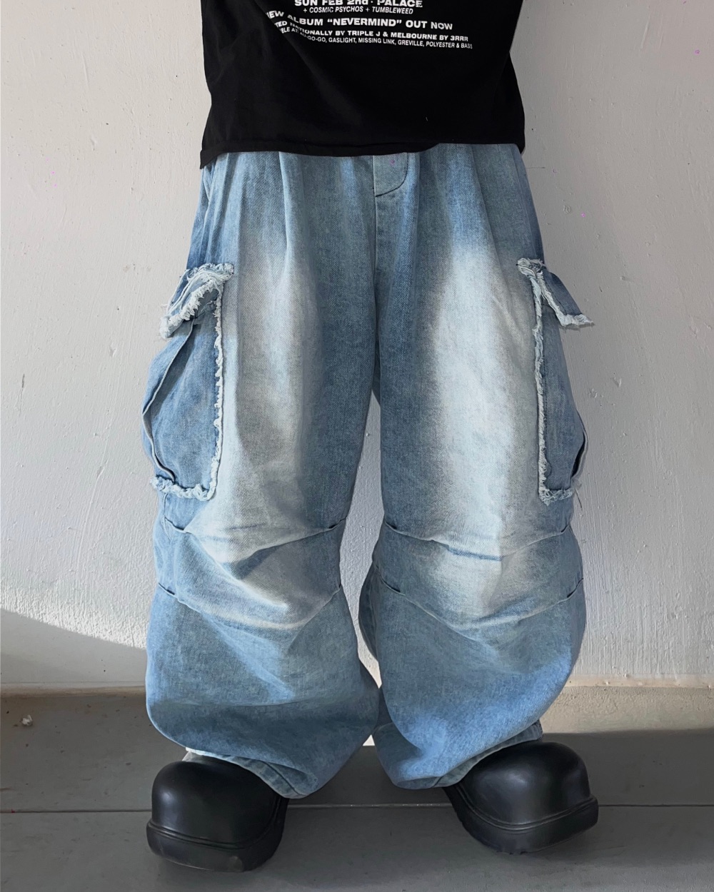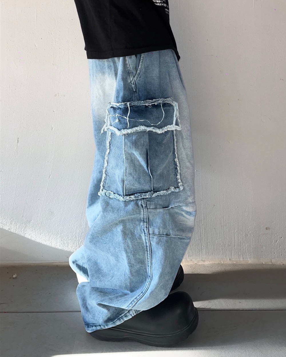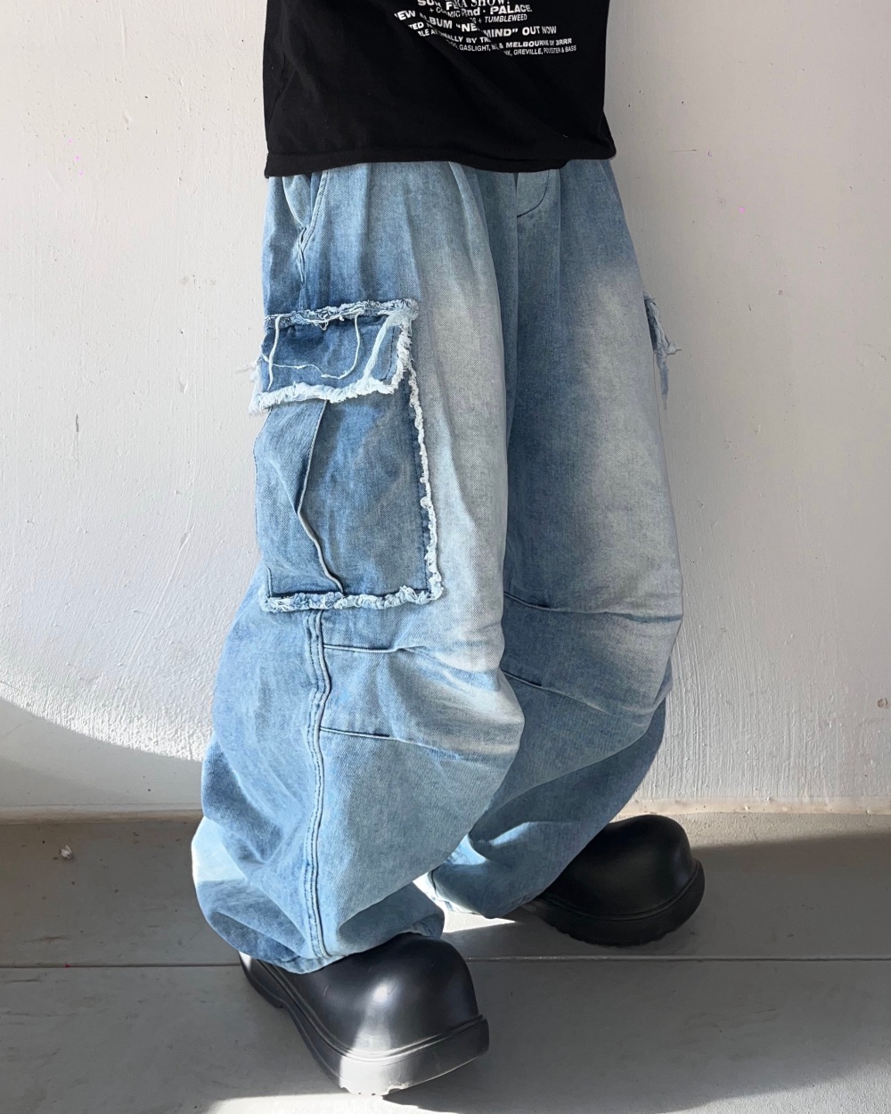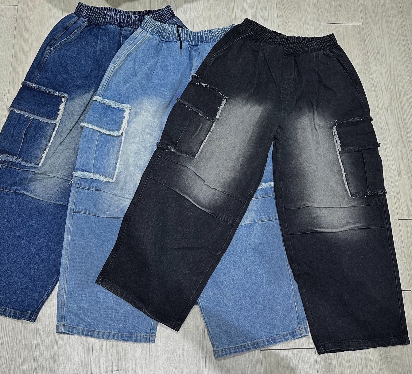 Cause closet 刷白 毛邊 破壞 大口袋 重磅 水洗 寬版 牛仔褲 (3color)