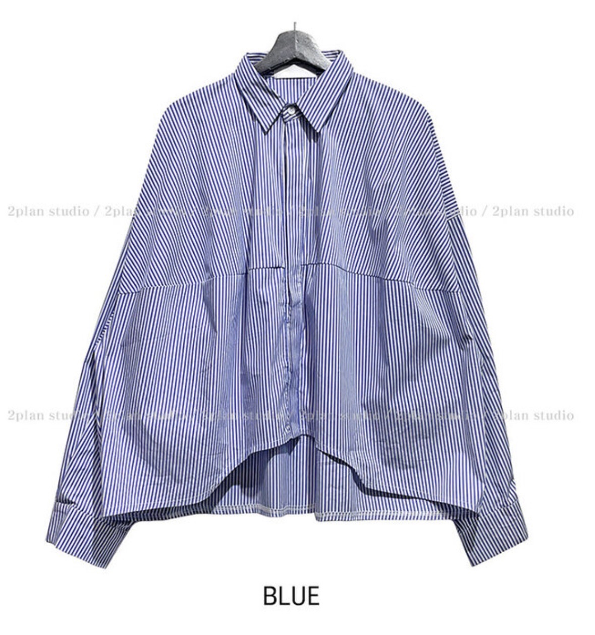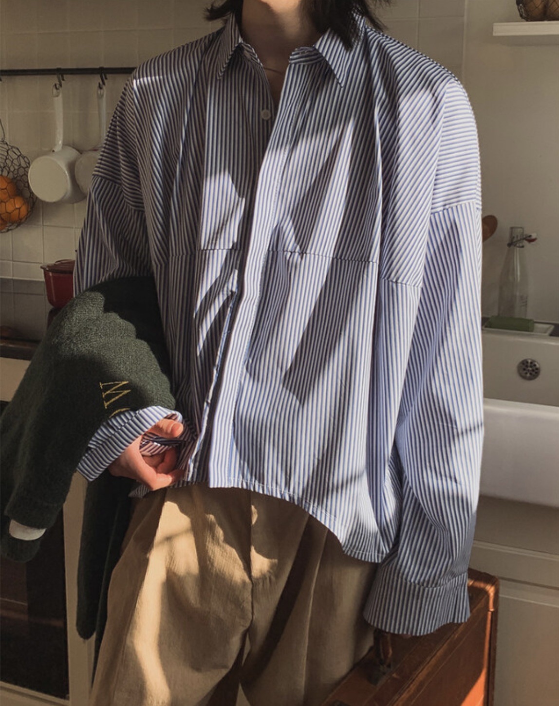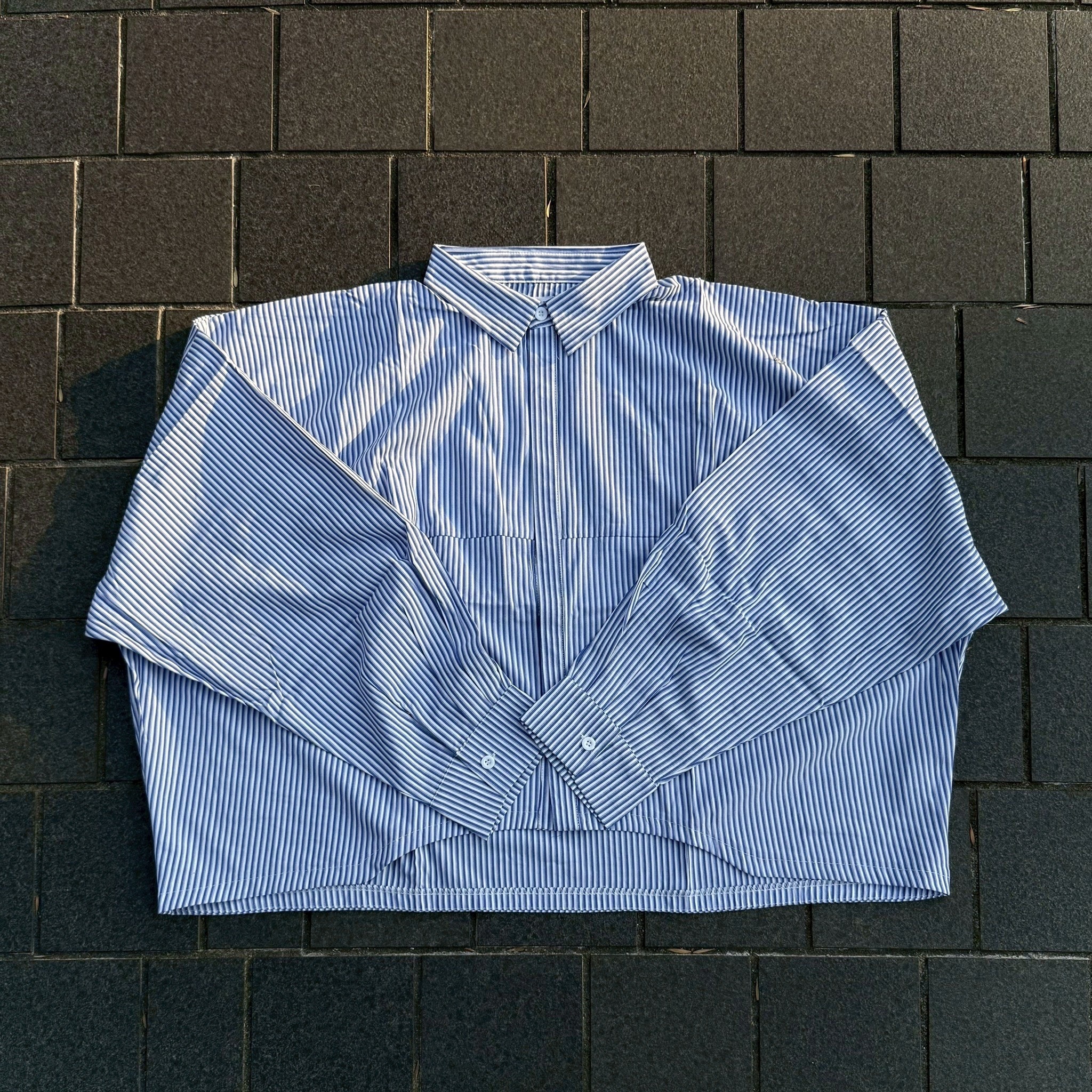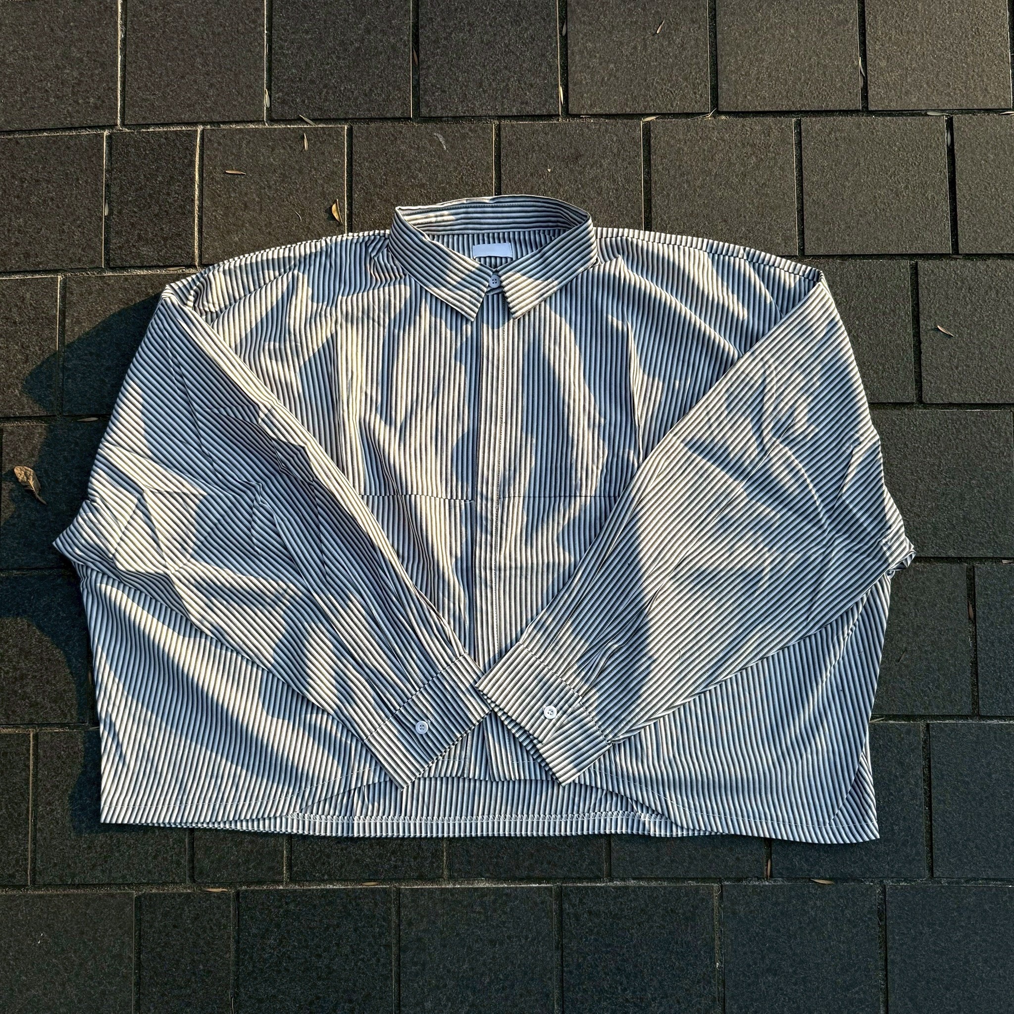 韓國 BOXY 寬短 直條紋 落肩 剪裁 長袖襯衫 (2color)