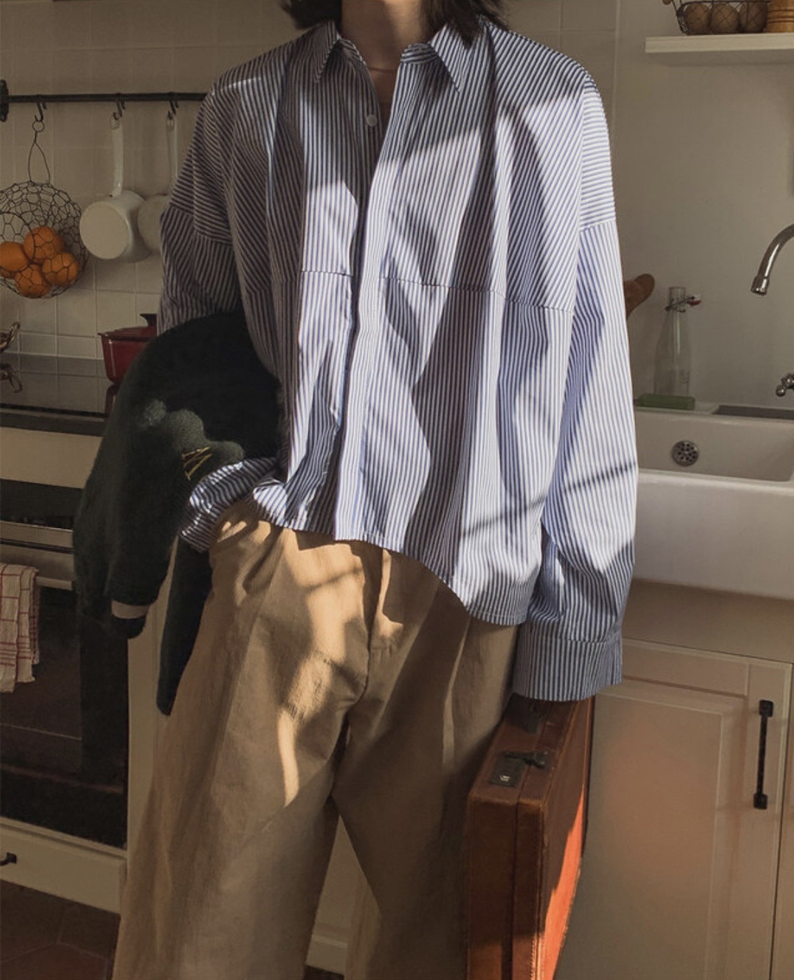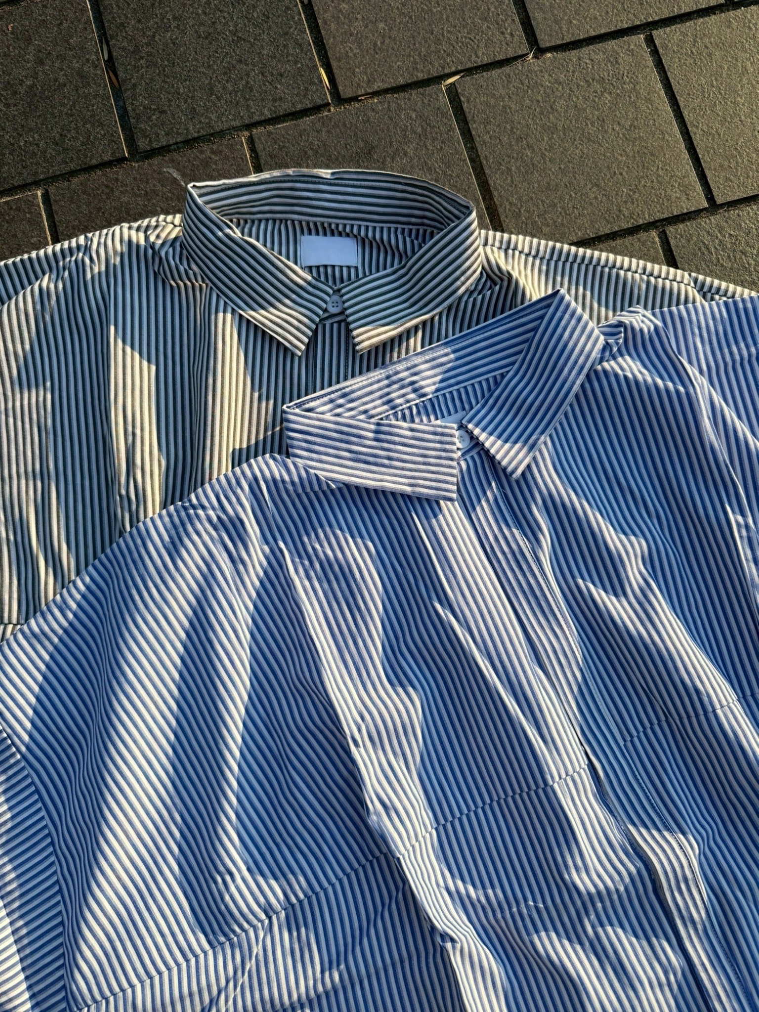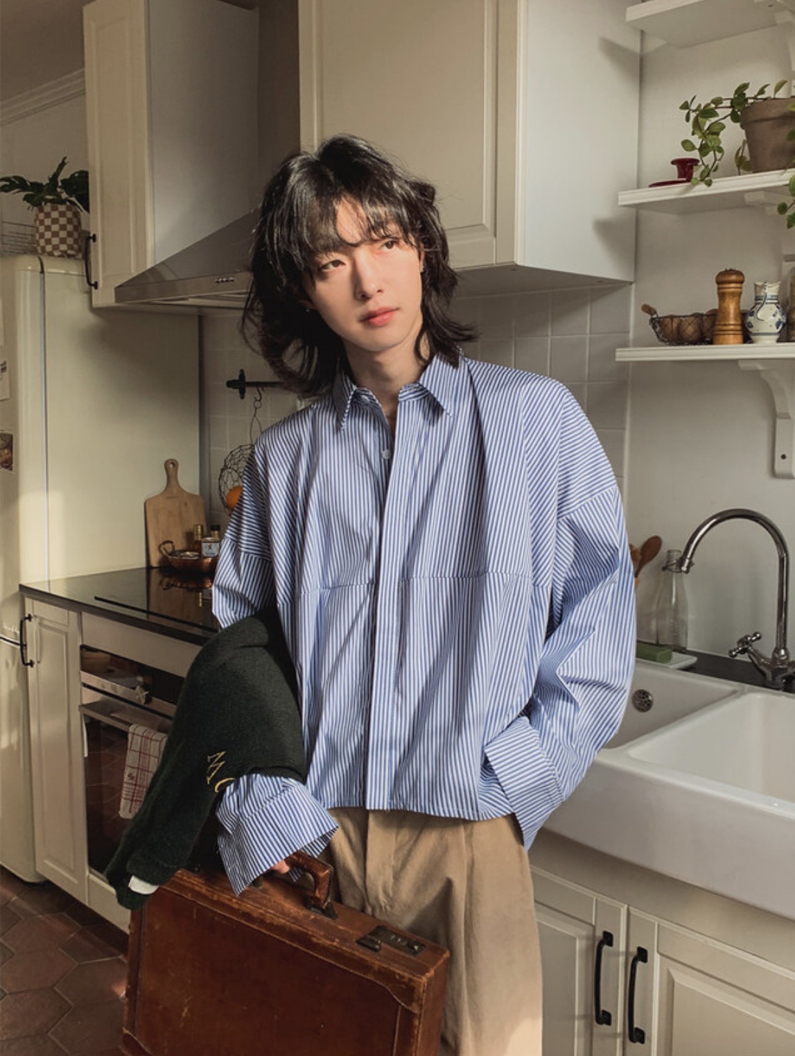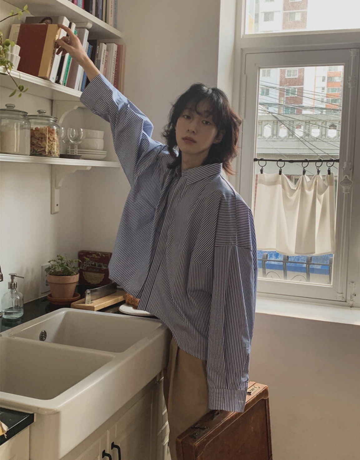 韓國 BOXY 寬短 直條紋 落肩 剪裁 長袖襯衫 (2color)