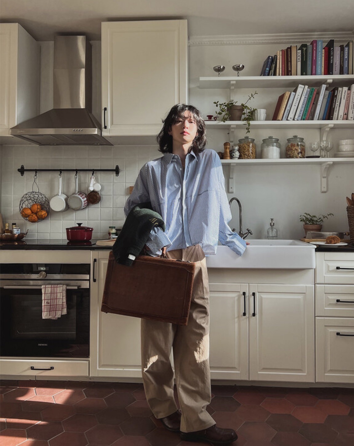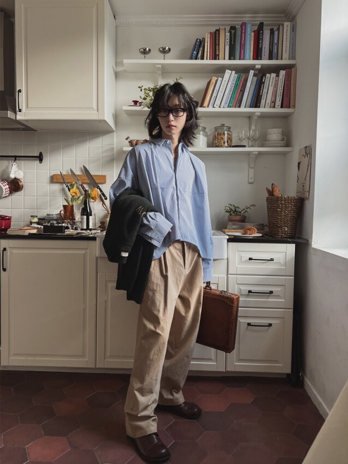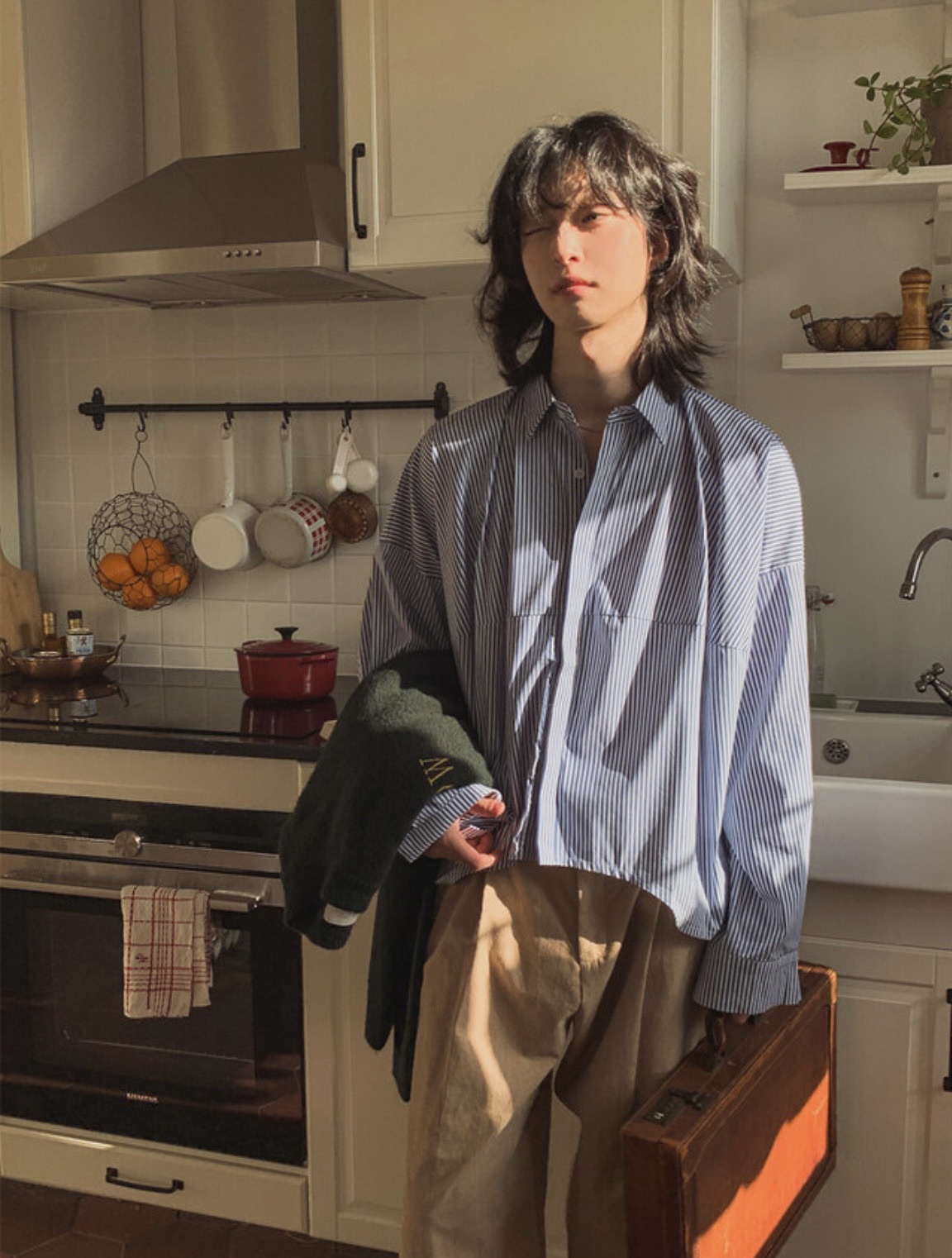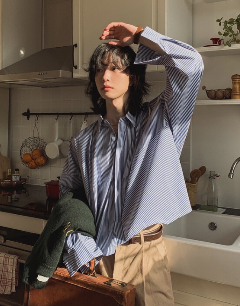 韓國 BOXY 寬短 直條紋 落肩 剪裁 長袖襯衫 (2color)