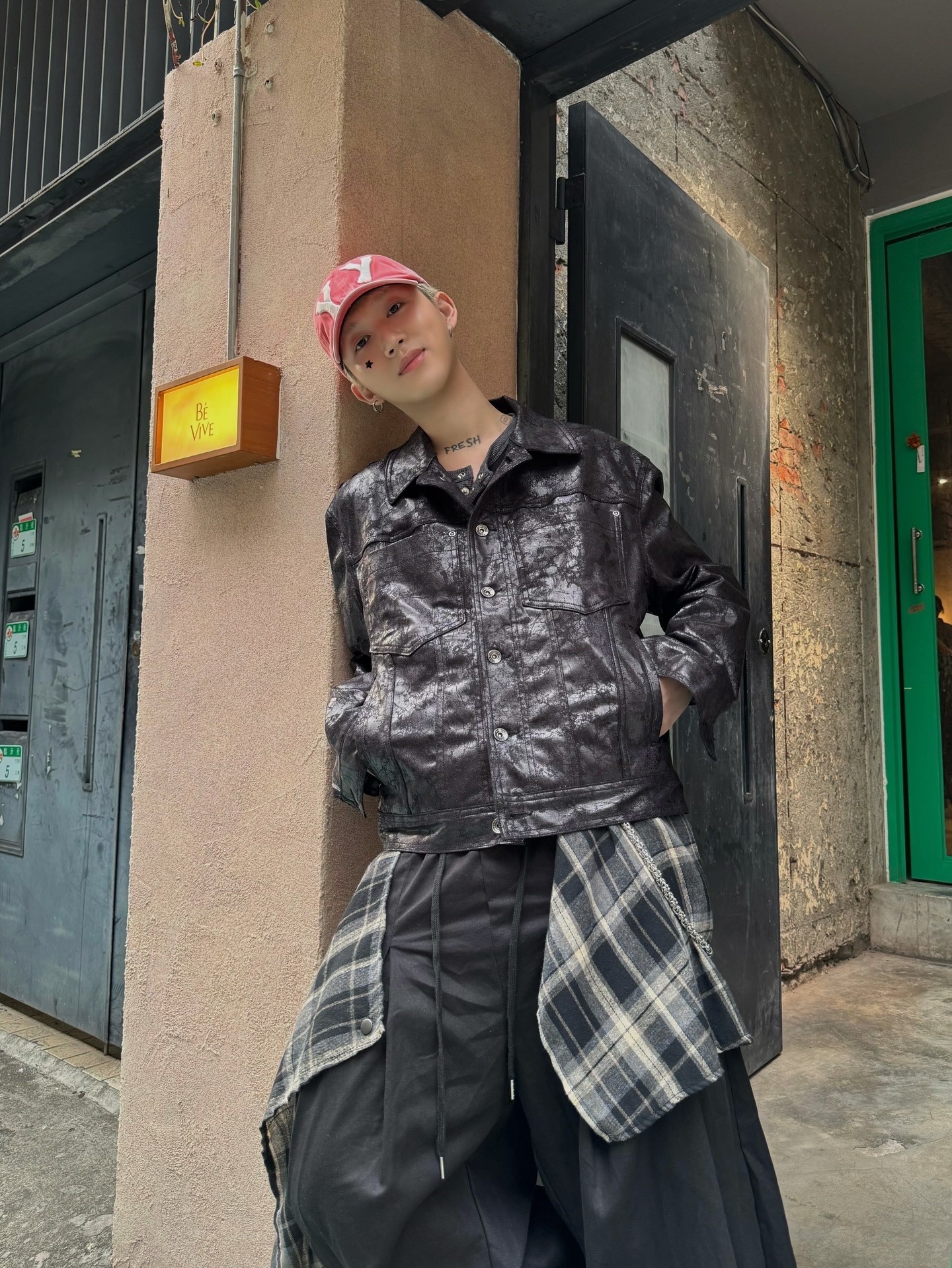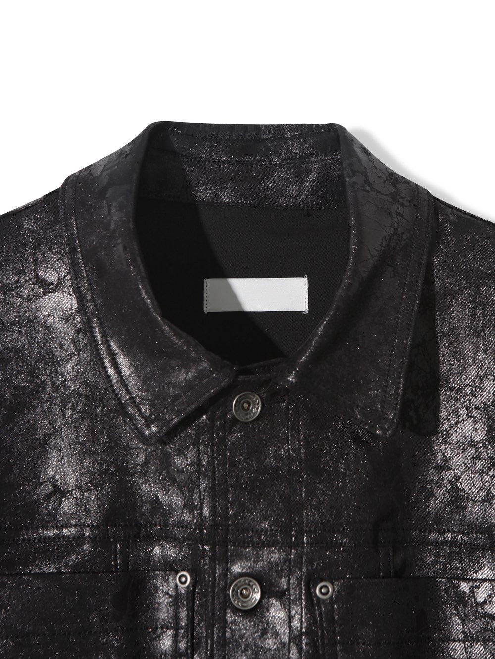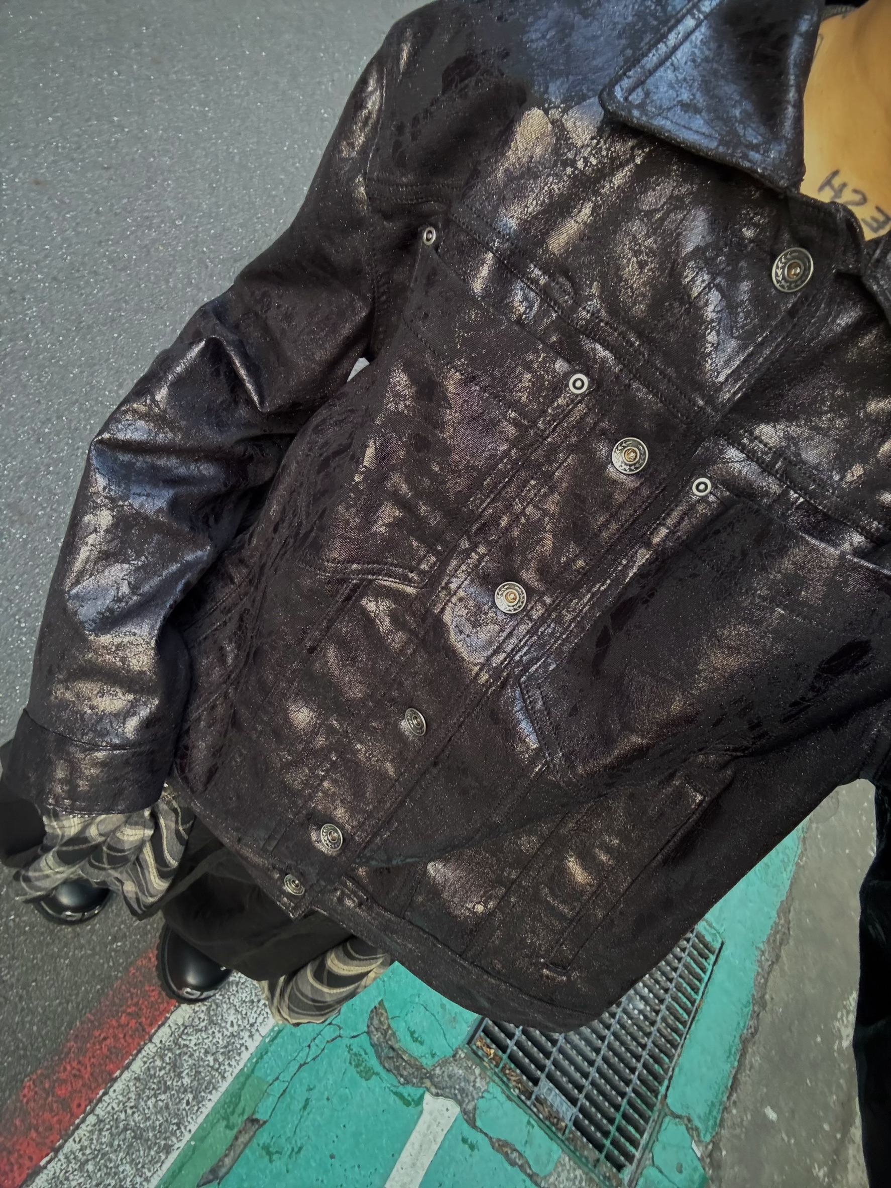 上蠟的油亮面料、硬挺的版型、完美剛好的短版長度