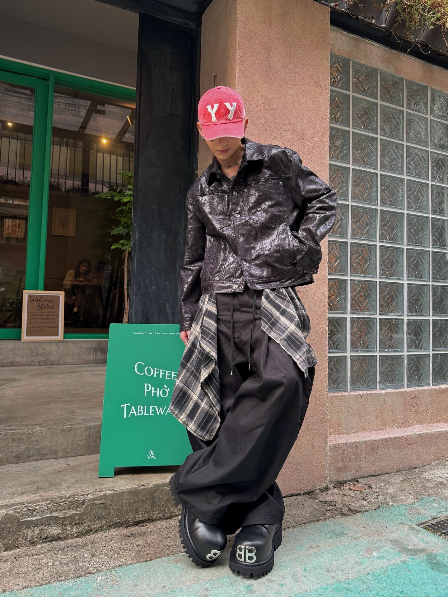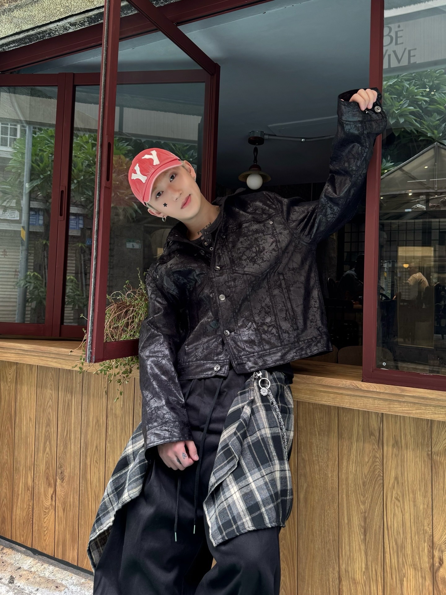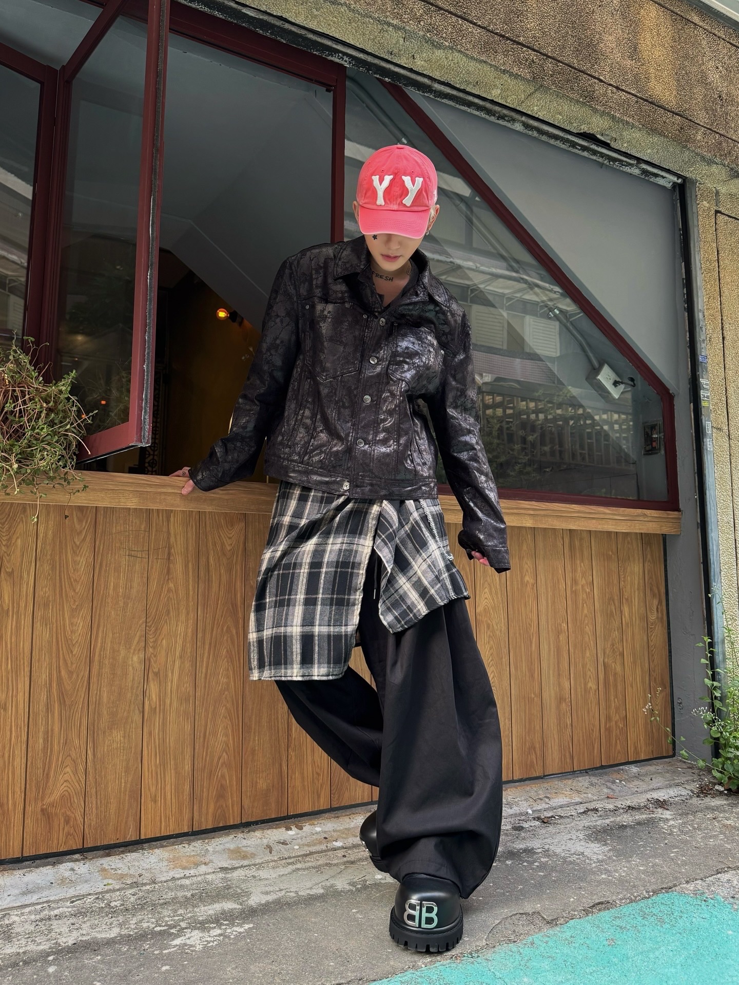 上蠟的油亮面料、硬挺的版型、完美剛好的短版長度