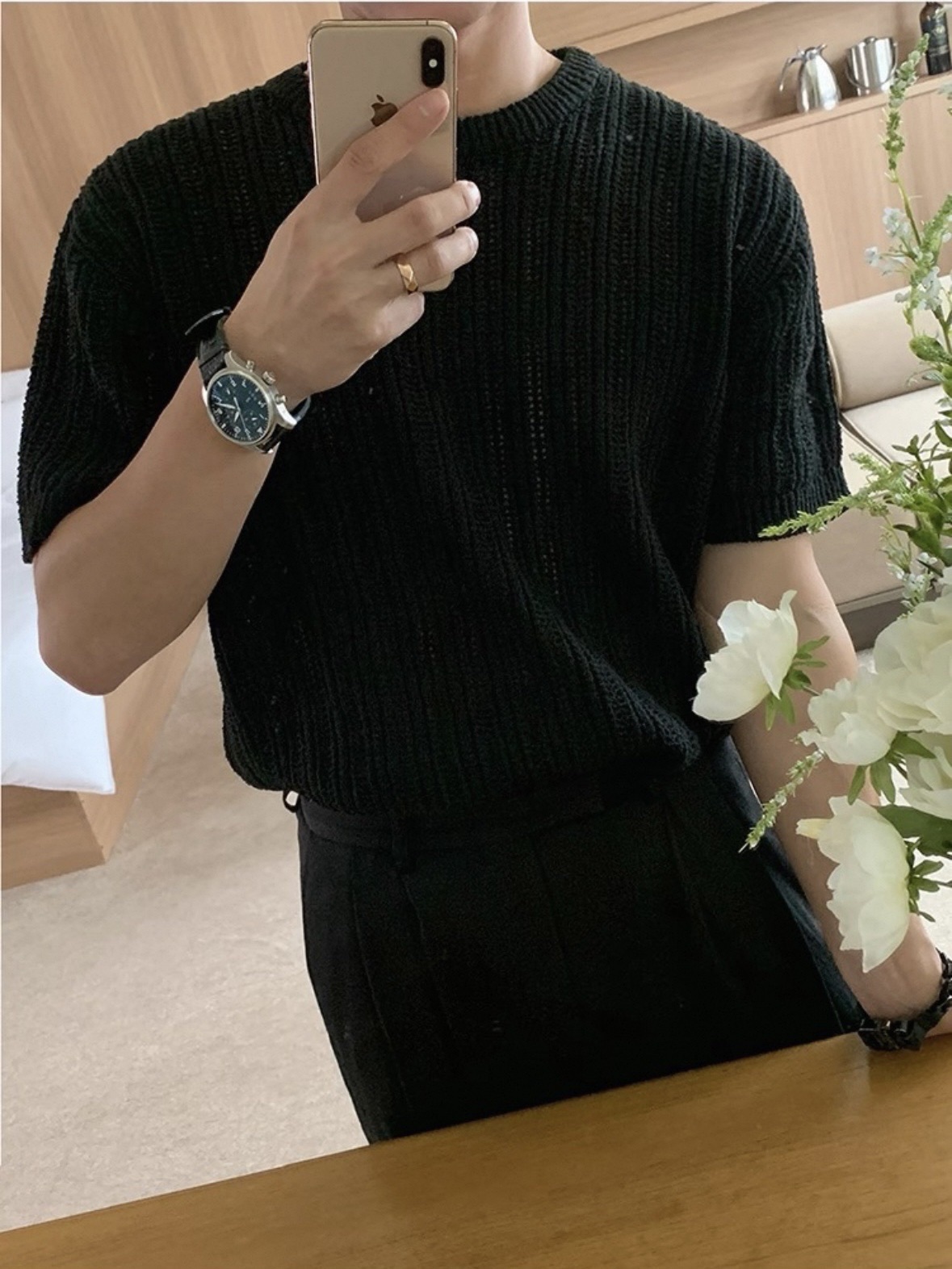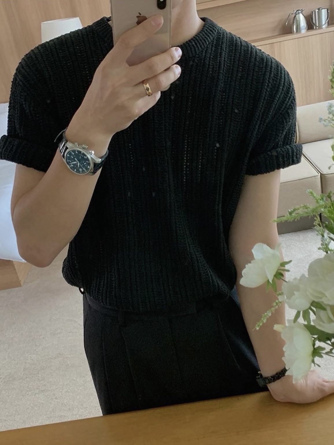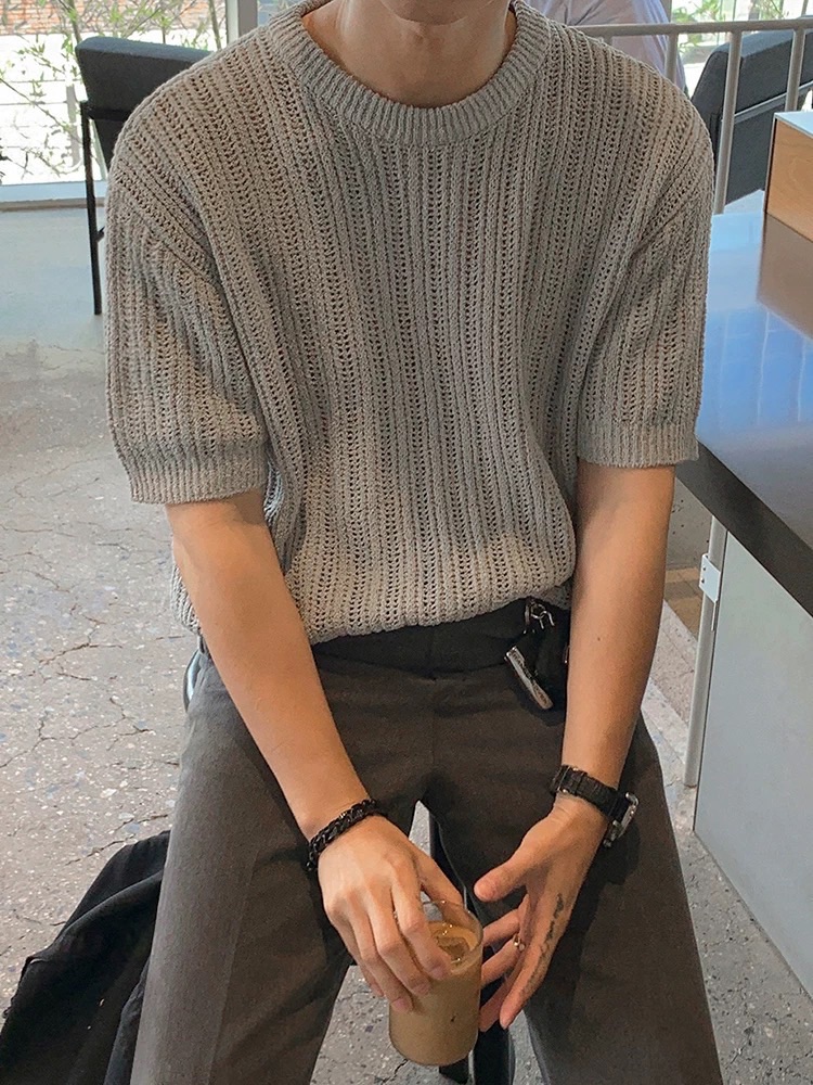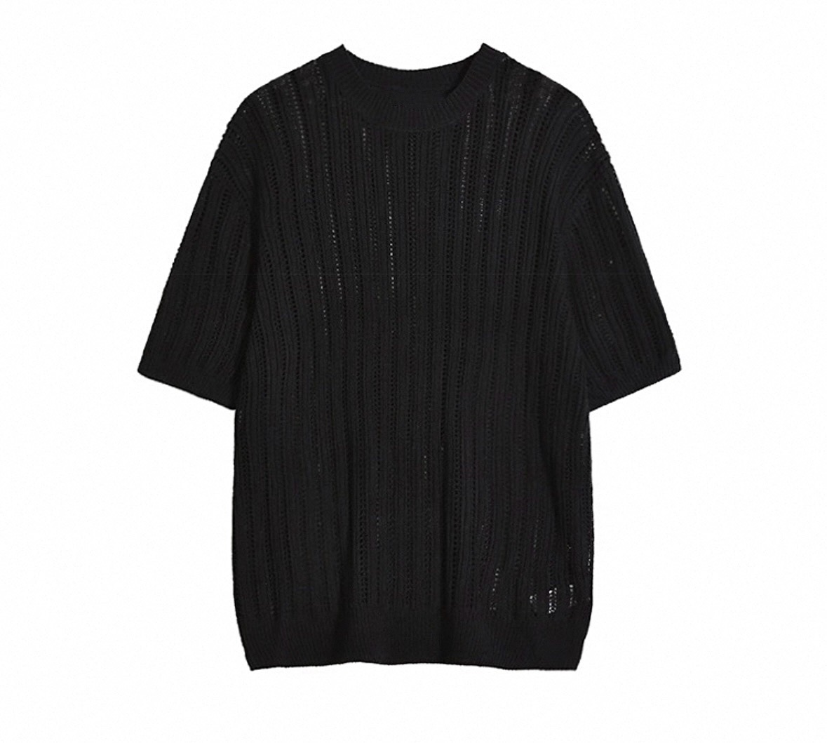 韓國 冰絲 鏤空 設計感 針織 短袖 上衣 (2color)