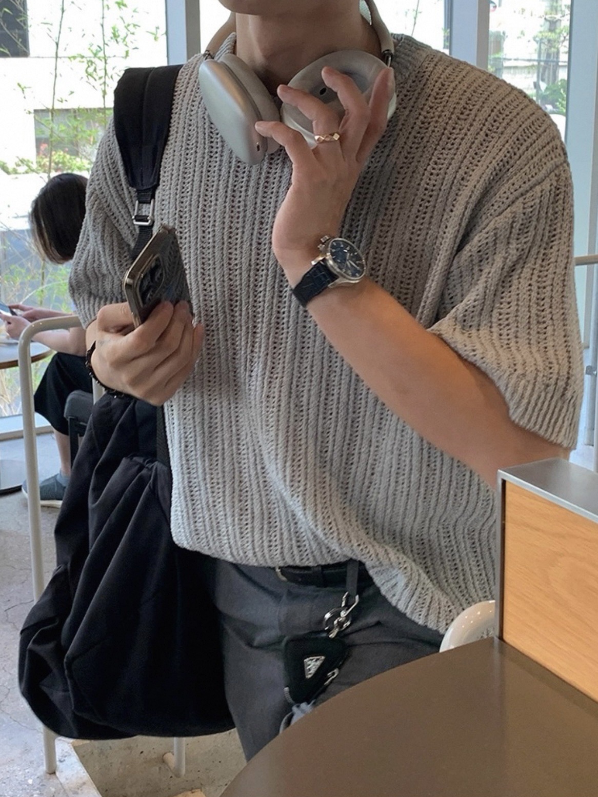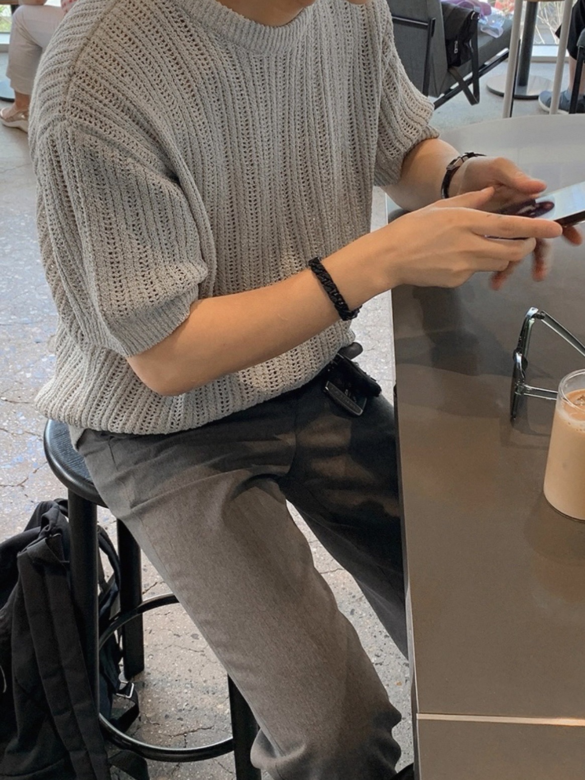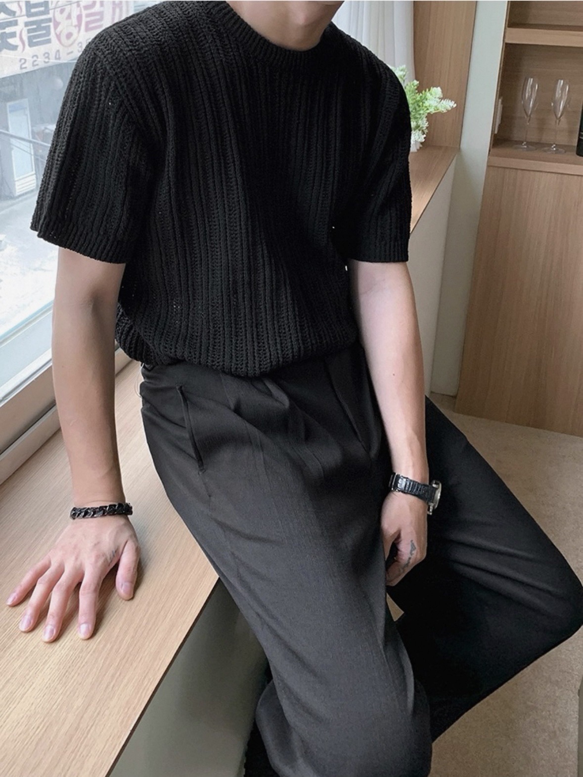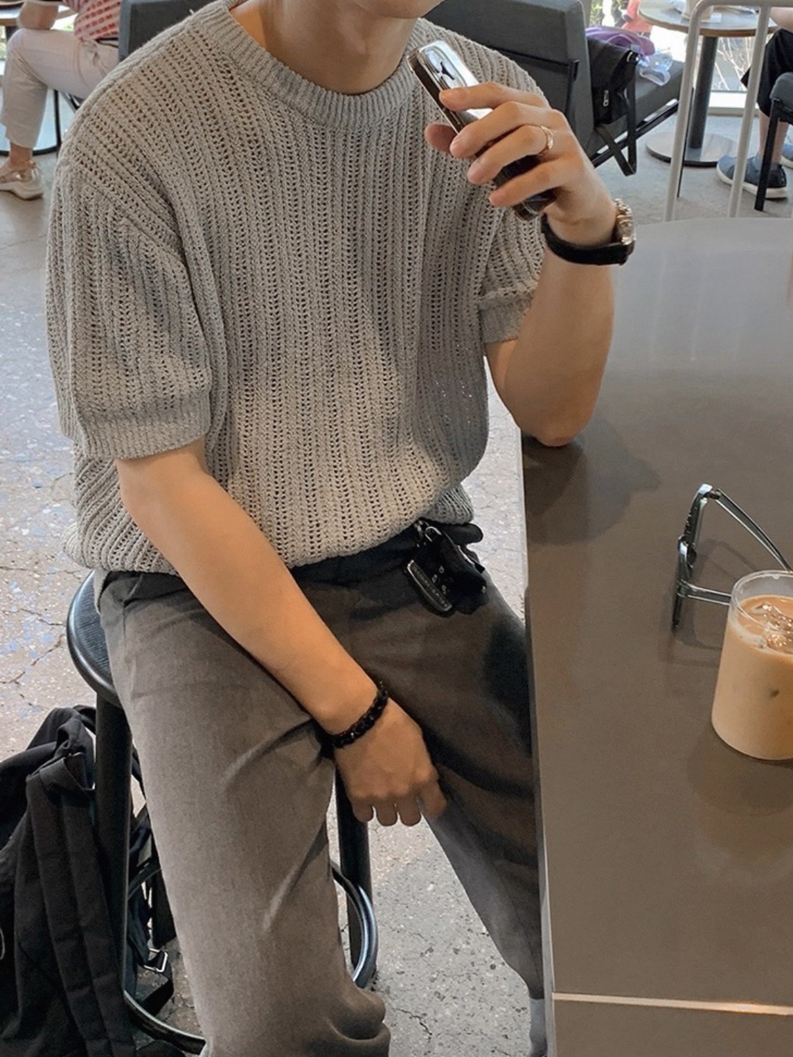 韓國 冰絲 鏤空 設計感 針織 短袖 上衣 (2color)