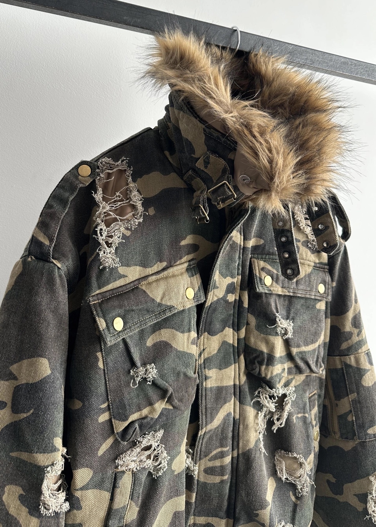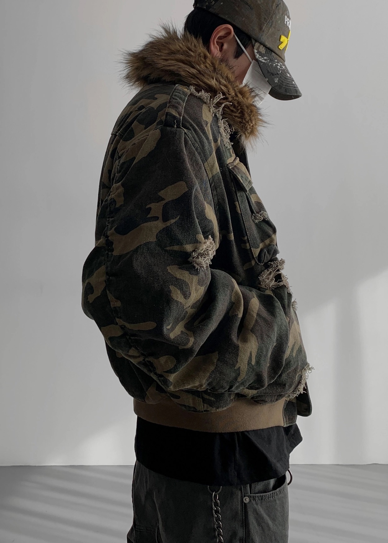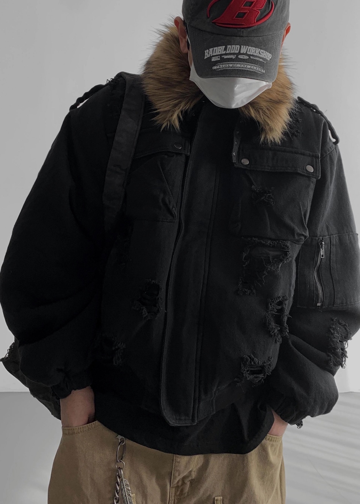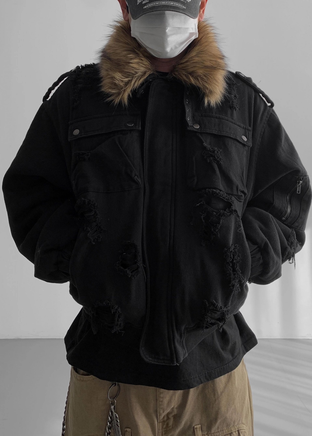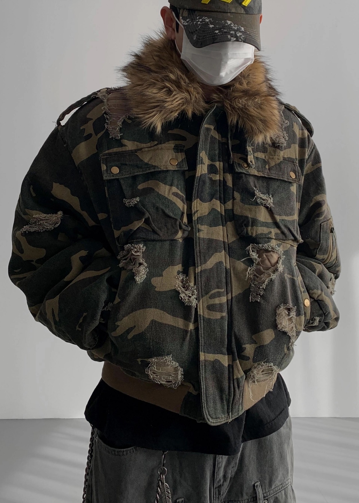 韓國 迷彩 全黑 絨毛領 重工 破壞 設計感 多口袋 重磅 工作外套 (2color)