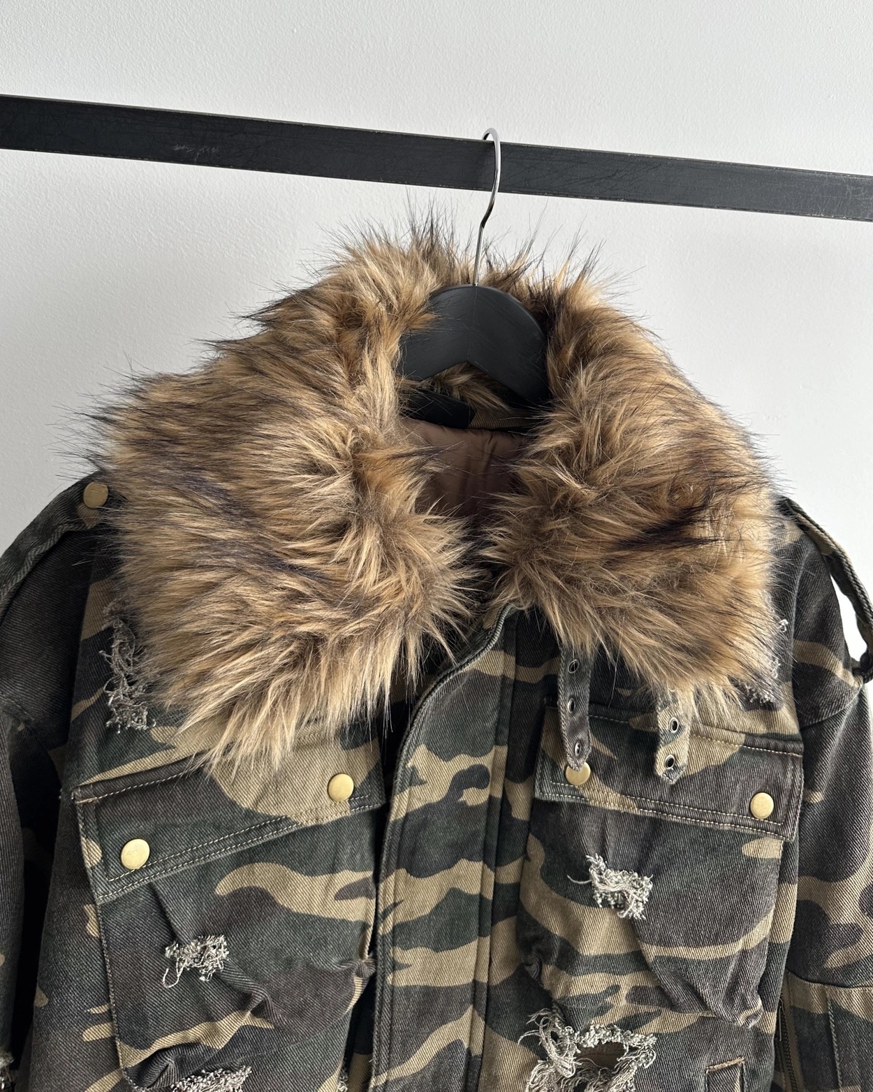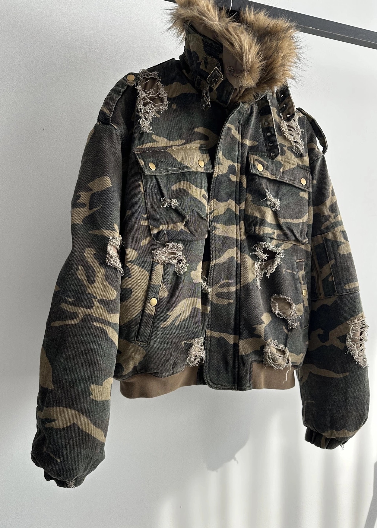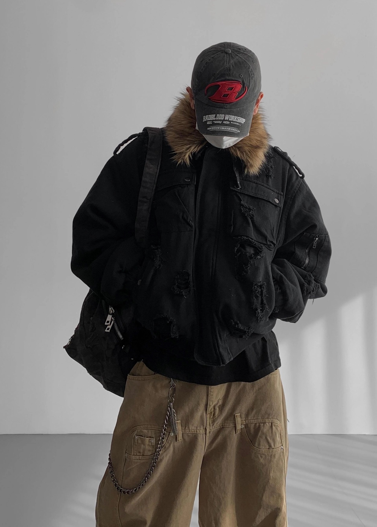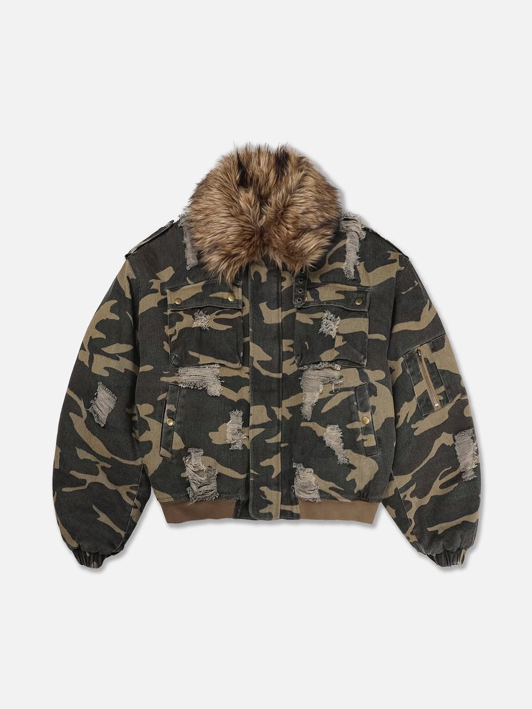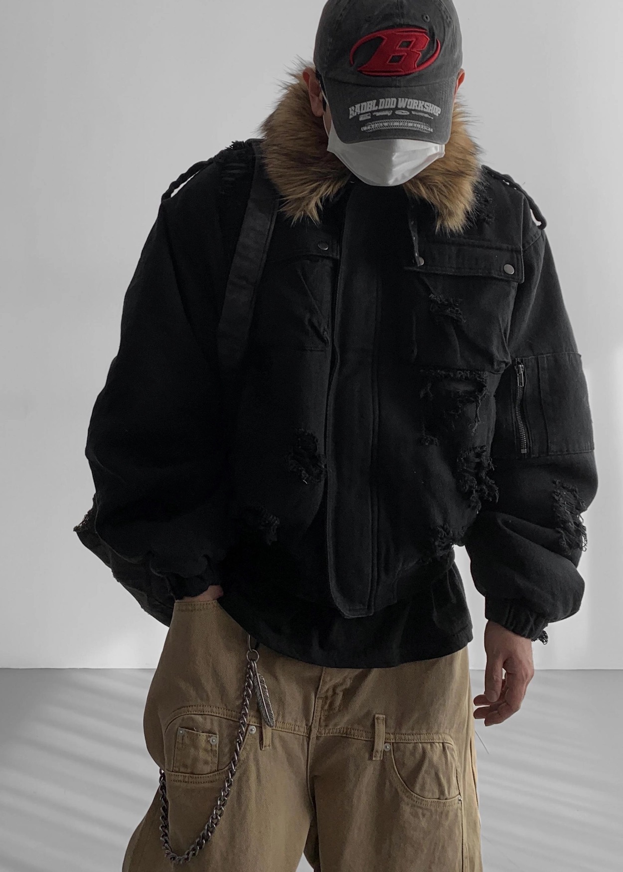 韓國 迷彩 全黑 絨毛領 重工 破壞 設計感 多口袋 重磅 工作外套 (2color)