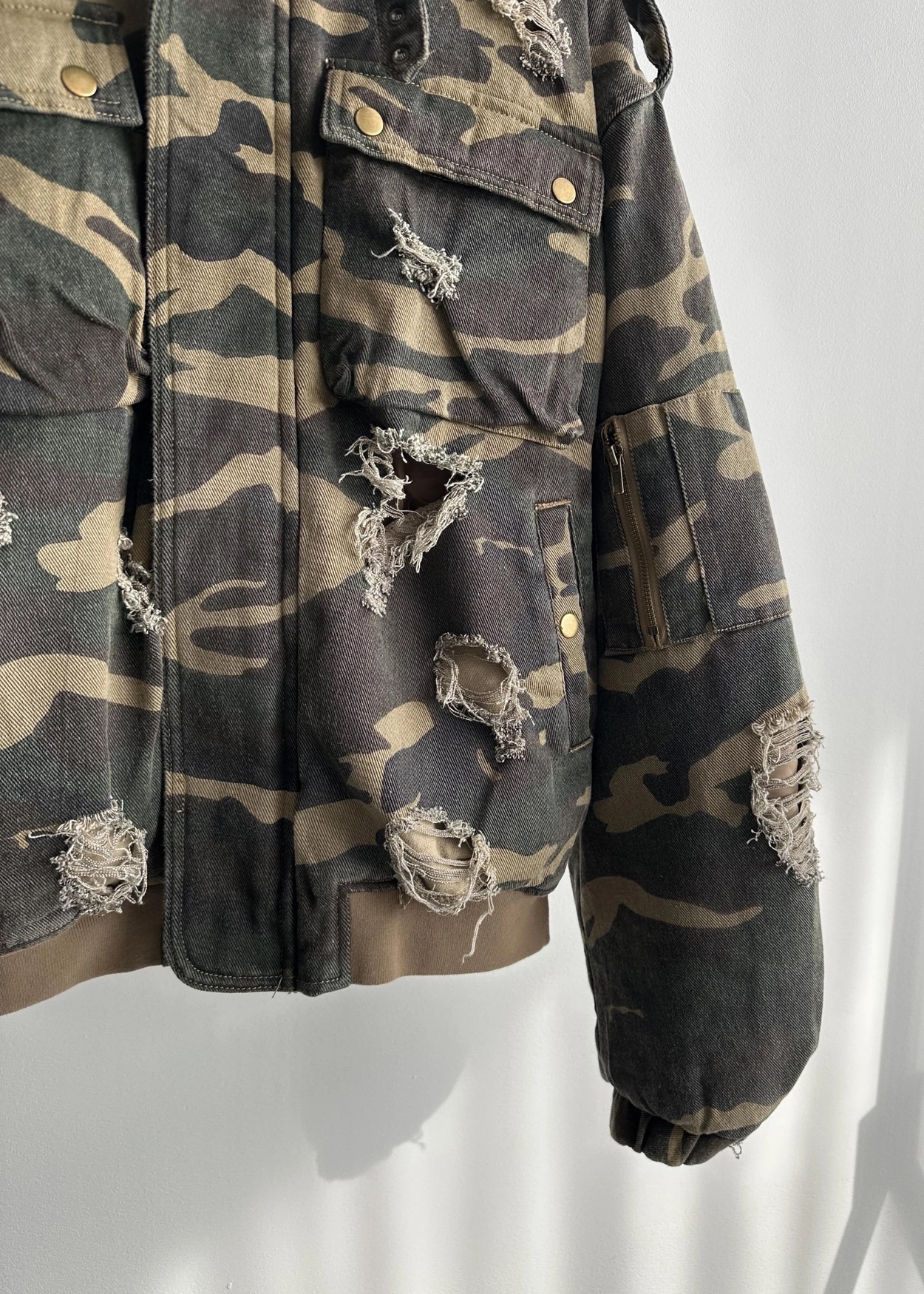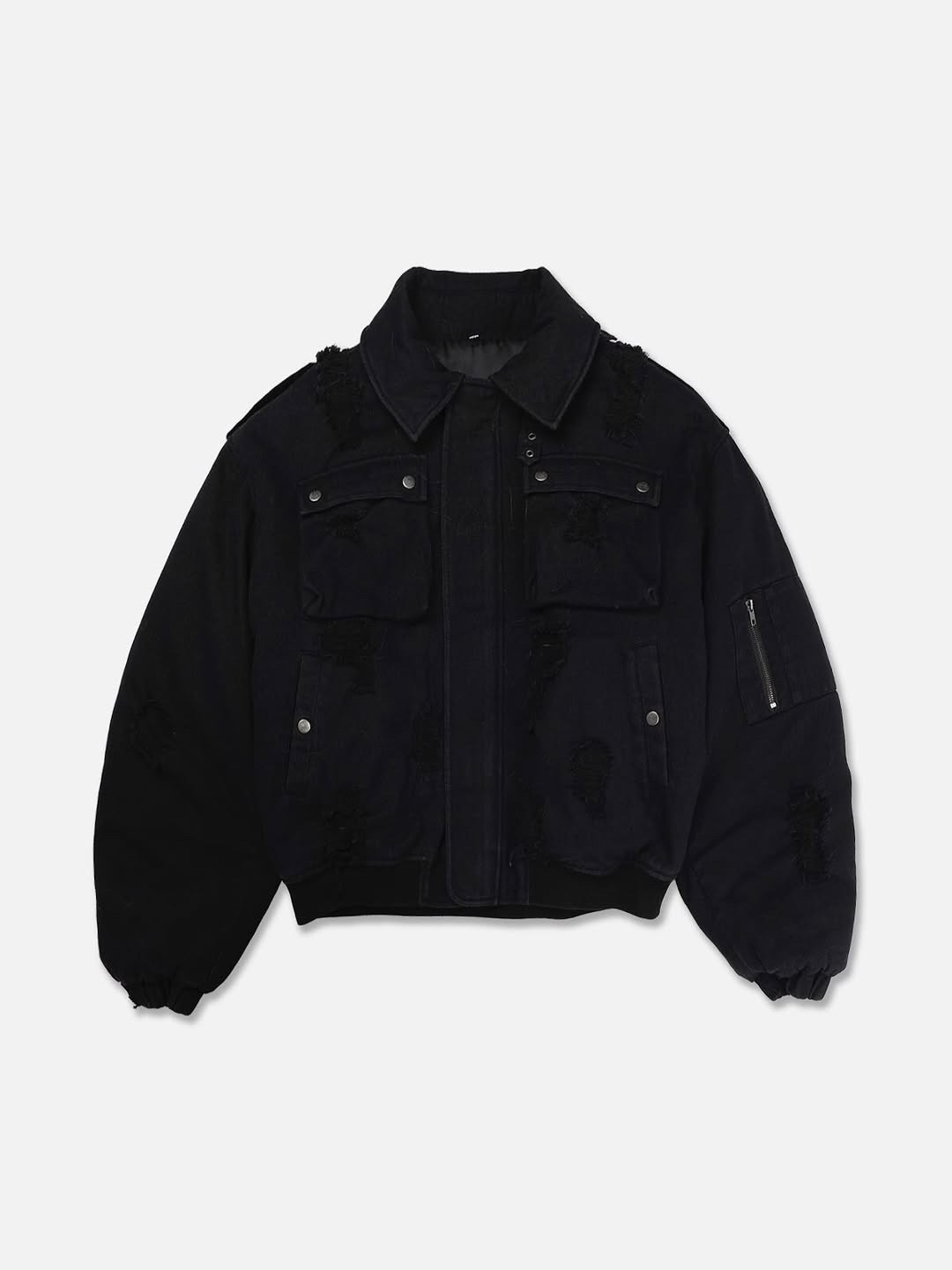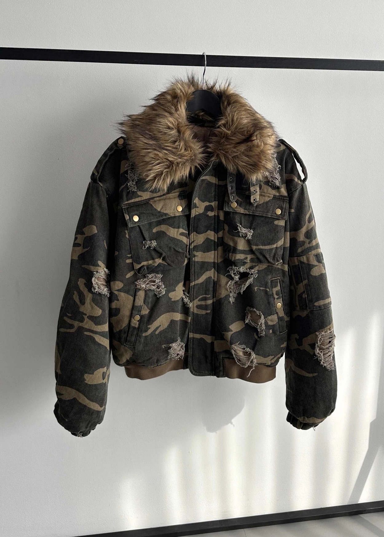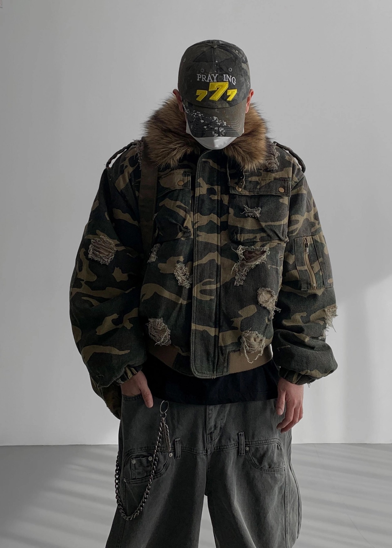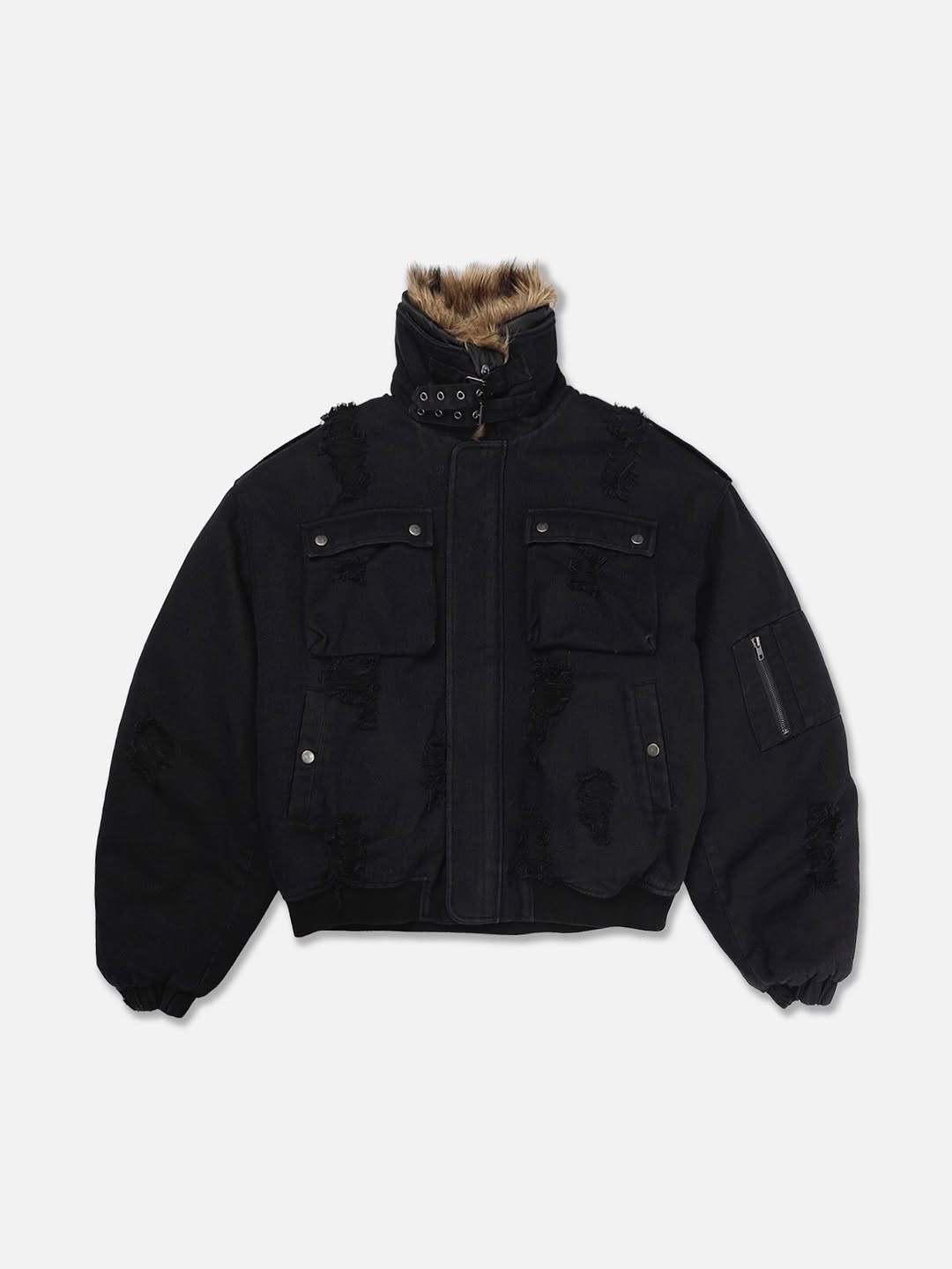 韓國 迷彩 全黑 絨毛領 重工 破壞 設計感 多口袋 重磅 工作外套 (2color)