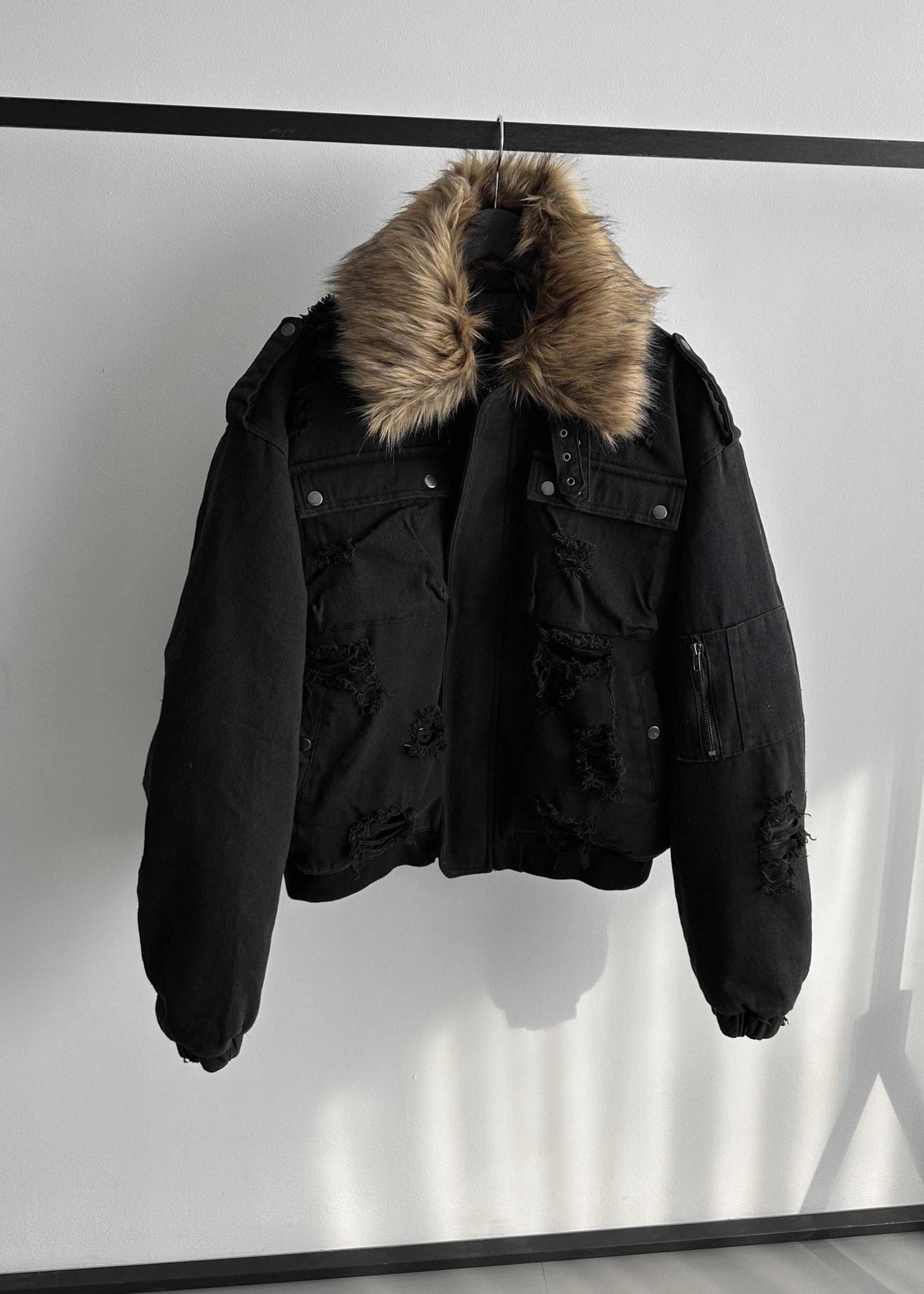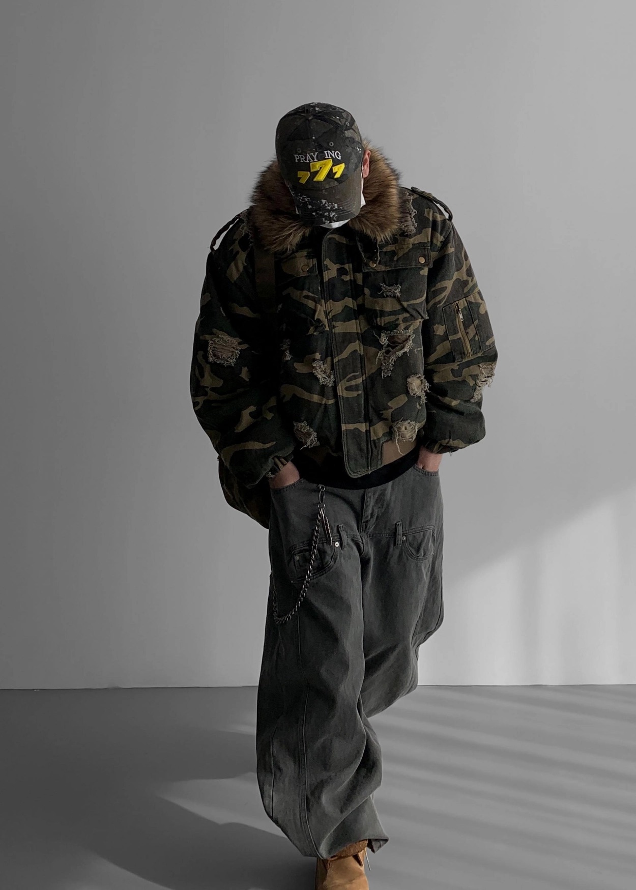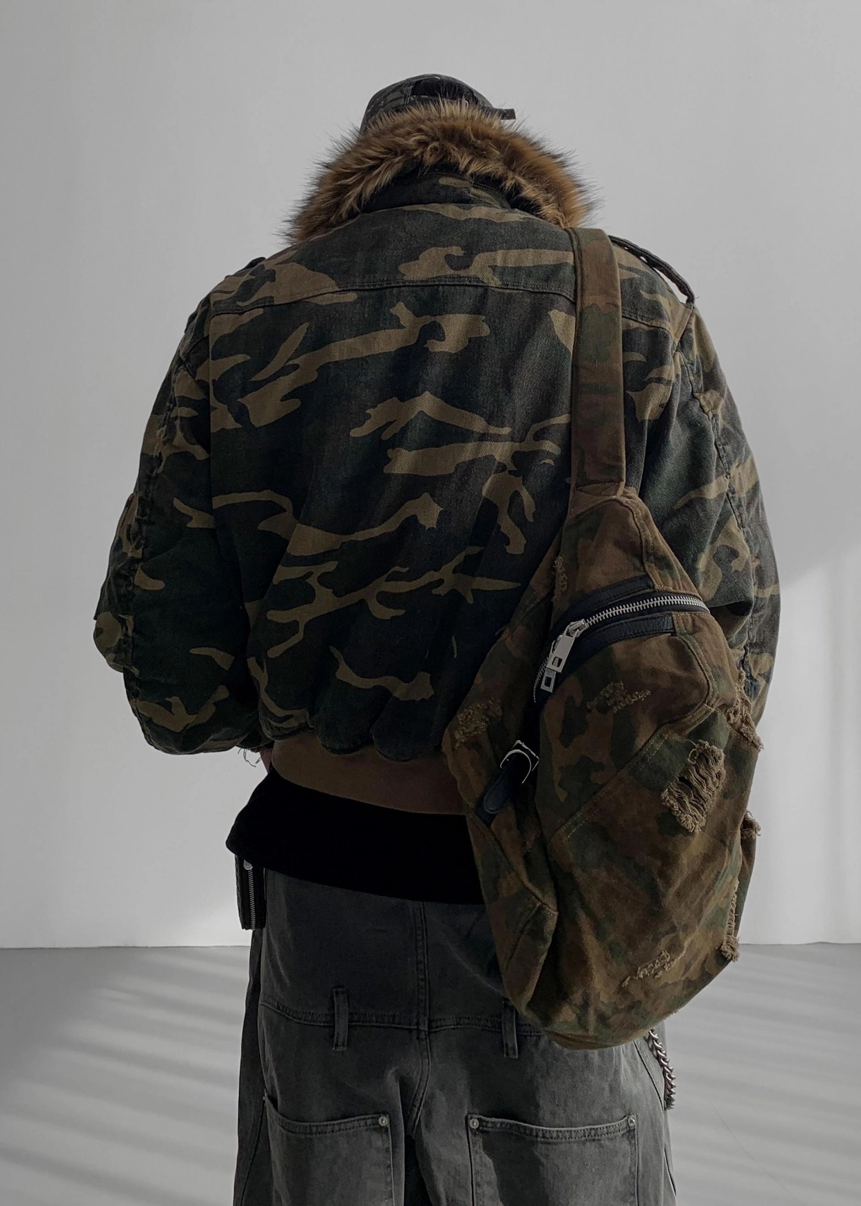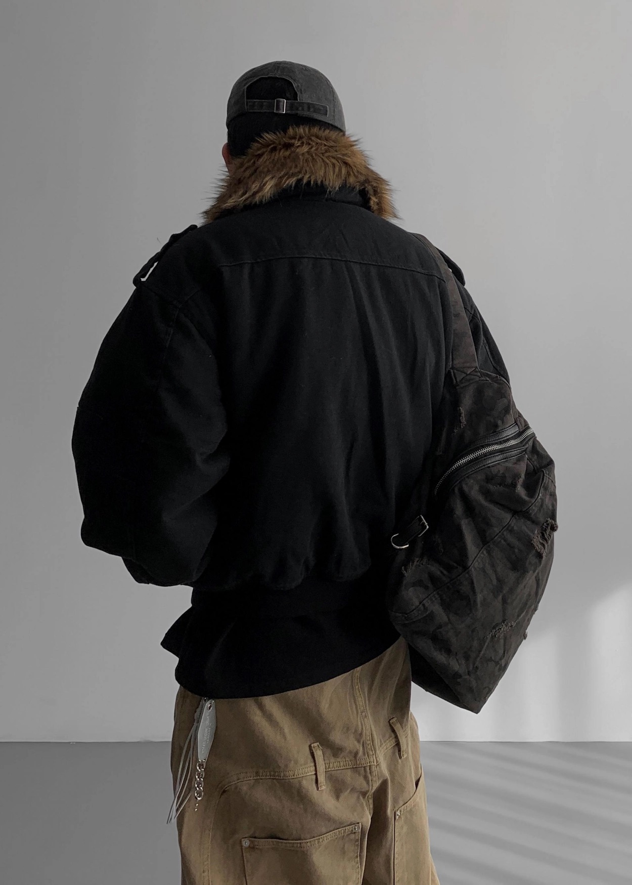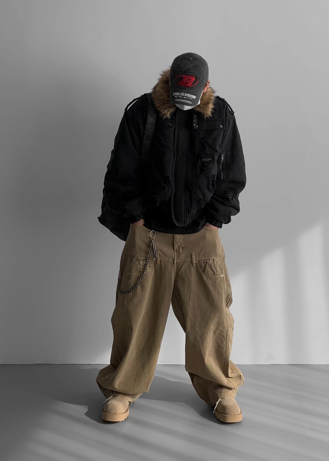 韓國 迷彩 全黑 絨毛領 重工 破壞 設計感 多口袋 重磅 工作外套 (2color)