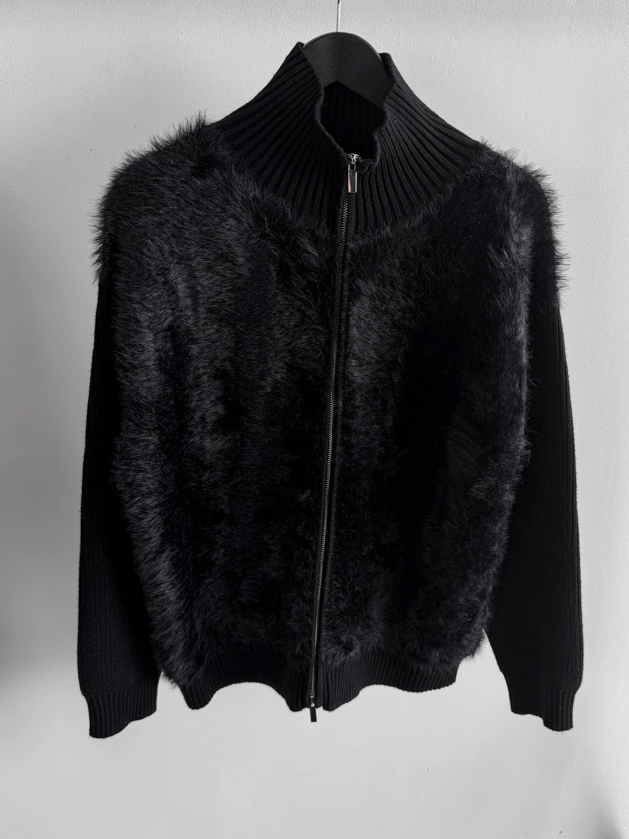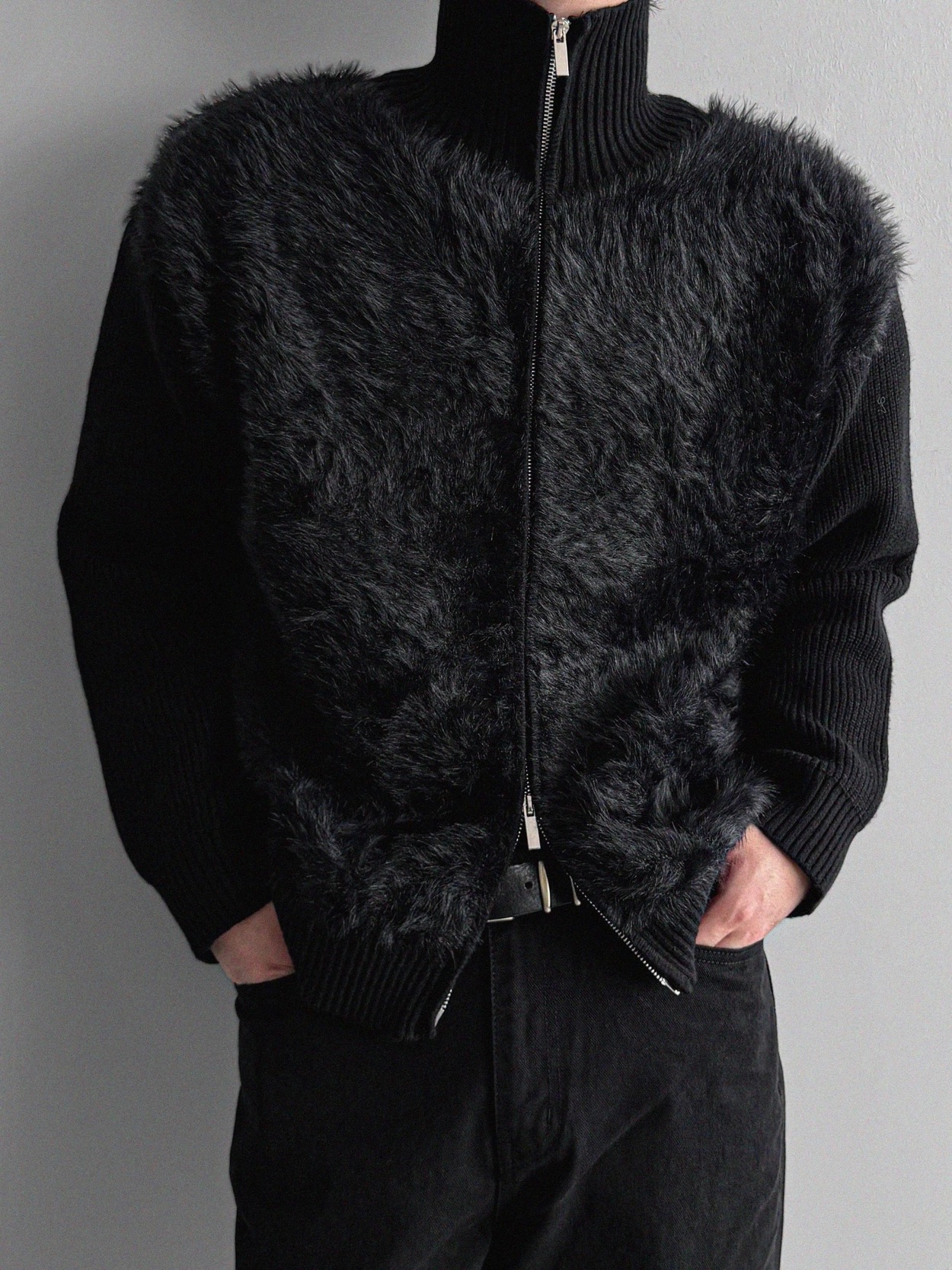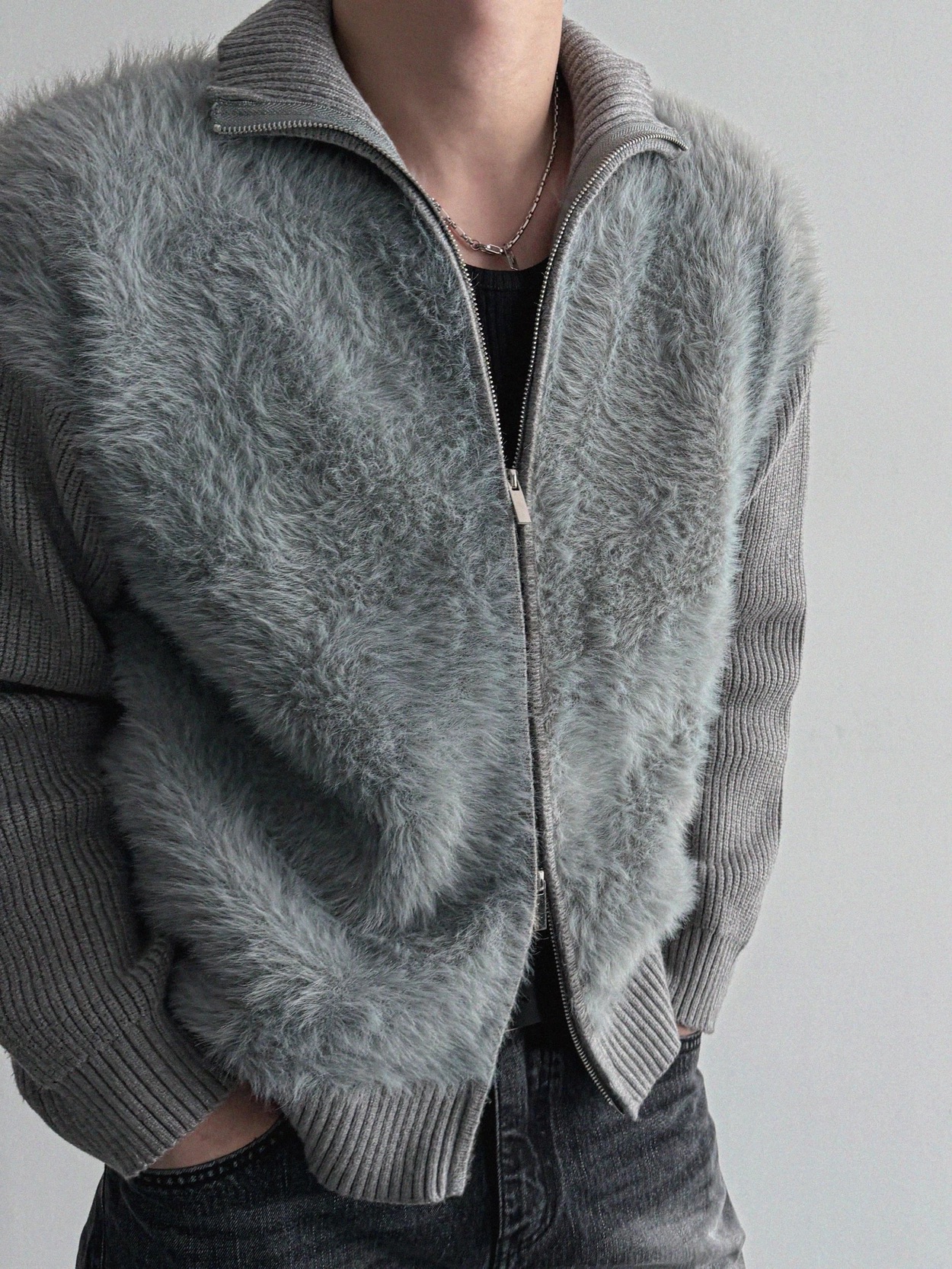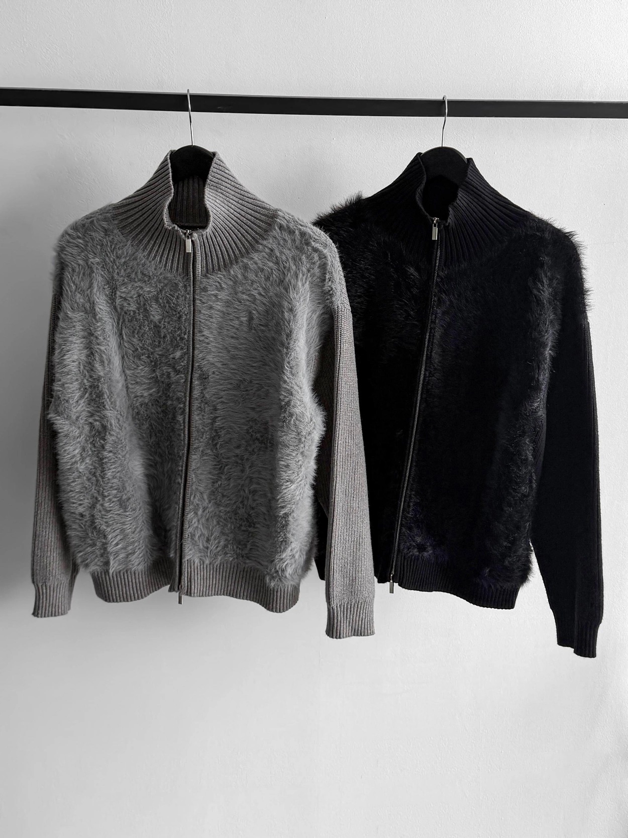 韓國 絨毛 皮草 針織 拼接 高貴感 短版 拉鍊外套 (2color)