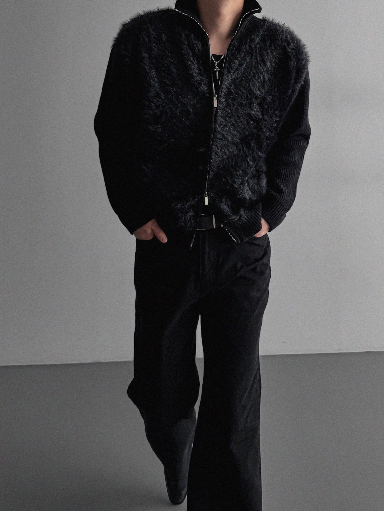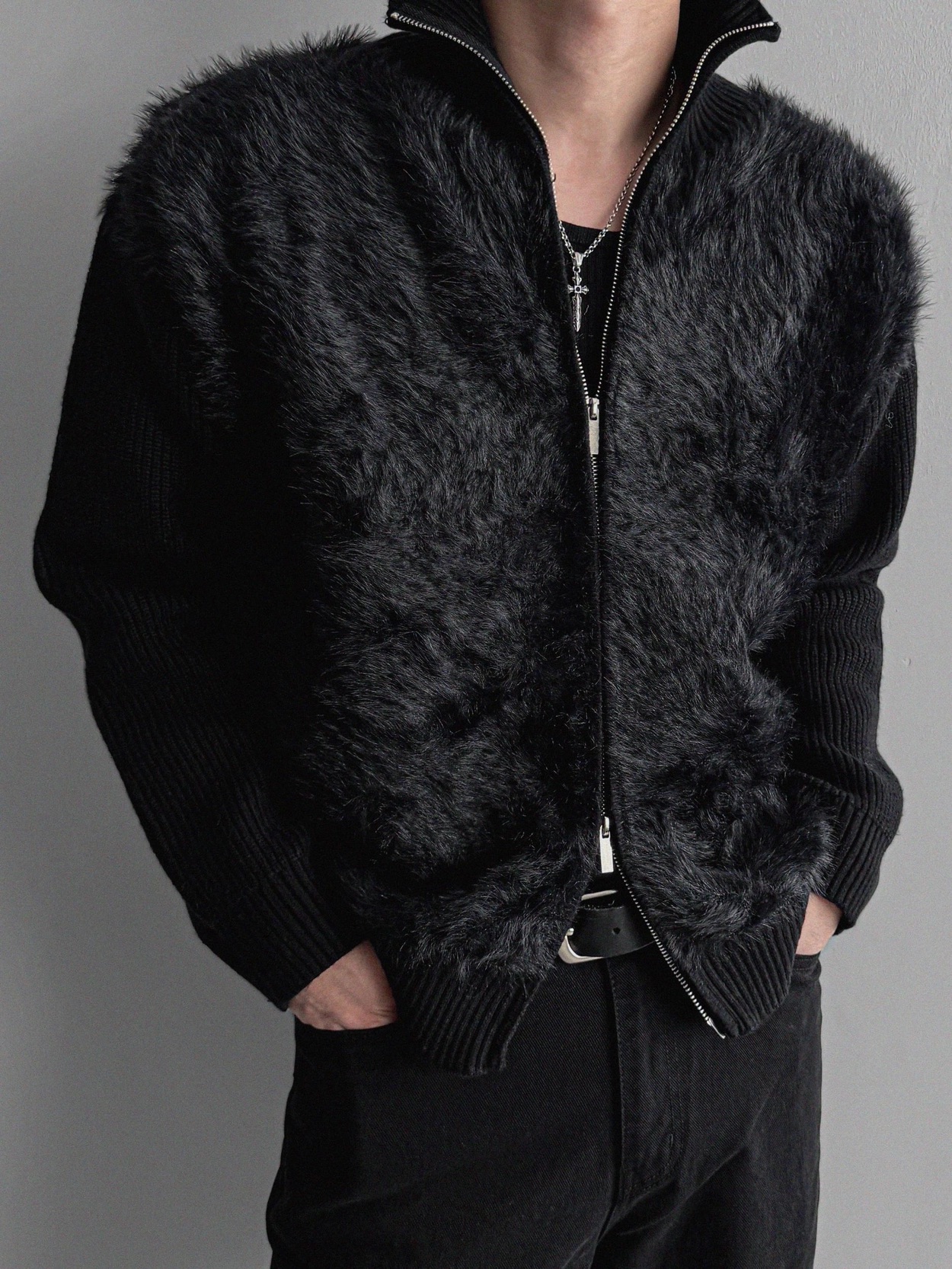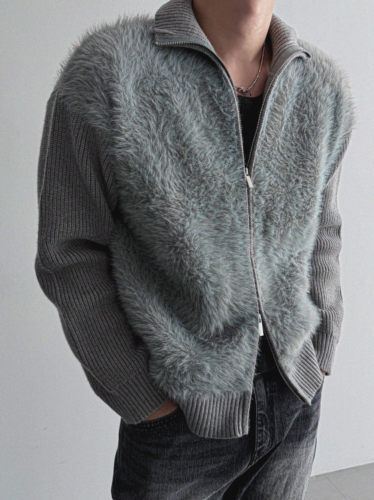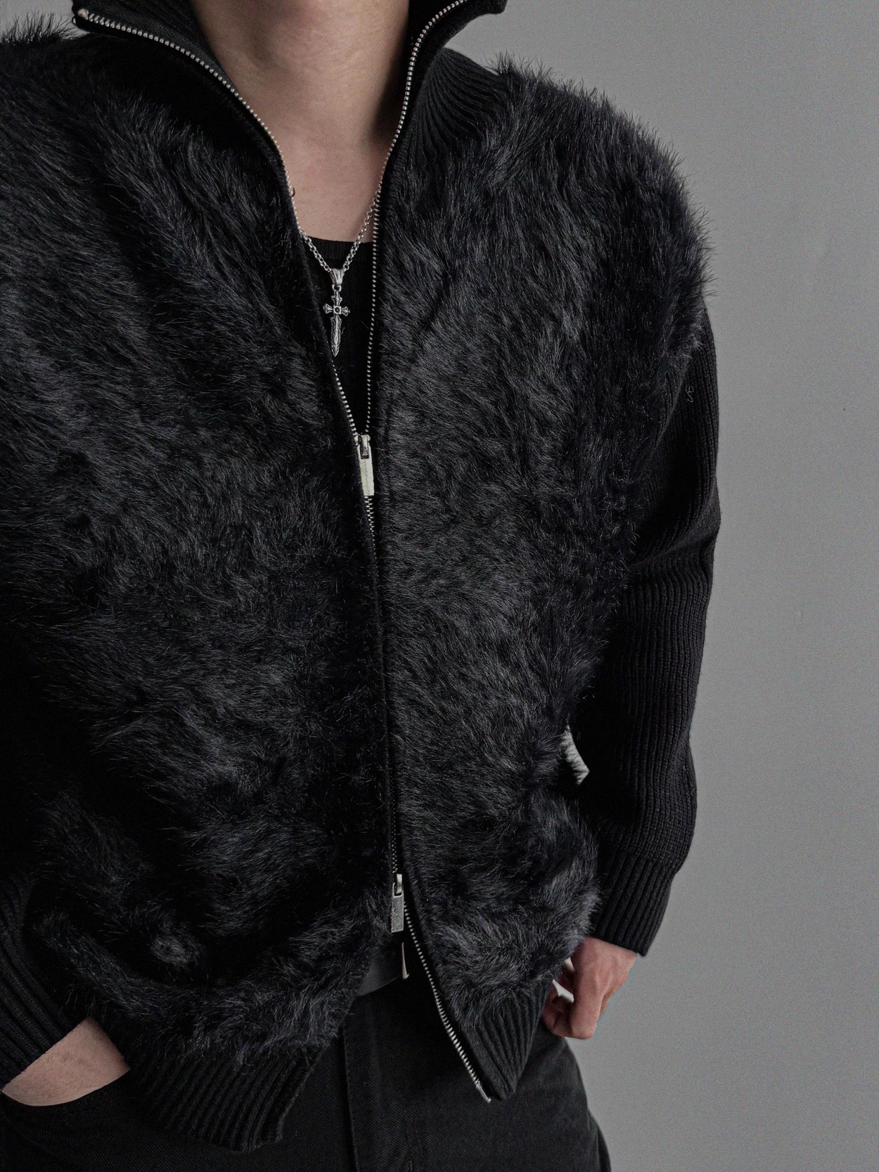 韓國 絨毛 皮草 針織 拼接 高貴感 短版 拉鍊外套 (2color)