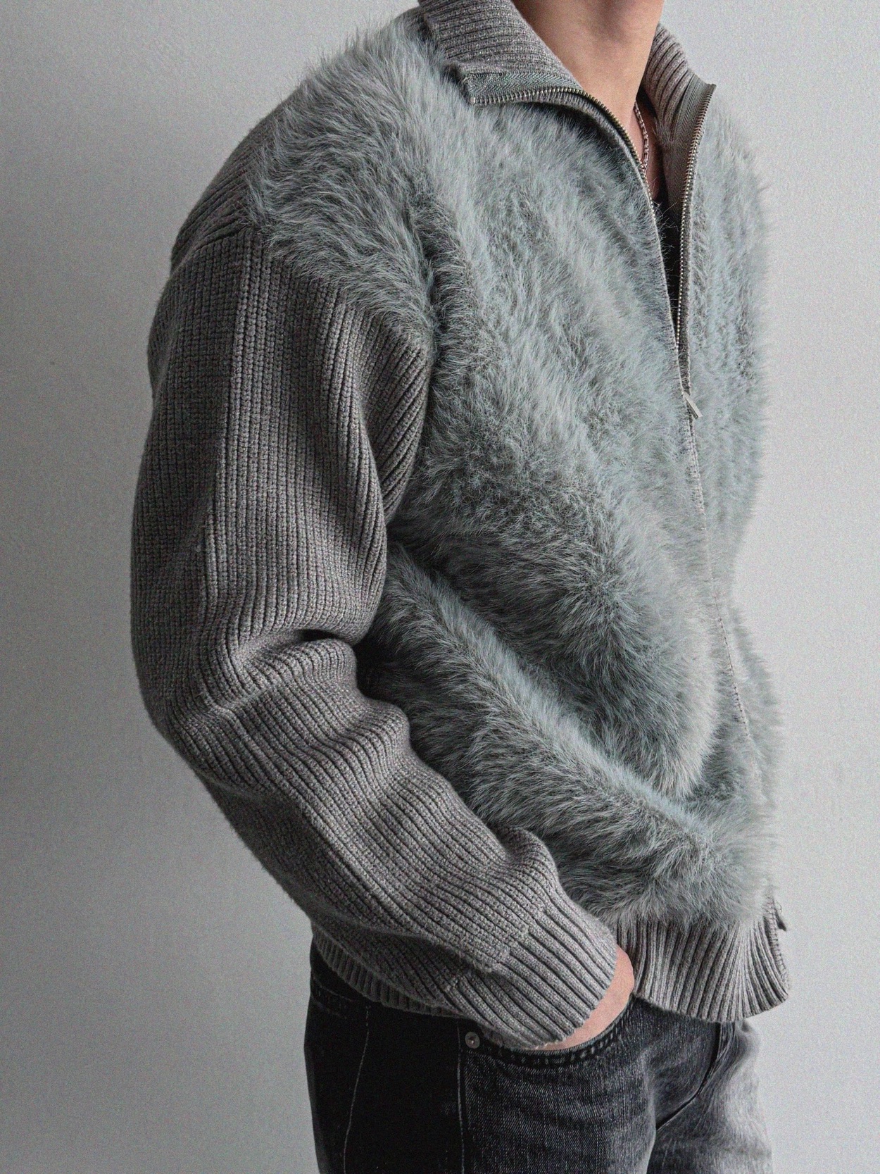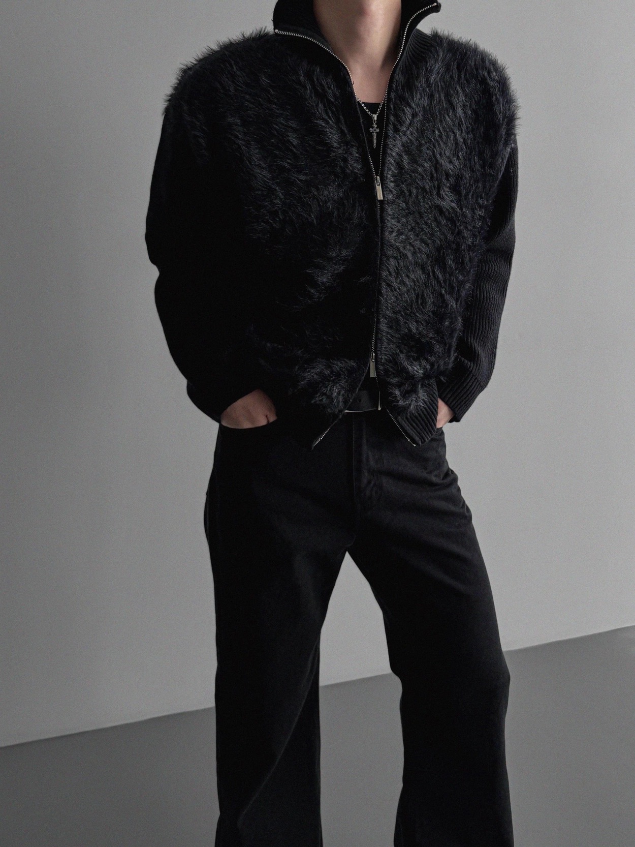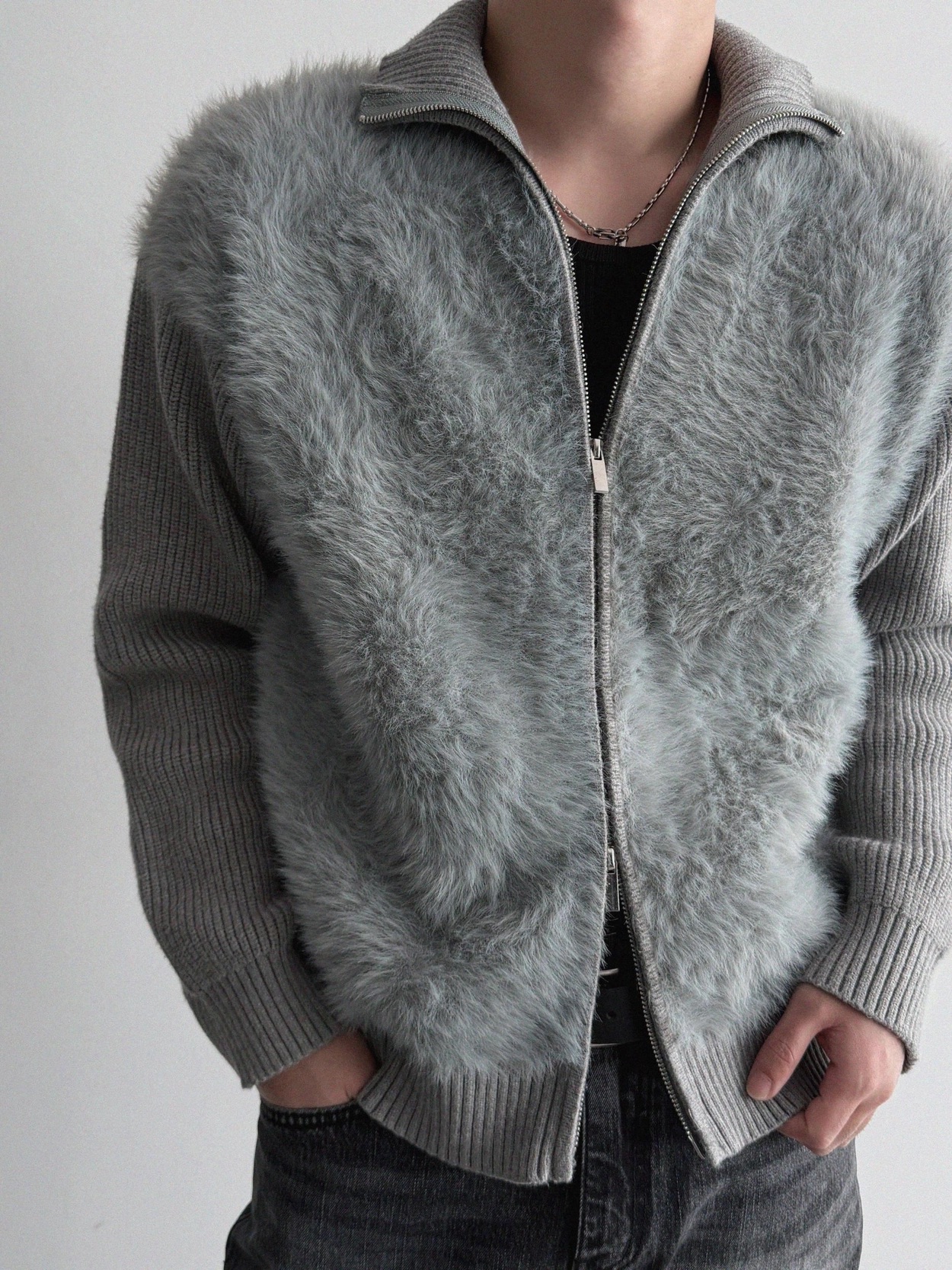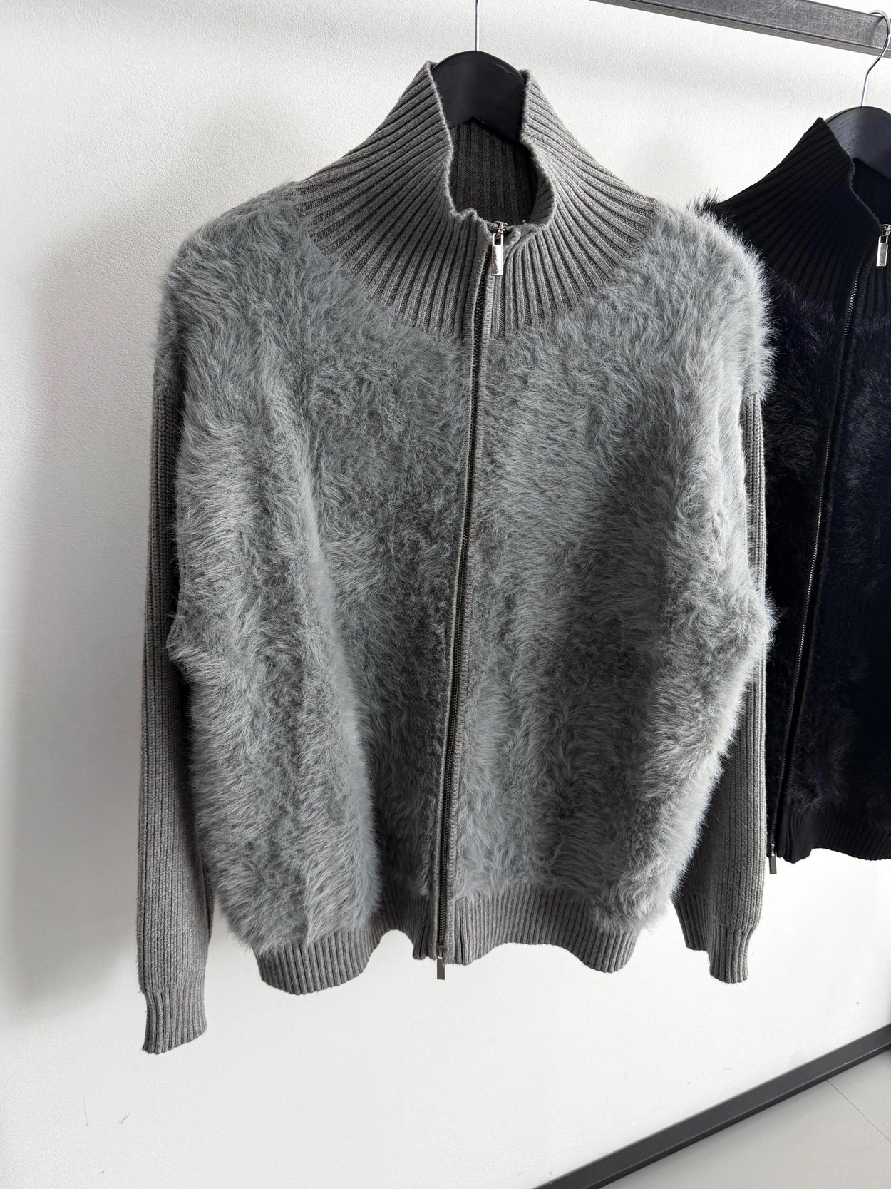 韓國 絨毛 皮草 針織 拼接 高貴感 短版 拉鍊外套 (2color)