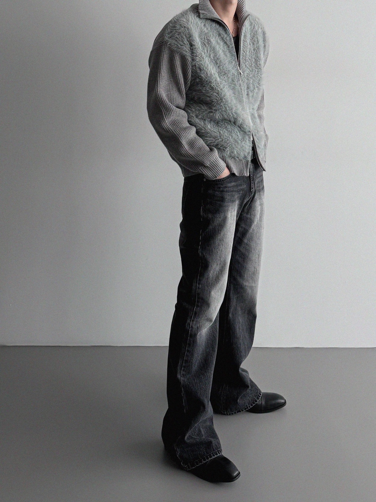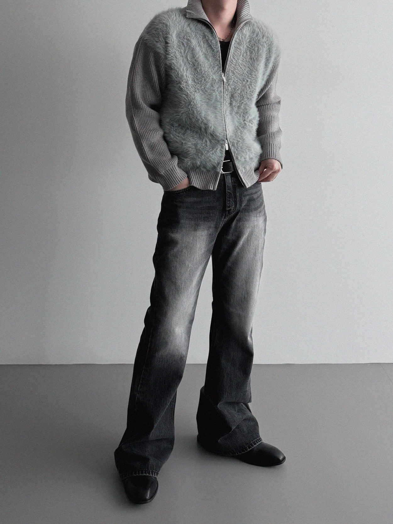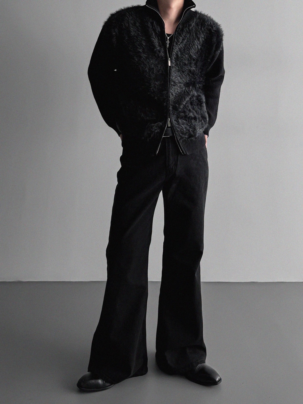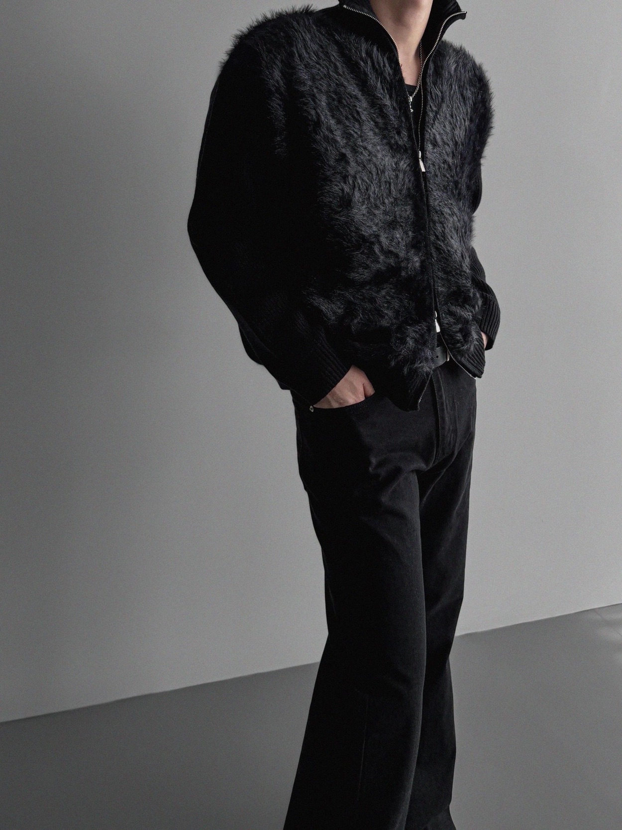 韓國 絨毛 皮草 針織 拼接 高貴感 短版 拉鍊外套 (2color)