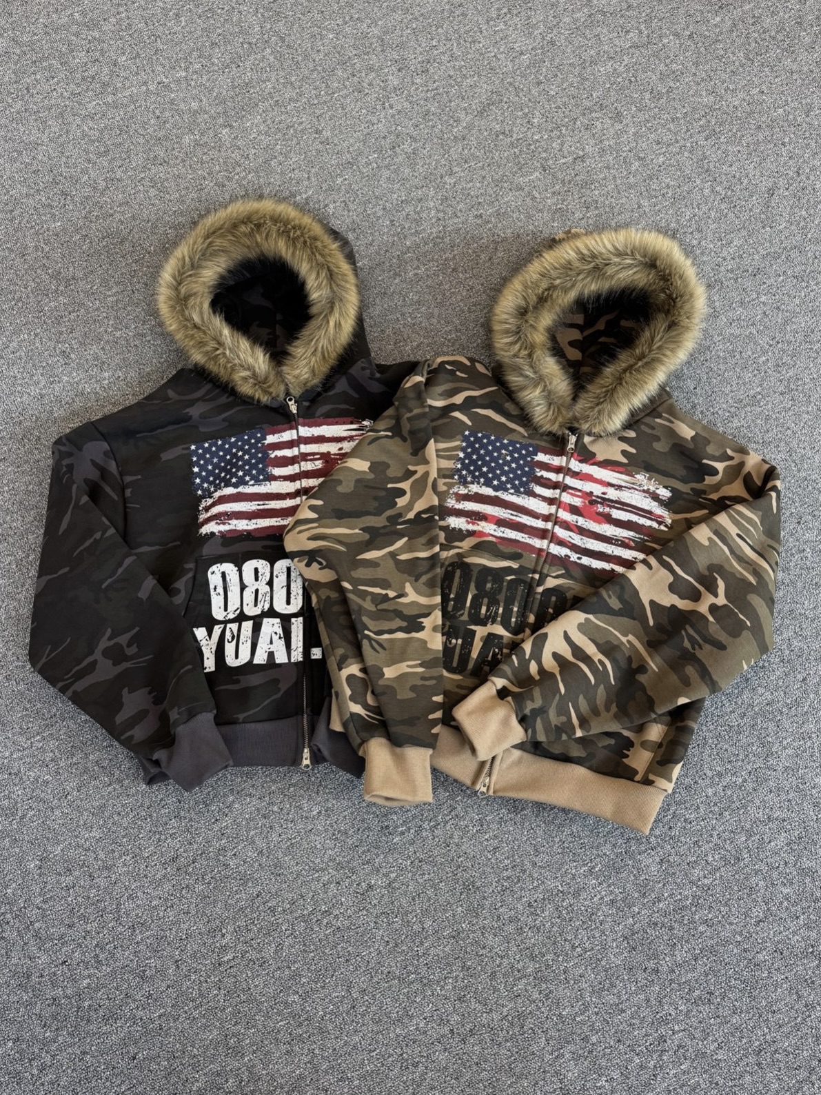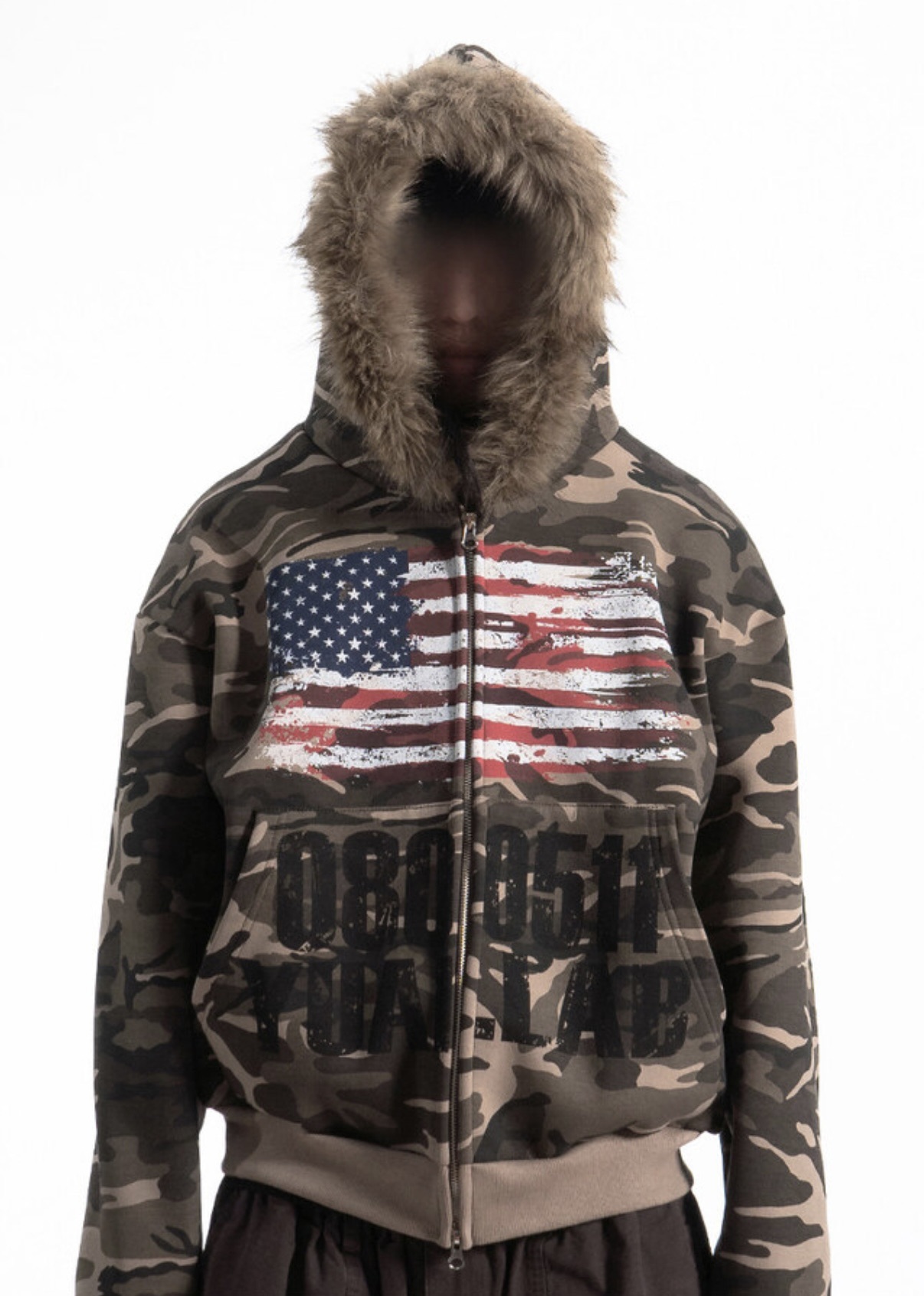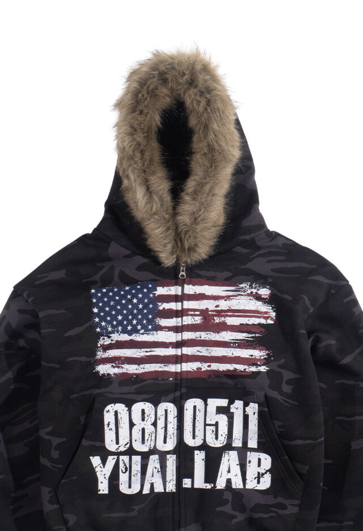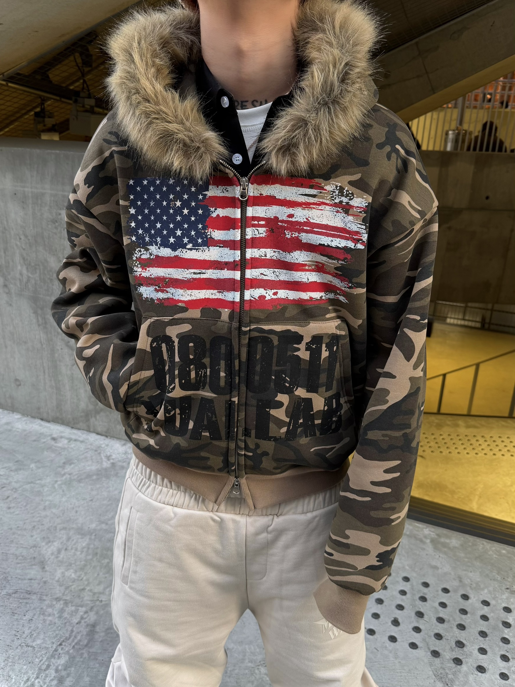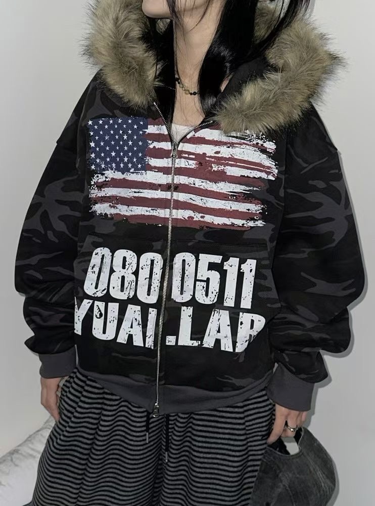 韓國 YUAI.LAB 美式 迷彩 刷漆 BOXY 短版 絨毛 拉鍊 連帽外套 82MAJOR 南誠模 同款 (2color)