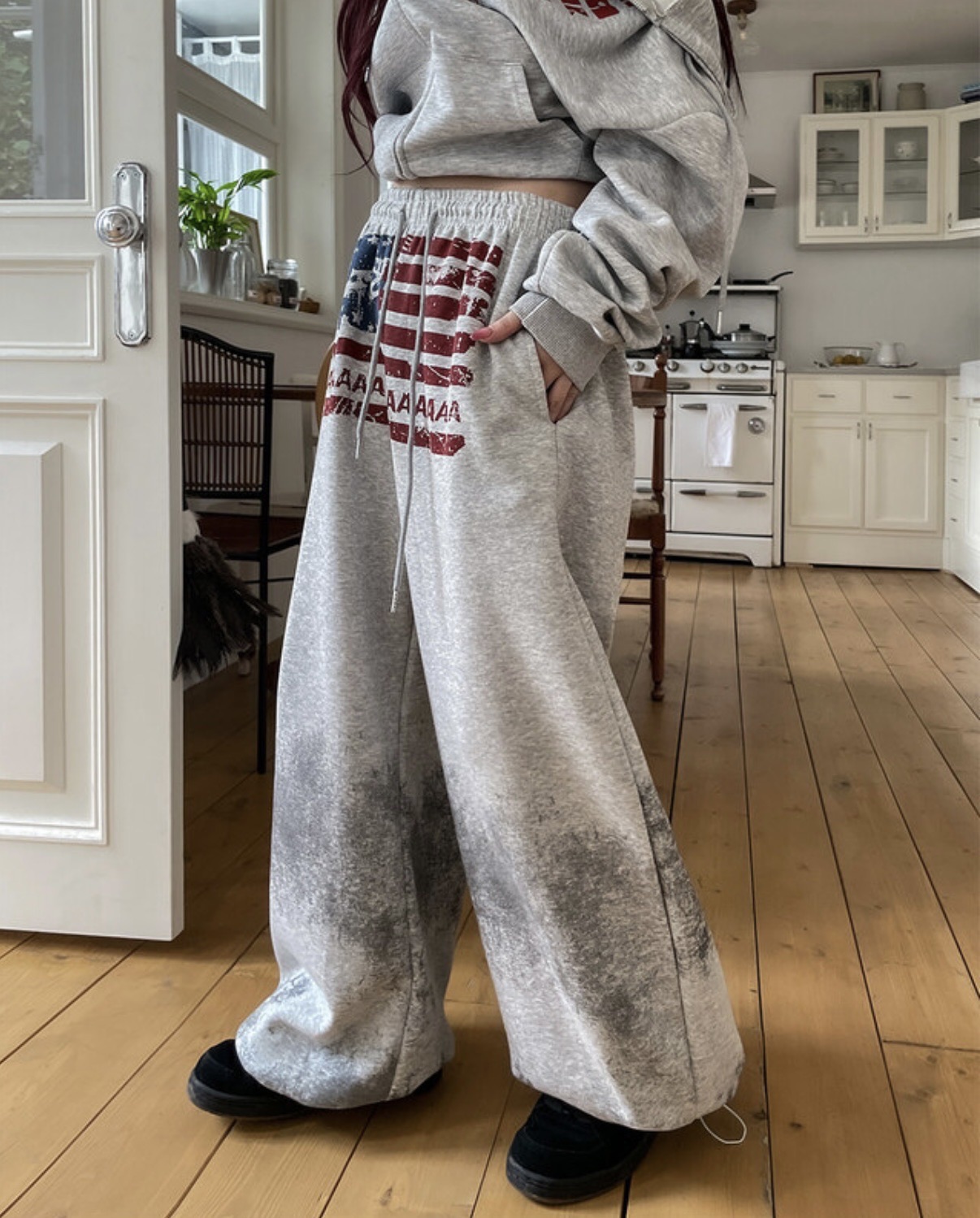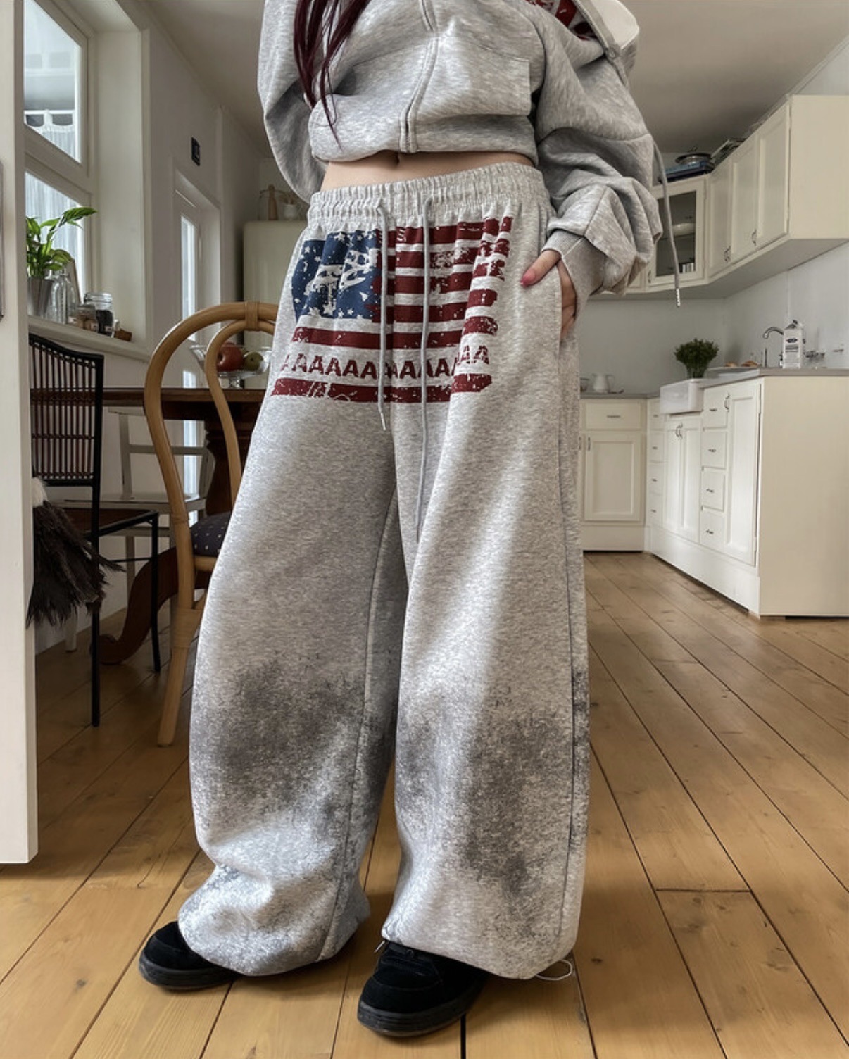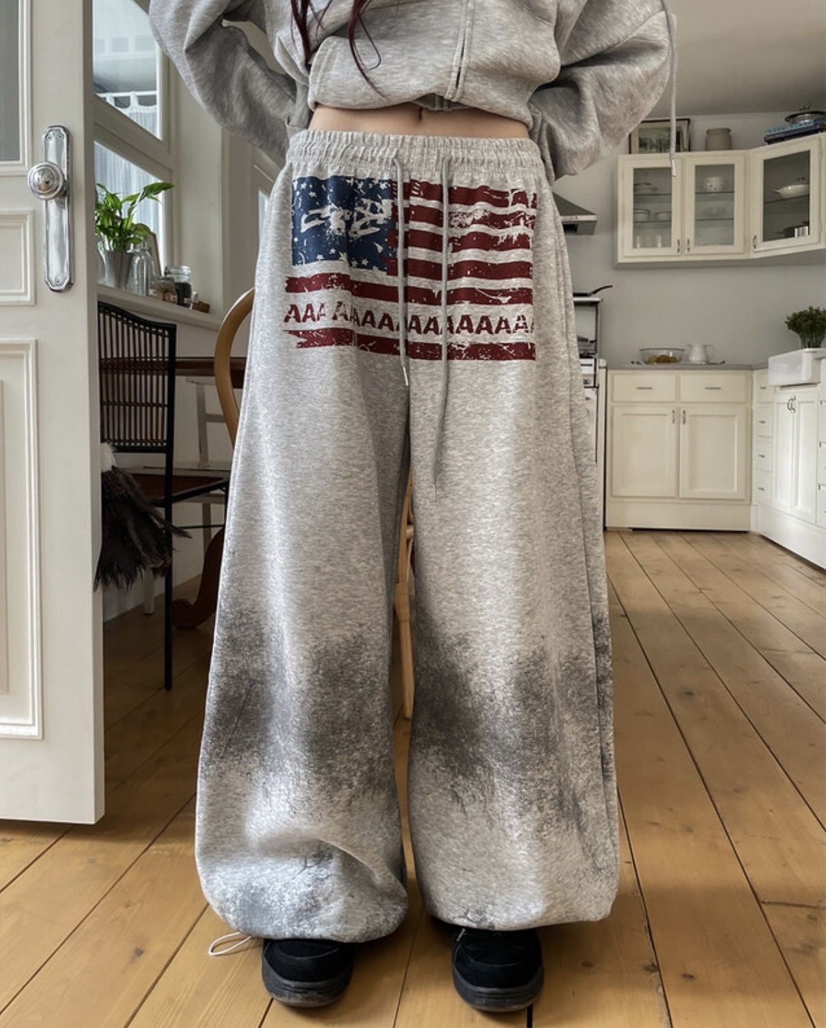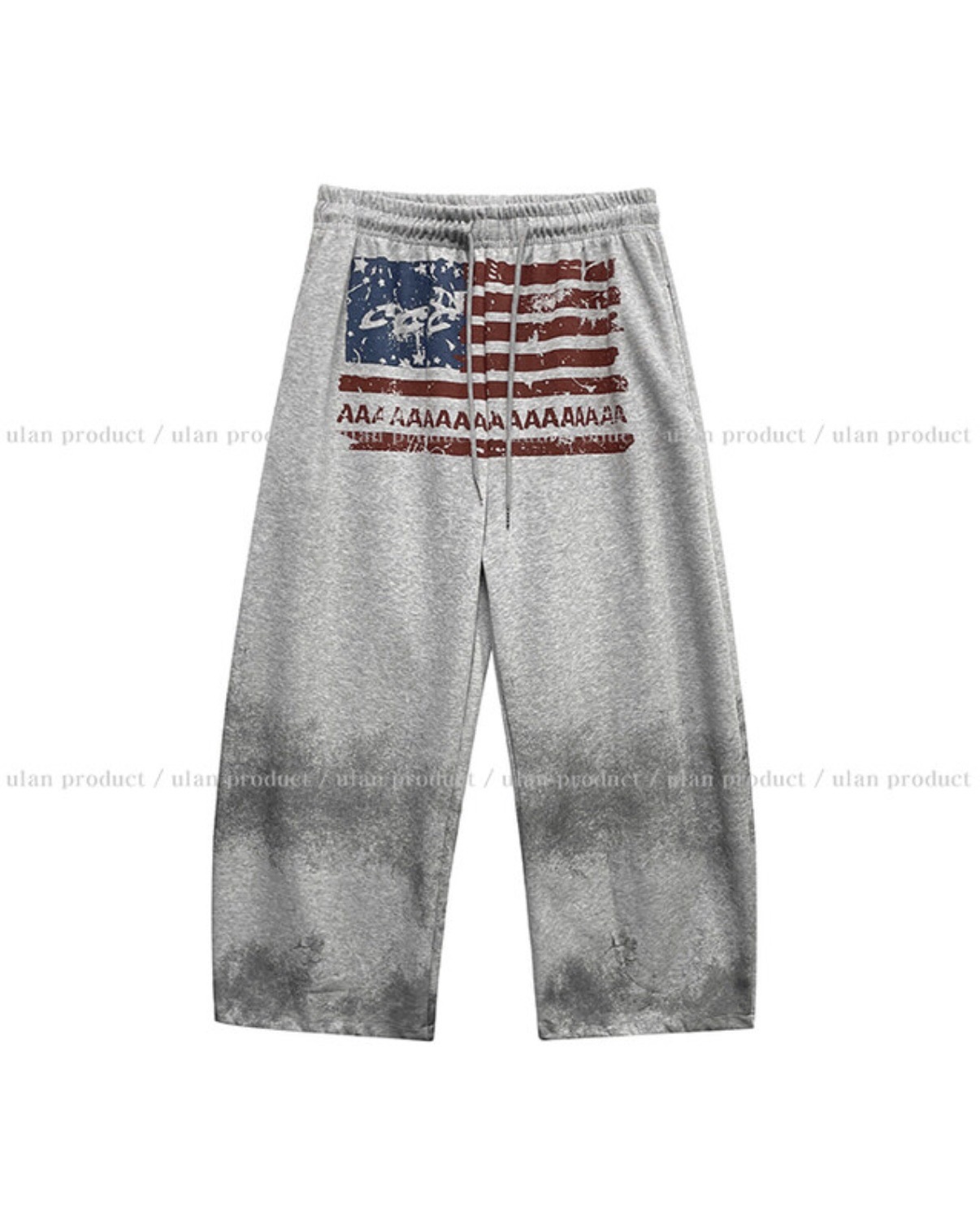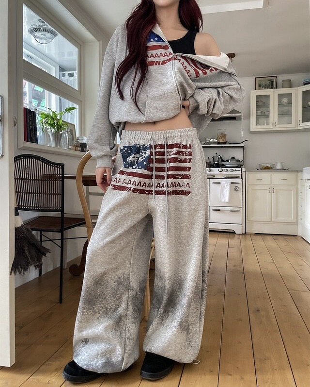 韓國 USA 美式 斑駁 刷漆 做舊感 抽繩 寬版 棉褲