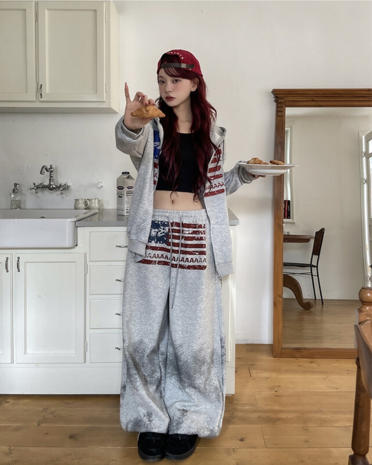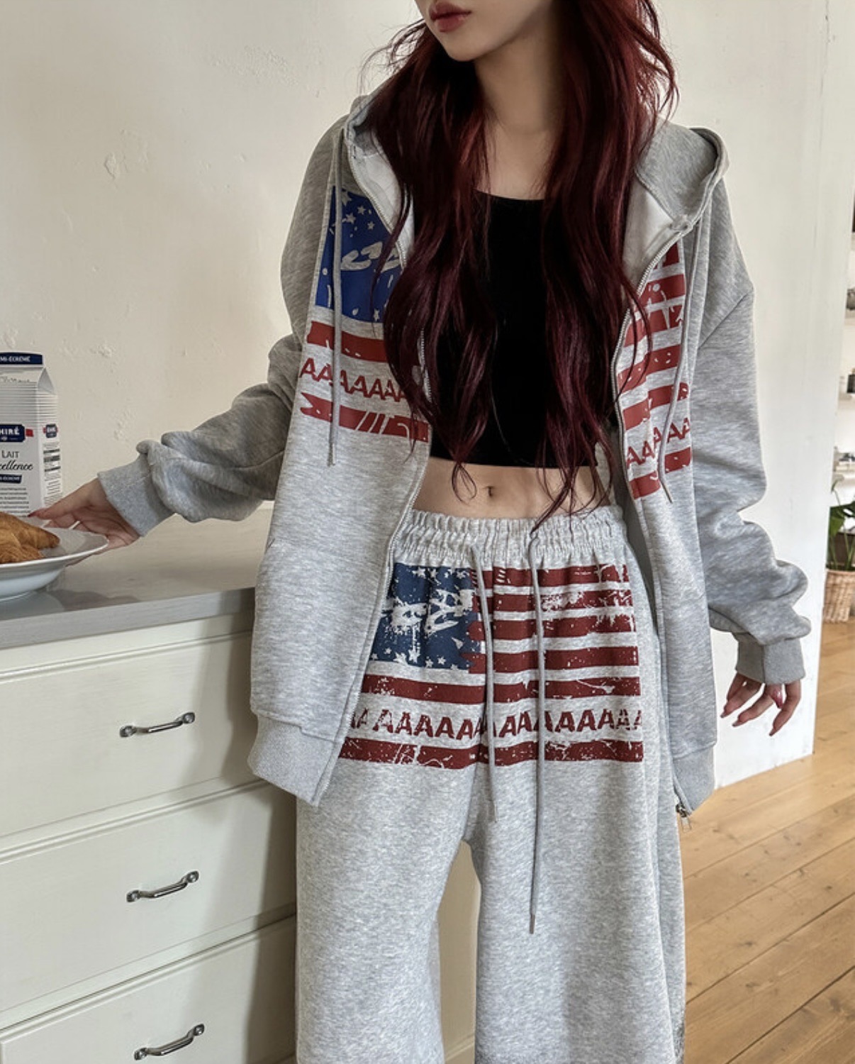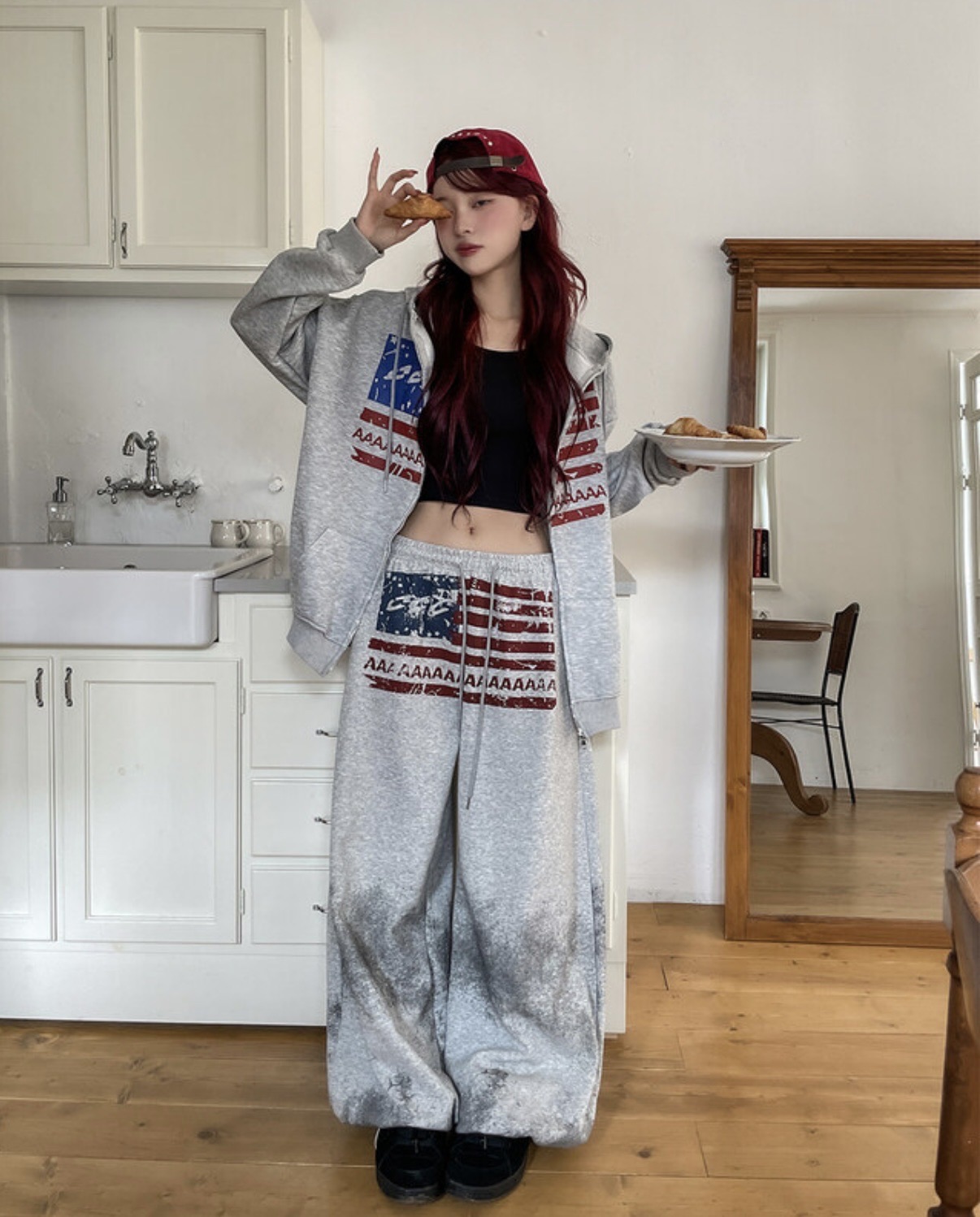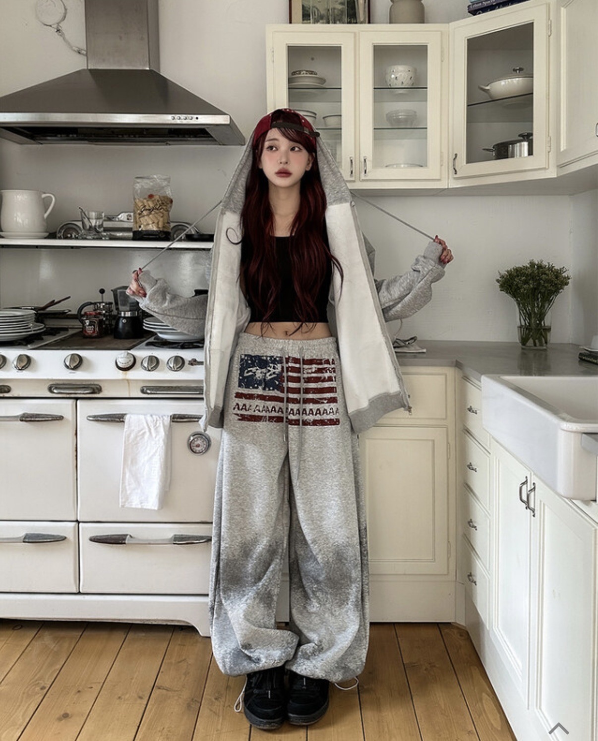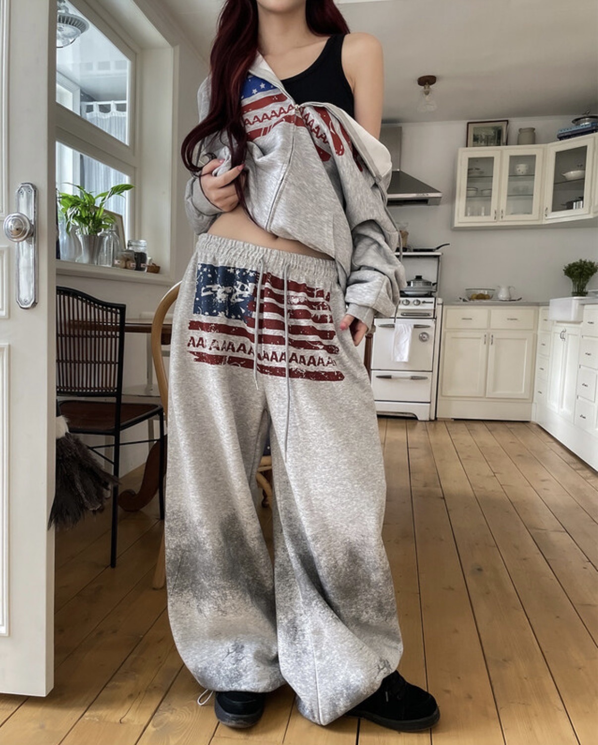 韓國 USA 美式 斑駁 刷漆 做舊感 抽繩 寬版 棉褲
