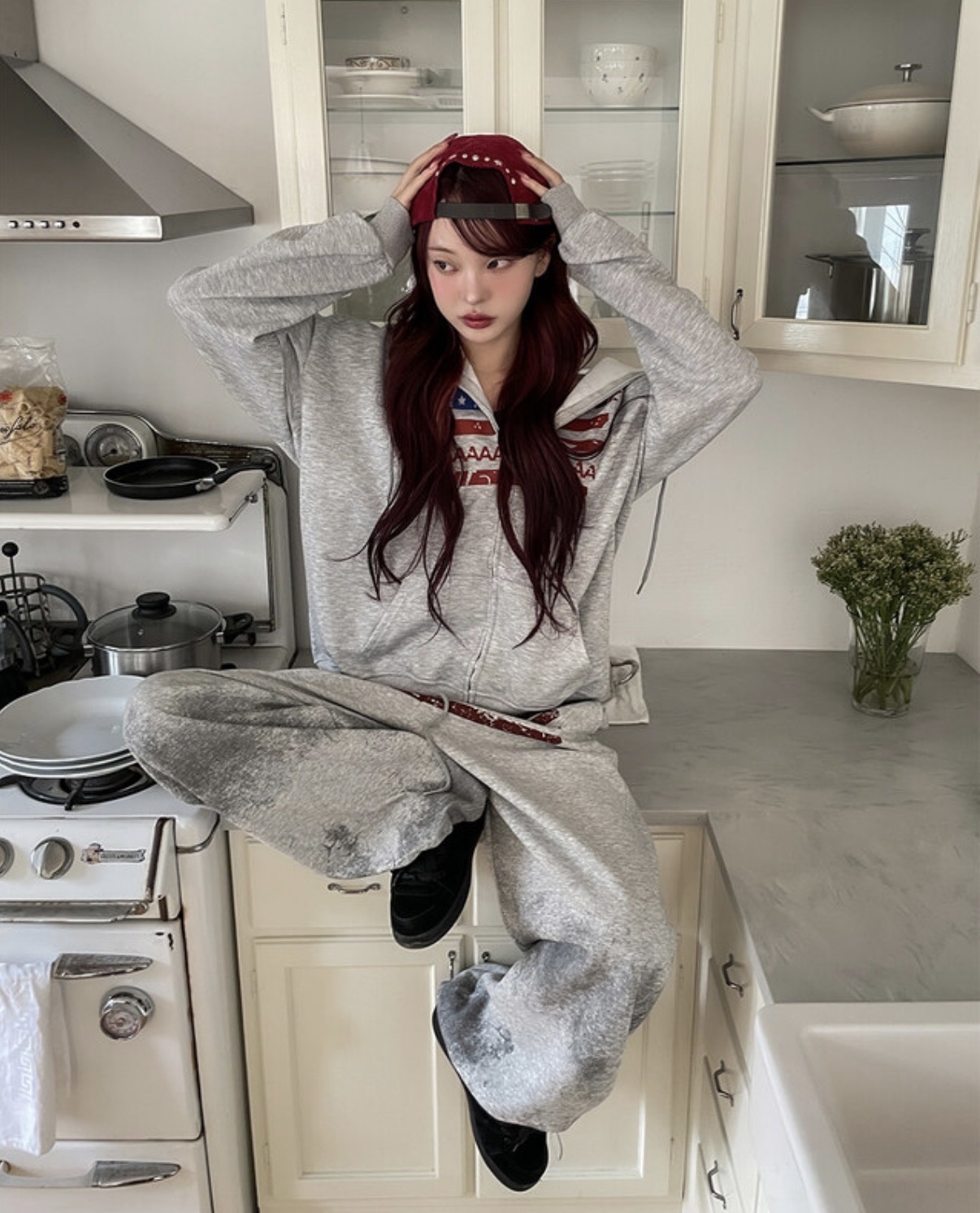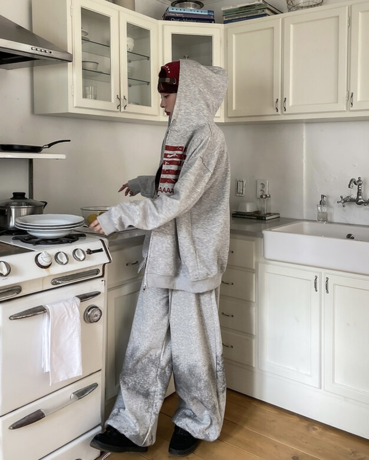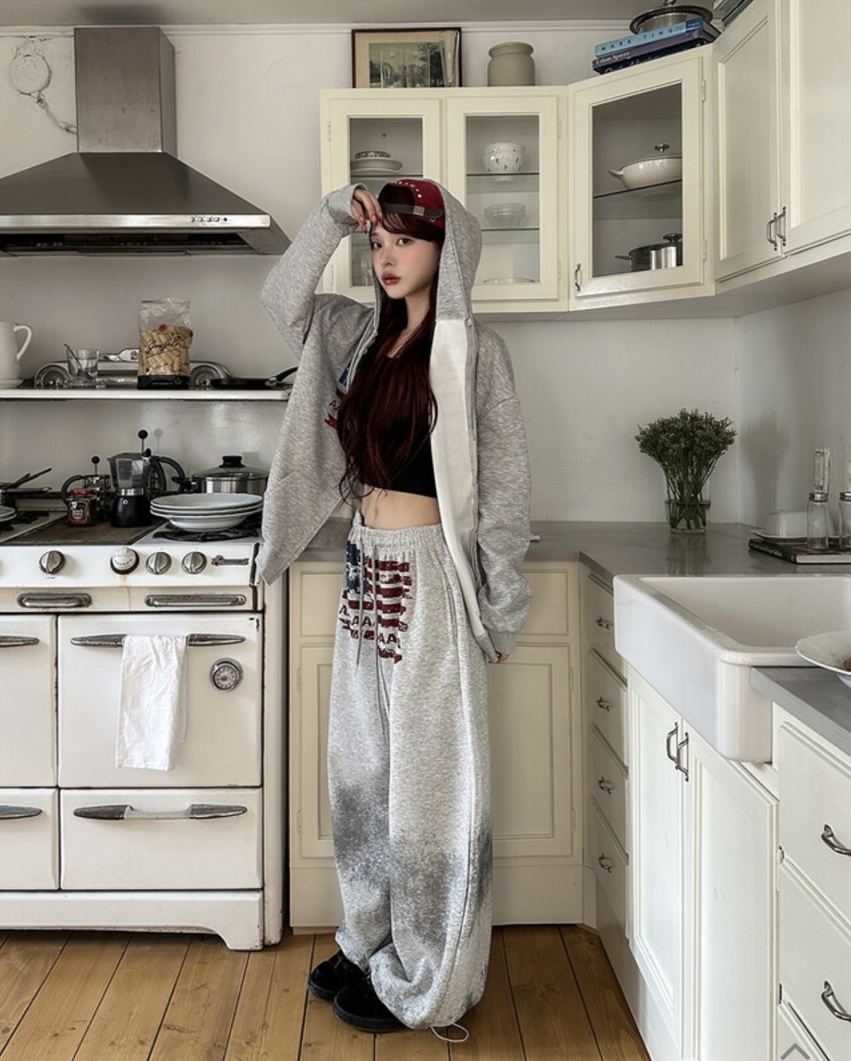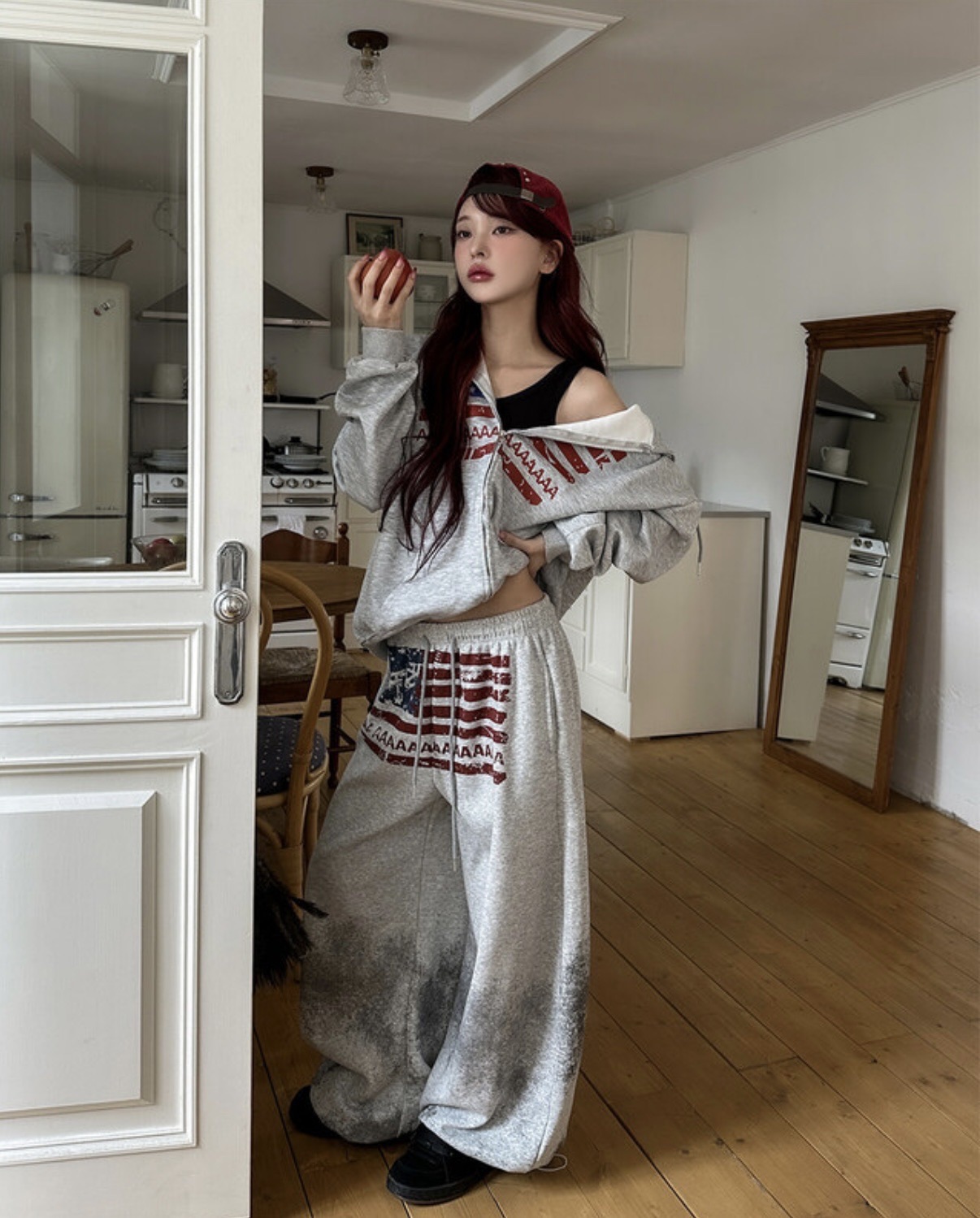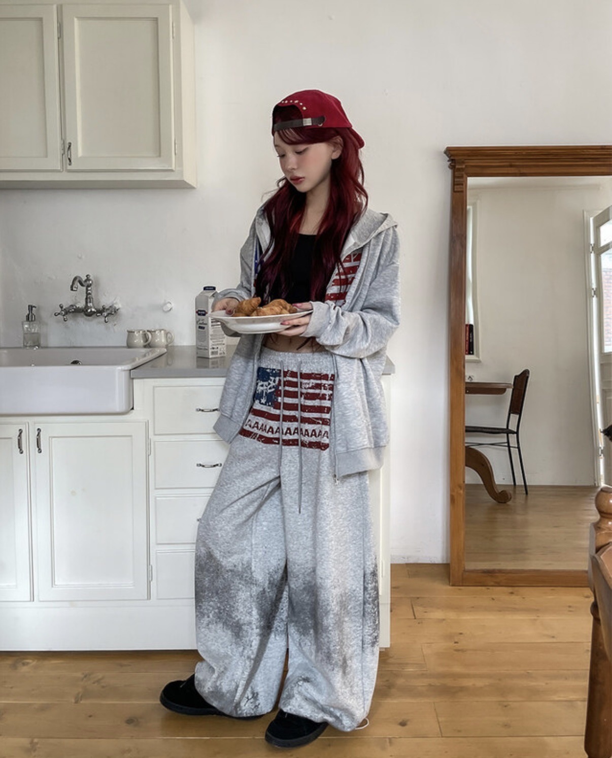 韓國 USA 美式 斑駁 刷漆 做舊感 抽繩 寬版 棉褲