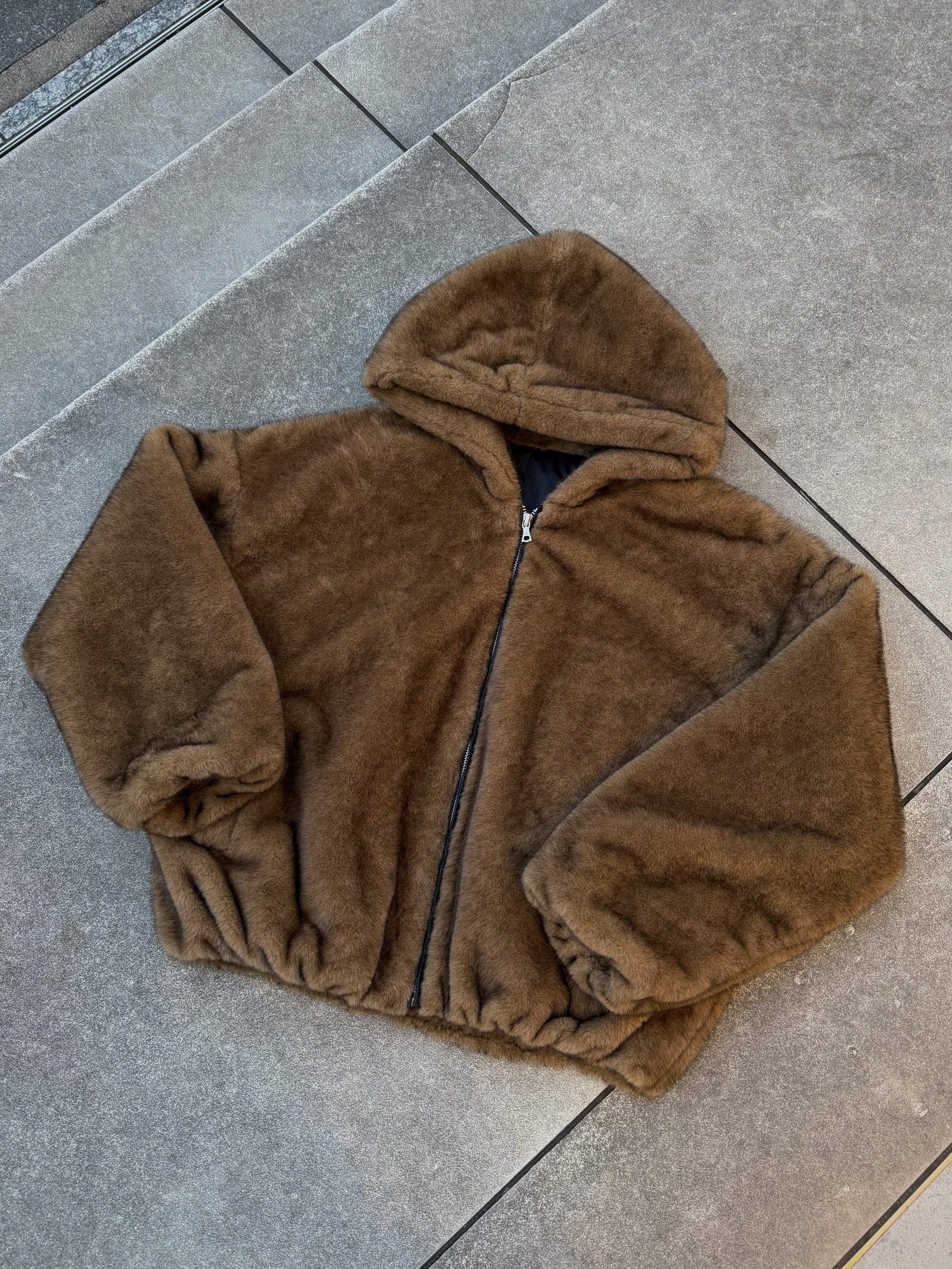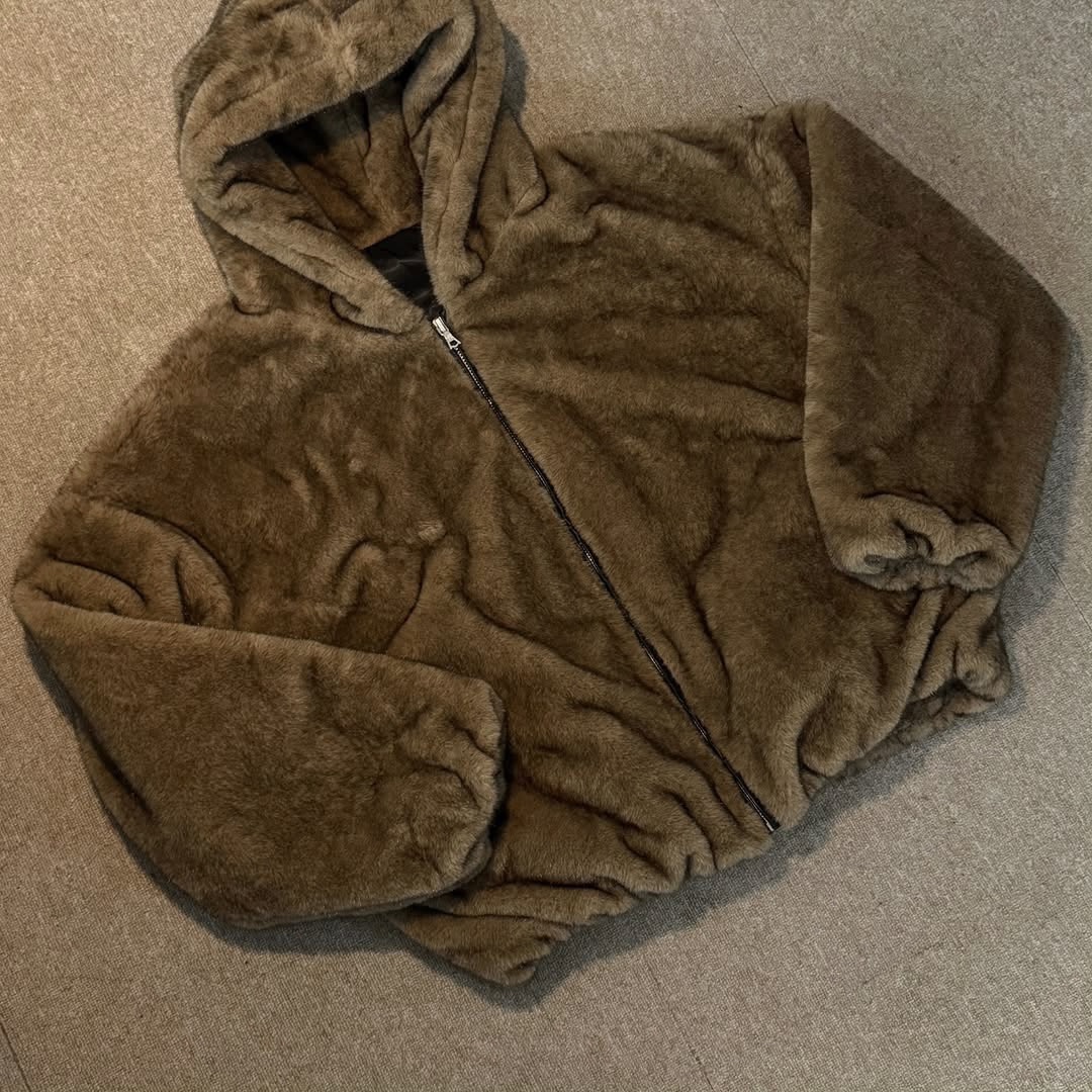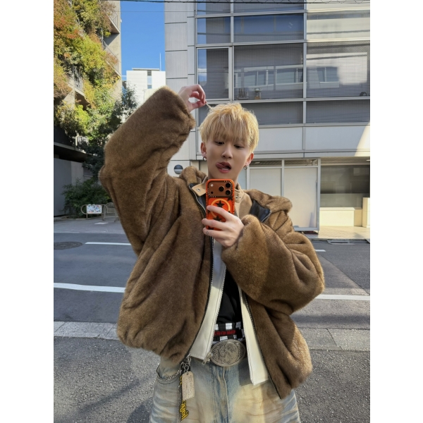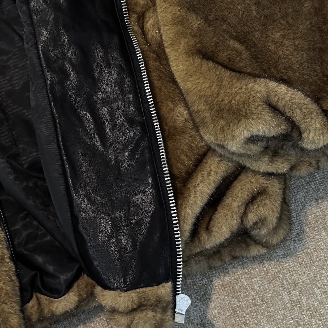 韓國 熊熊 貂絨毛 皮革 內裡 重磅 超保暖 拉鍊 連帽外套 (2color)