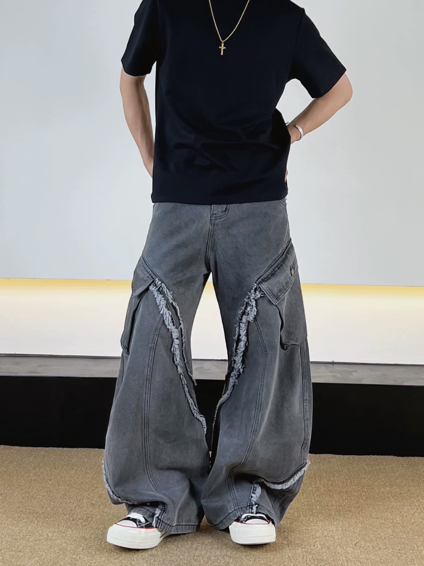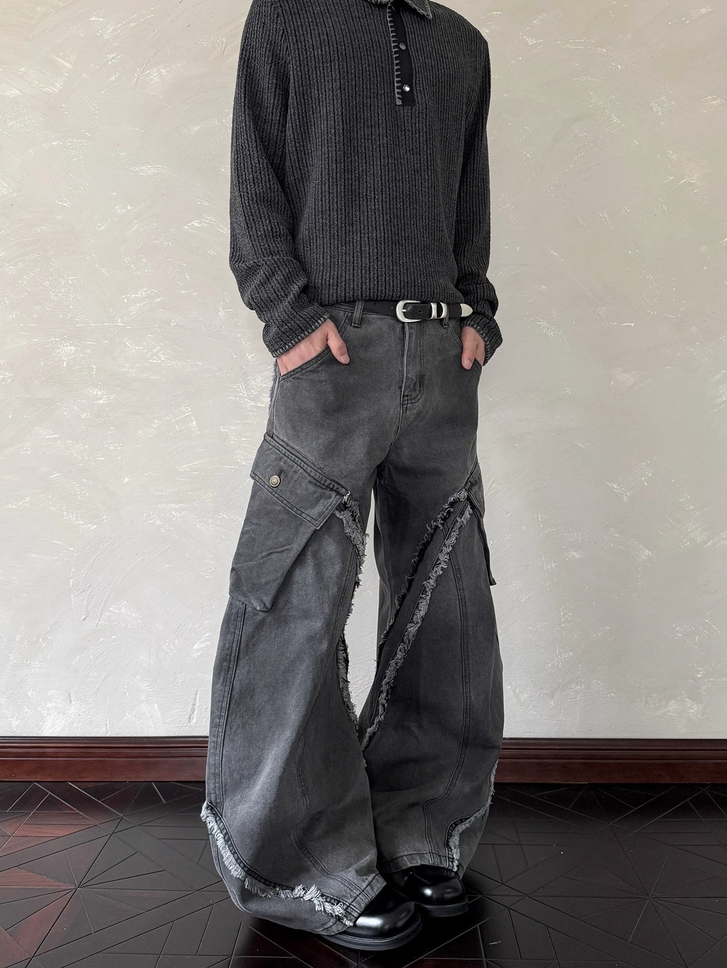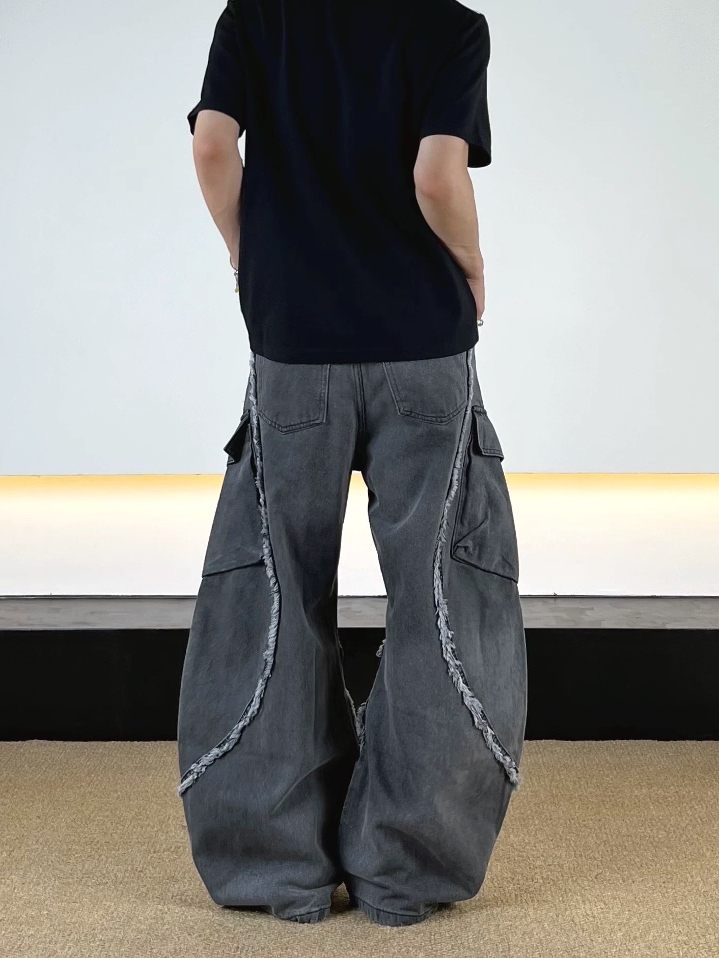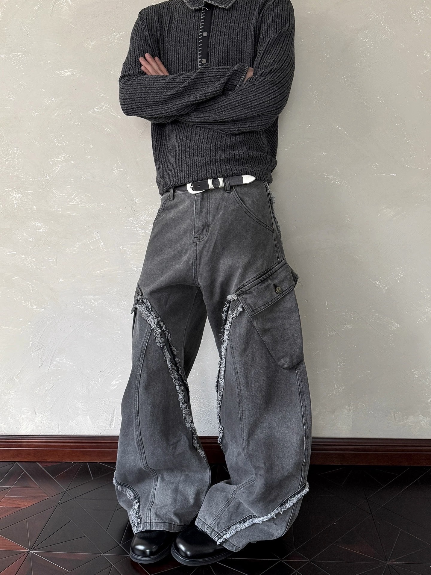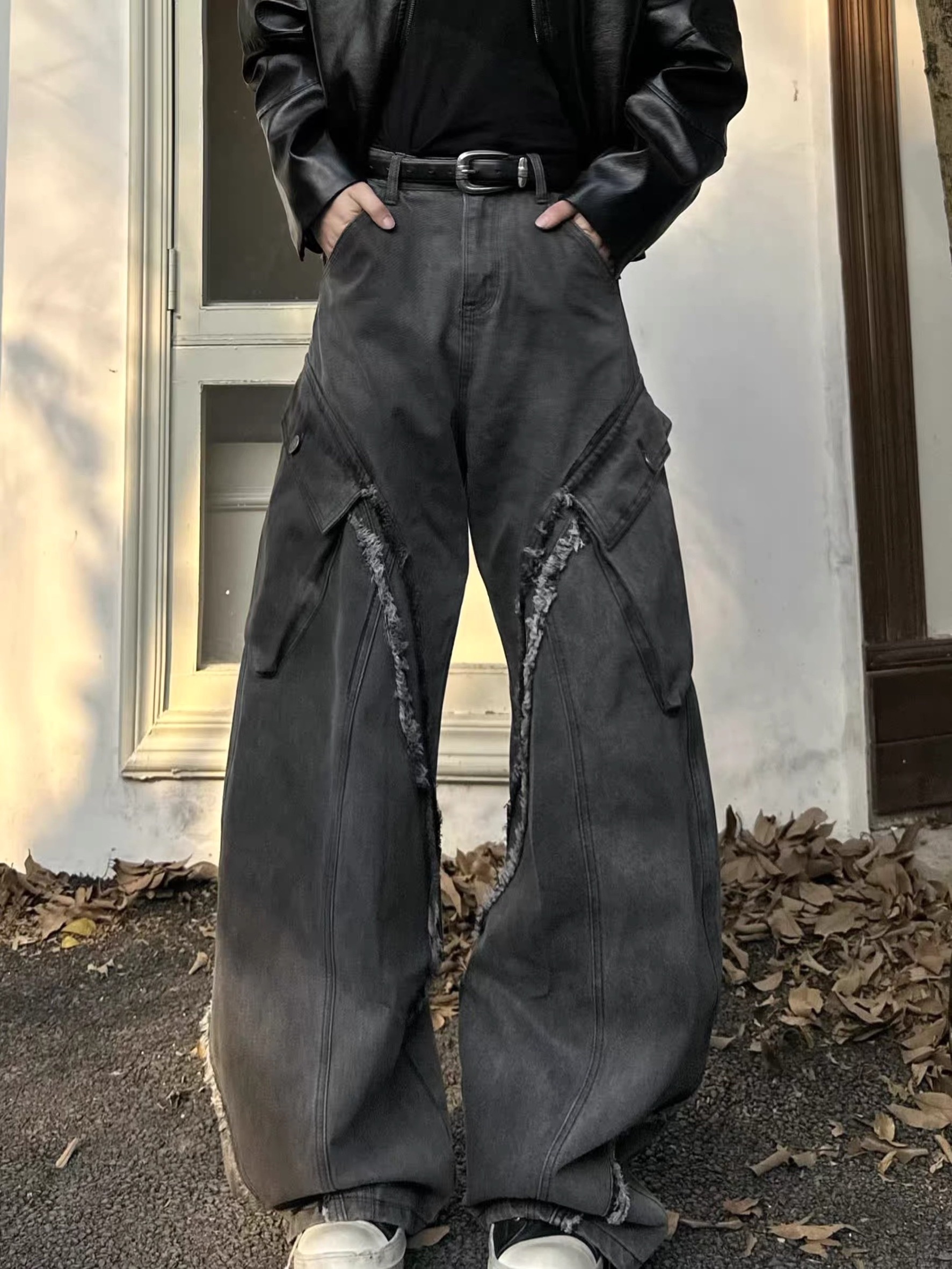 毛邊 破壞 設計感 立體 輪廓 水洗 寬版 牛仔褲