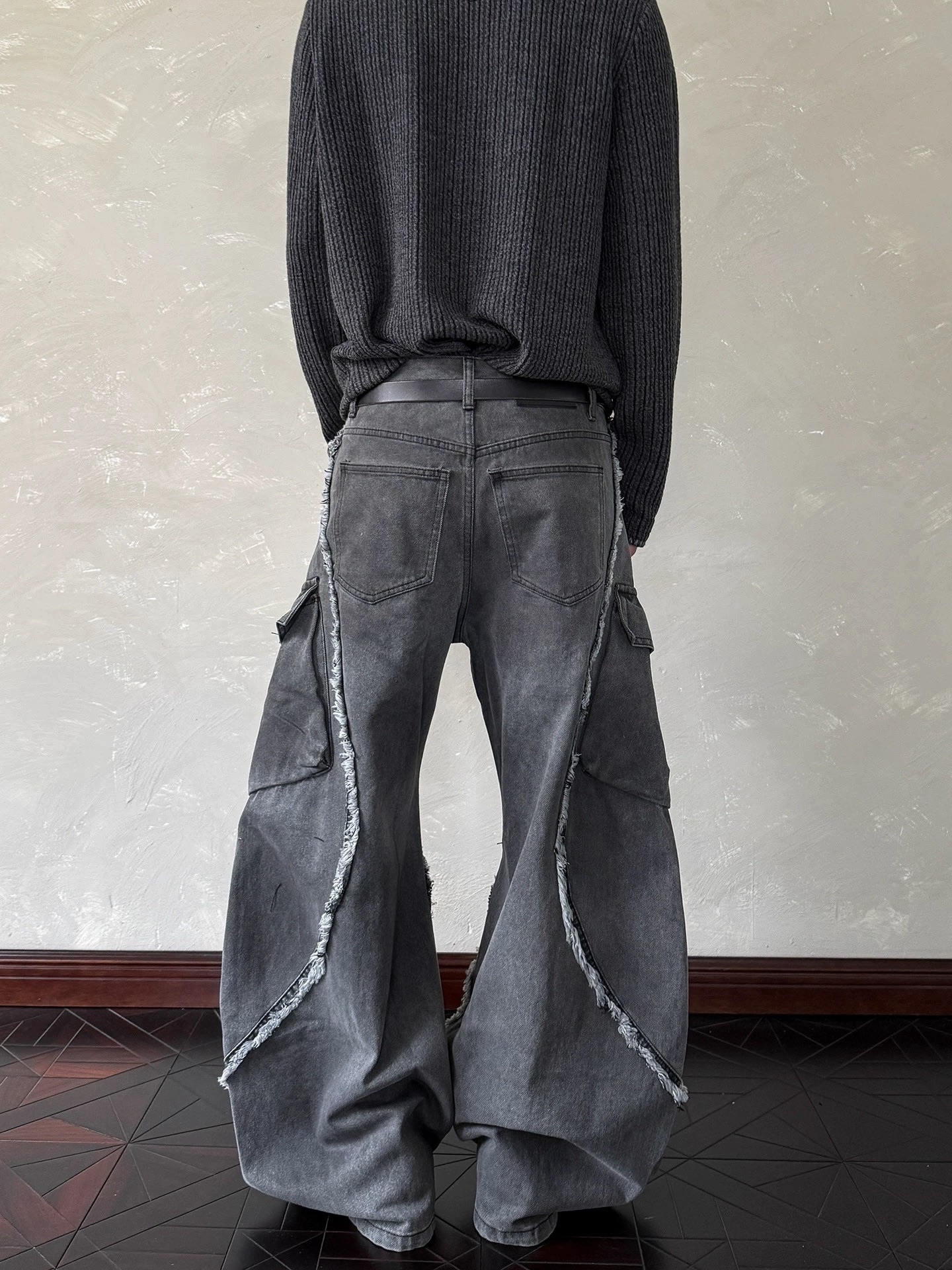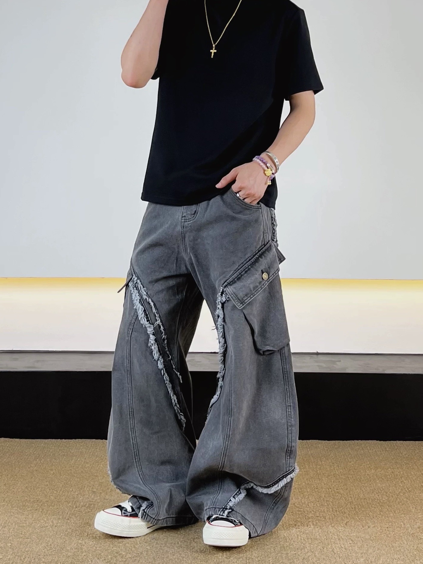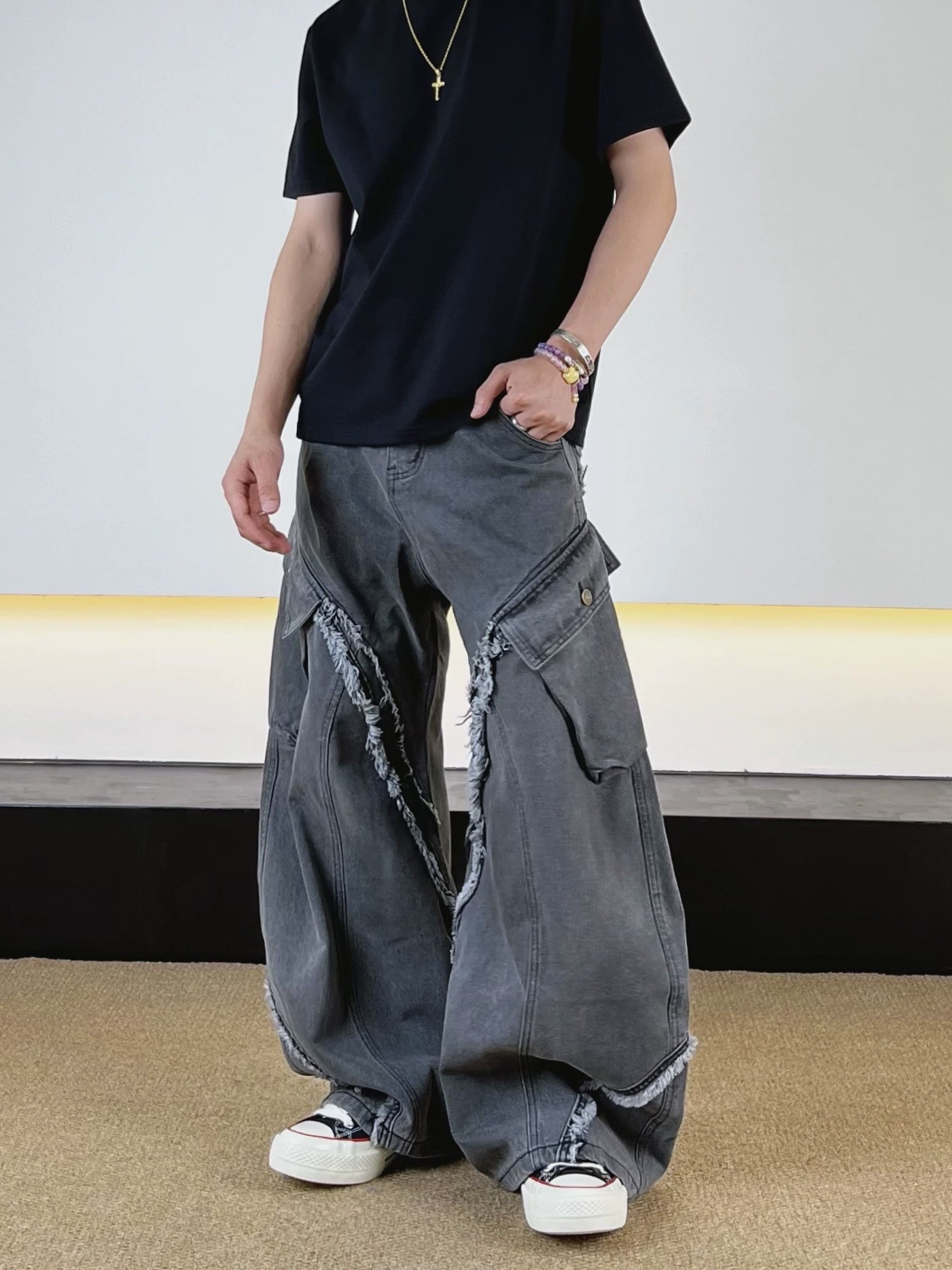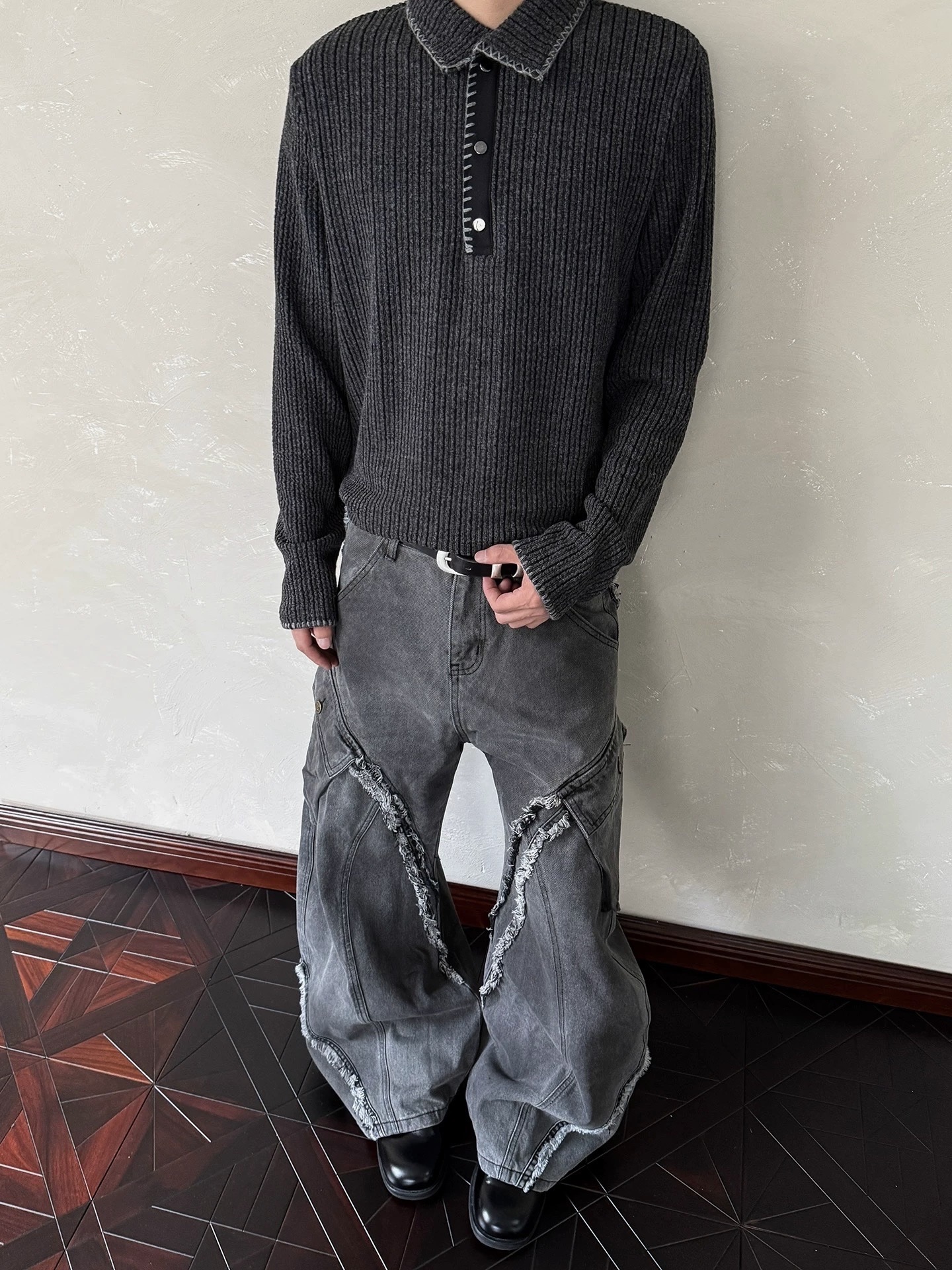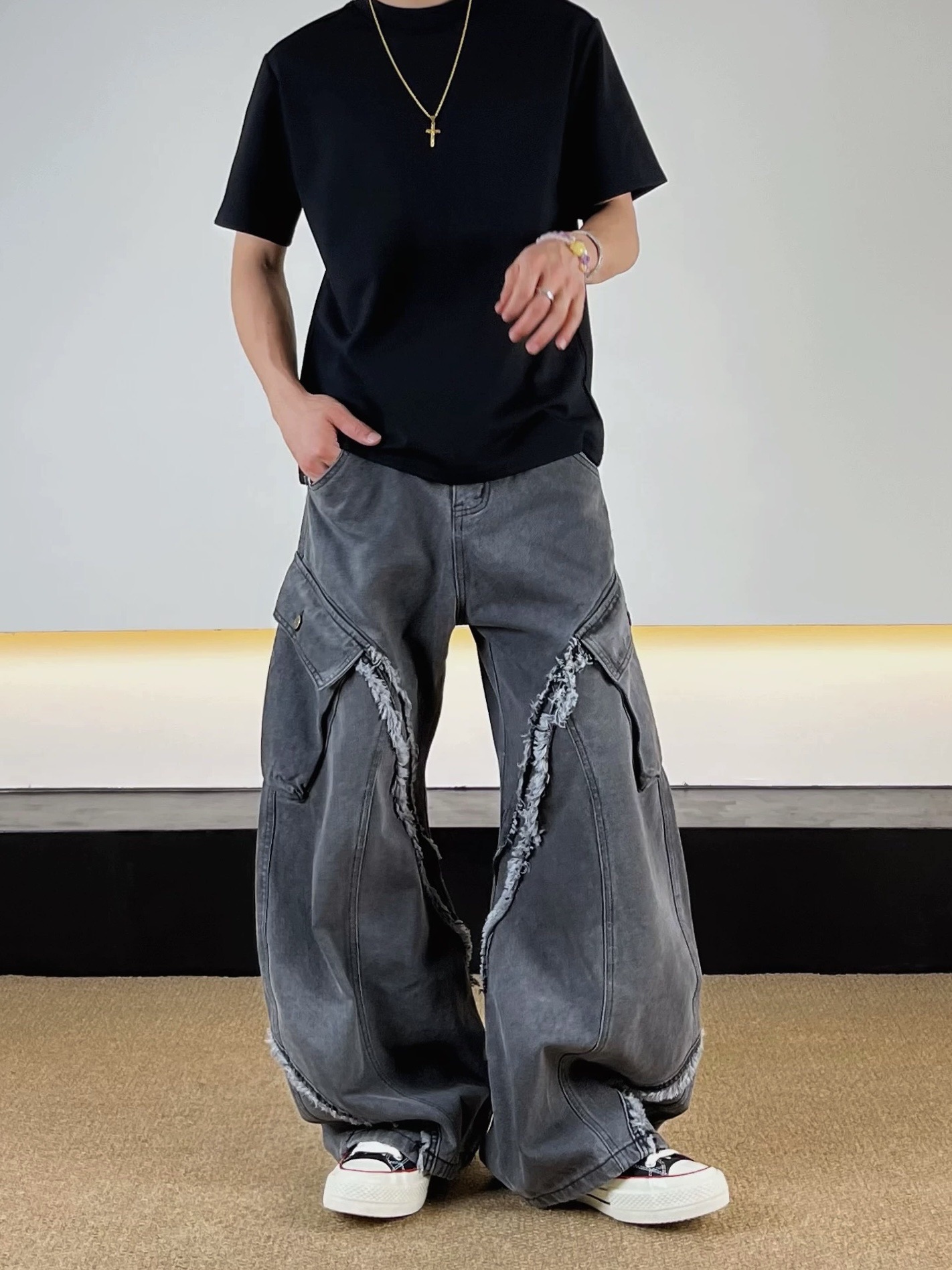 毛邊 破壞 設計感 立體 輪廓 水洗 寬版 牛仔褲