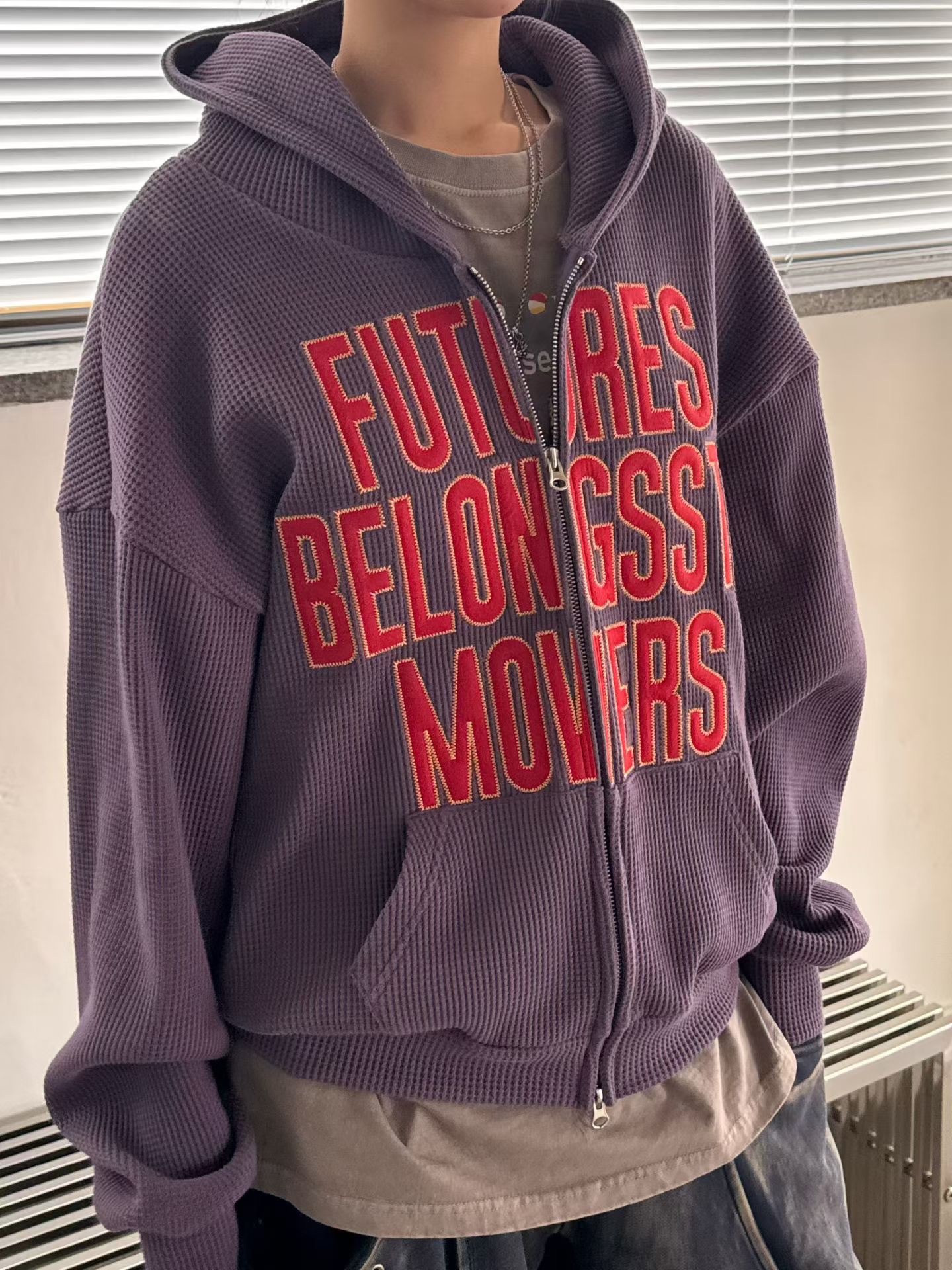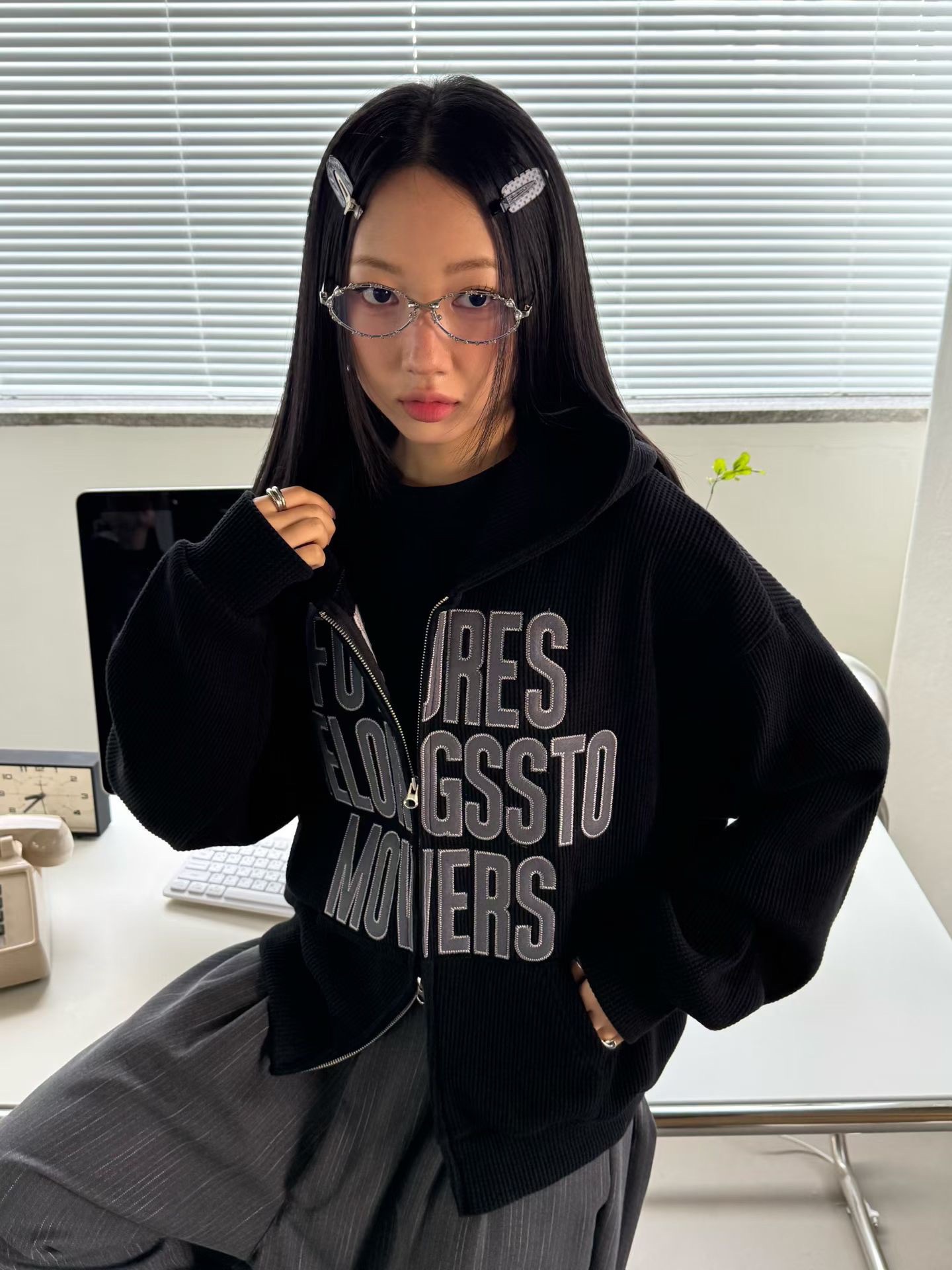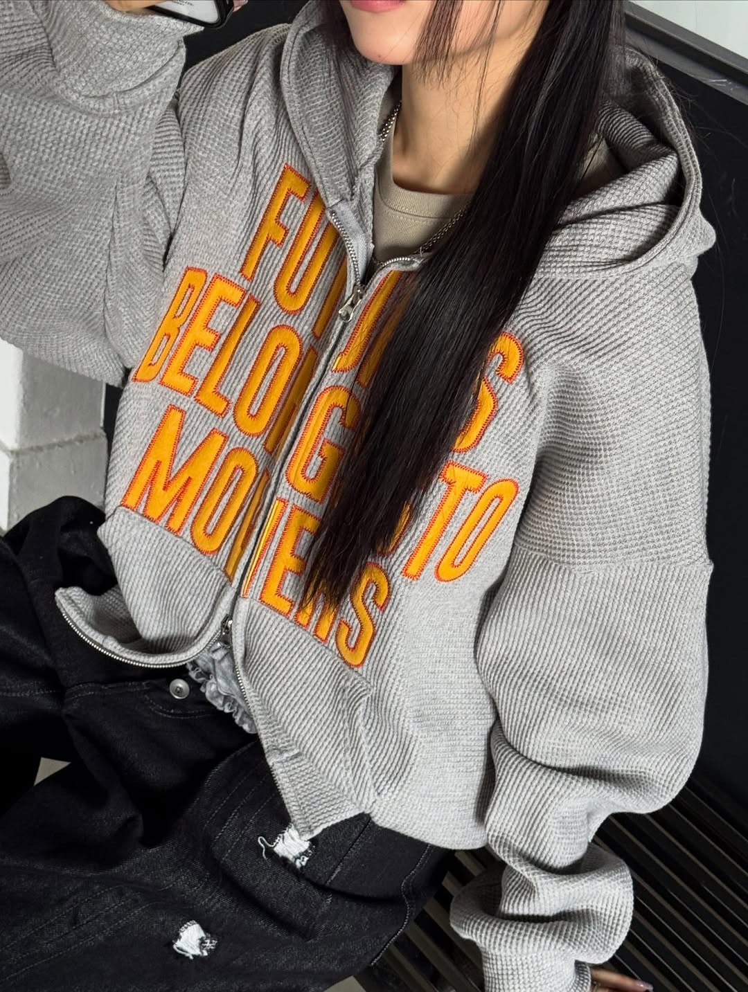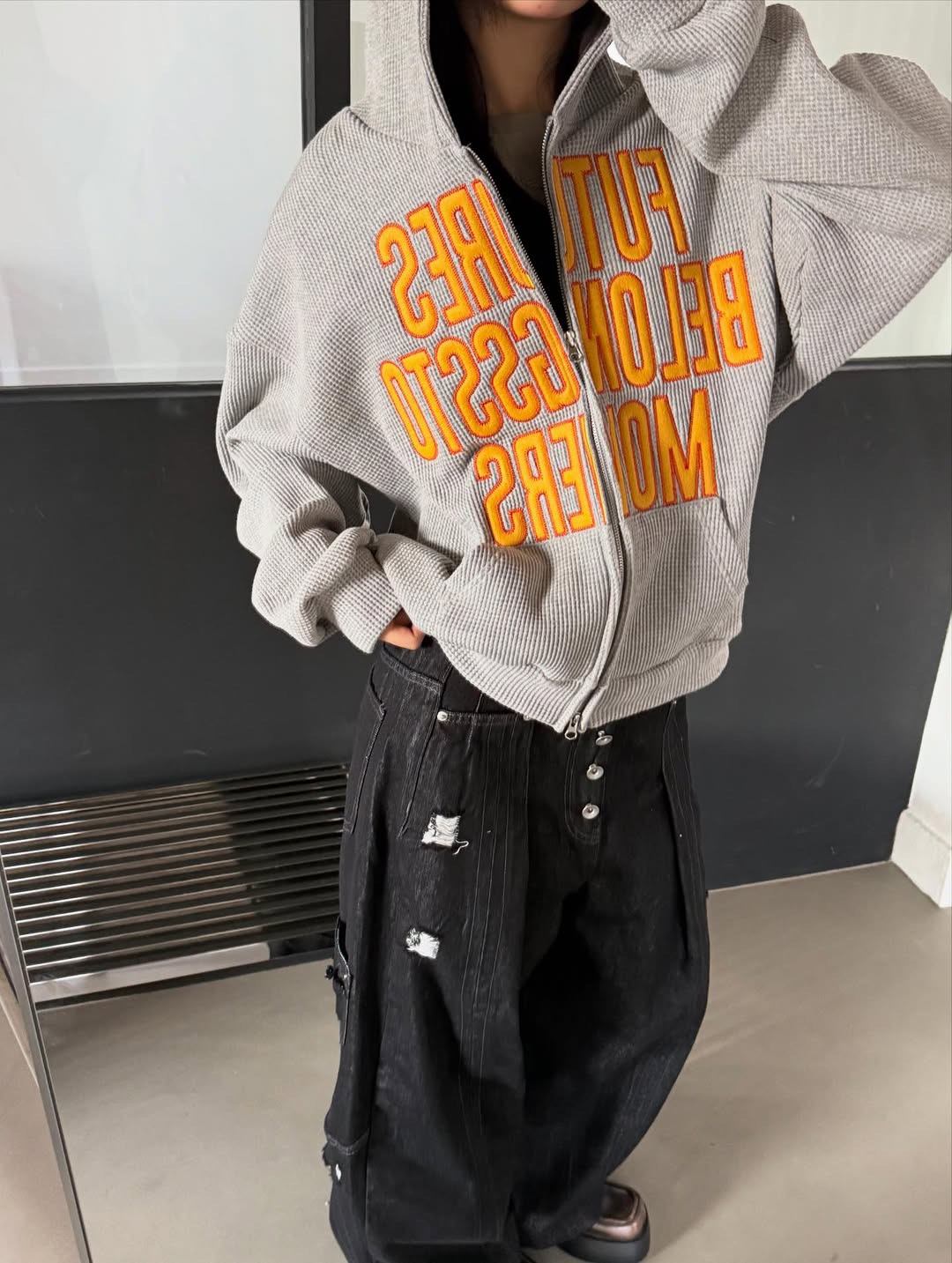 韓國 FUTURES 高級 華夫格 立體 刺繡 短版 雙拉鍊 連帽外套 (3color)
