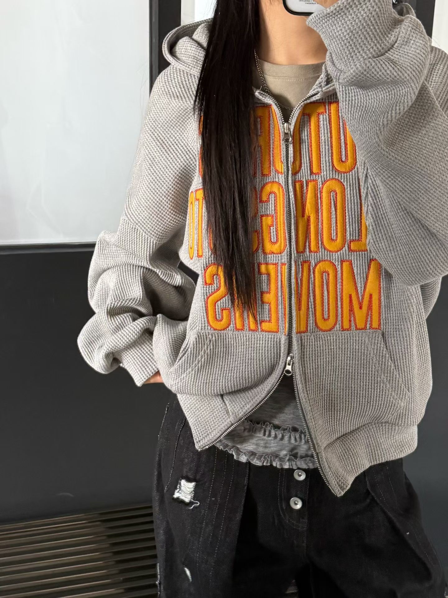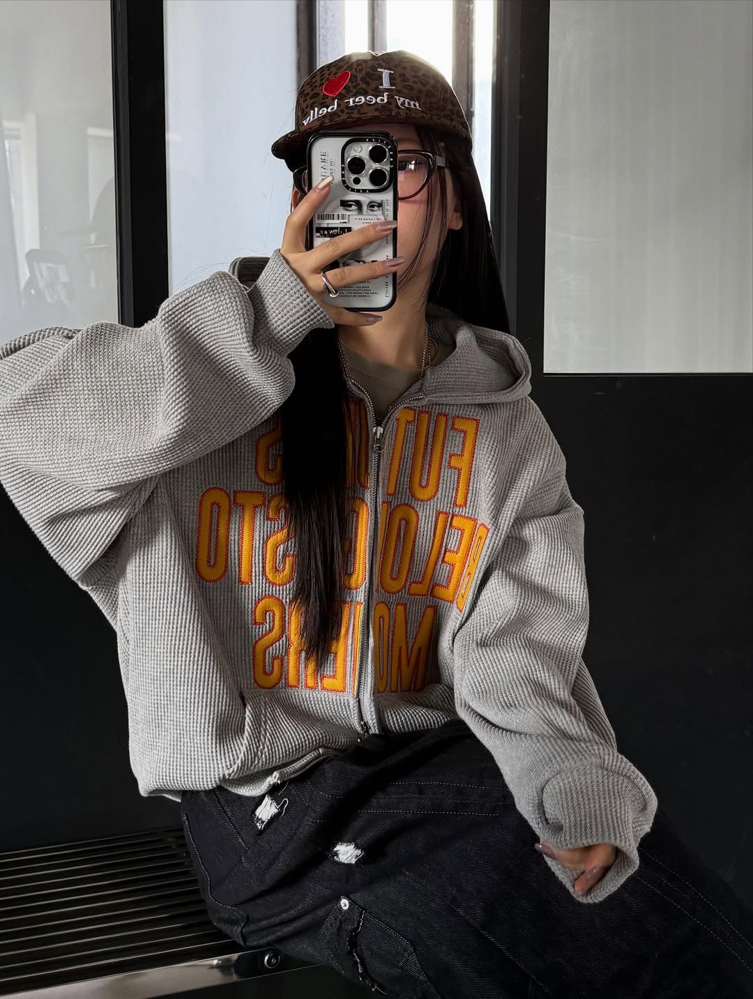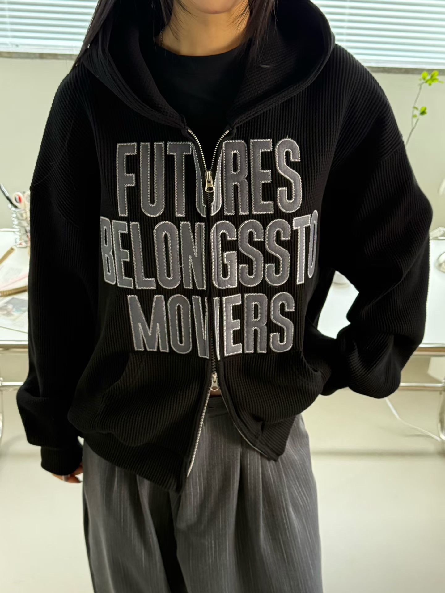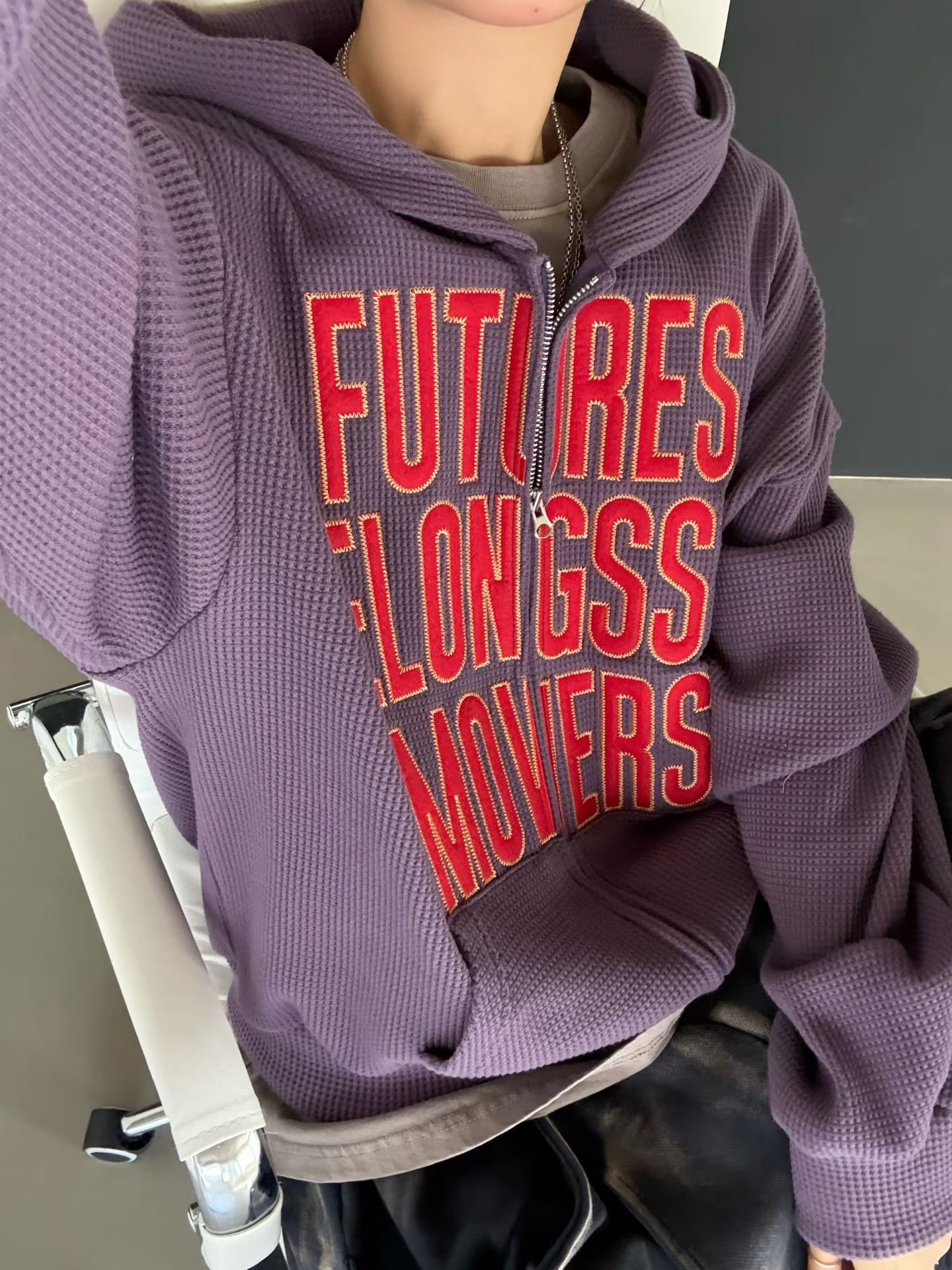 韓國 FUTURES 高級 華夫格 立體 刺繡 短版 雙拉鍊 連帽外套 (3color)
