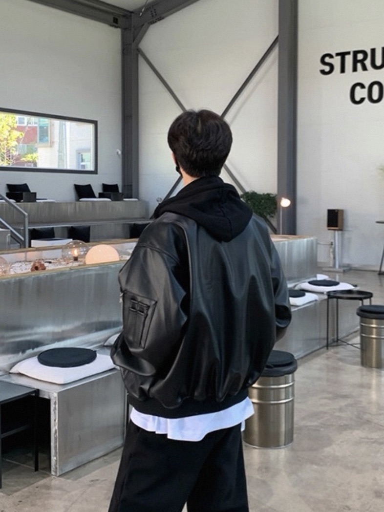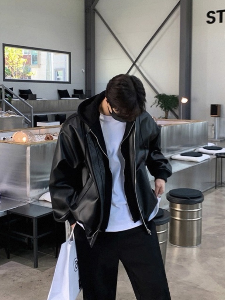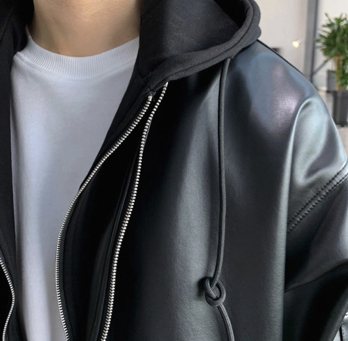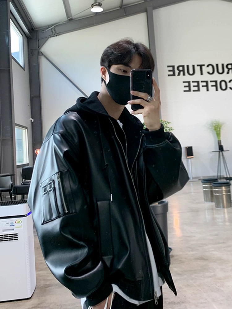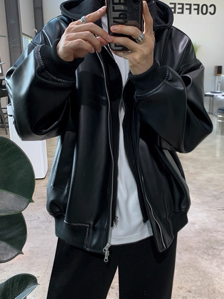韓國 假兩件 高級感 工裝 拉鍊 大口袋 連帽 皮外套 皮夾克