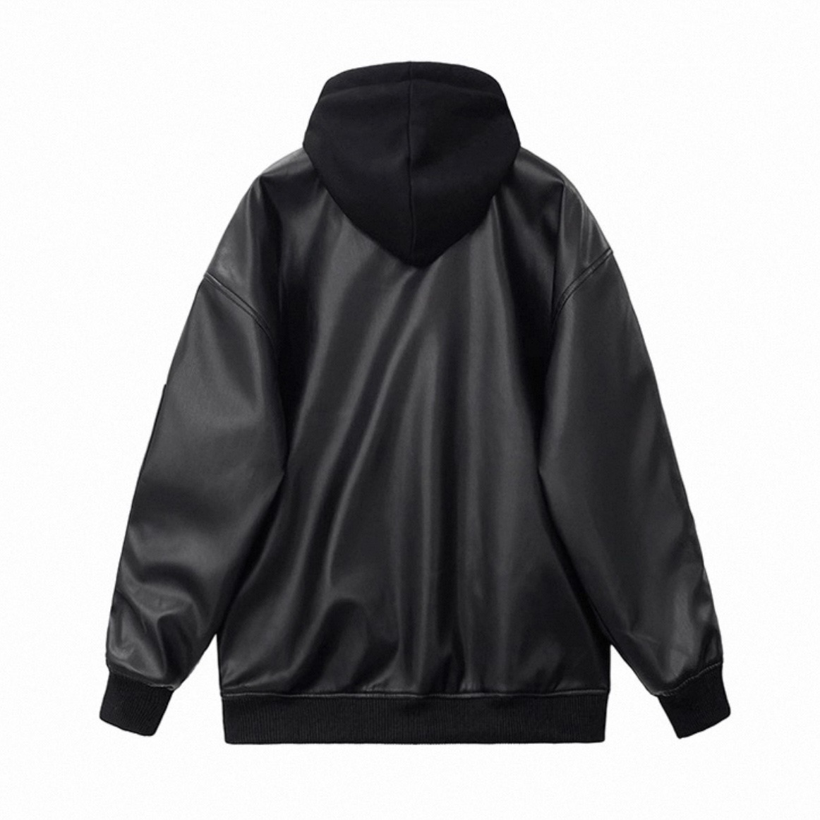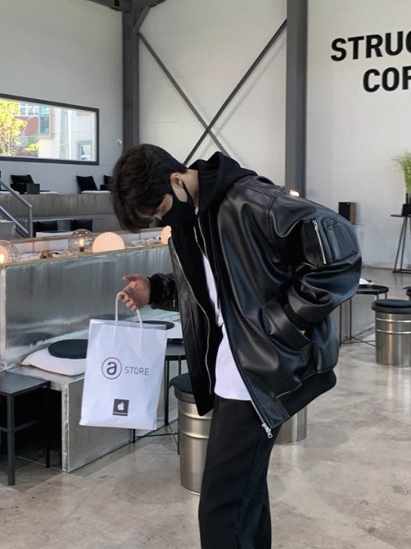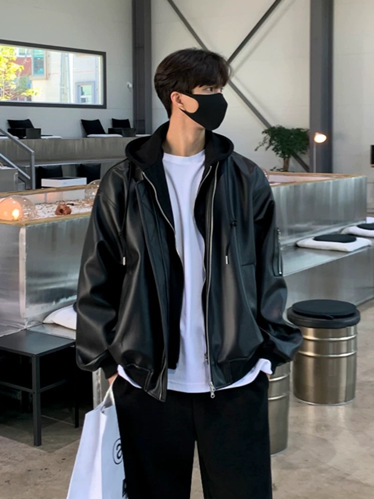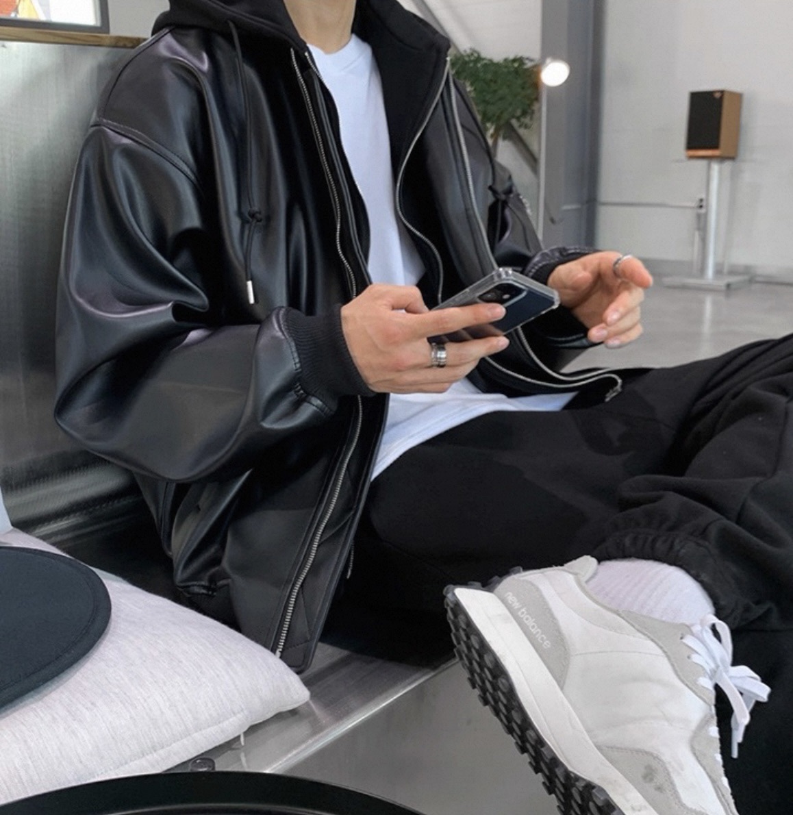 韓國 假兩件 高級感 工裝 拉鍊 大口袋 連帽 皮外套 皮夾克