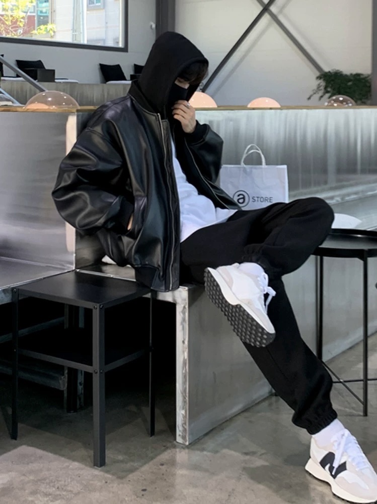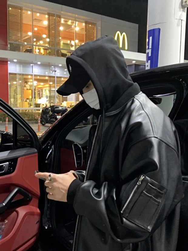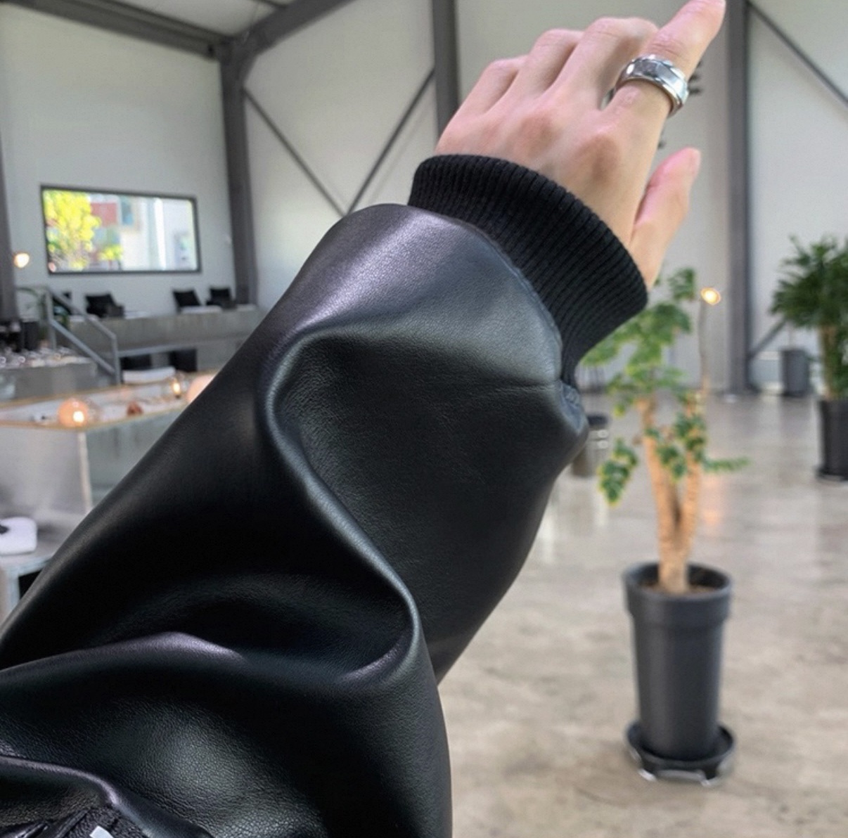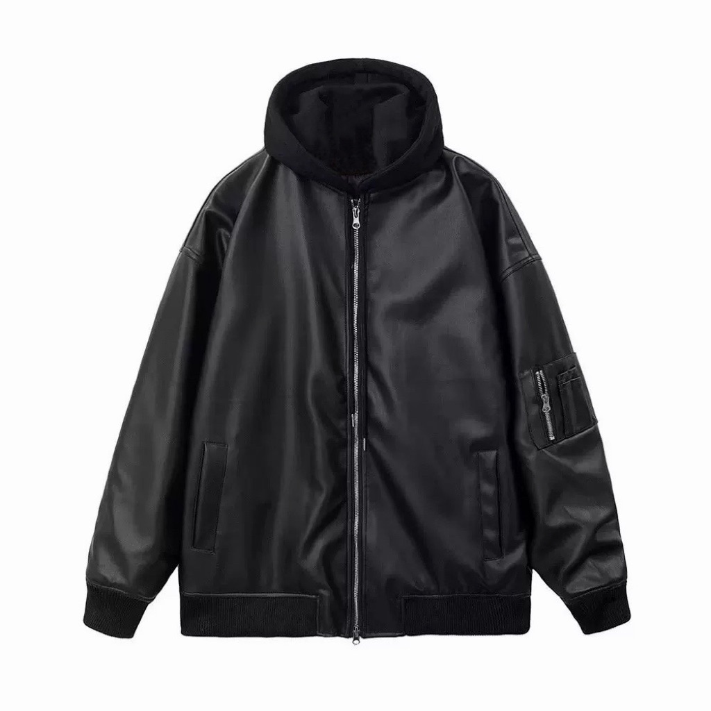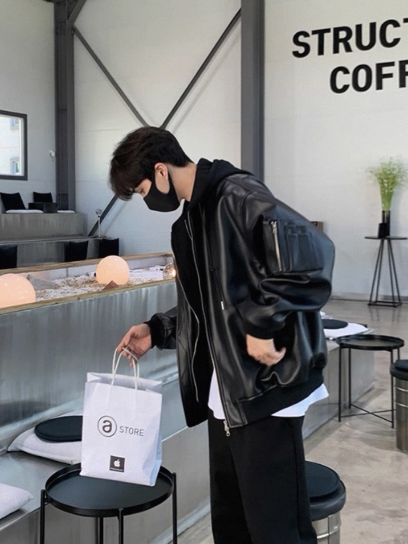 韓國 假兩件 高級感 工裝 拉鍊 大口袋 連帽 皮外套 皮夾克