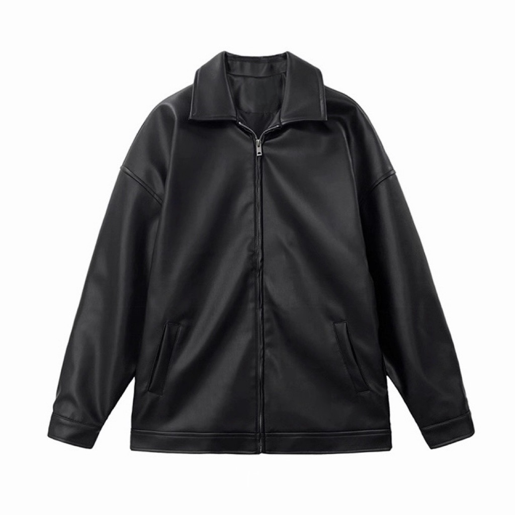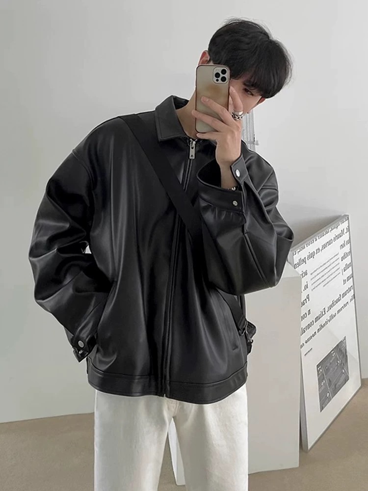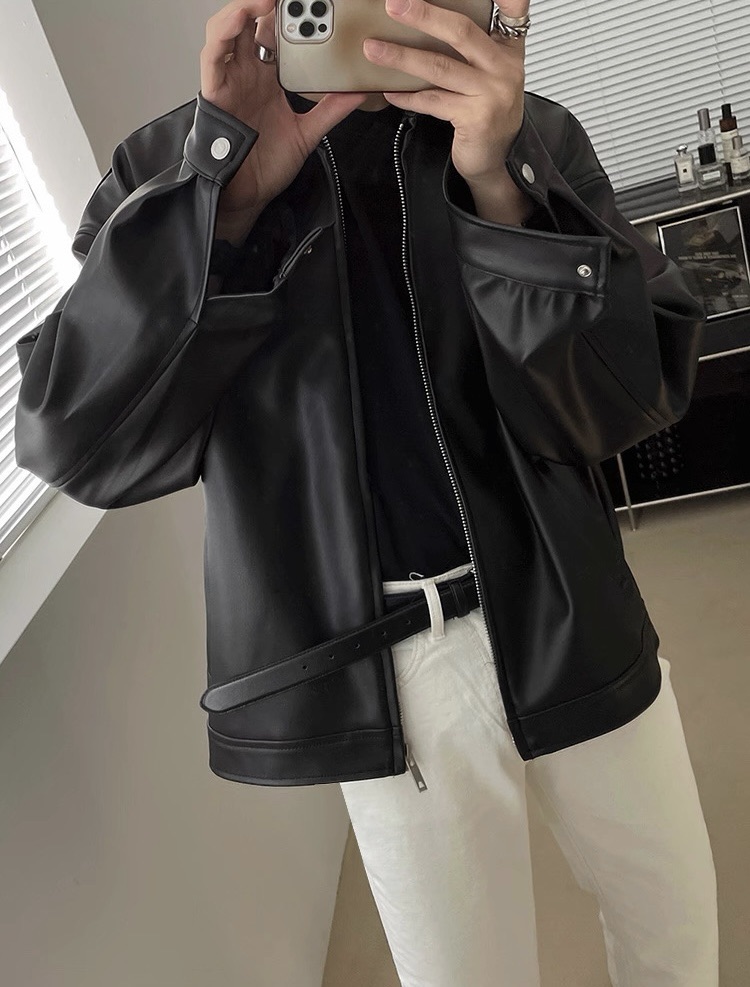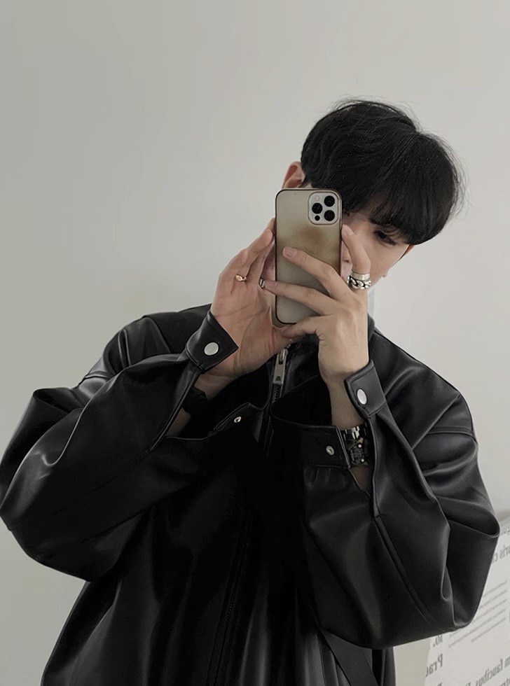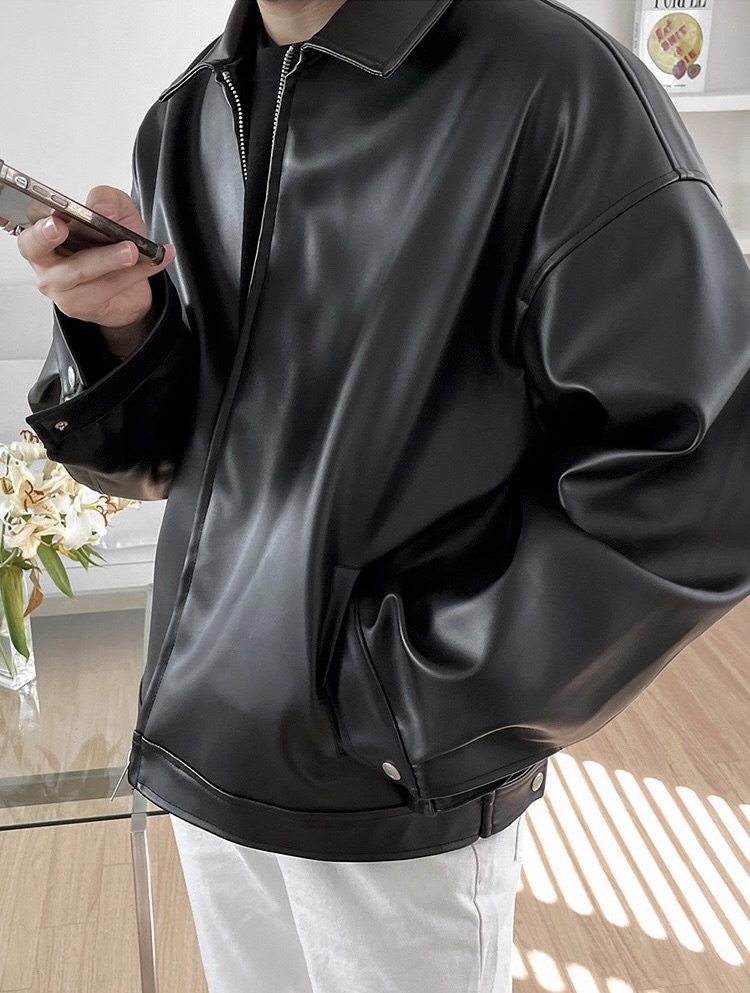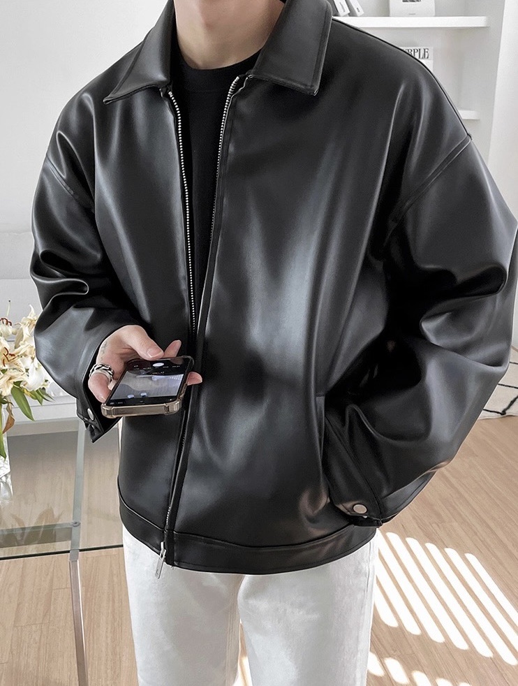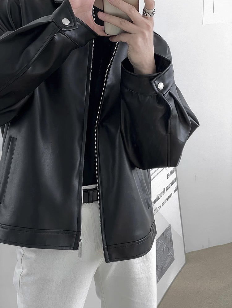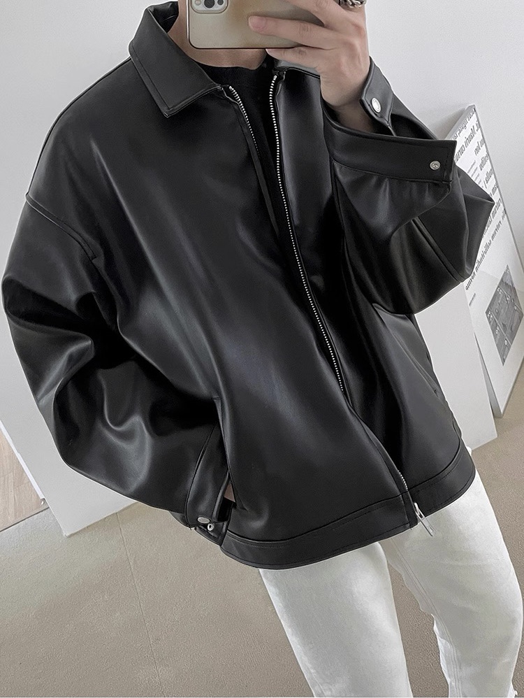 韓國 痞帥 光澤感 立體 重磅 素色 拉鍊 皮外套 皮夾克
