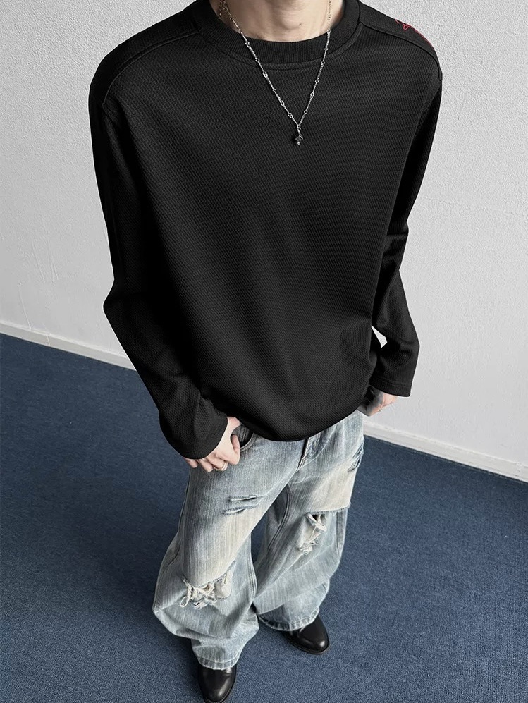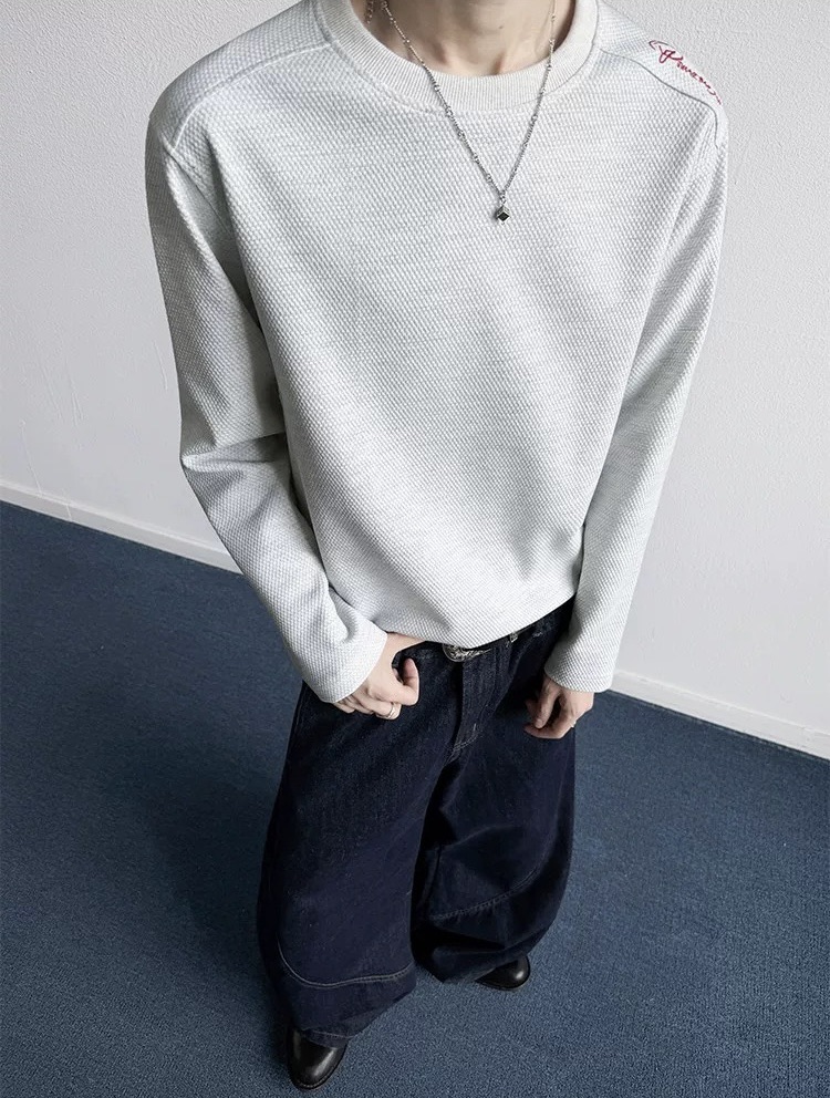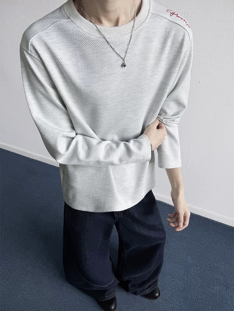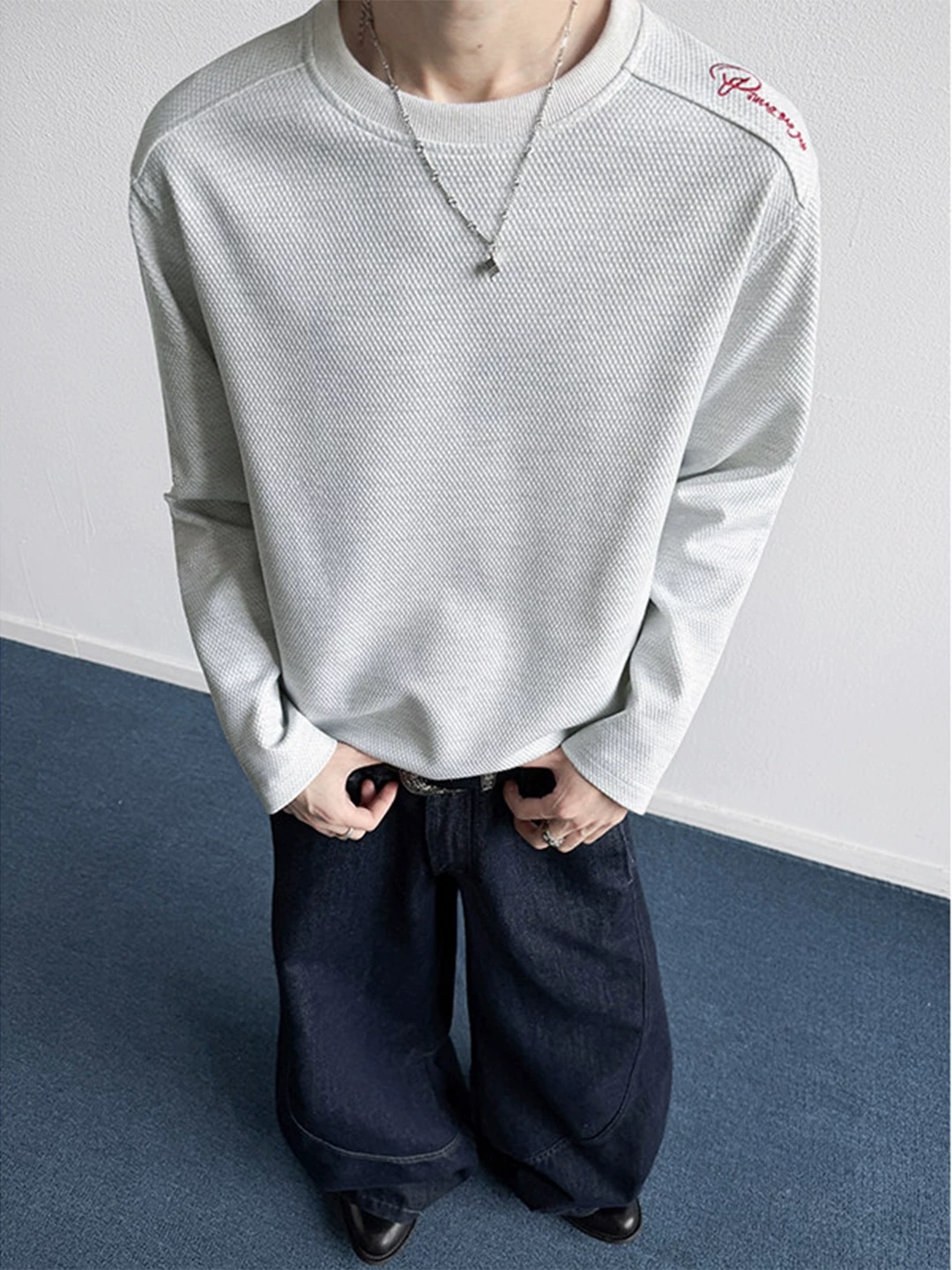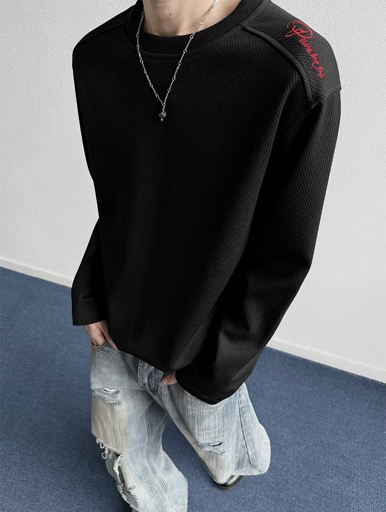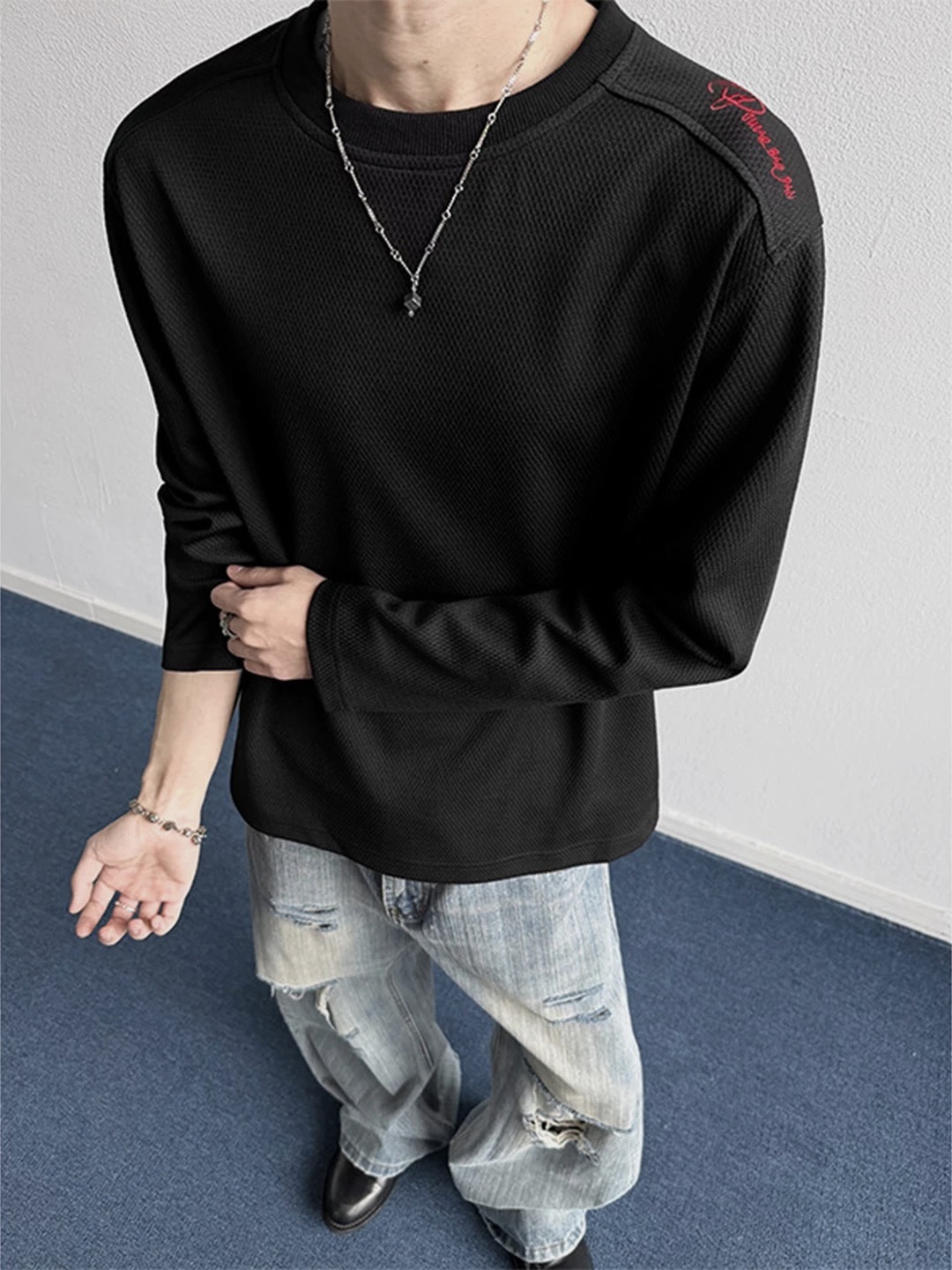 華夫格 肩部 刺繡 小文字 設計 單穿 打底 長袖 上衣 (2color)