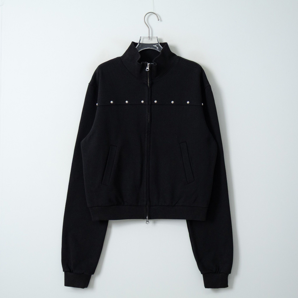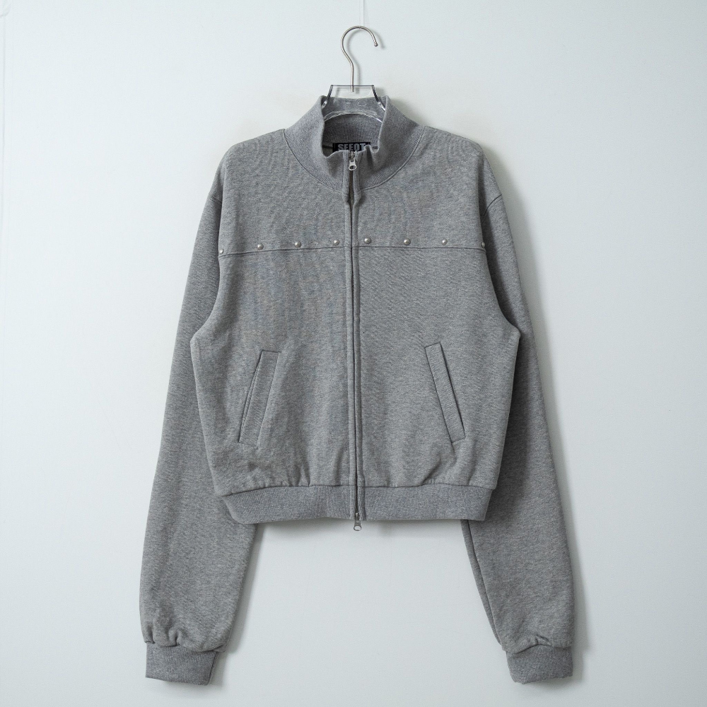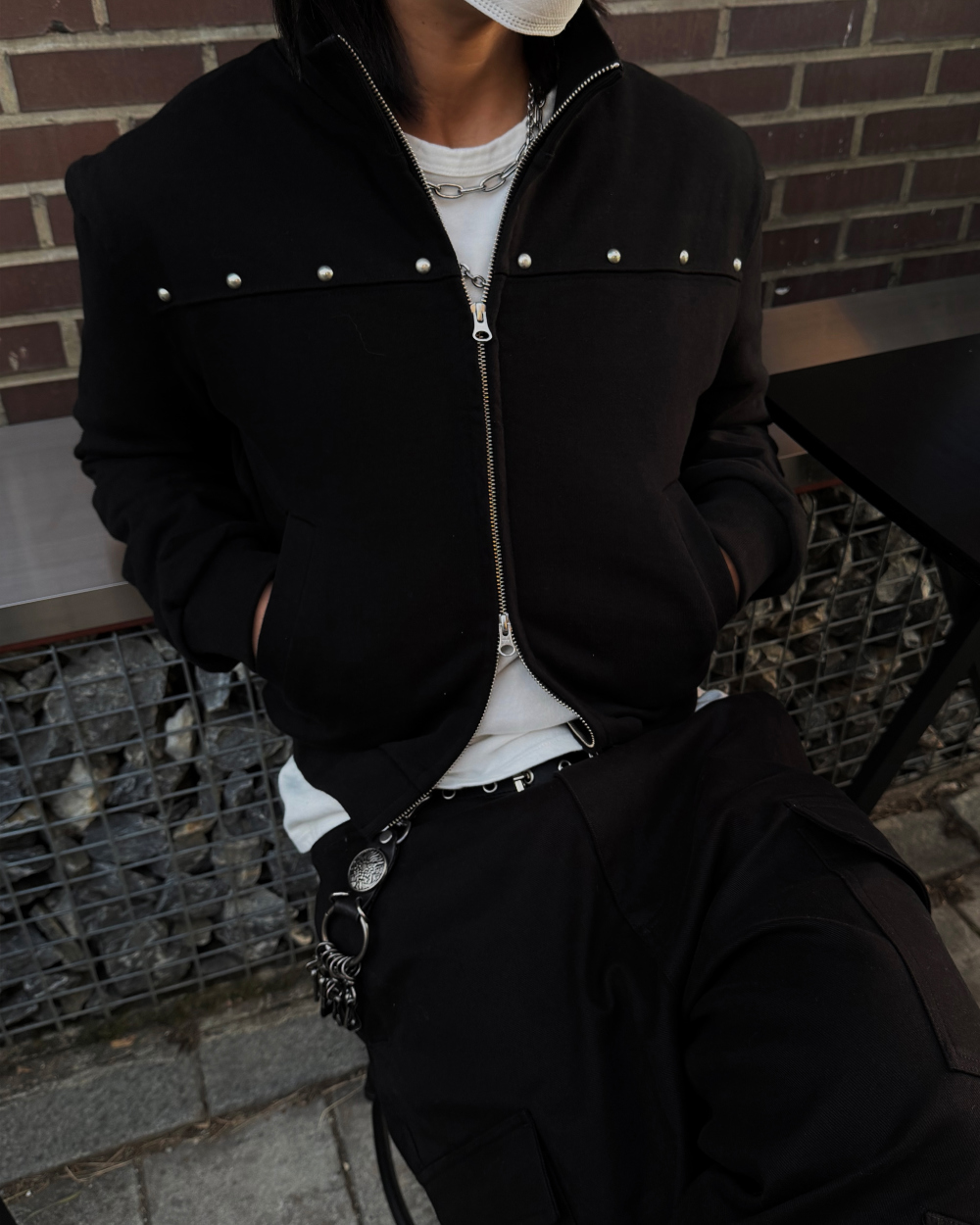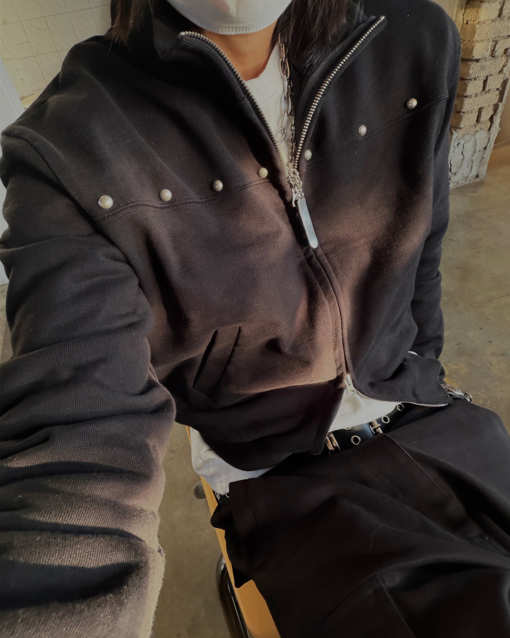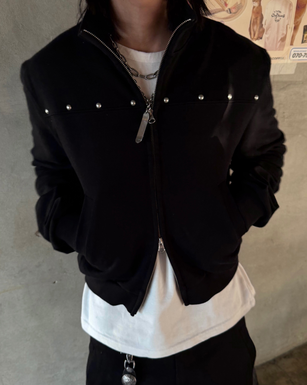 Cause closet 珍珠 鉚釘 設計感 墊肩 短版 立領 雙拉鍊 外套 (2color)