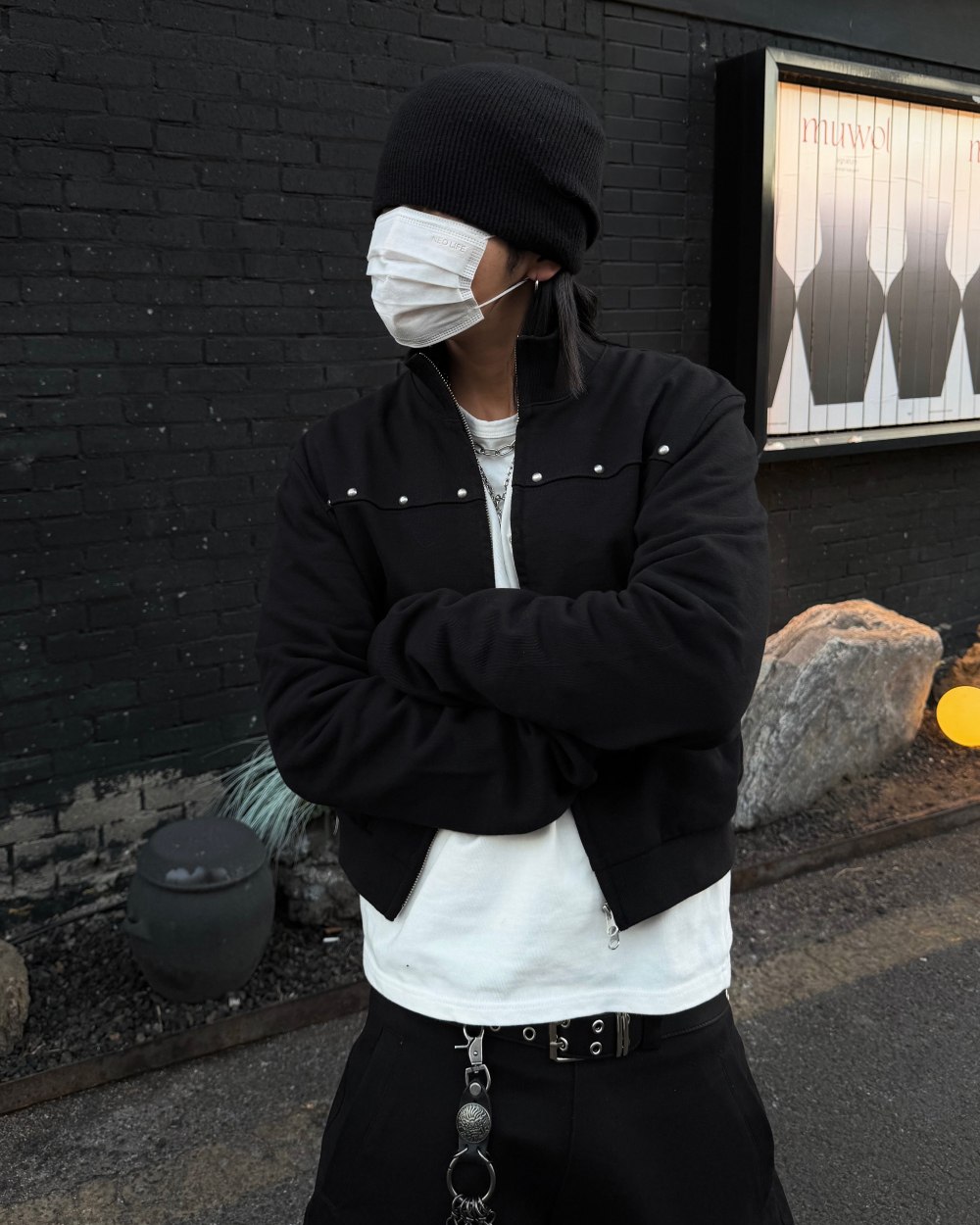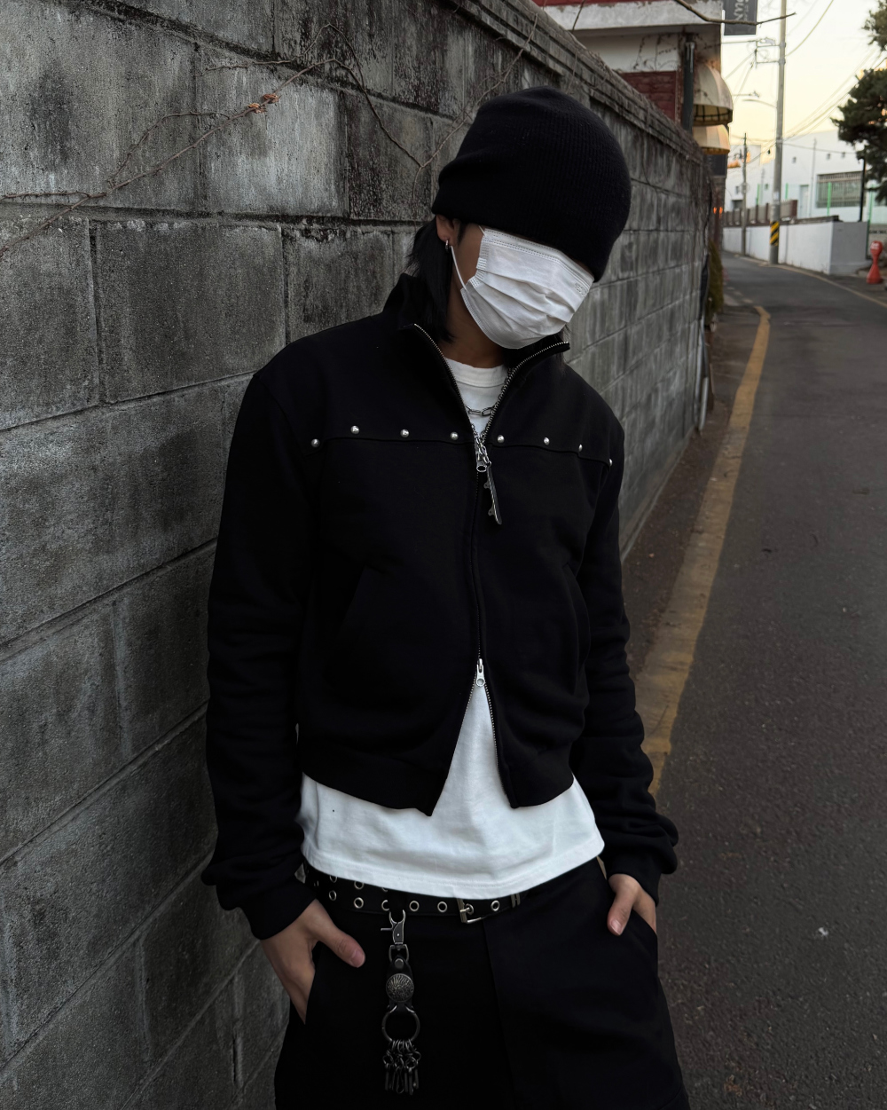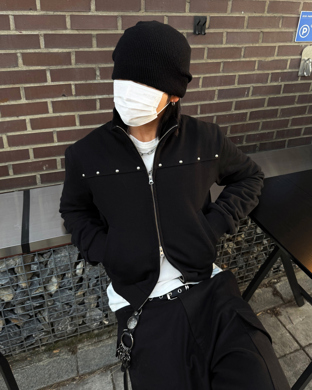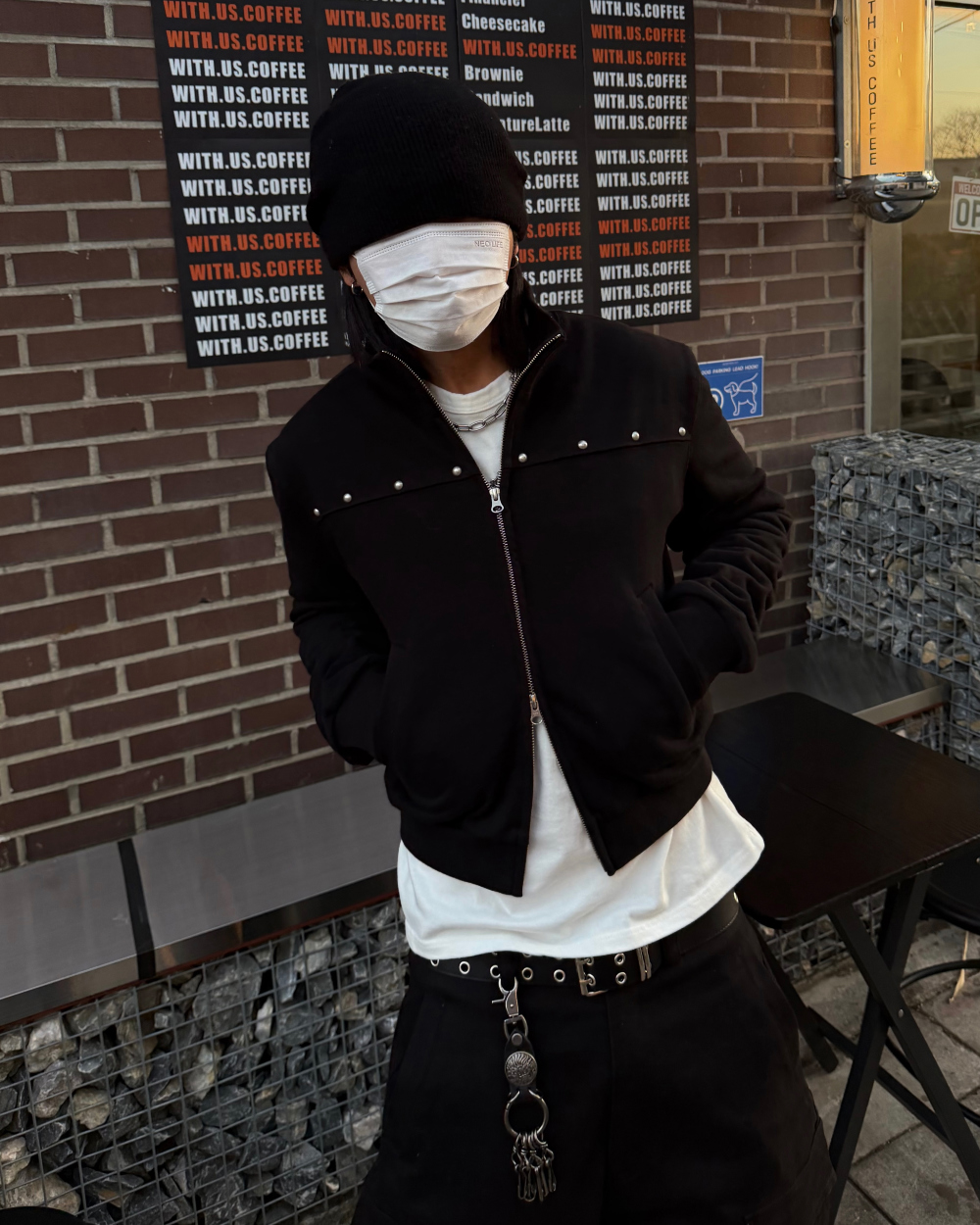 Cause closet 珍珠 鉚釘 設計感 墊肩 短版 立領 雙拉鍊 外套 (2color)