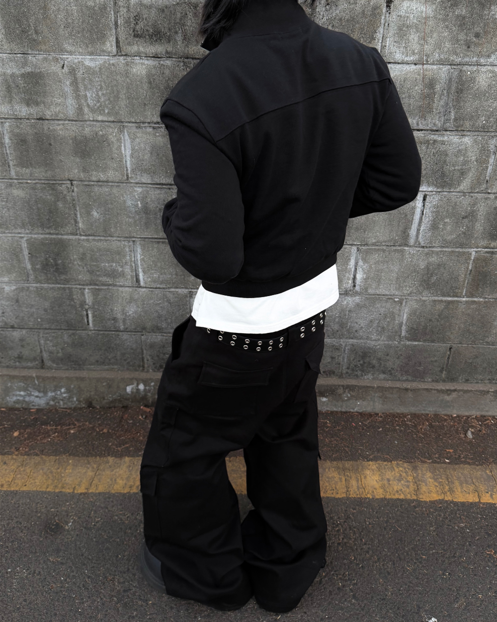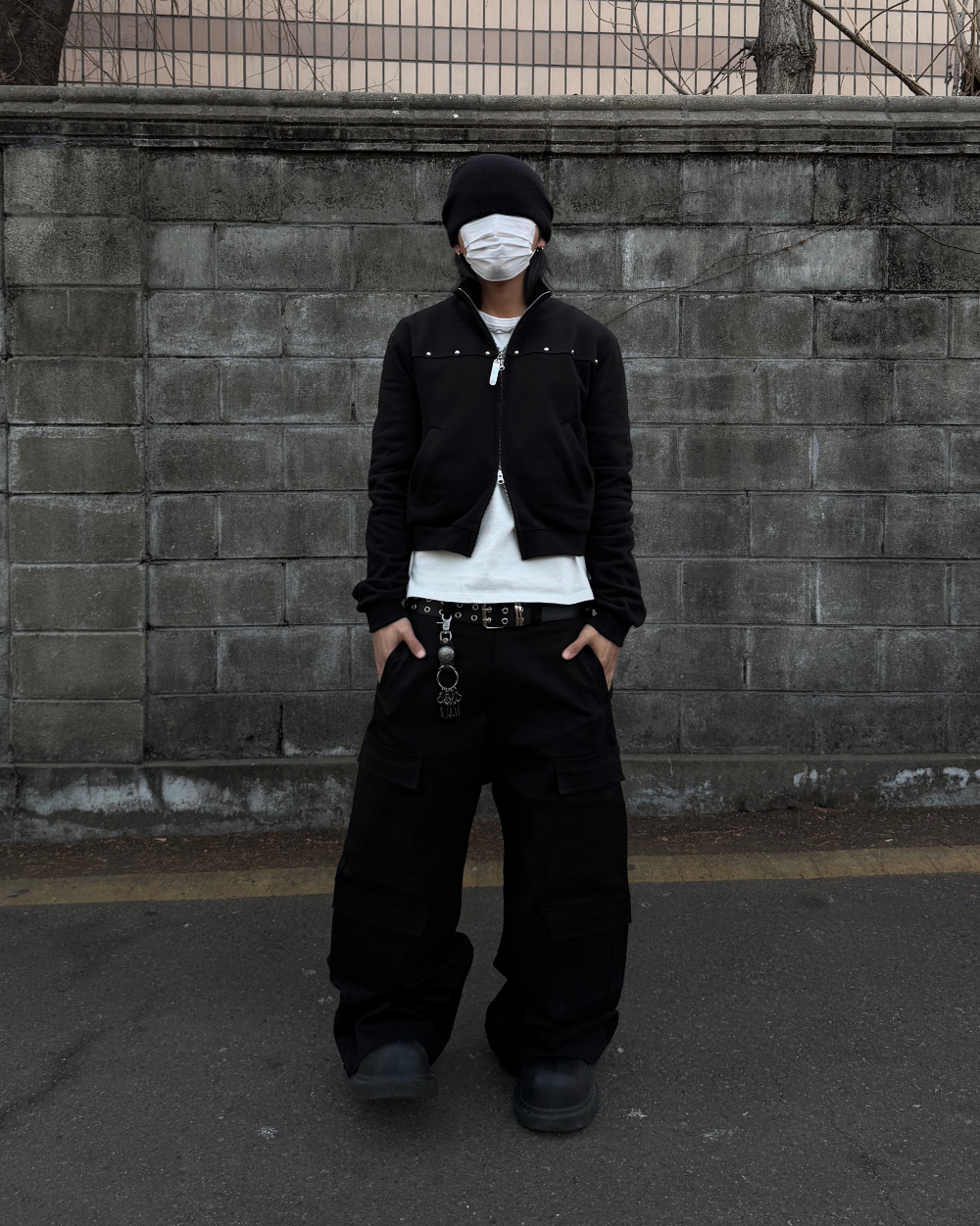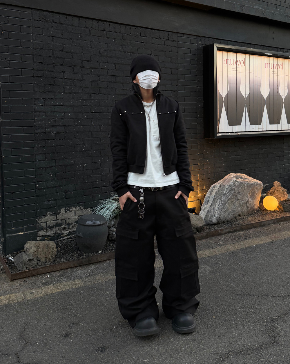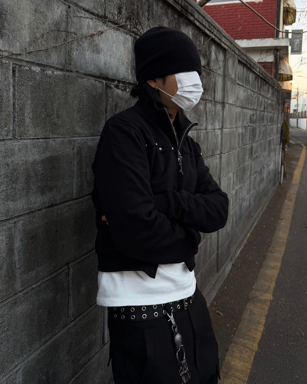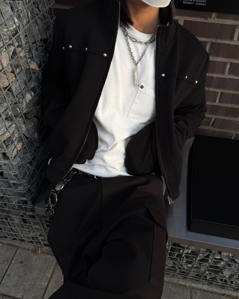Cause closet 珍珠 鉚釘 設計感 墊肩 短版 立領 雙拉鍊 外套 (2color)