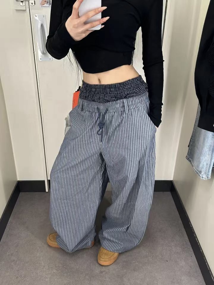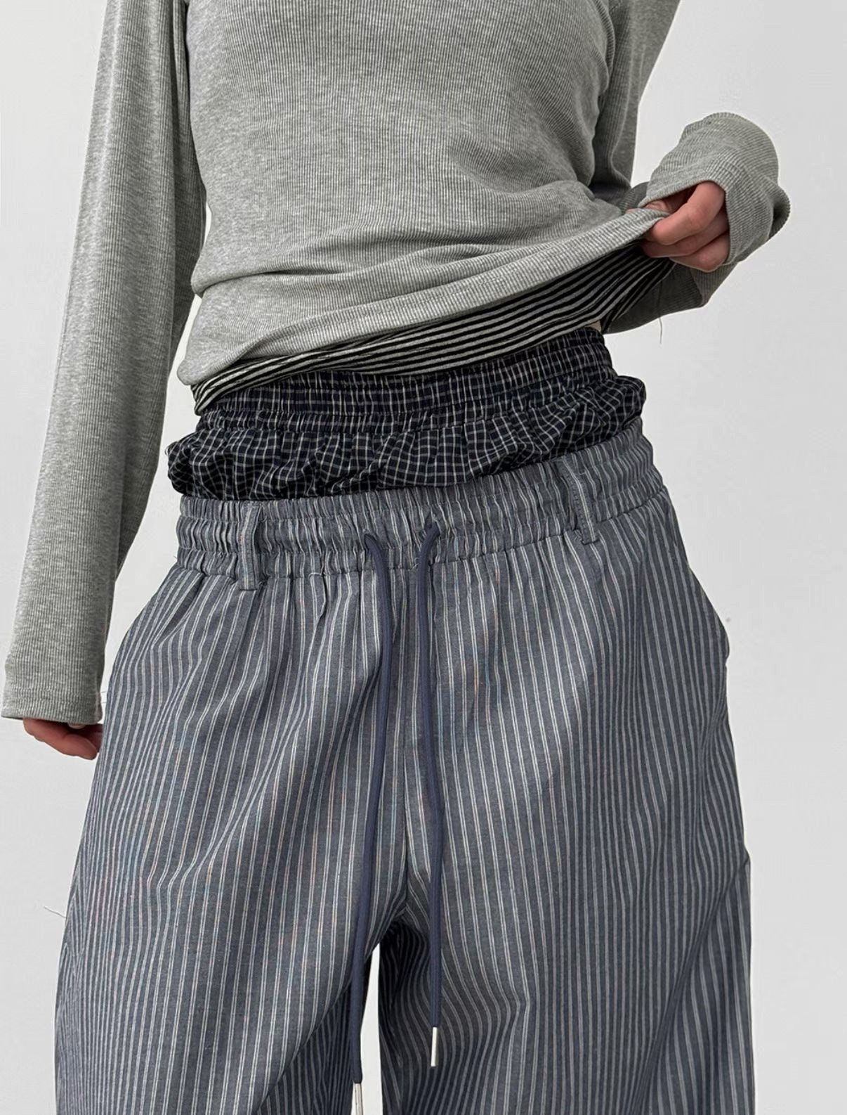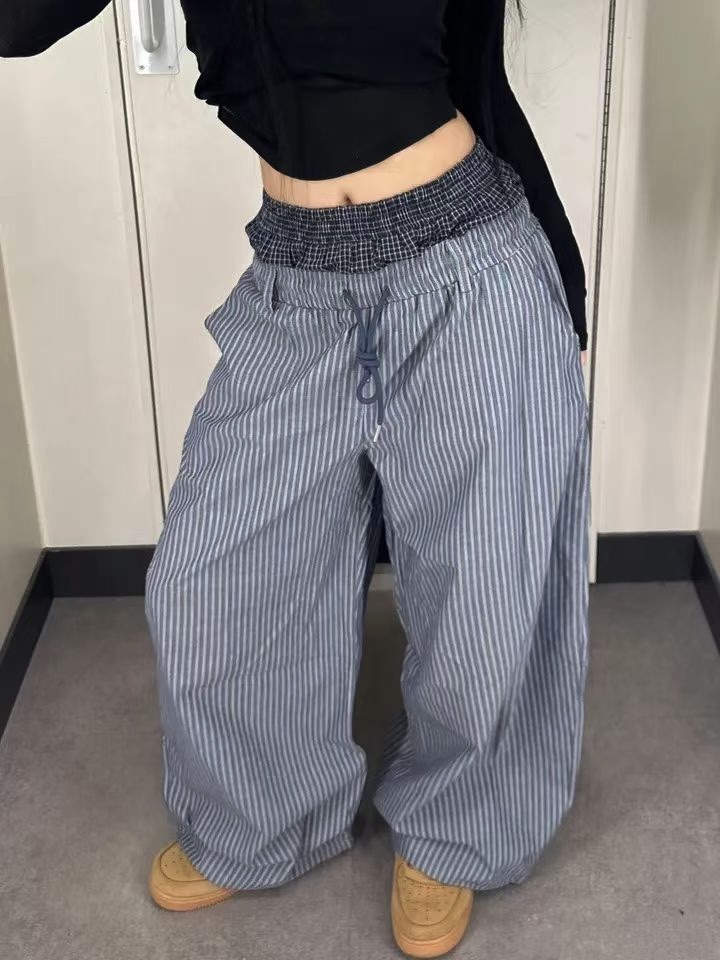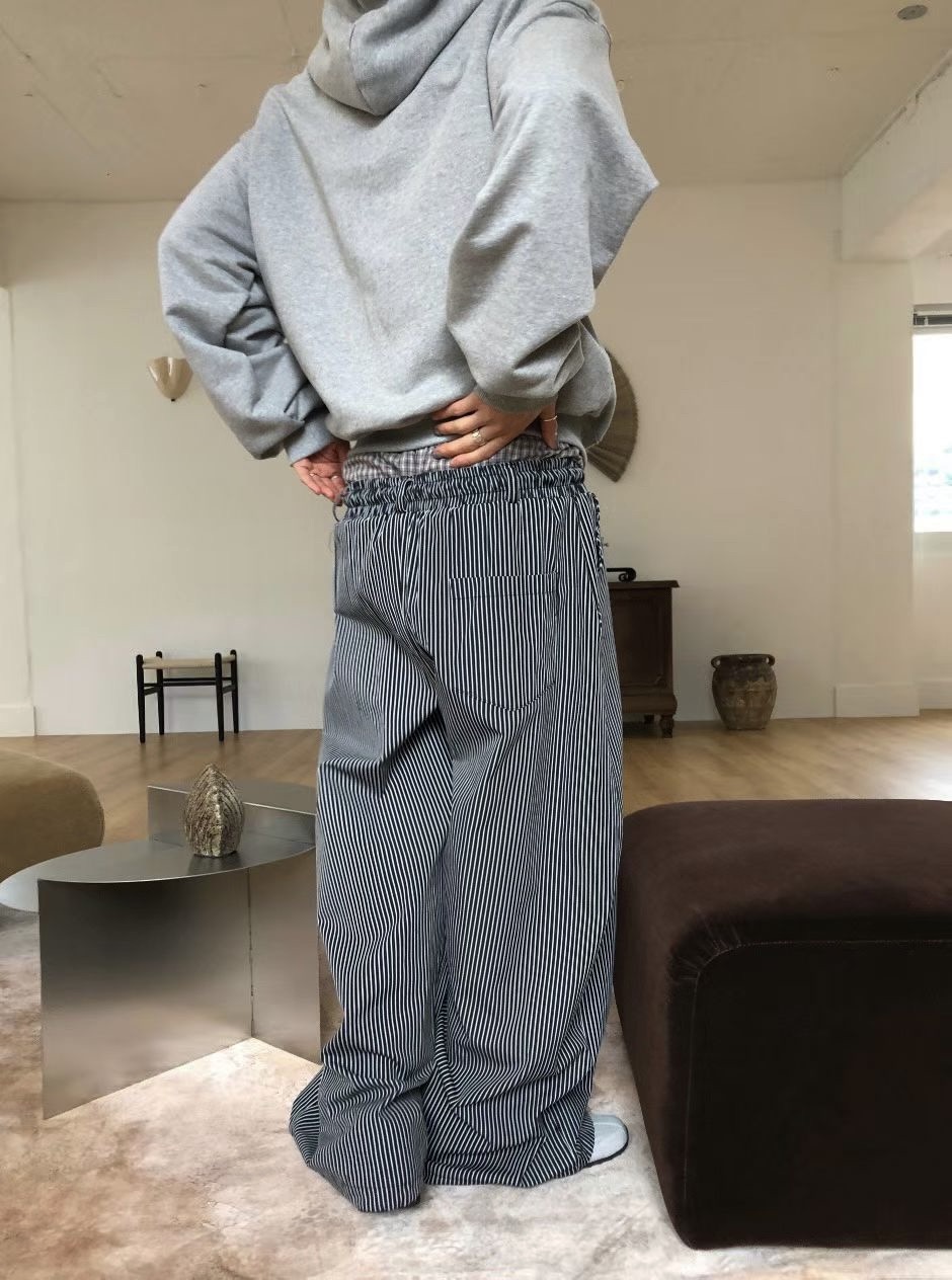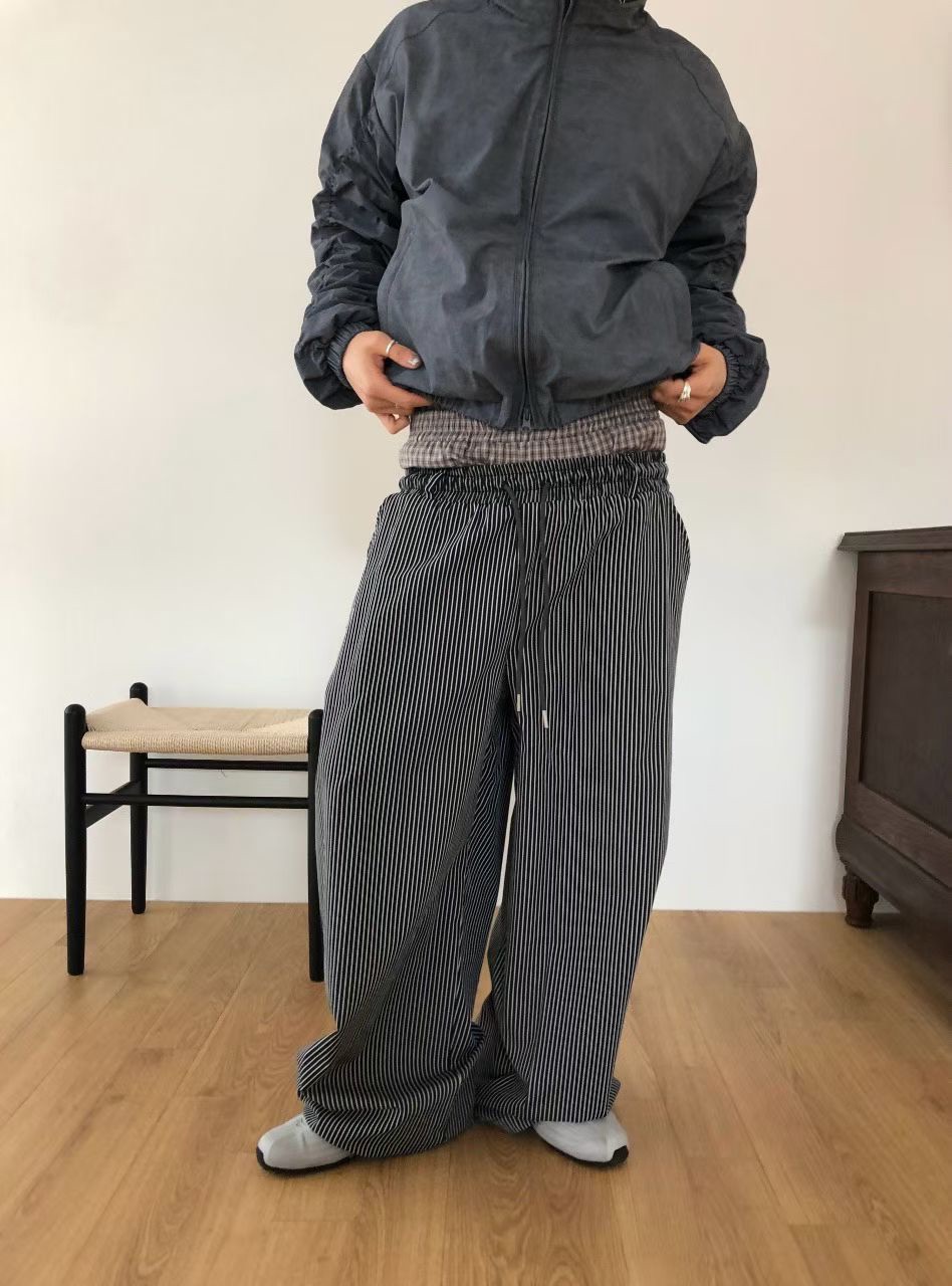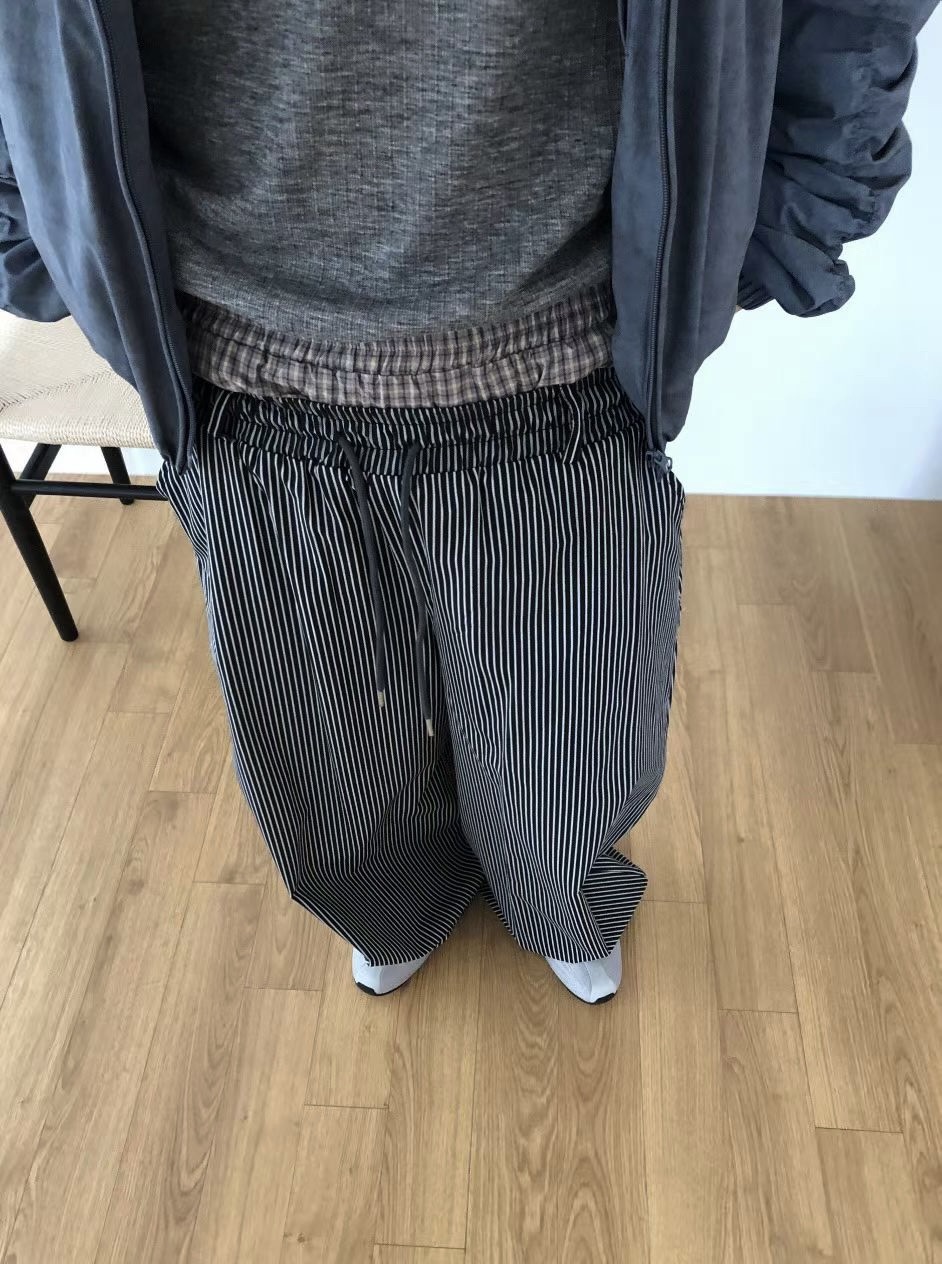 韓國 雙層 假兩件褲頭 設計感 條紋 滑面 涼感 抽繩 寬褲 長褲 (2color)