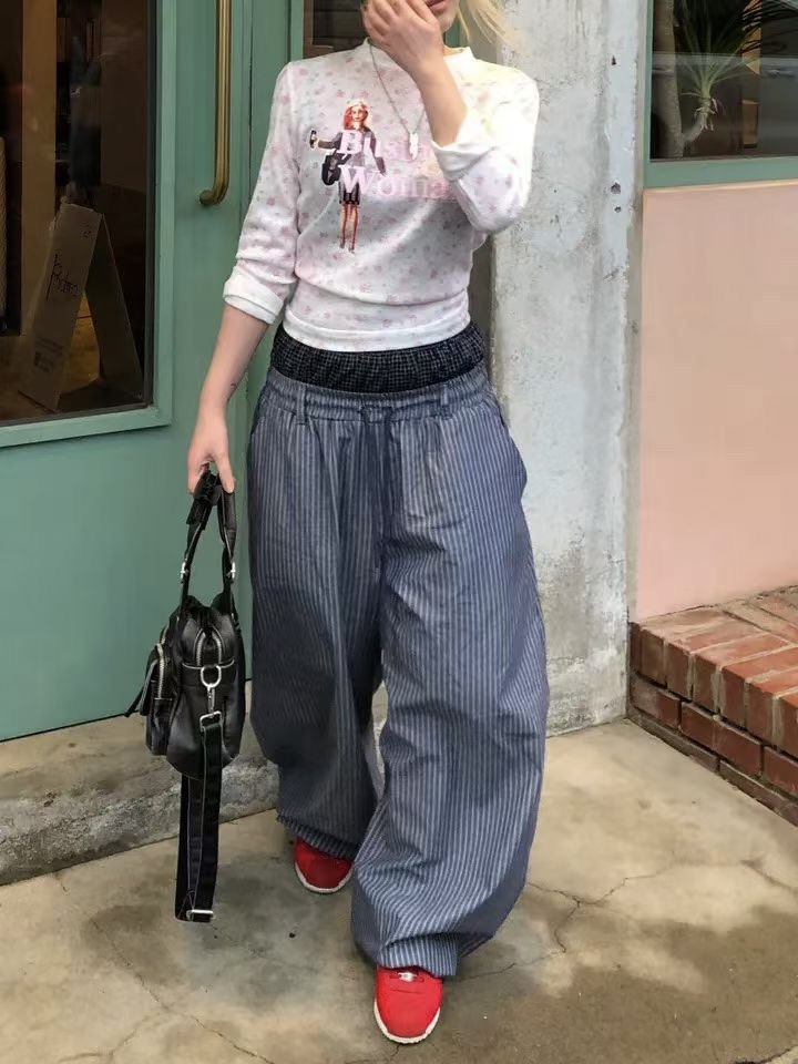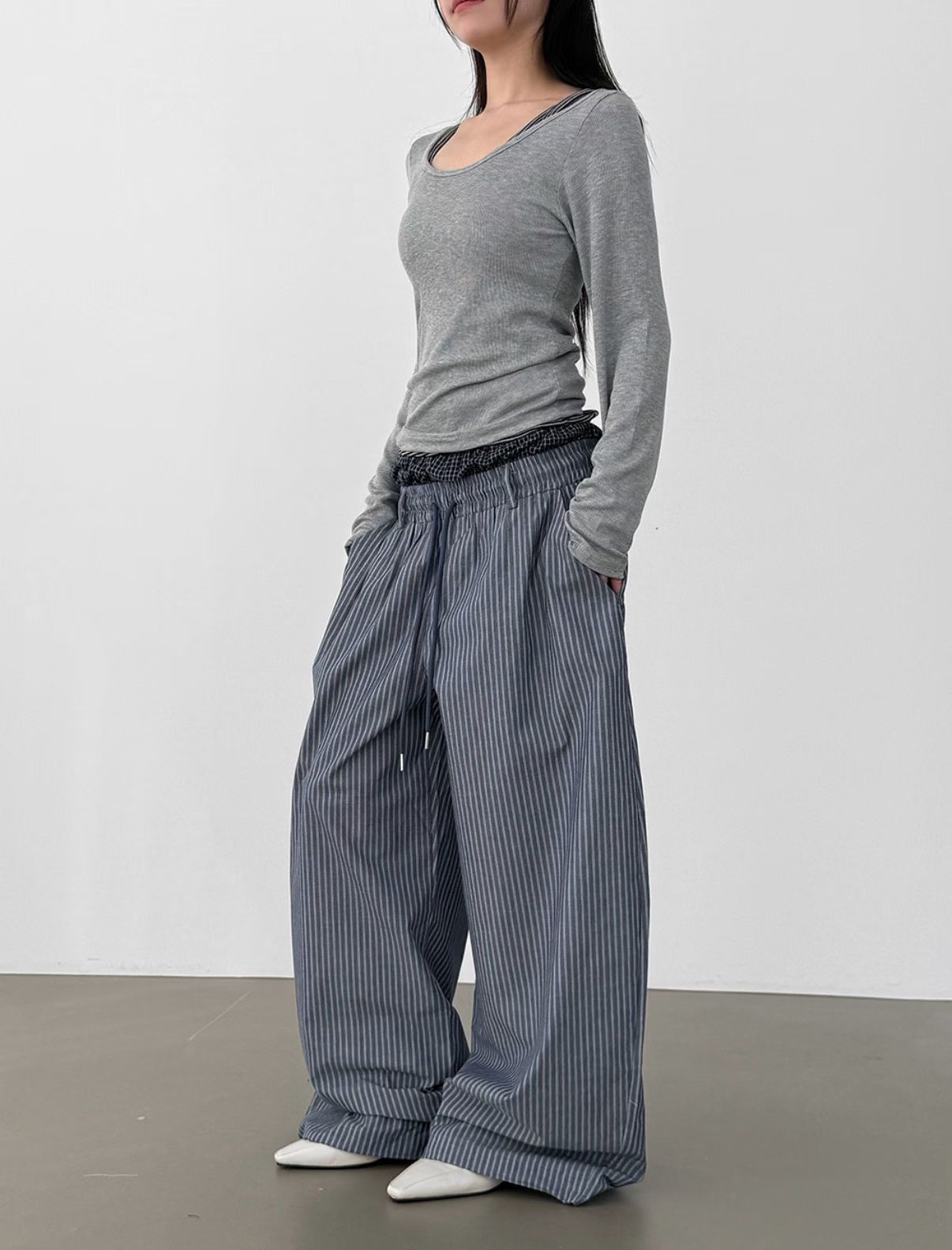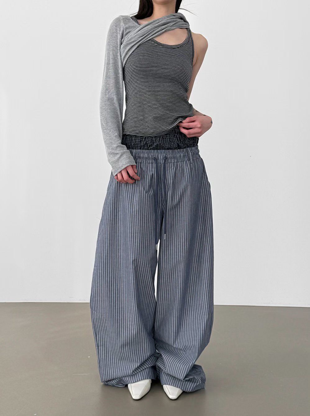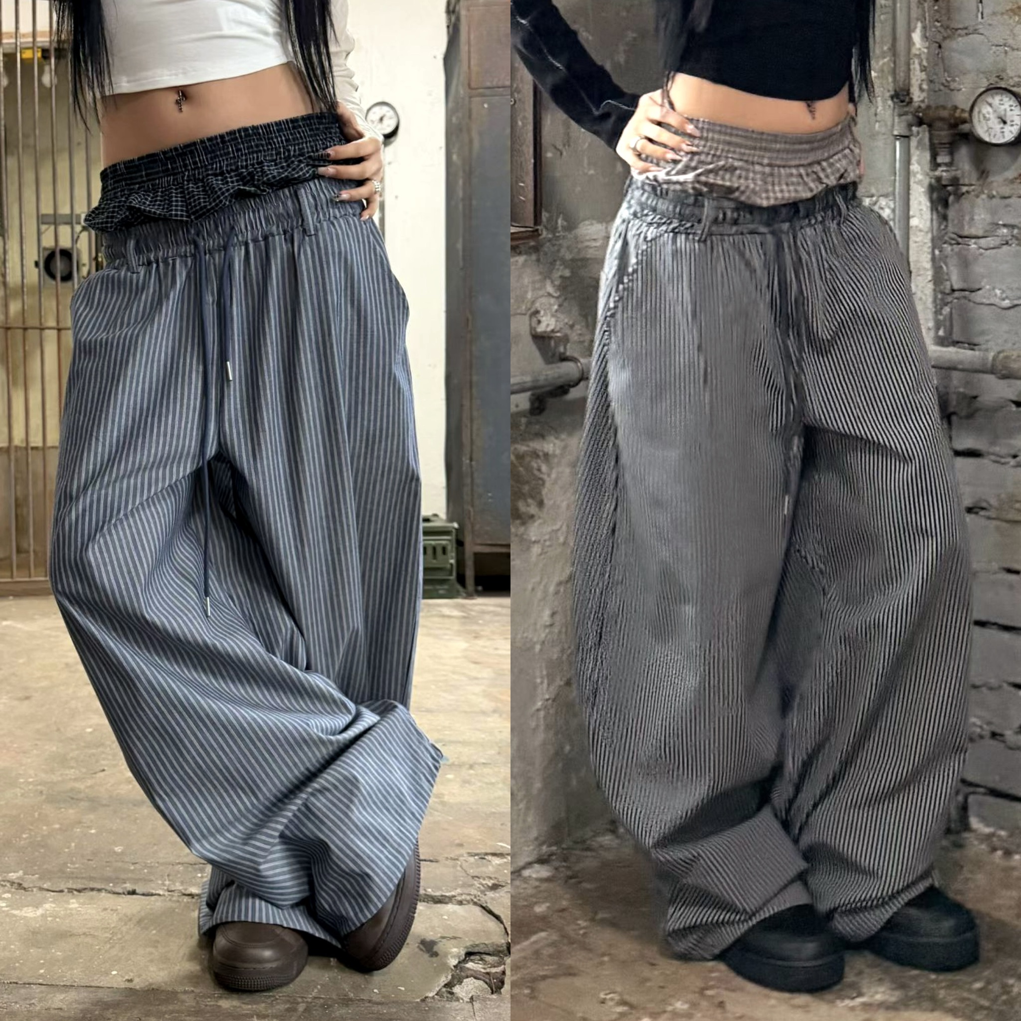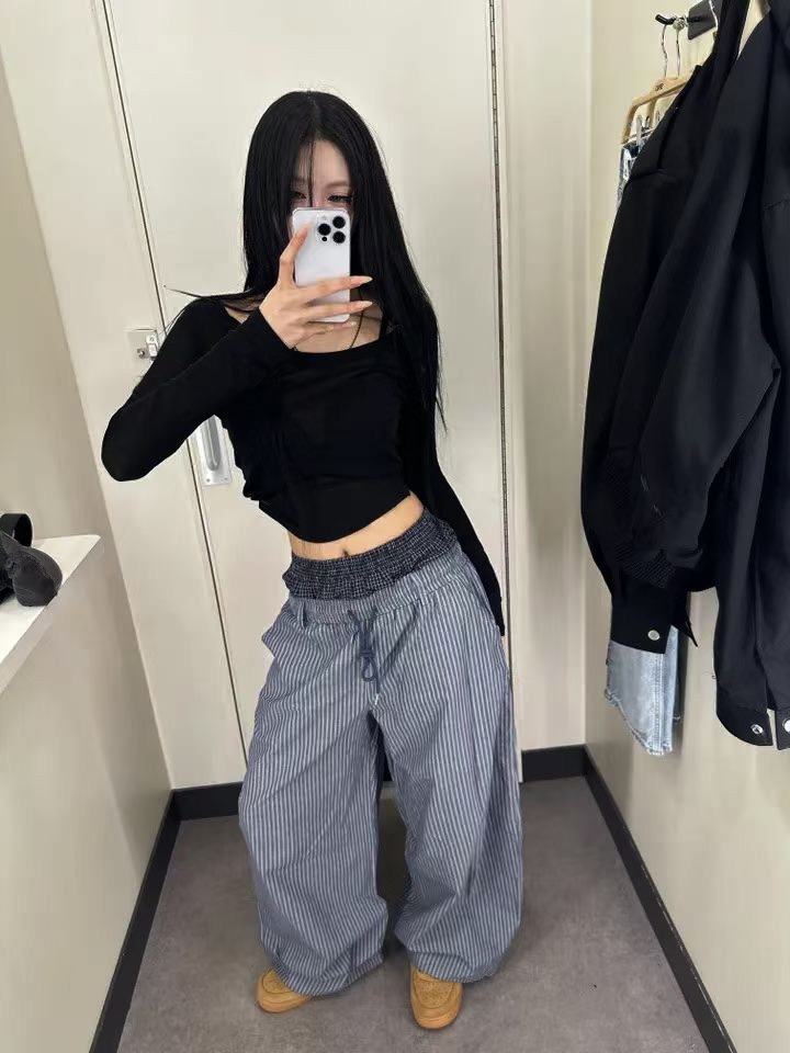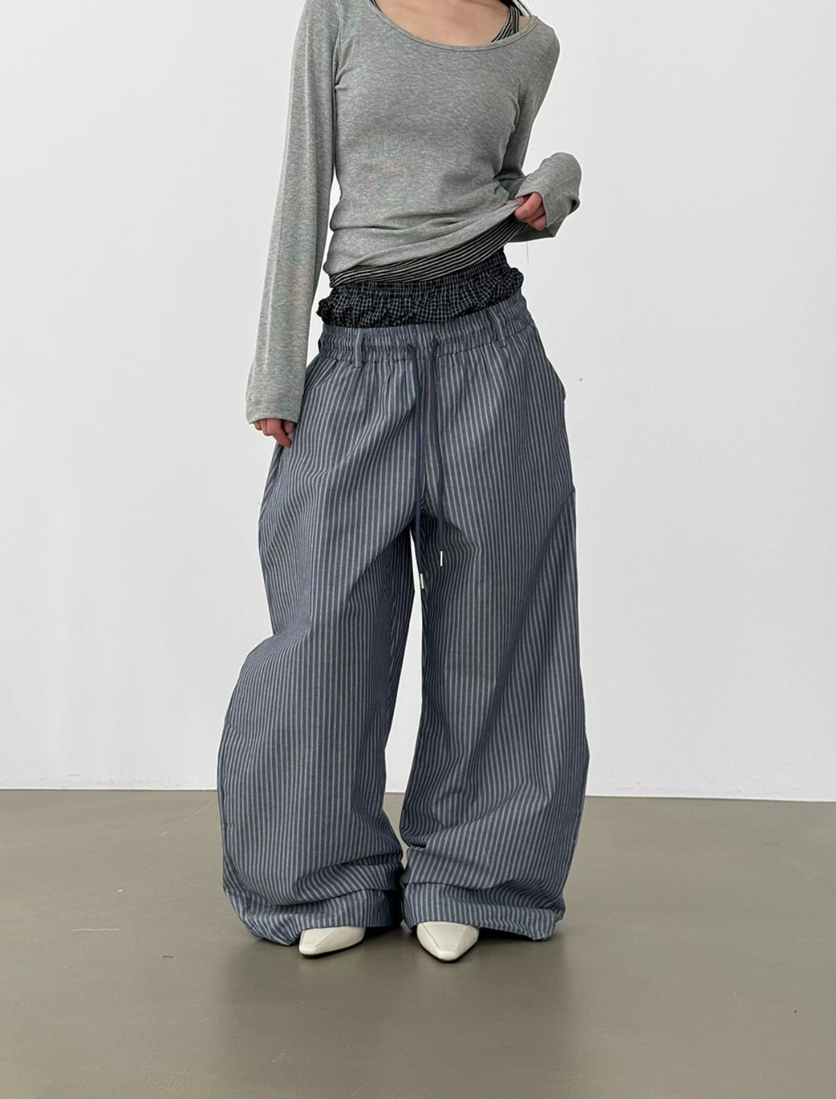 韓國 雙層 假兩件褲頭 設計感 條紋 滑面 涼感 抽繩 寬褲 長褲 (2color)
