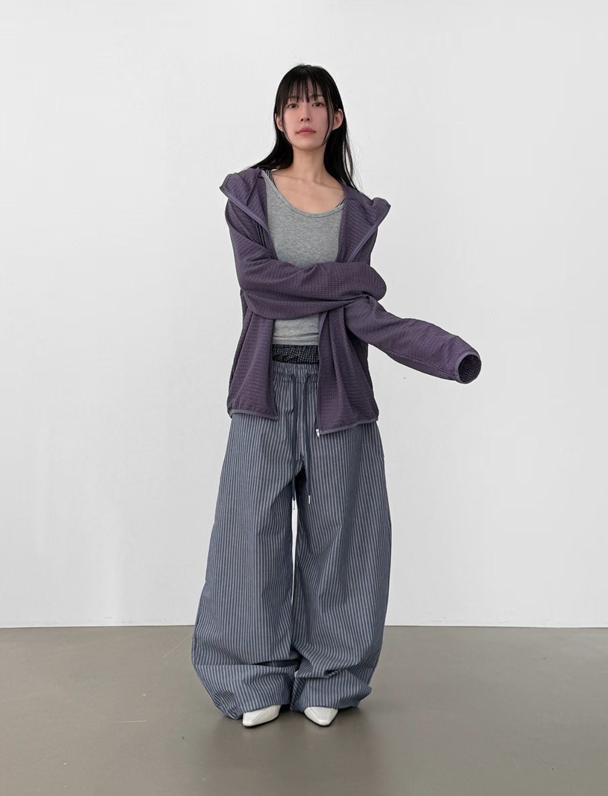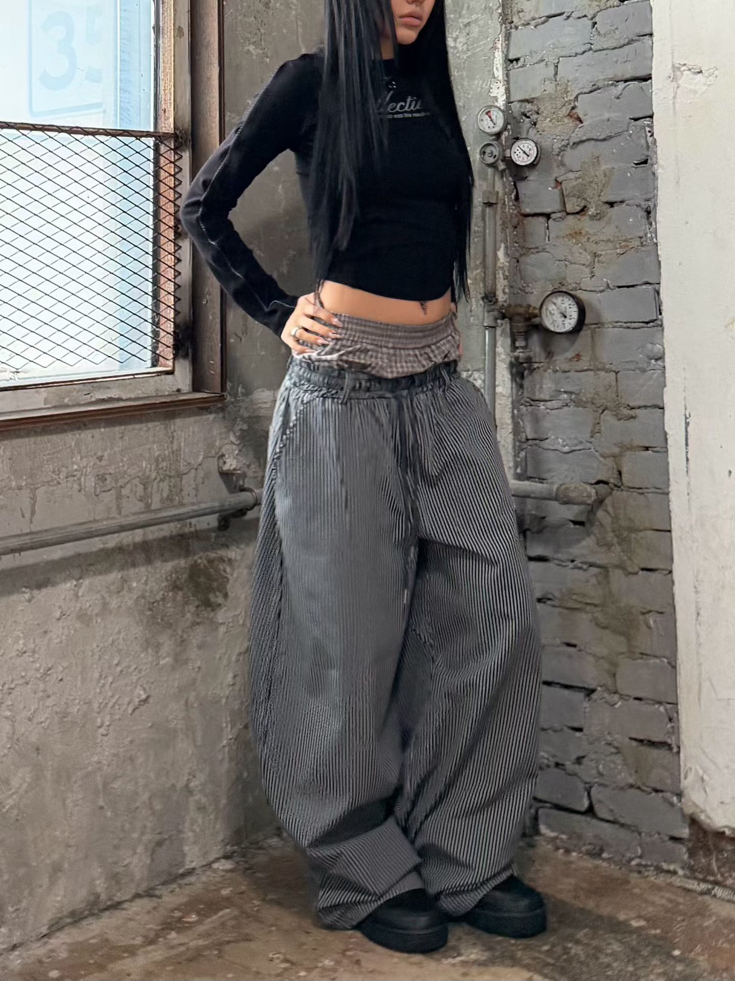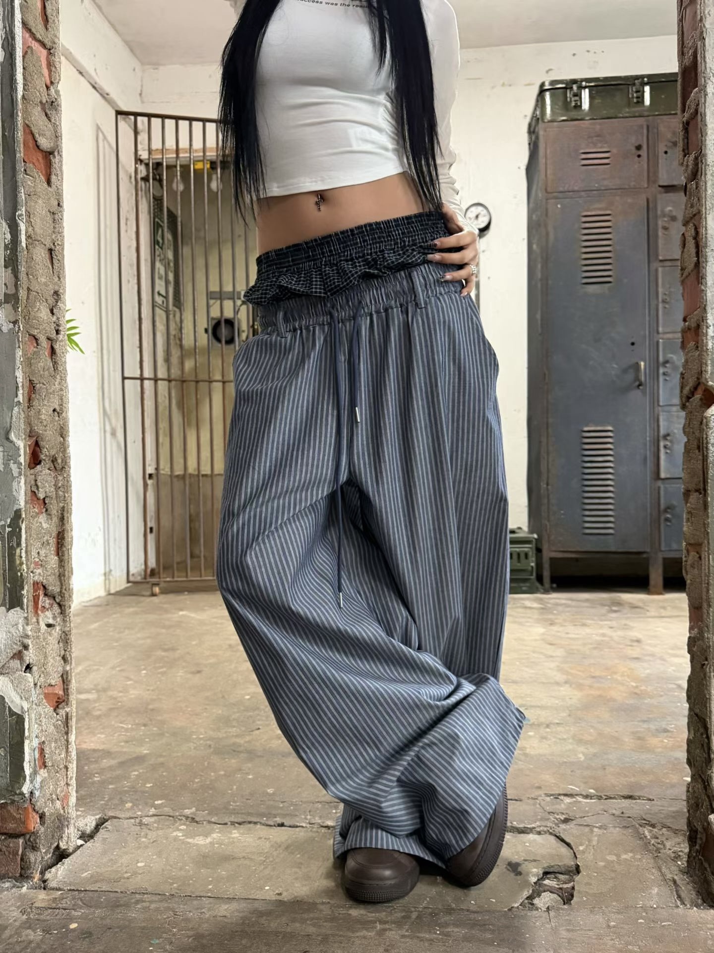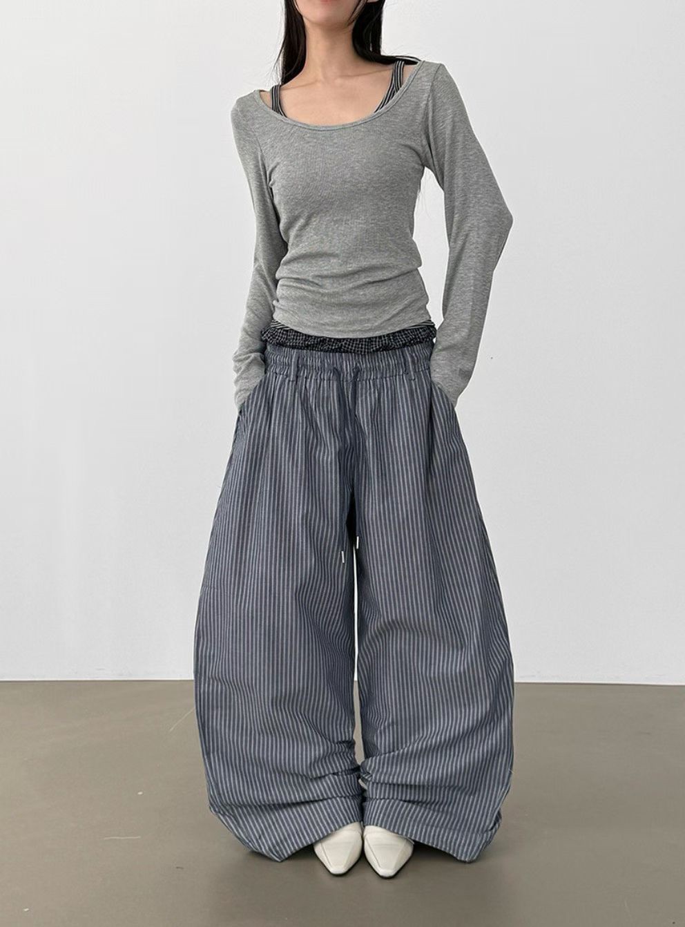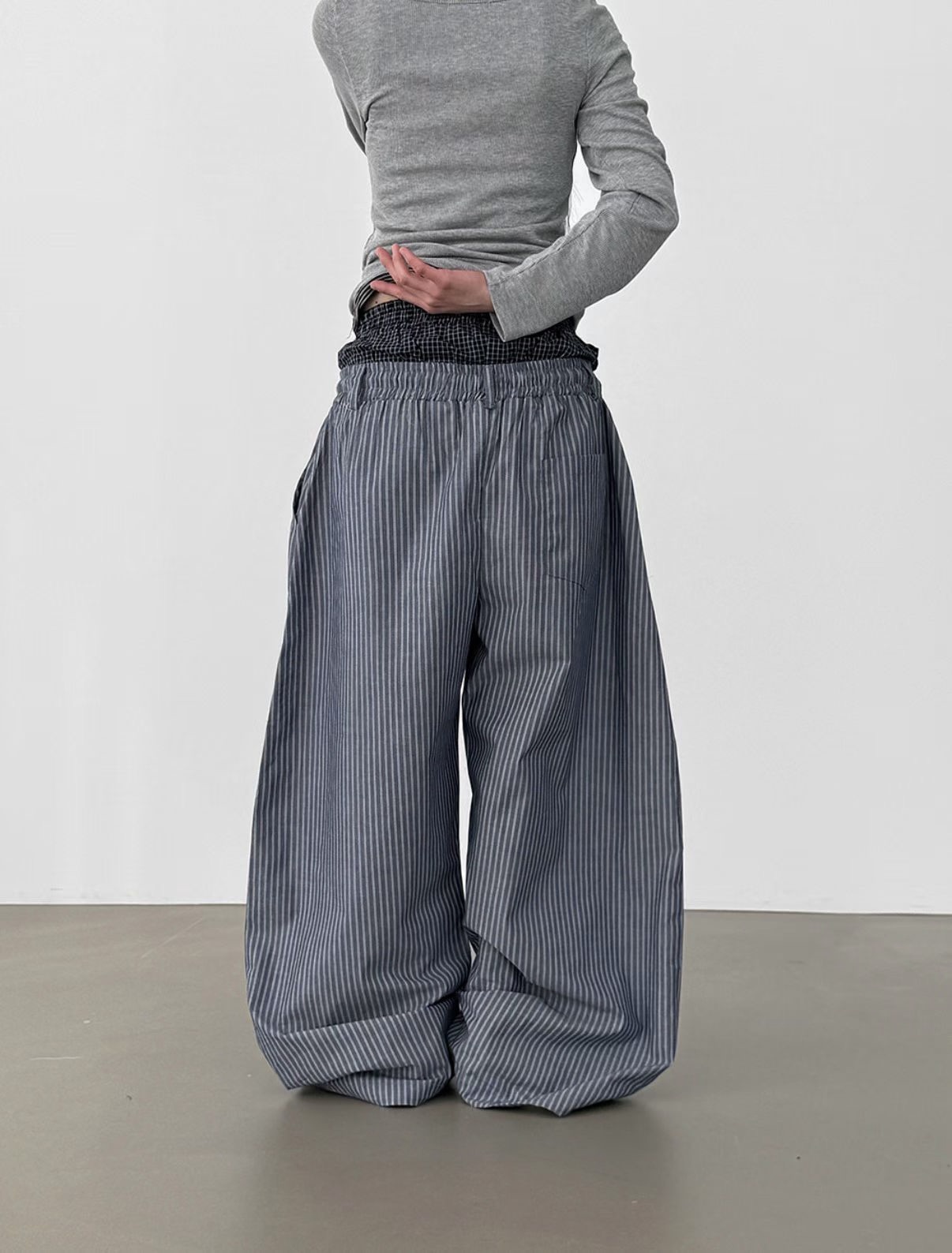 韓國 雙層 假兩件褲頭 設計感 條紋 滑面 涼感 抽繩 寬褲 長褲 (2color)