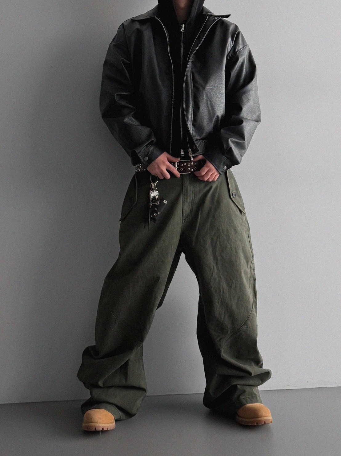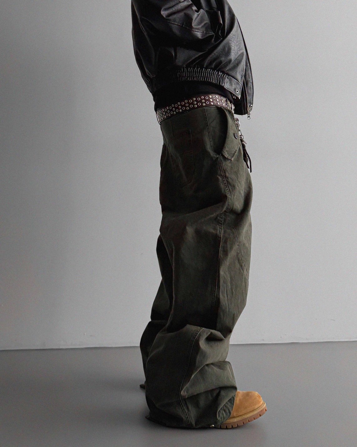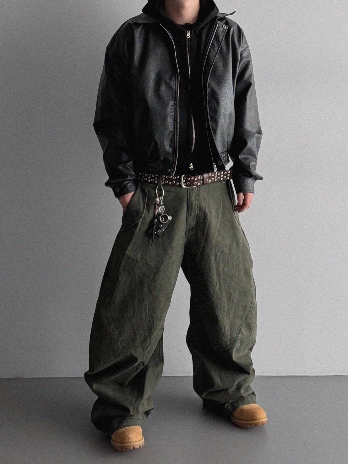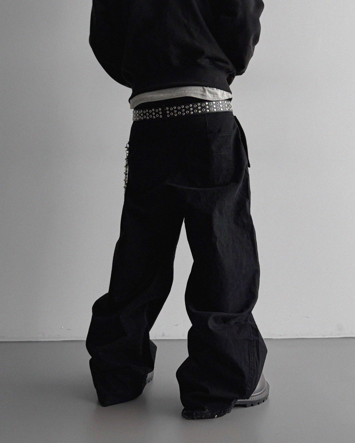 韓國 弧形 口袋 剪裁 設計 素色 堆積感 寬褲 長褲 (3color)
