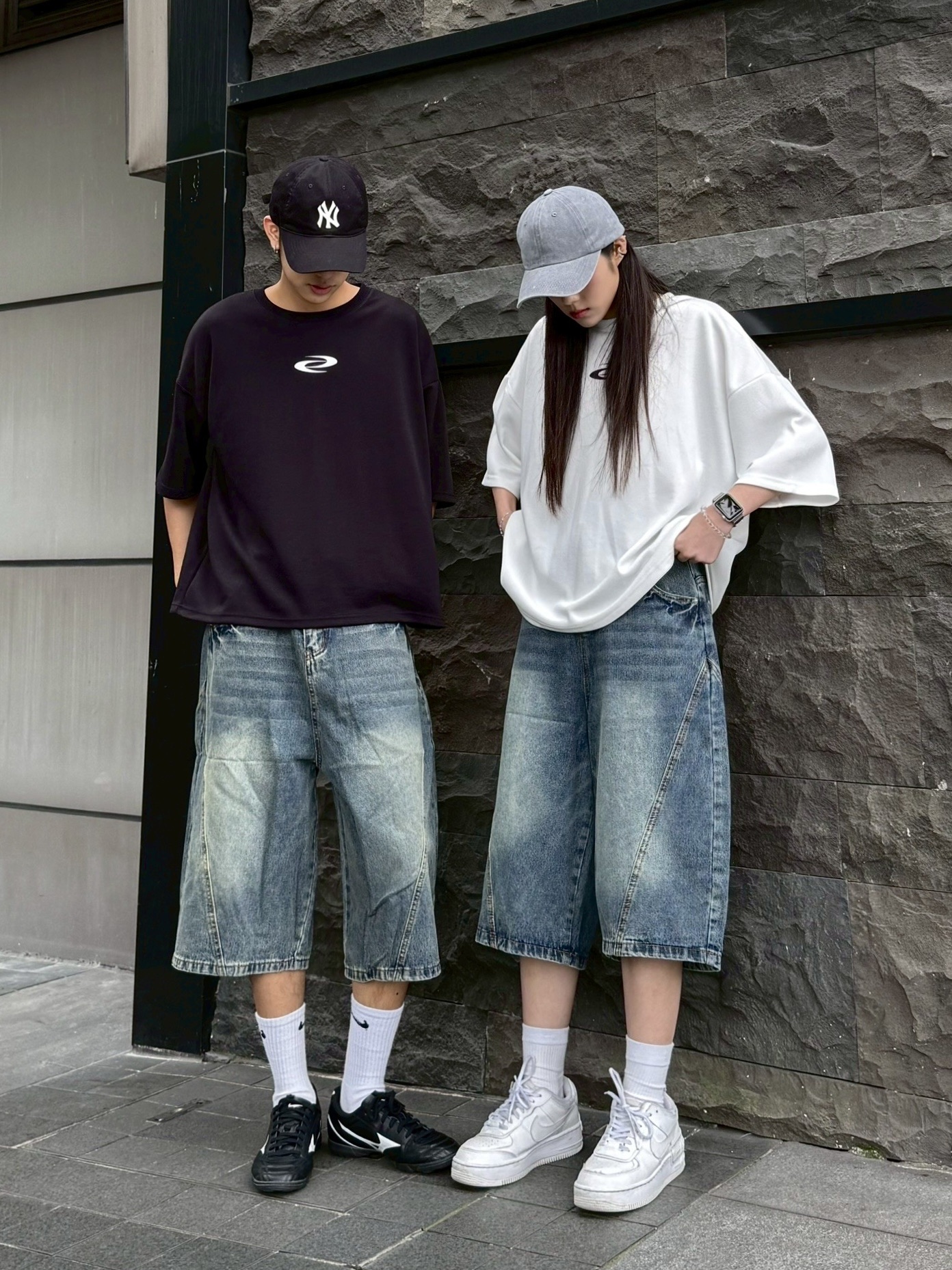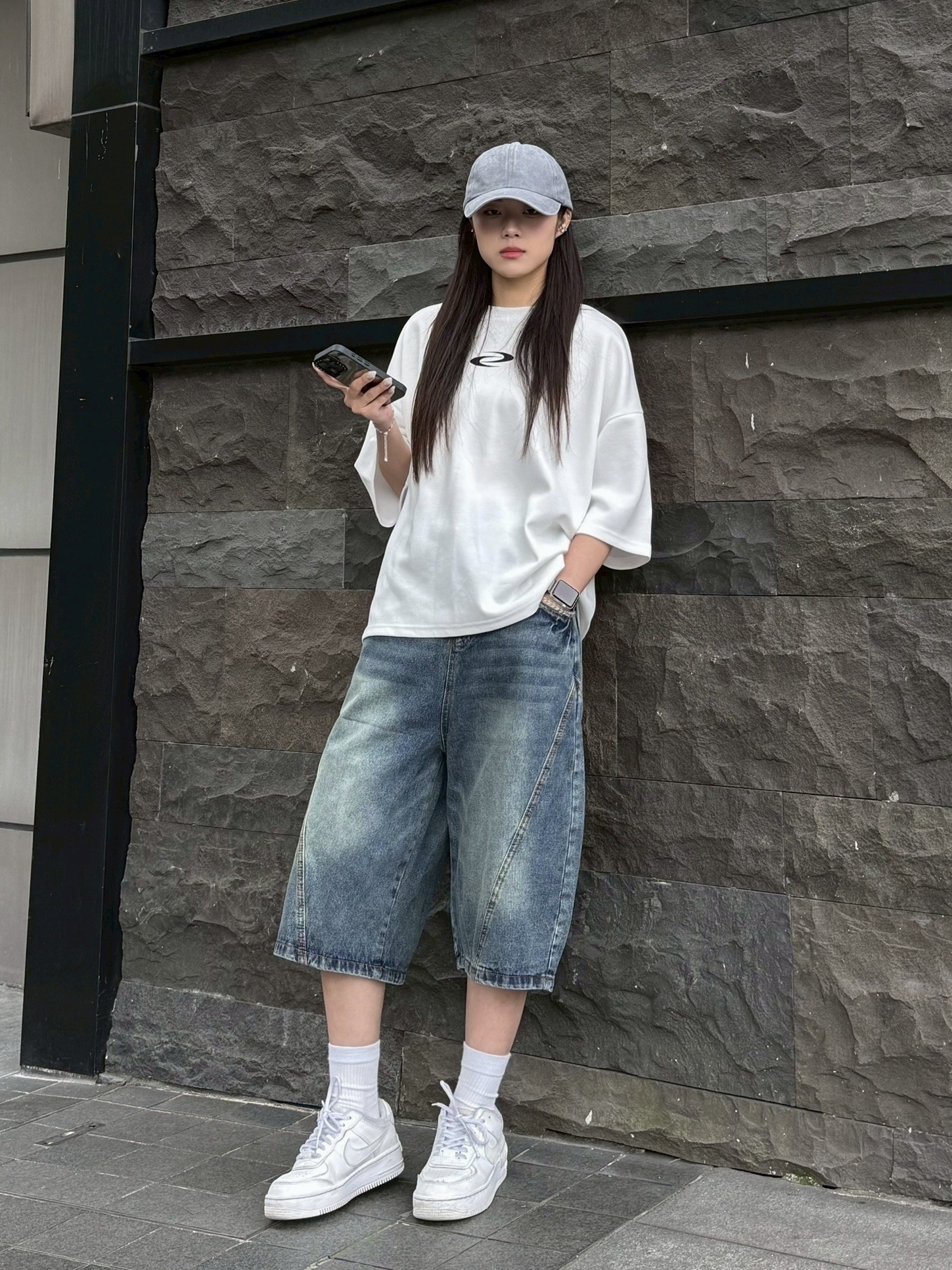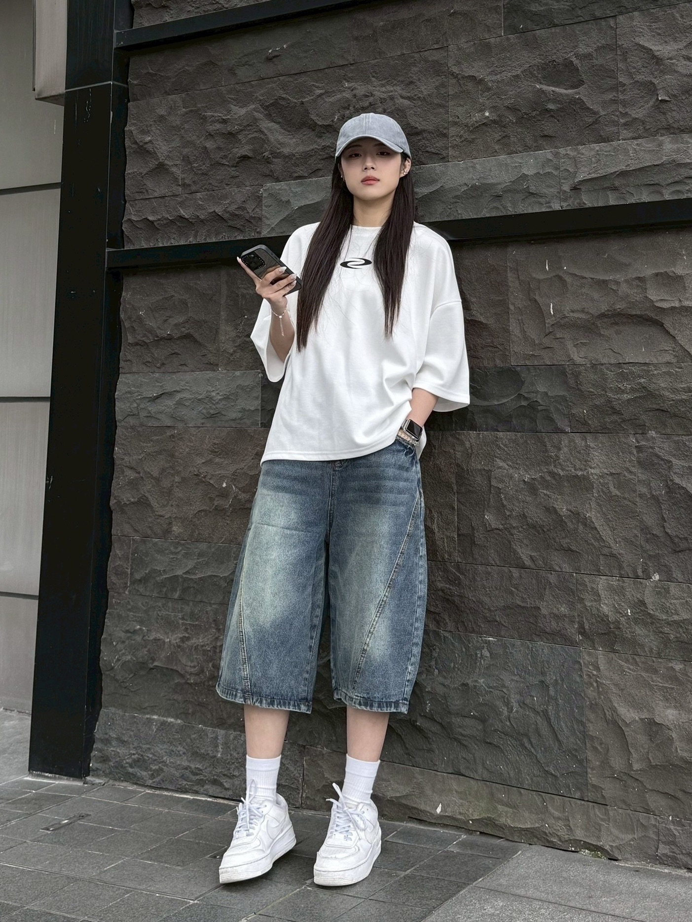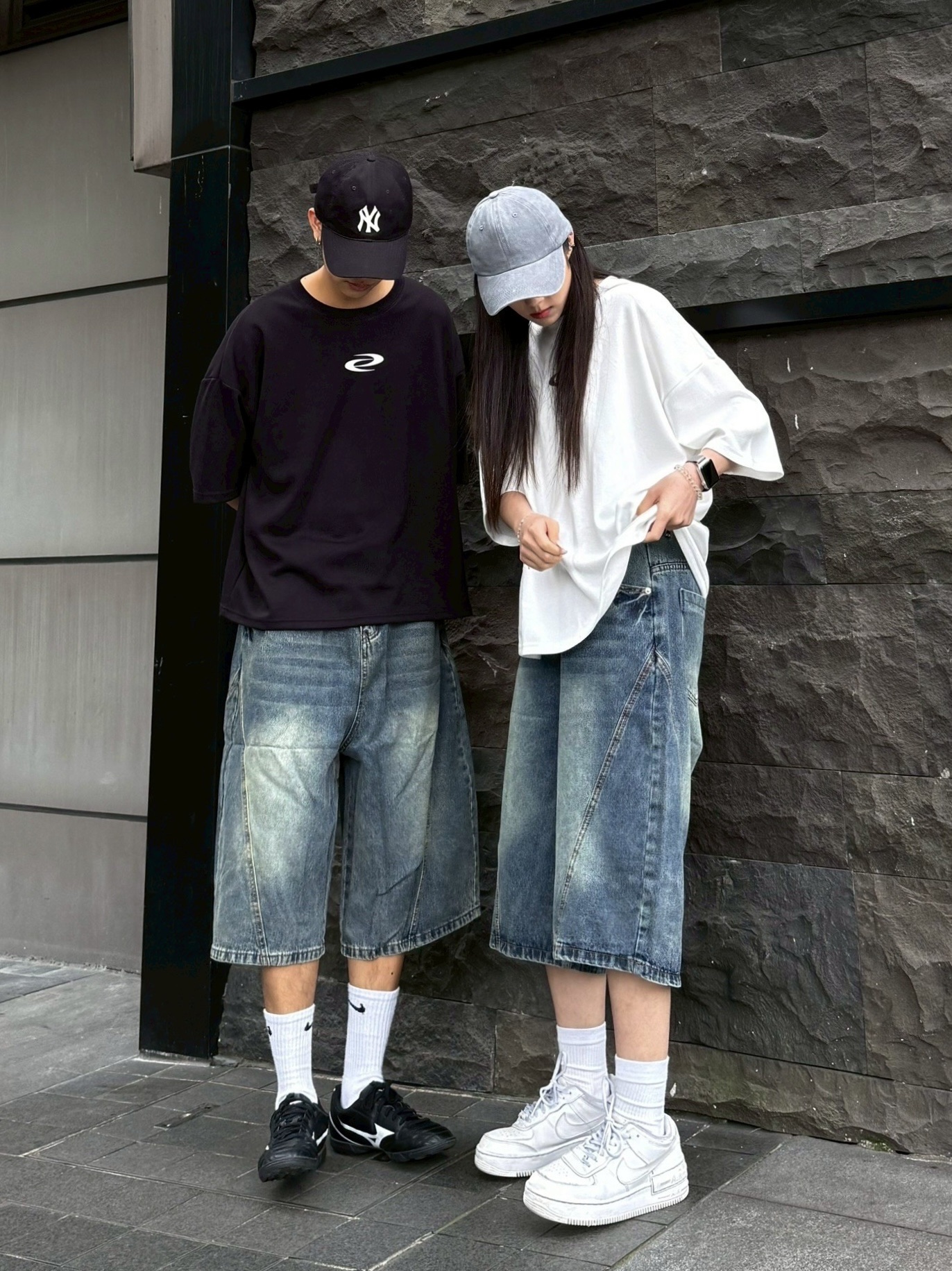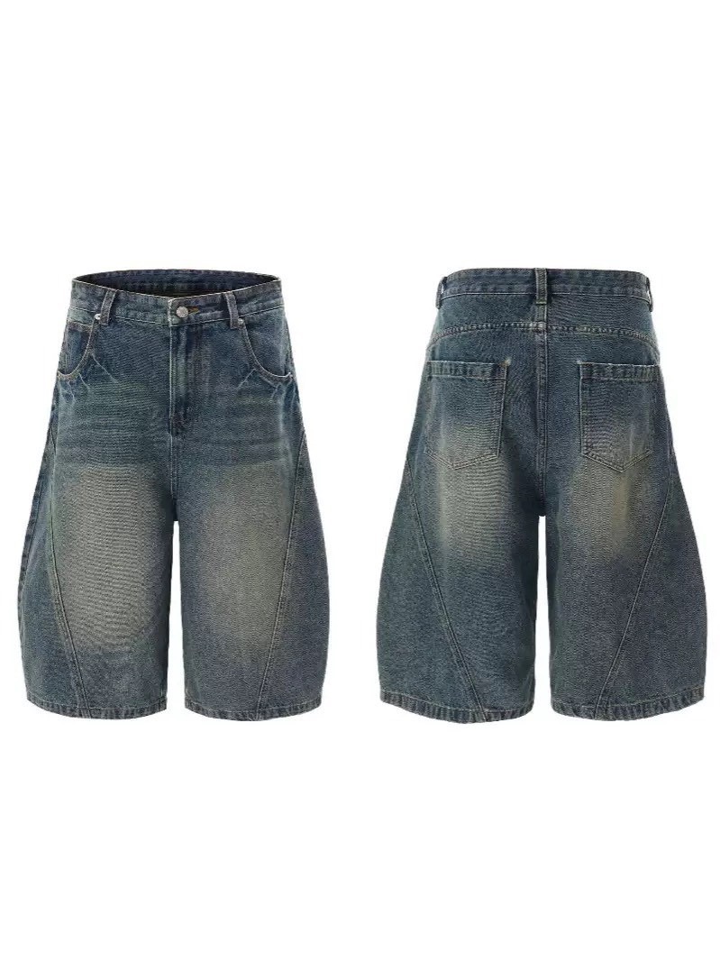 韓國 汙泥 裁片 設計 剪裁 水洗 六分 牛仔短褲 (藍)