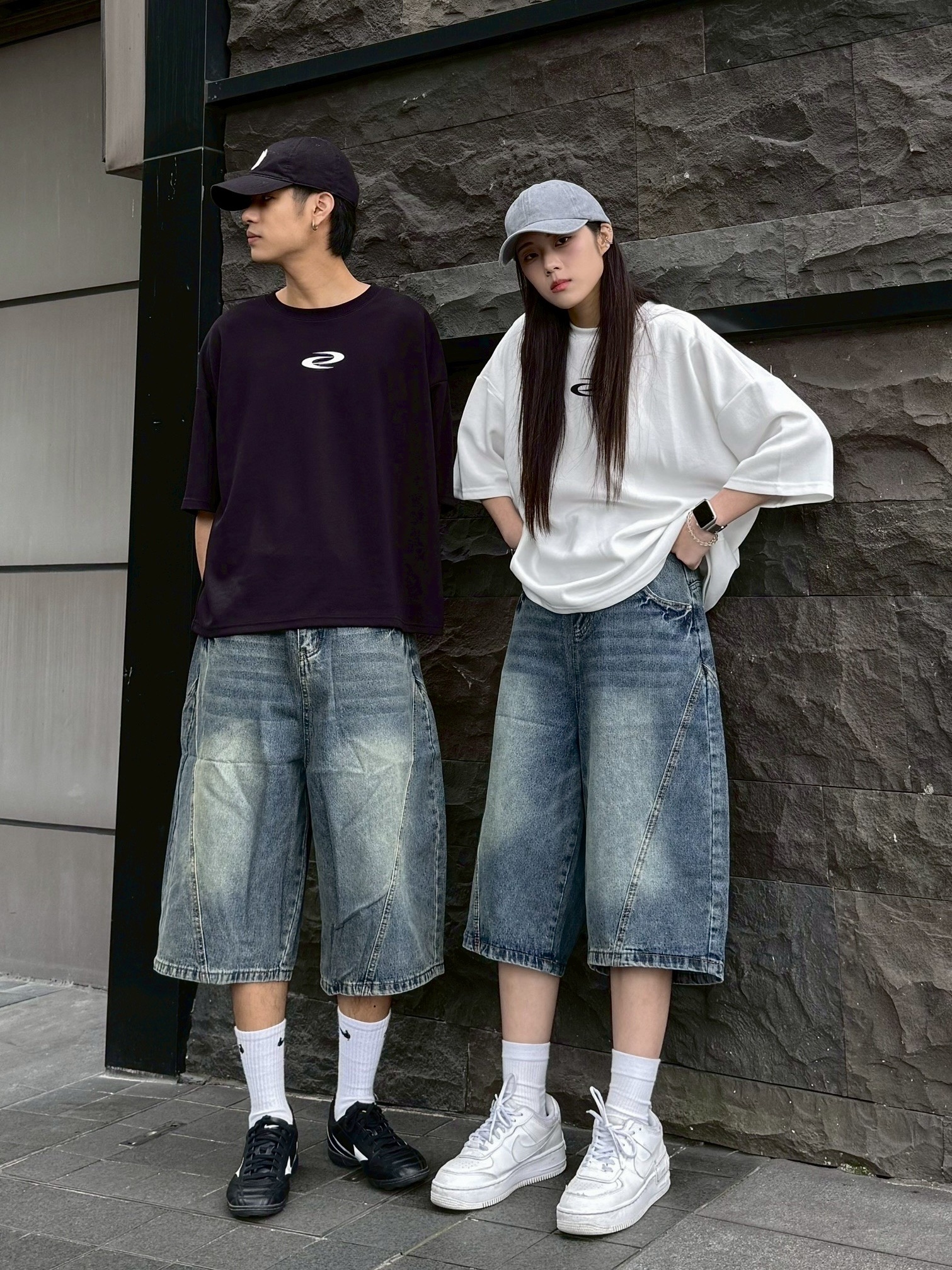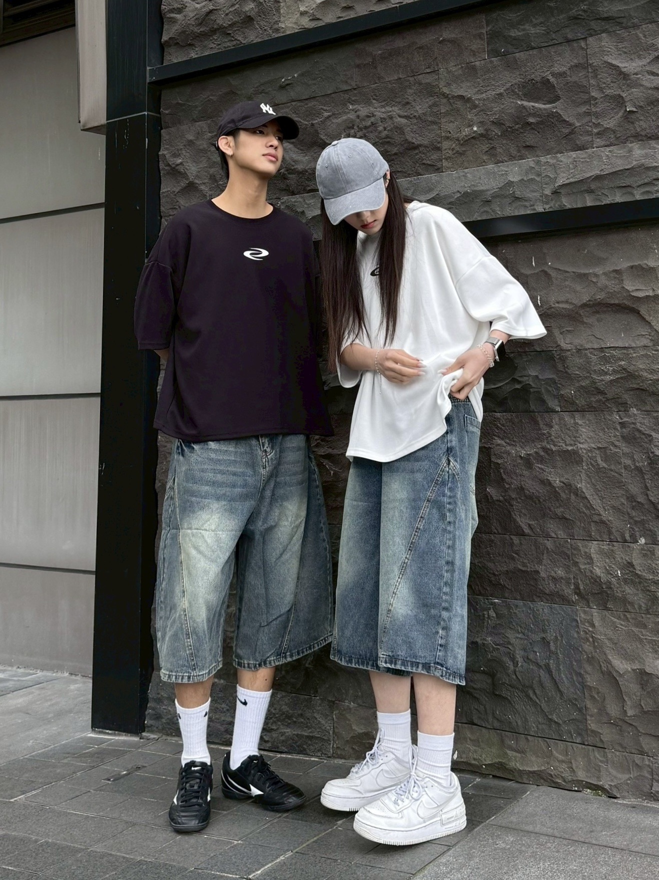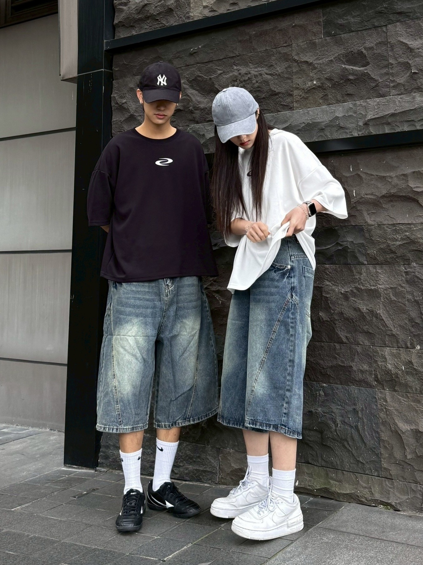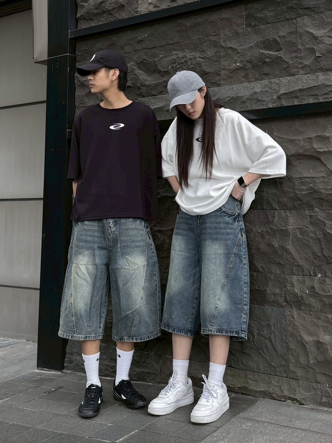 韓國 汙泥 裁片 設計 剪裁 水洗 六分 牛仔短褲 (藍)
