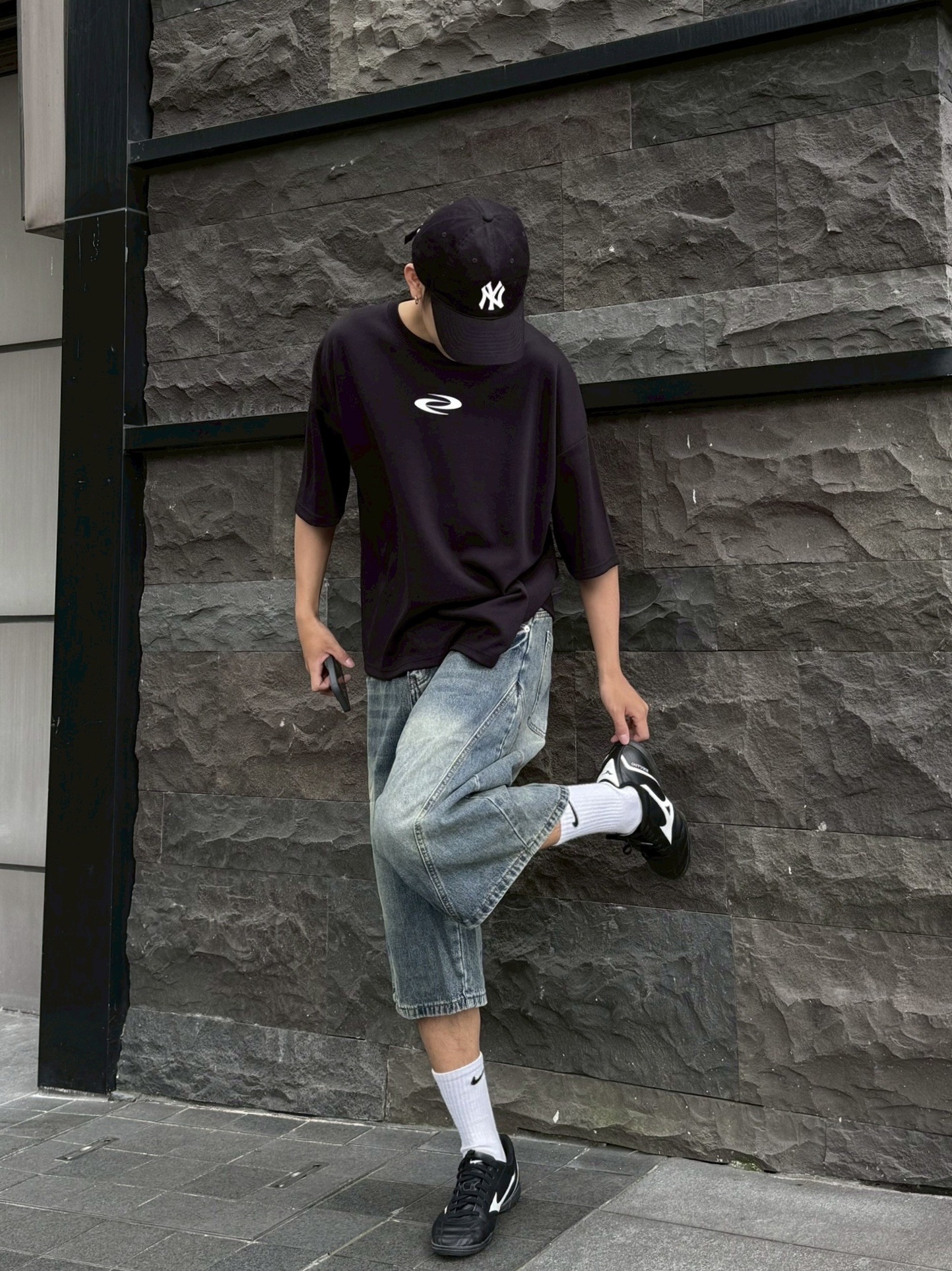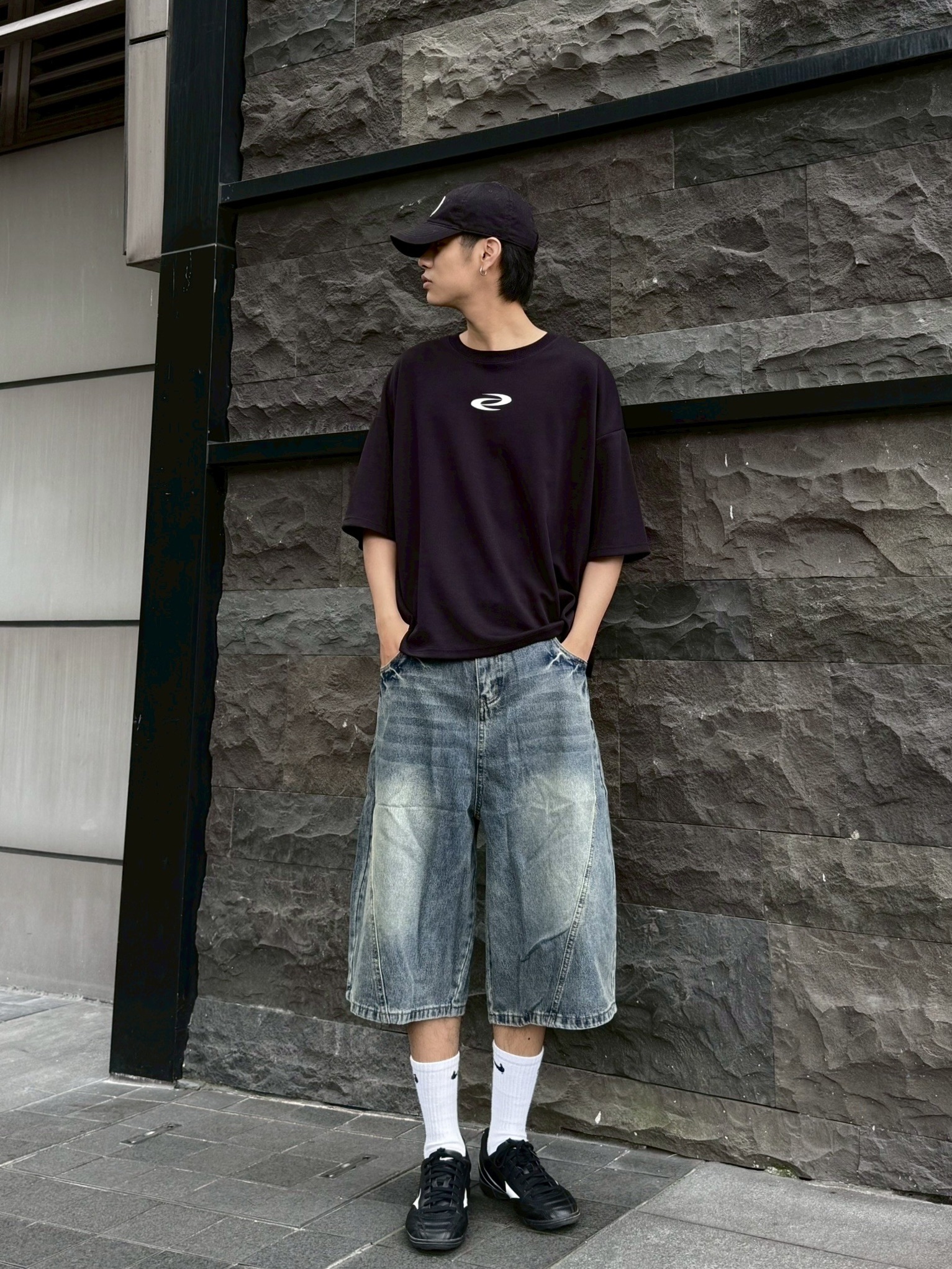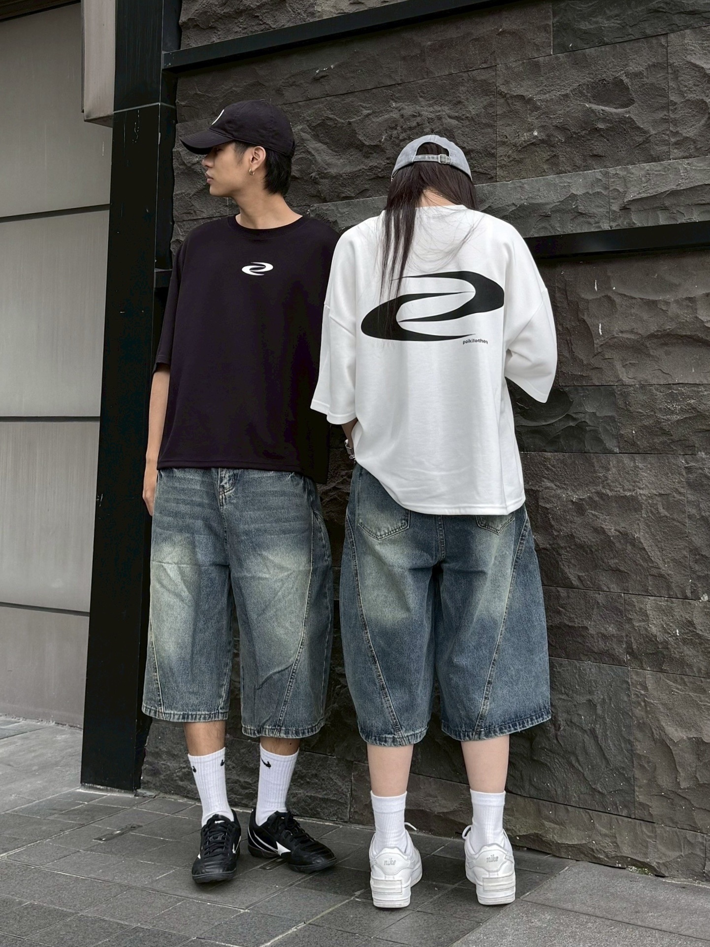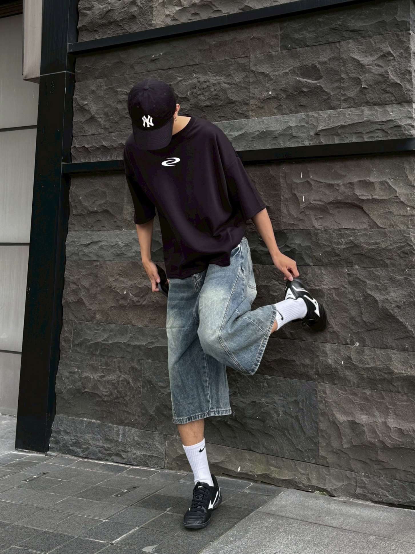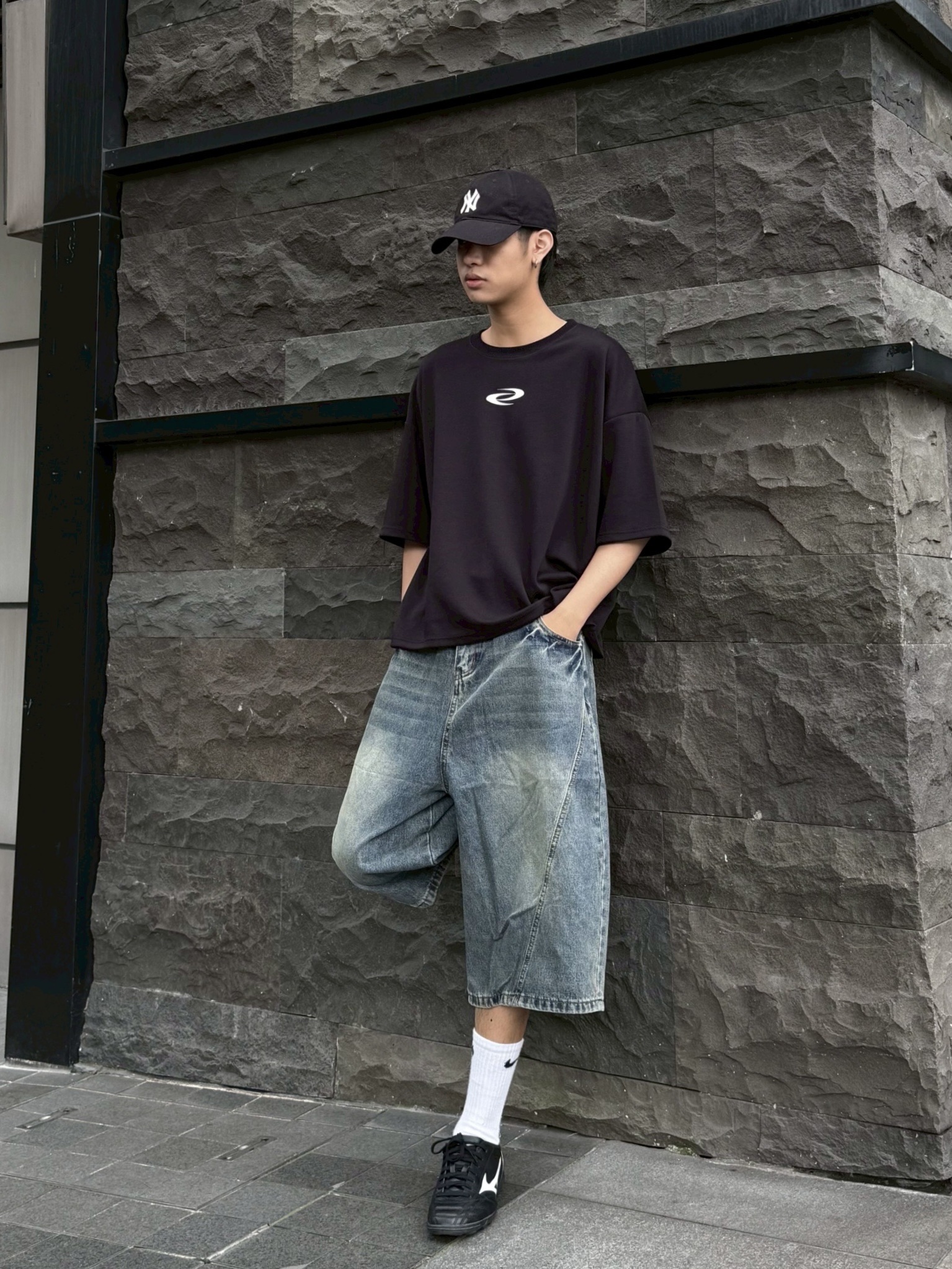 韓國 汙泥 裁片 設計 剪裁 水洗 六分 牛仔短褲 (藍)