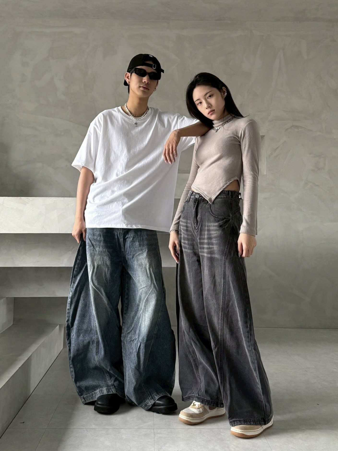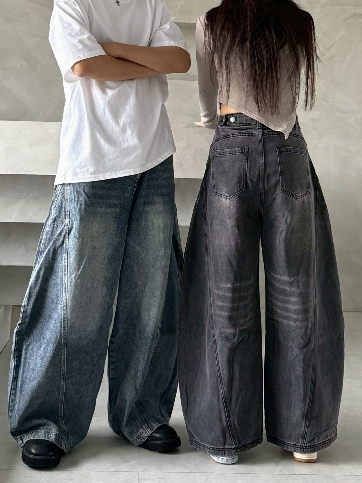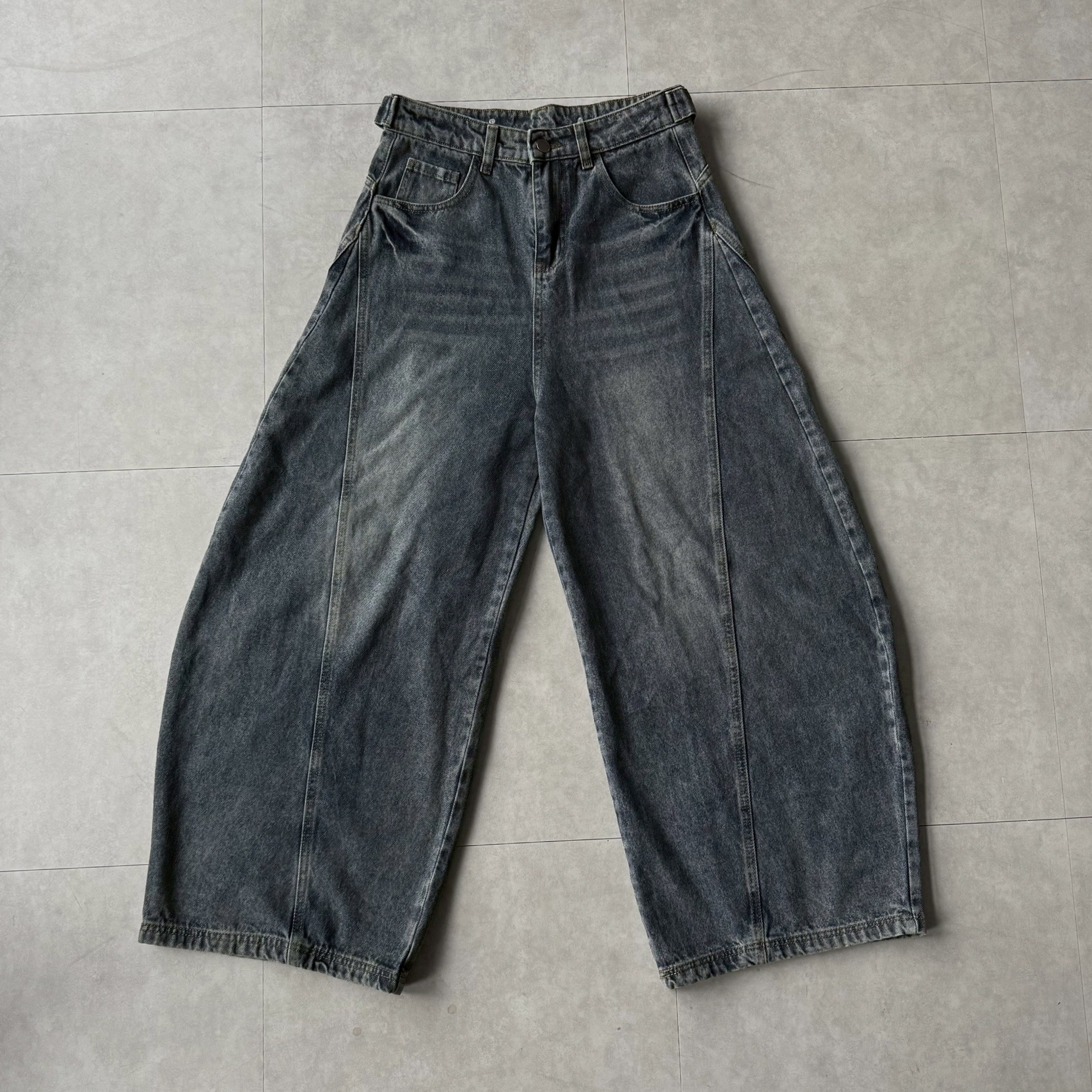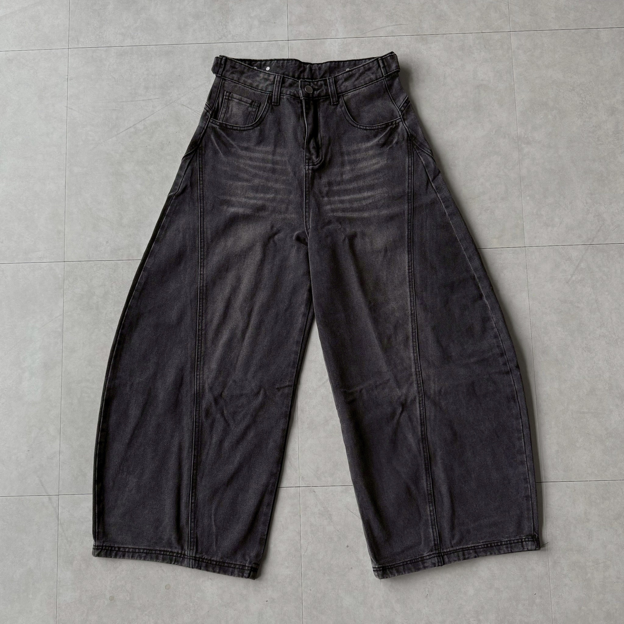 韓國 後排扣 裁片 剪裁 設計 水洗 寬版 彎刀 寬褲 牛仔褲 (2color)