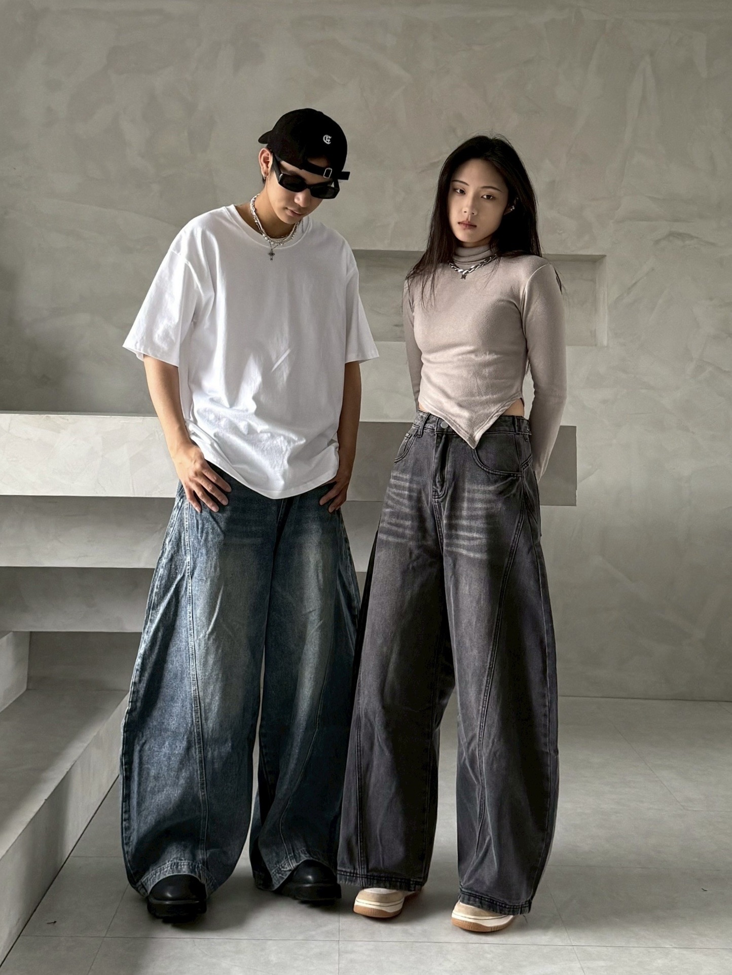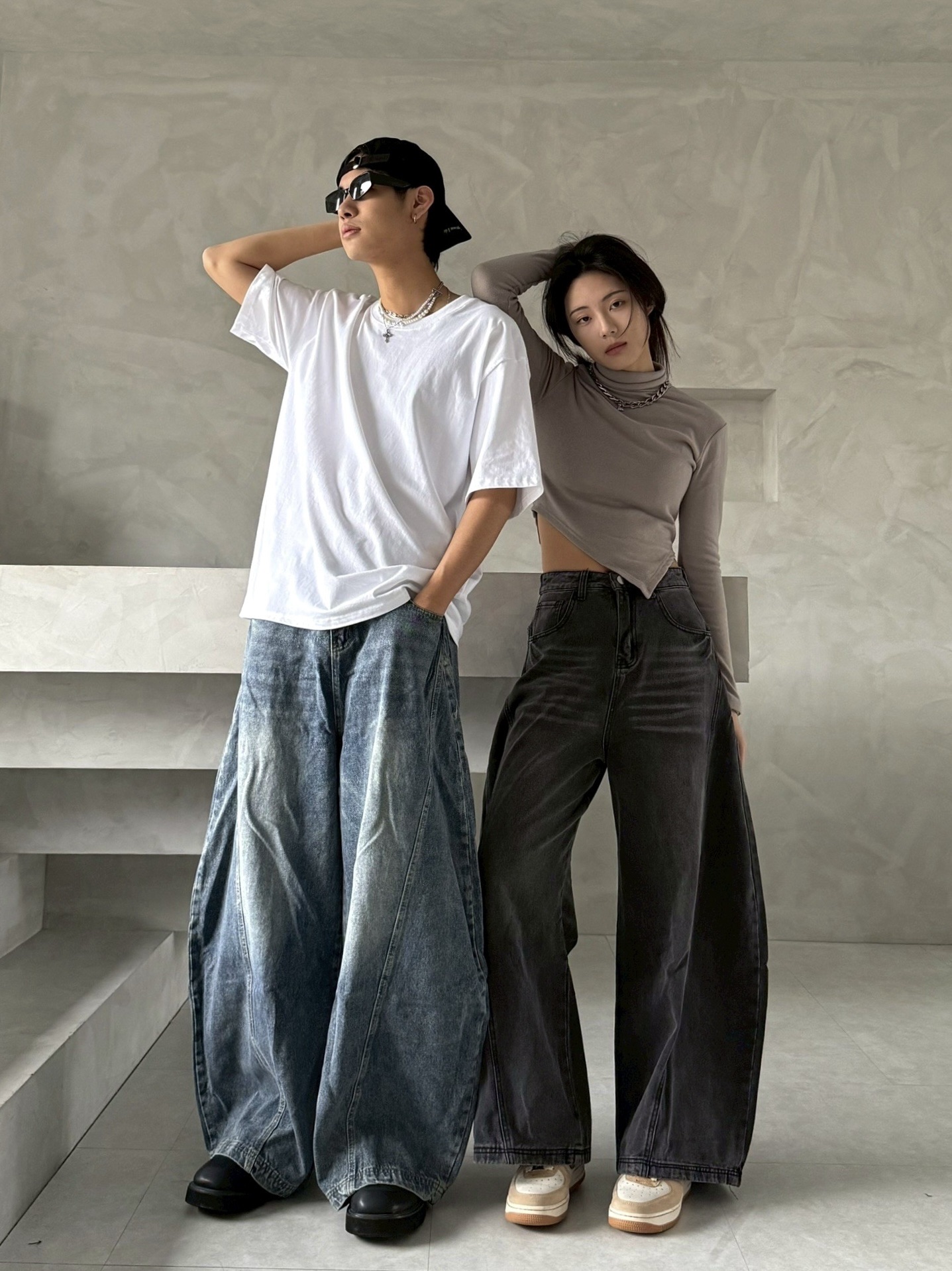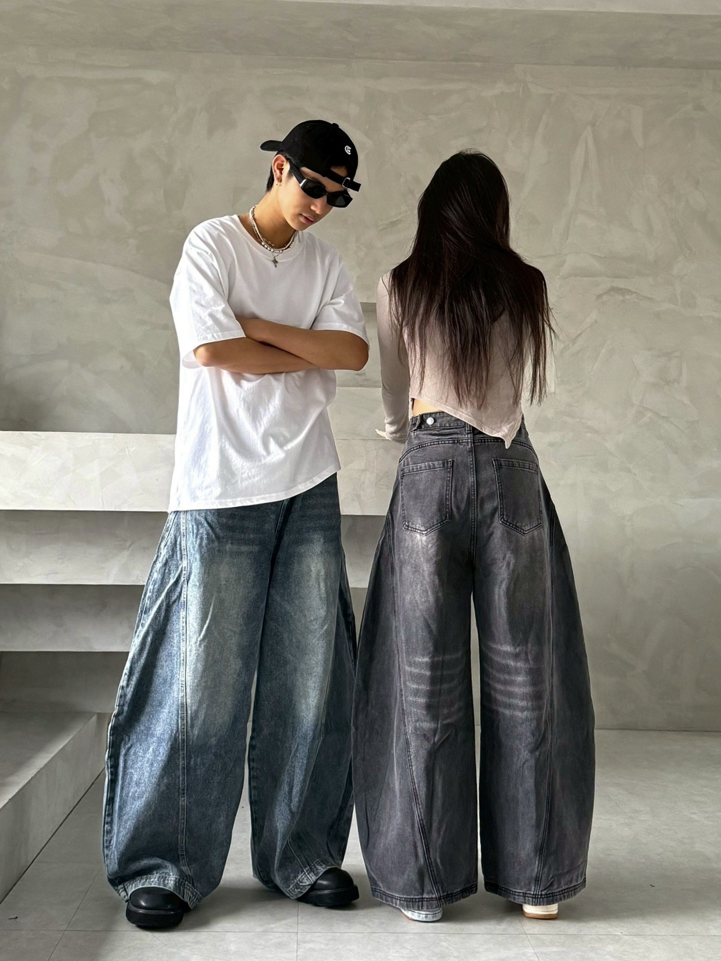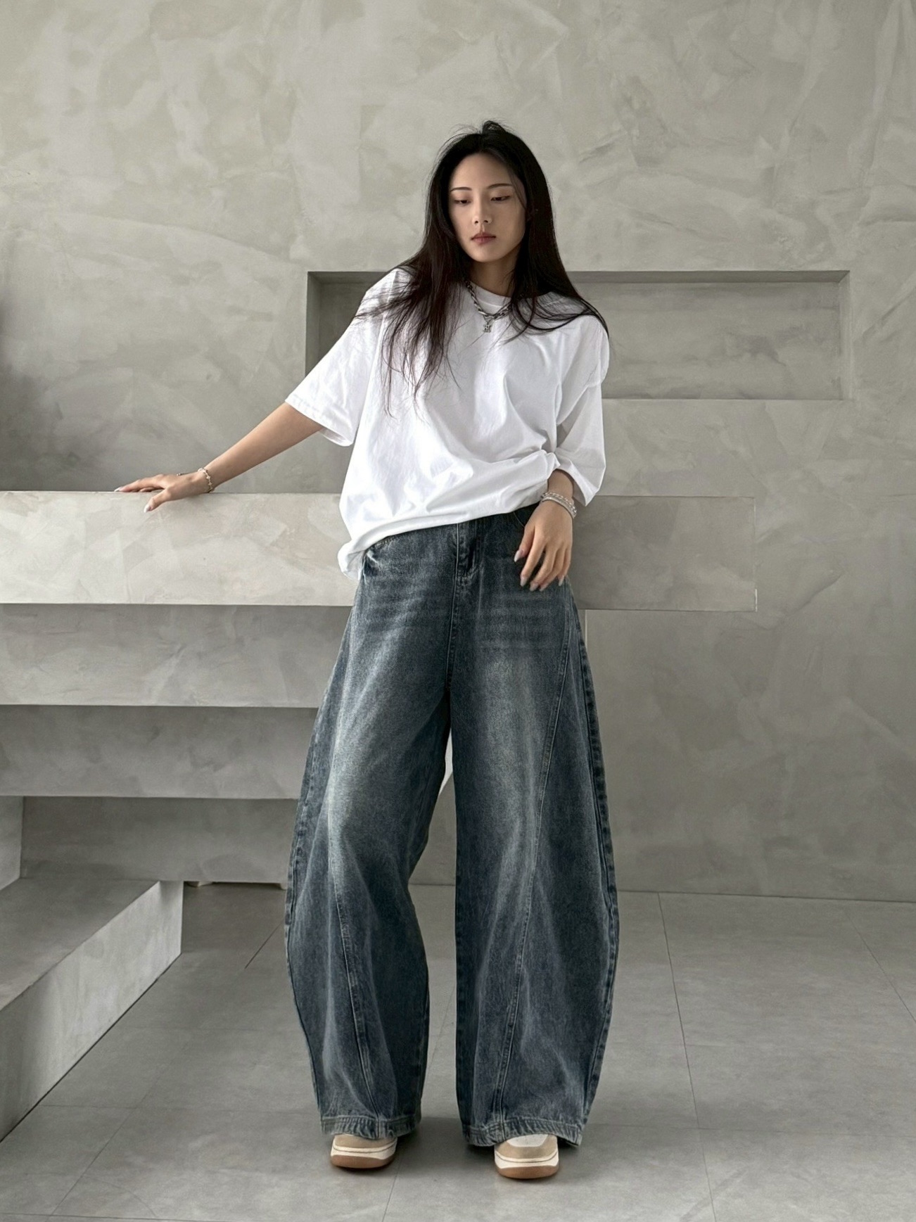 韓國 後排扣 裁片 剪裁 設計 水洗 寬版 彎刀 寬褲 牛仔褲 (2color)