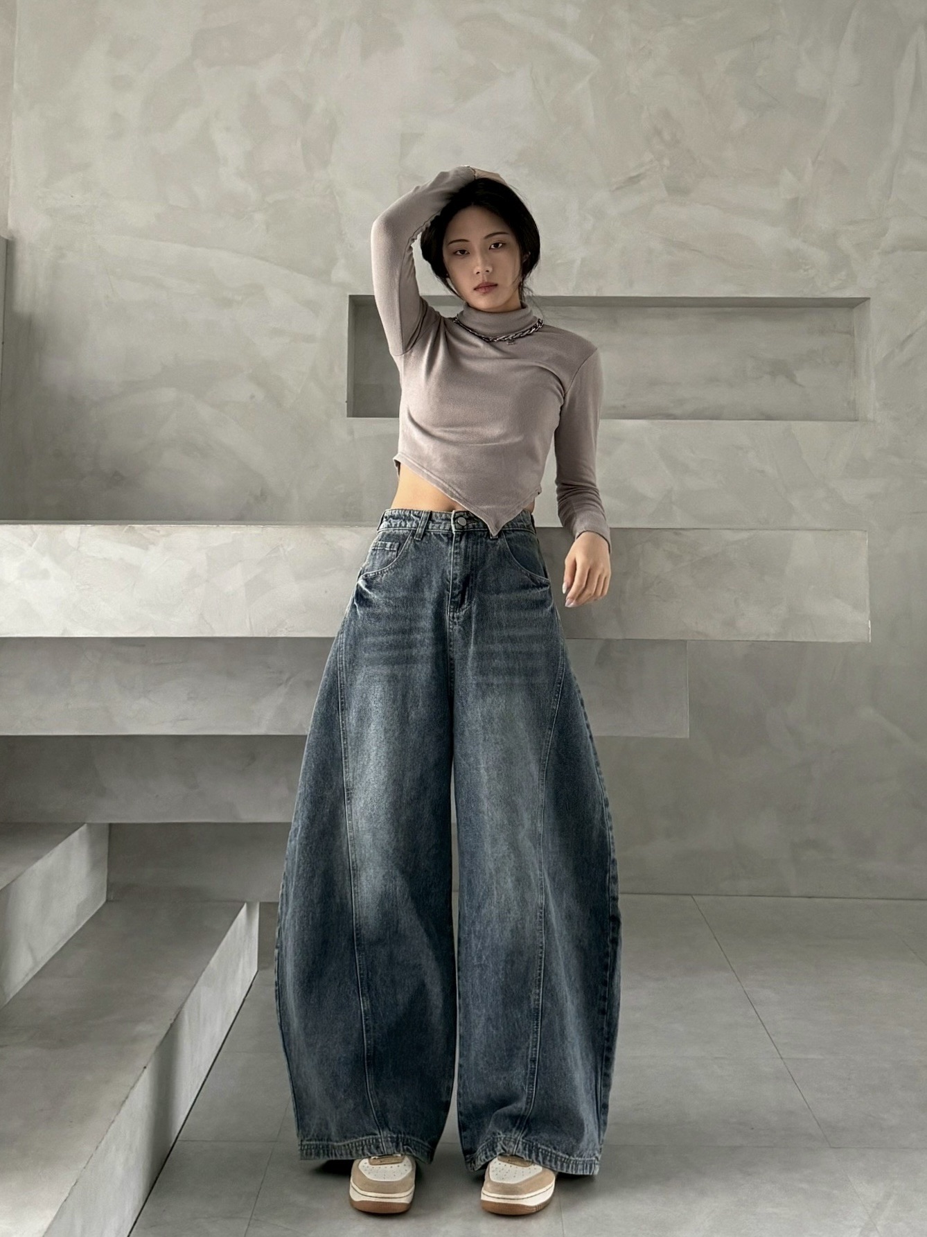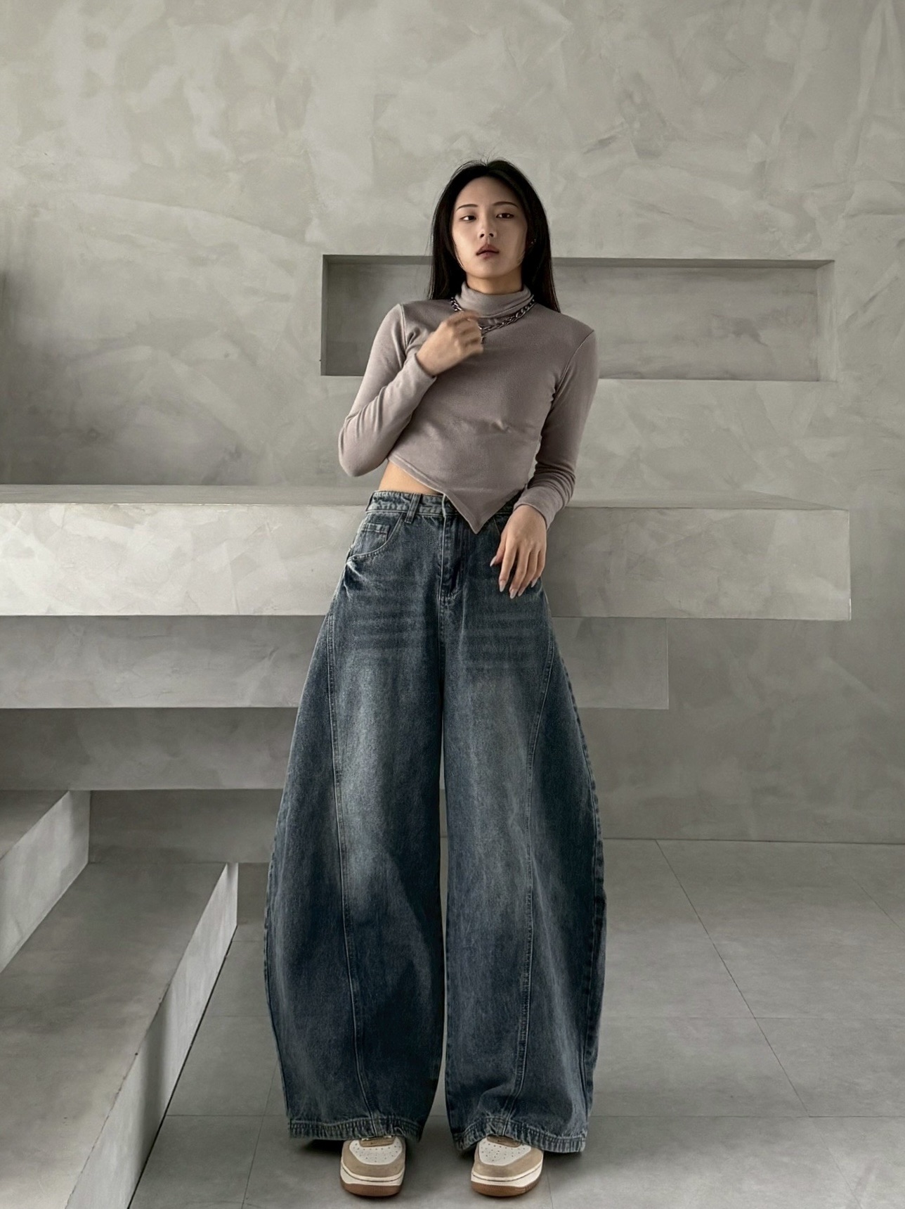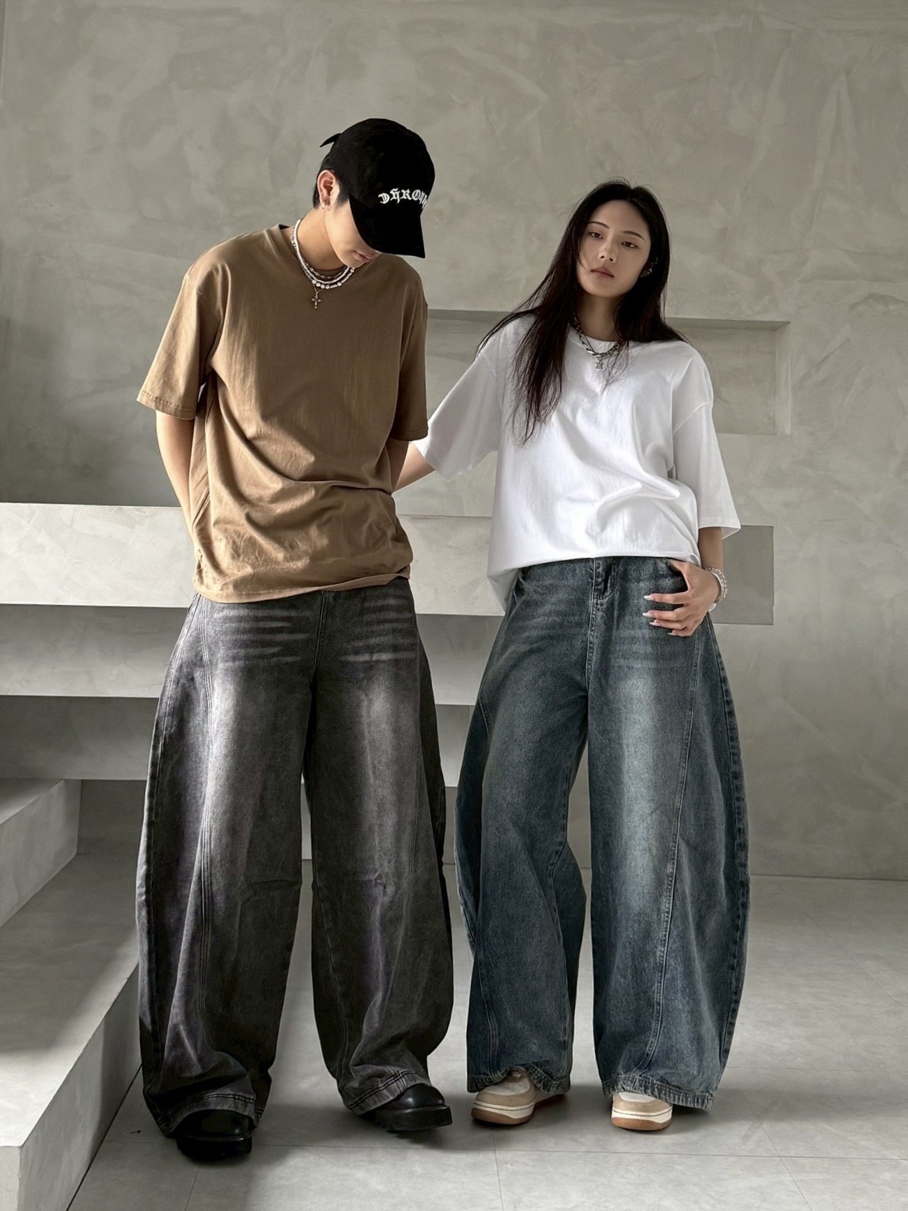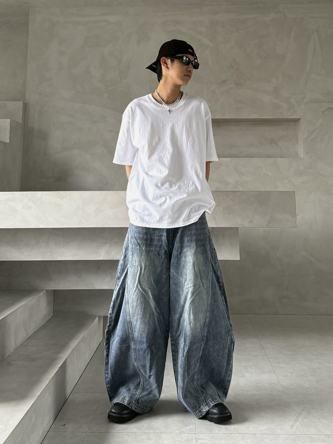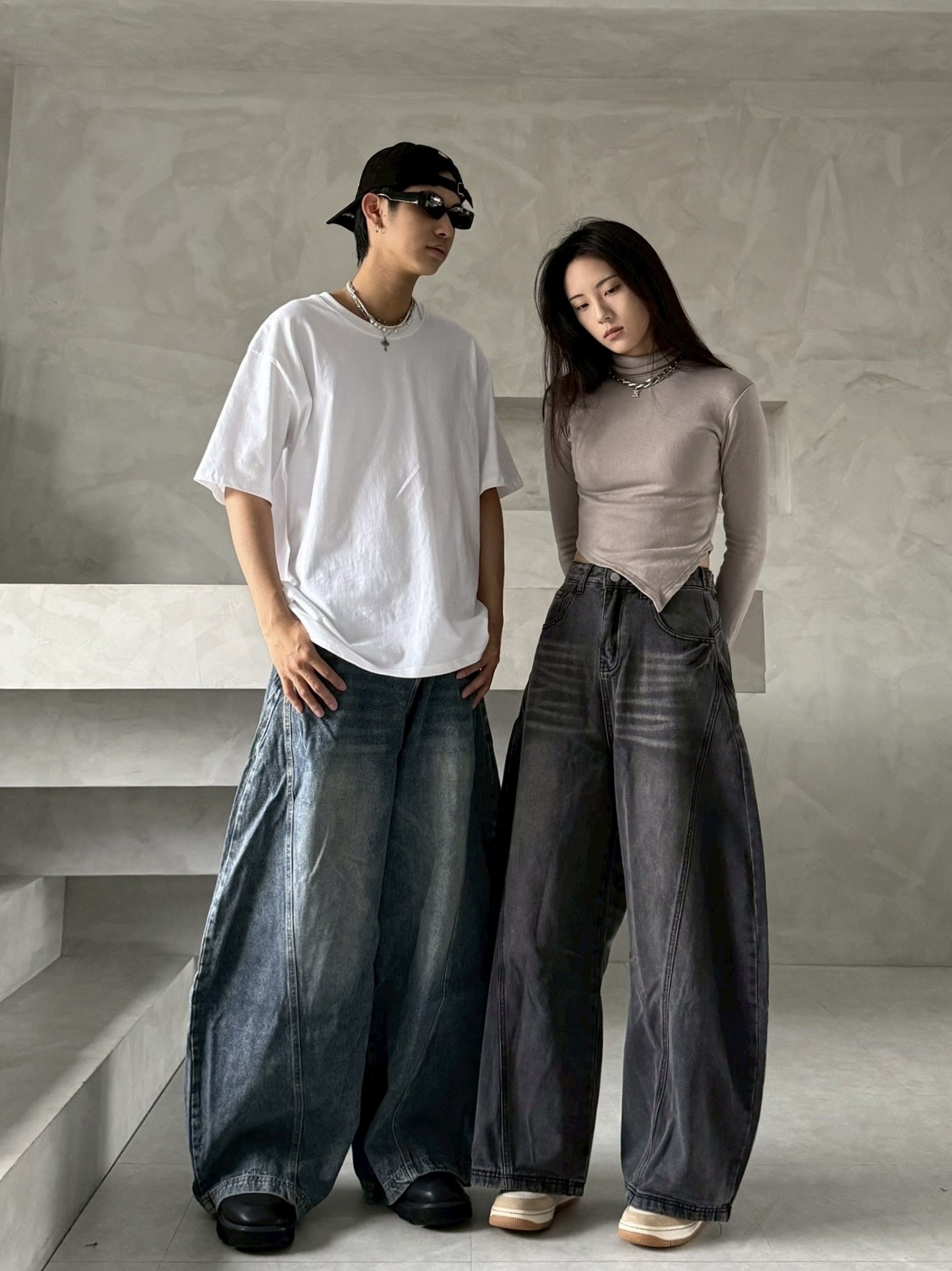 韓國 後排扣 裁片 剪裁 設計 水洗 寬版 彎刀 寬褲 牛仔褲 (2color)