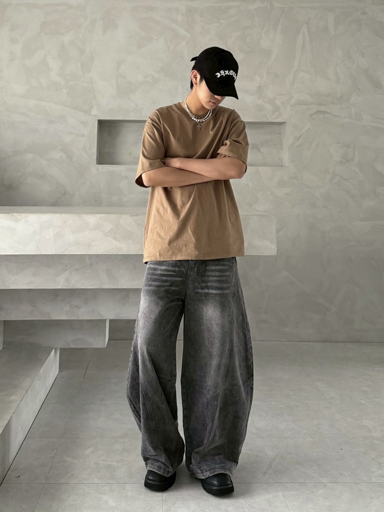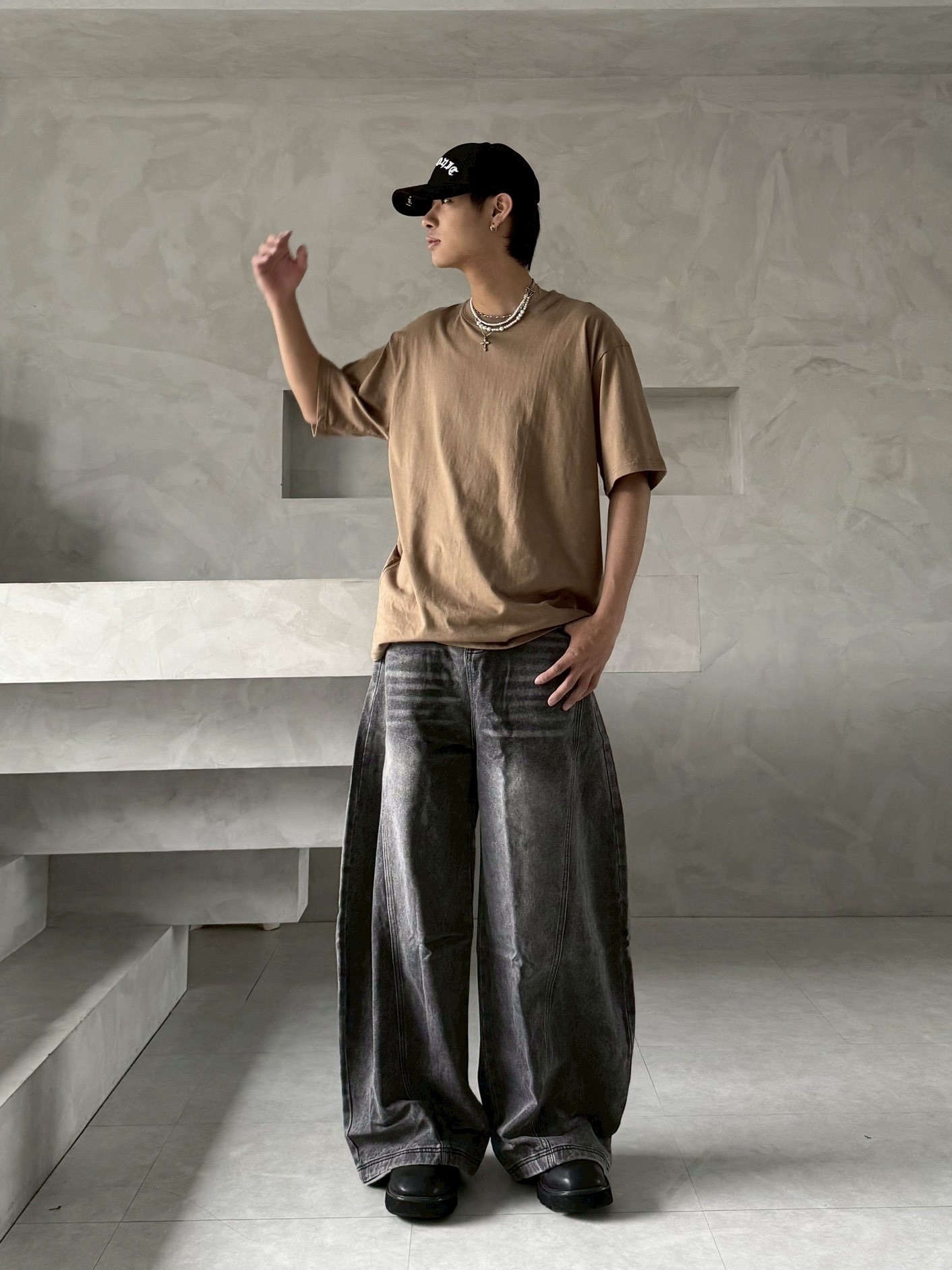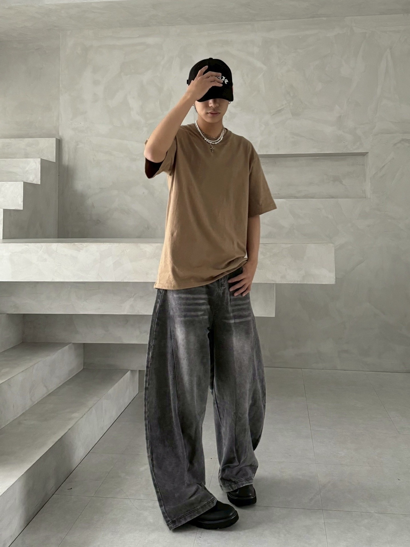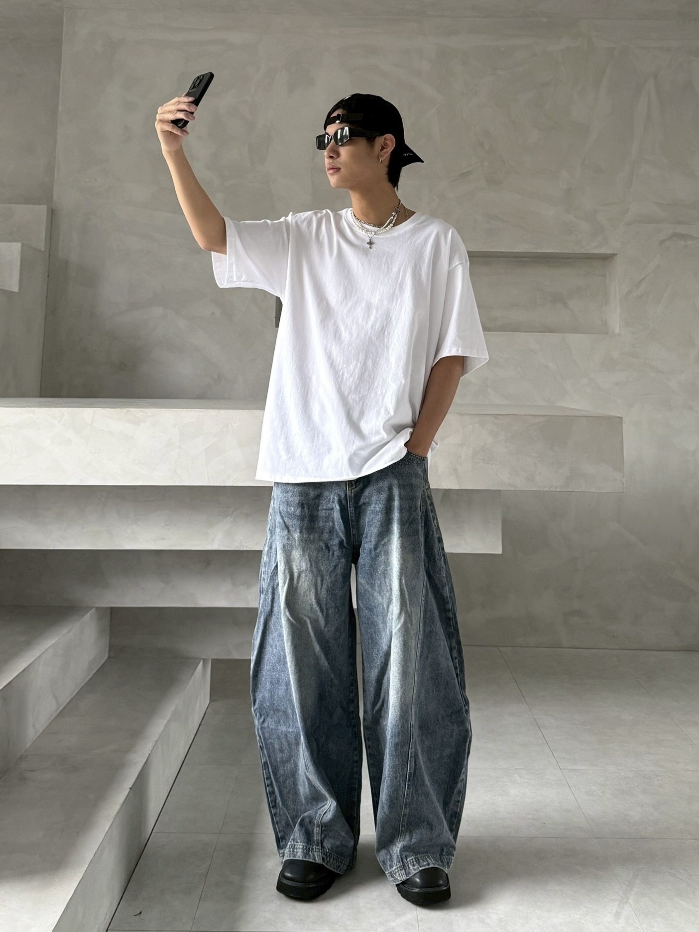 韓國 後排扣 裁片 剪裁 設計 水洗 寬版 彎刀 寬褲 牛仔褲 (2color)