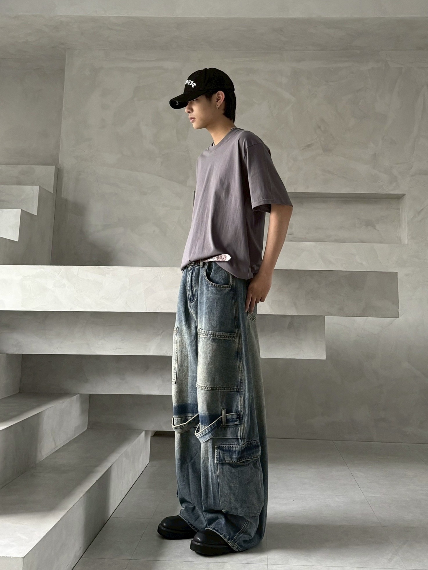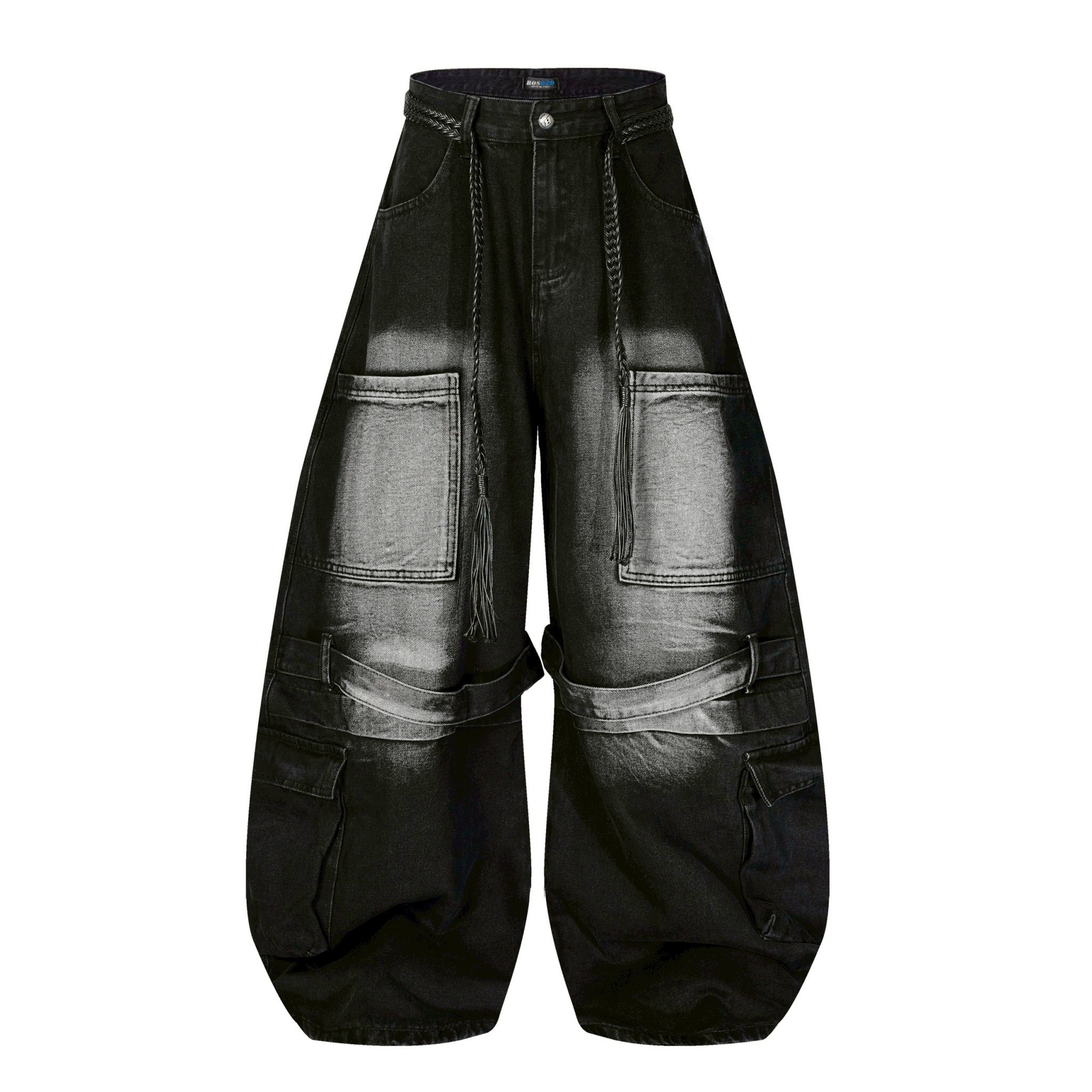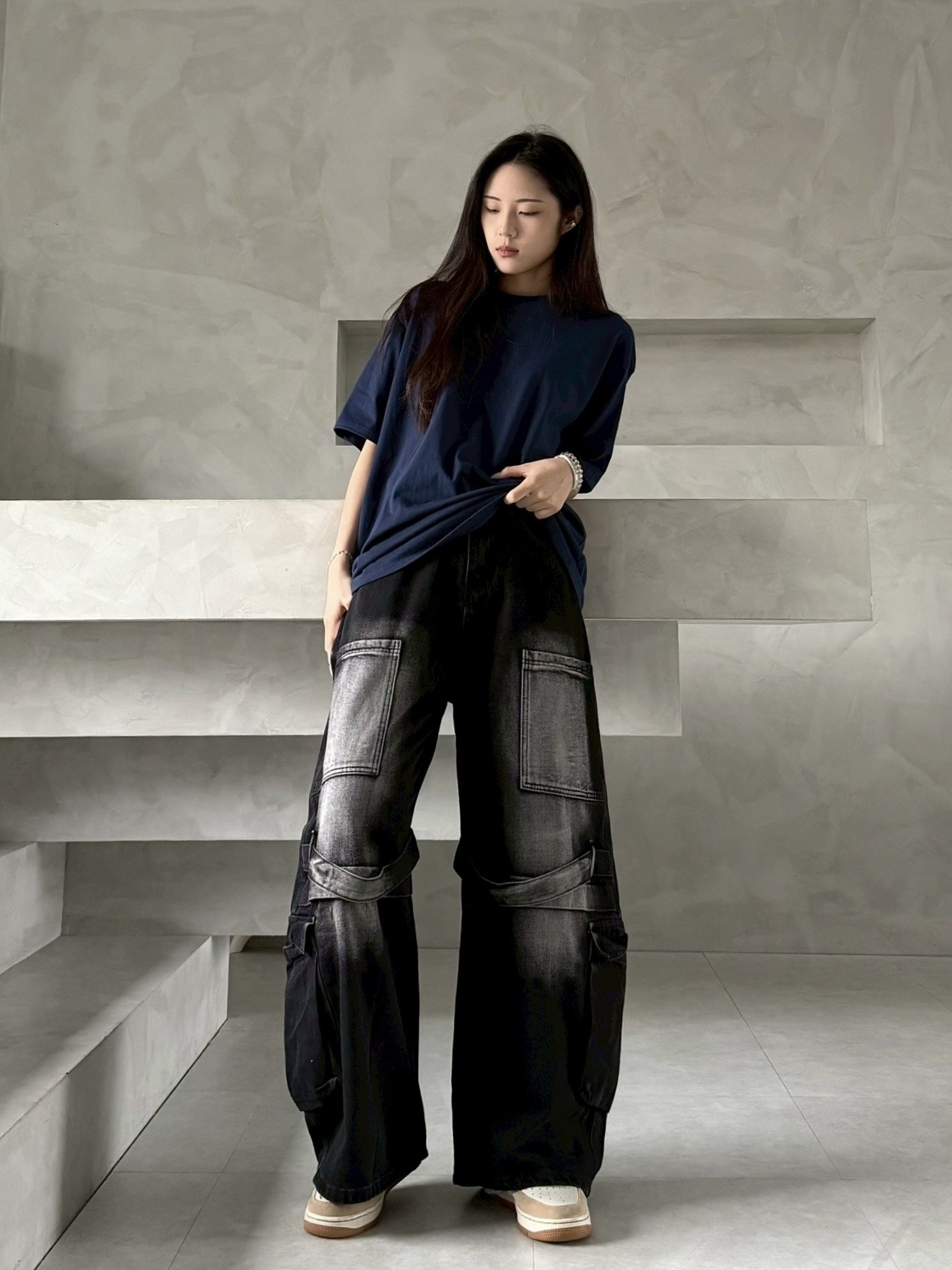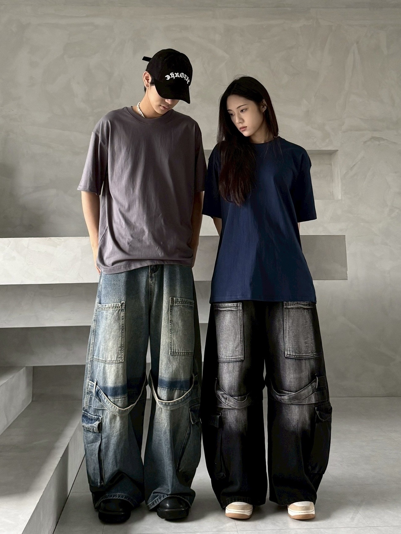 韓國 皮帶條 飄帶 設計感 重磅 多口袋 水洗 刷色 落地感 寬褲 牛仔褲 (2color)