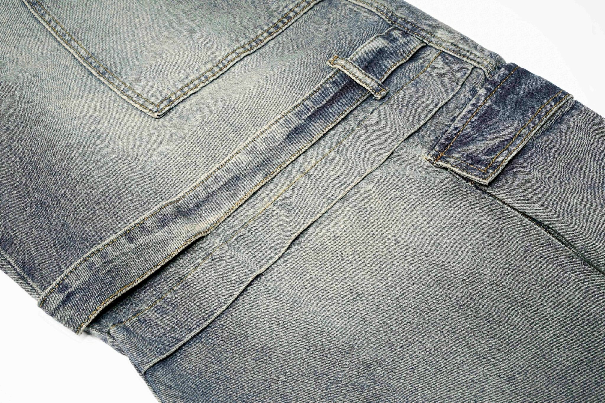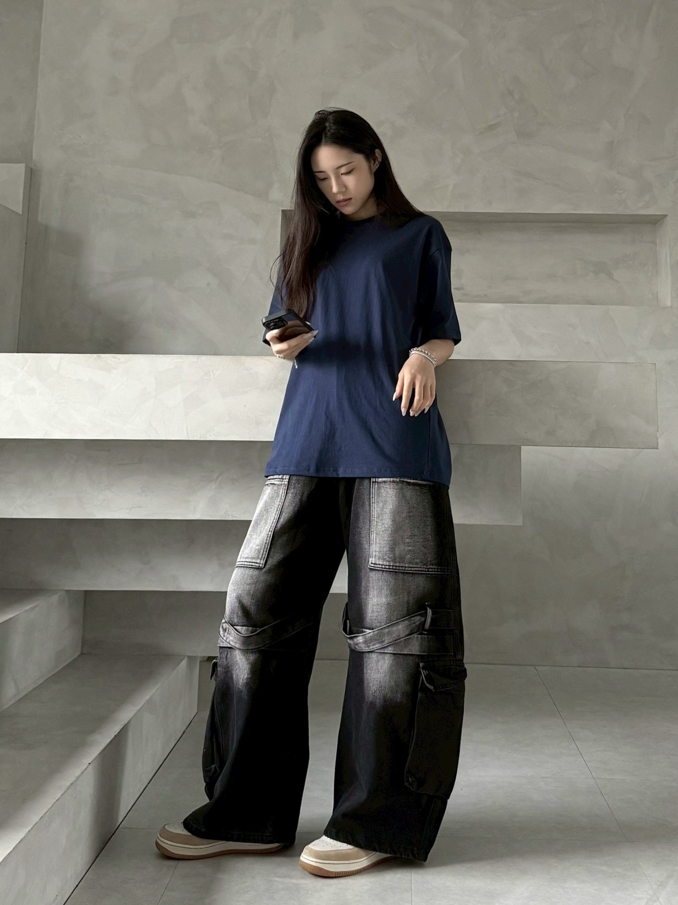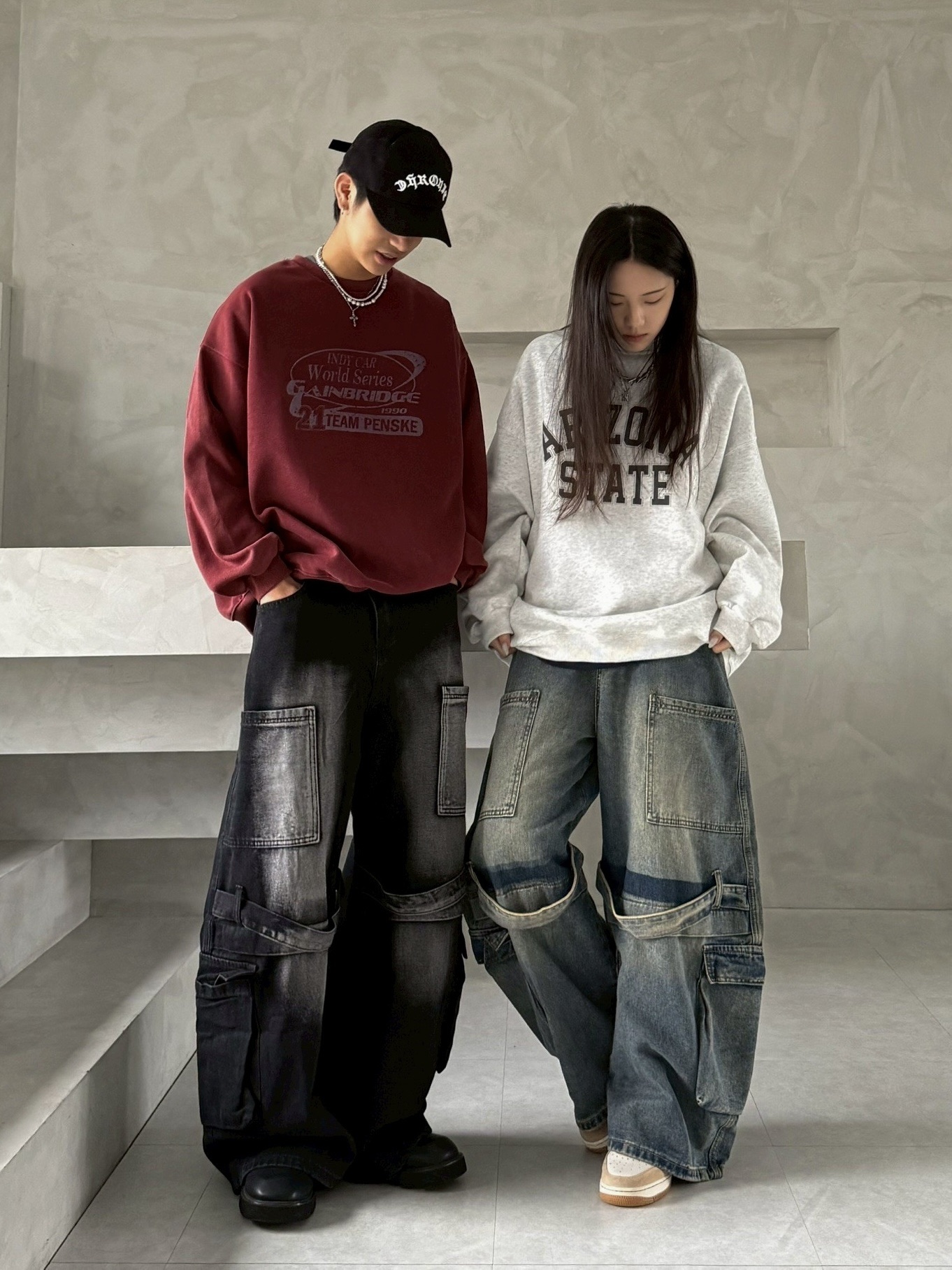 韓國 皮帶條 飄帶 設計感 重磅 多口袋 水洗 刷色 落地感 寬褲 牛仔褲 (2color)
