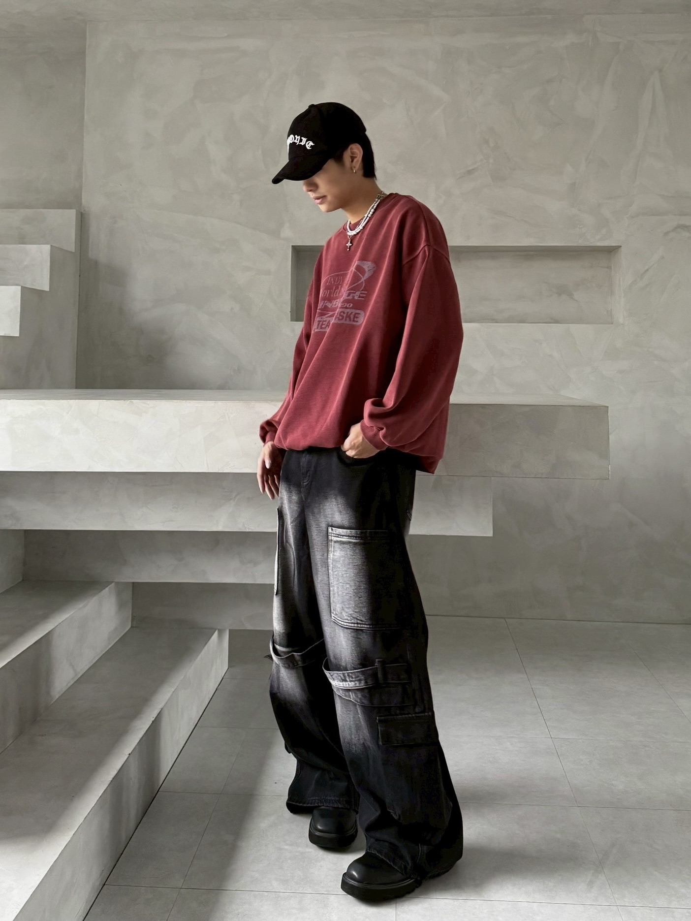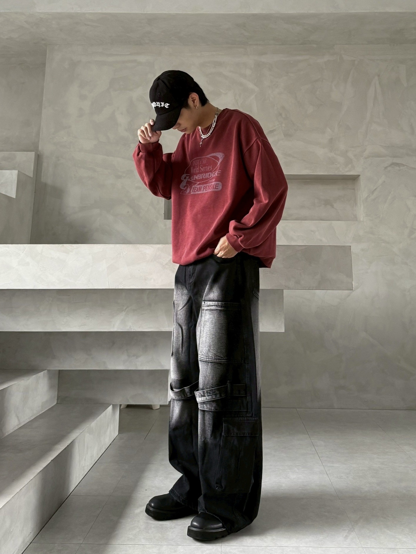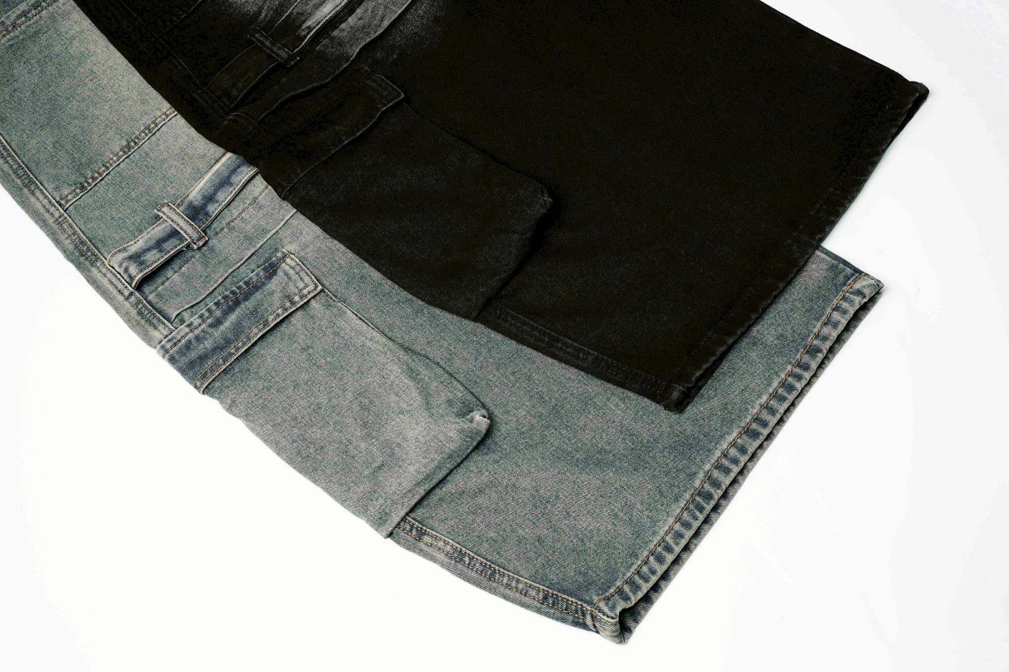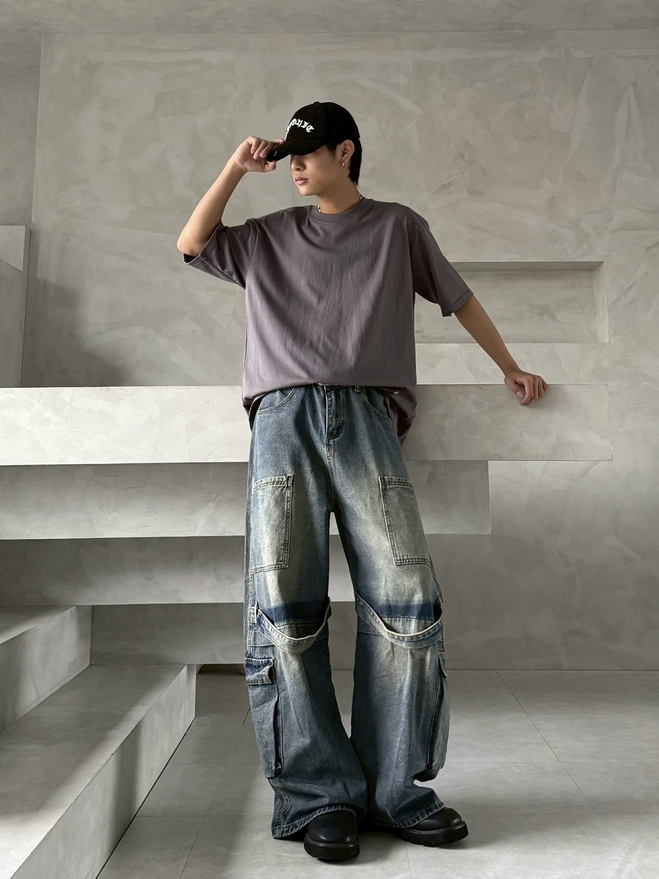 韓國 皮帶條 飄帶 設計感 重磅 多口袋 水洗 刷色 落地感 寬褲 牛仔褲 (2color)