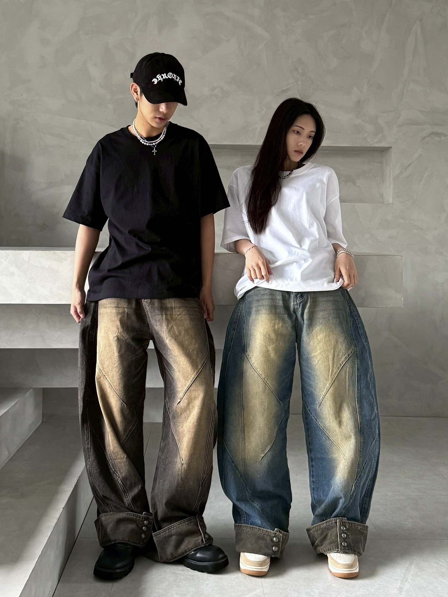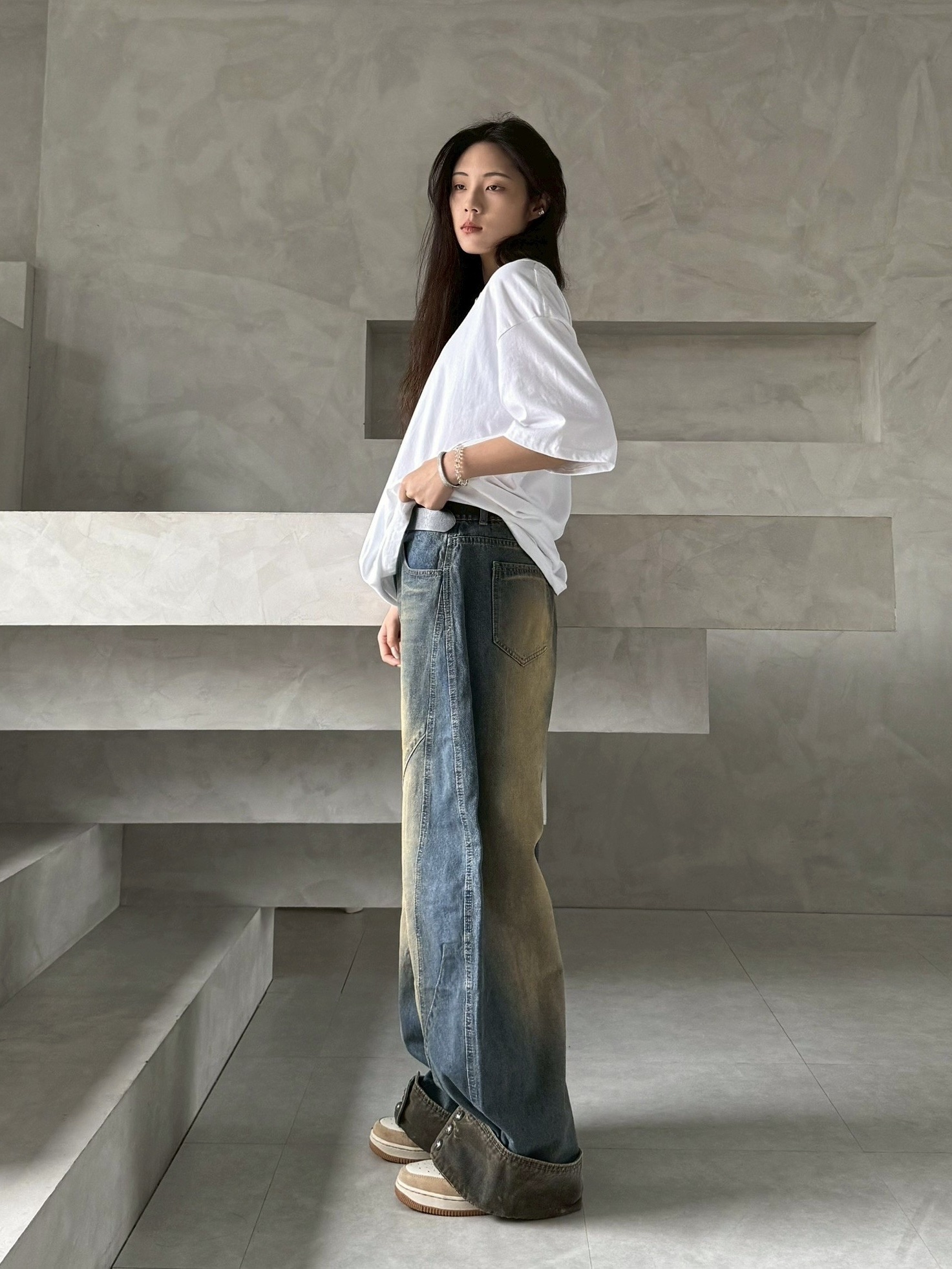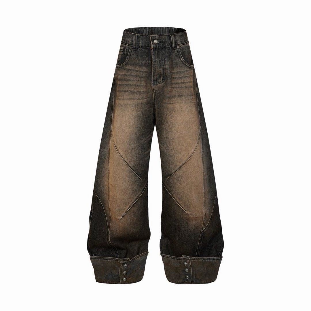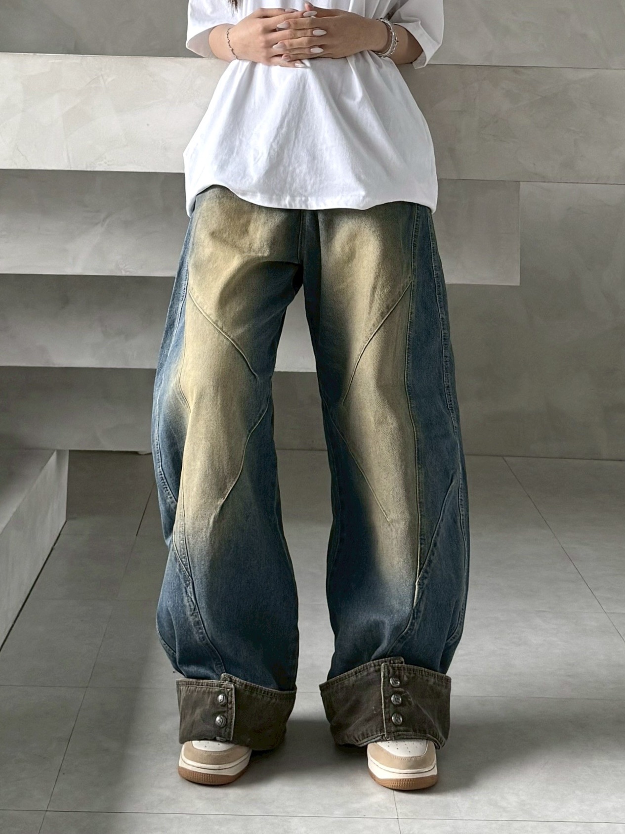 韓國 汙泥 交錯 拼接 裁片 褲管反折 復古 水洗 寬褲 牛仔褲 (2color)